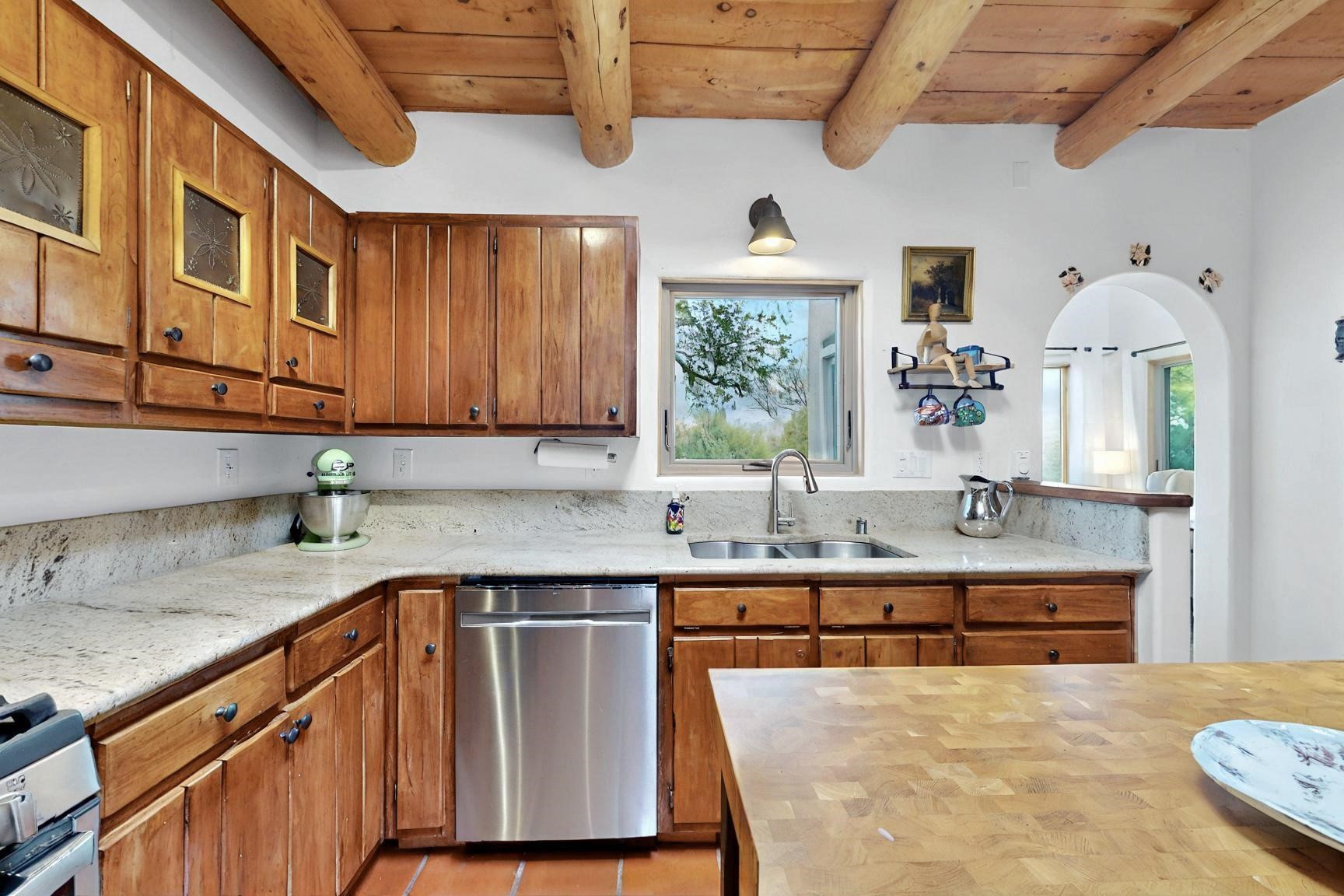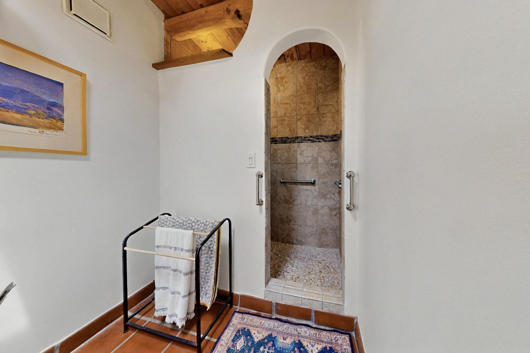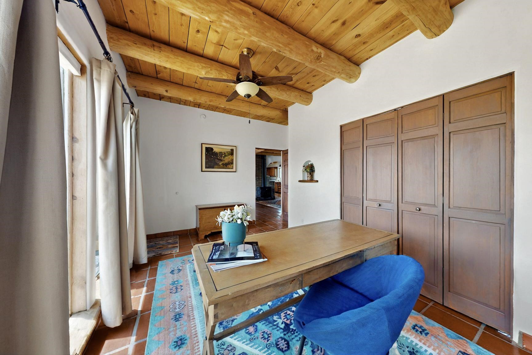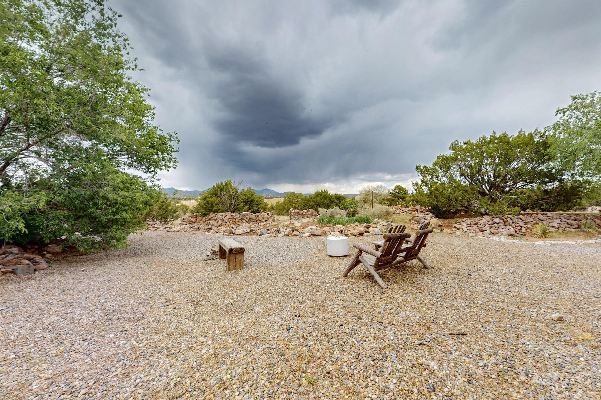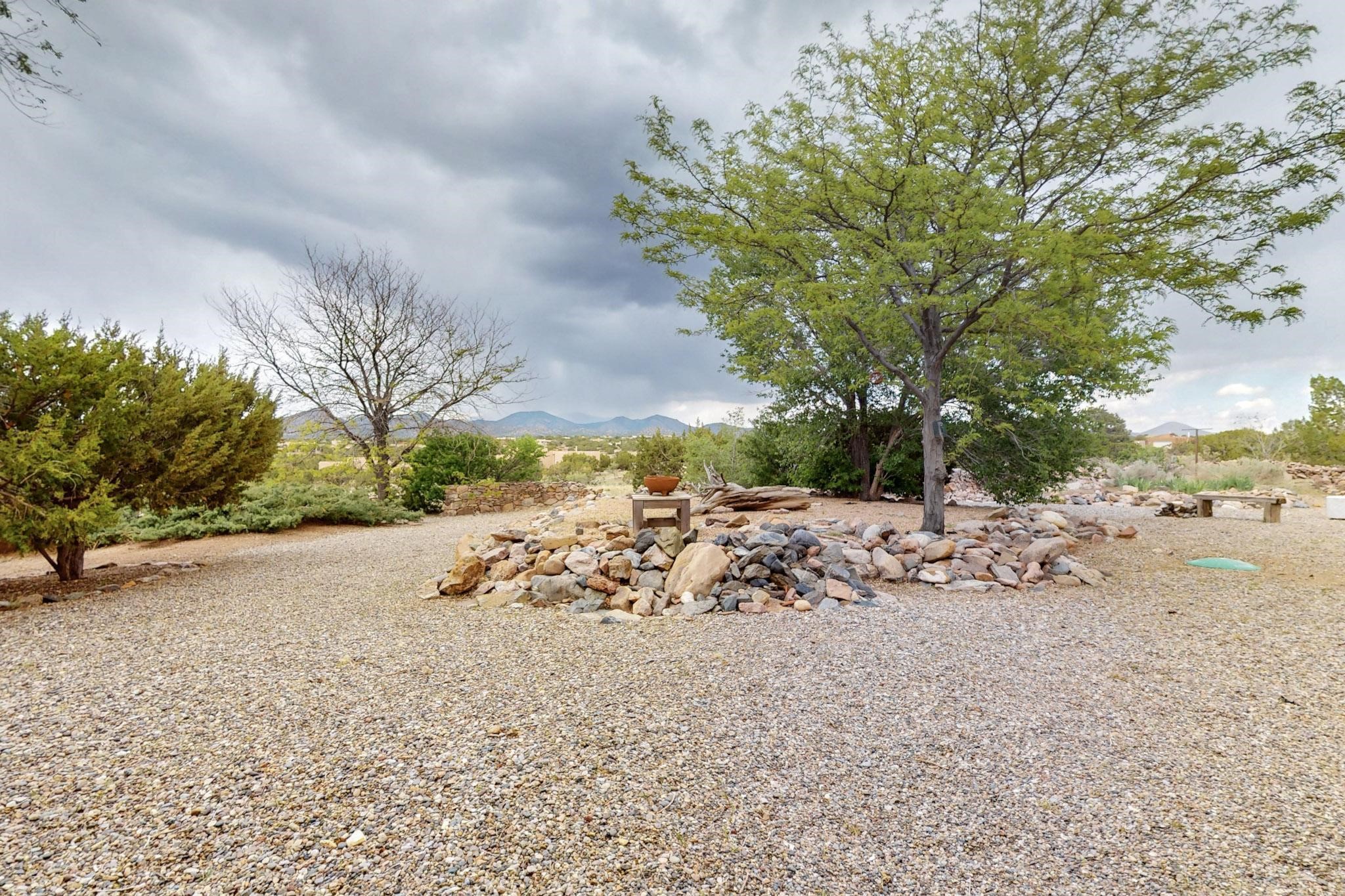 Stunning custom passive solar creation by Leif Backe nestled back from the road for ultimate privacy and mountain views. This split 3 bedroom design oozing with Santa Fe charm and ambience, is loaded with extra spaces for hobbies or meditation. Built to access light and lovely views from large windows in every room, gleaming Saltillo tile floors, rustic rough hewn vigas and beams, a traditional kiva fireplaces and 2 cosy natural gas stoves. 5 minisplits have been added for summer cool and winter heat. The totally remodeled kitchen is a perfect blend of pueblo and contemporary design. Enjoy the lovely view breakfast nook, large den and heated studio/workshop or simply relax in the naturally landscaped private gardens. The membrane roof is only 5 years old. This fabulous home accesses all of Eldorado amenities, close to local services and shopping plus only minutes into Santa Fe.
