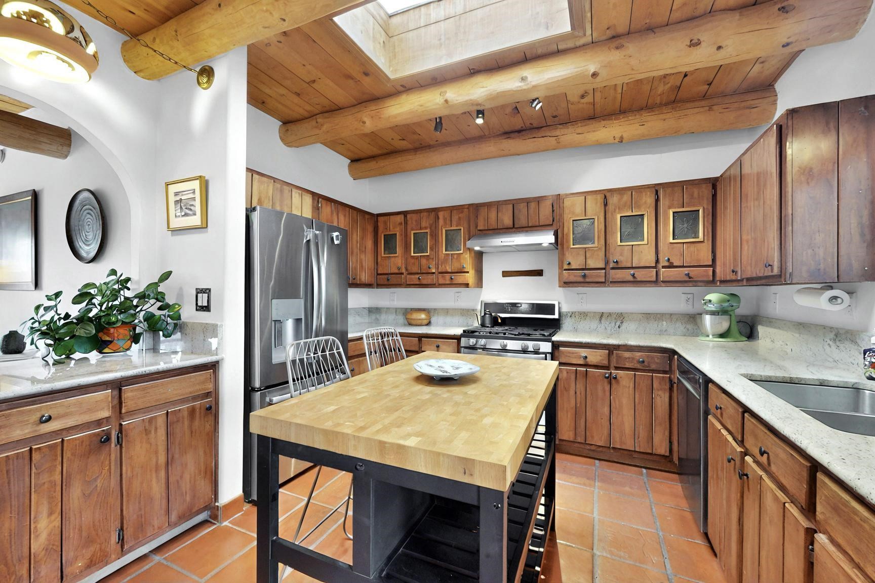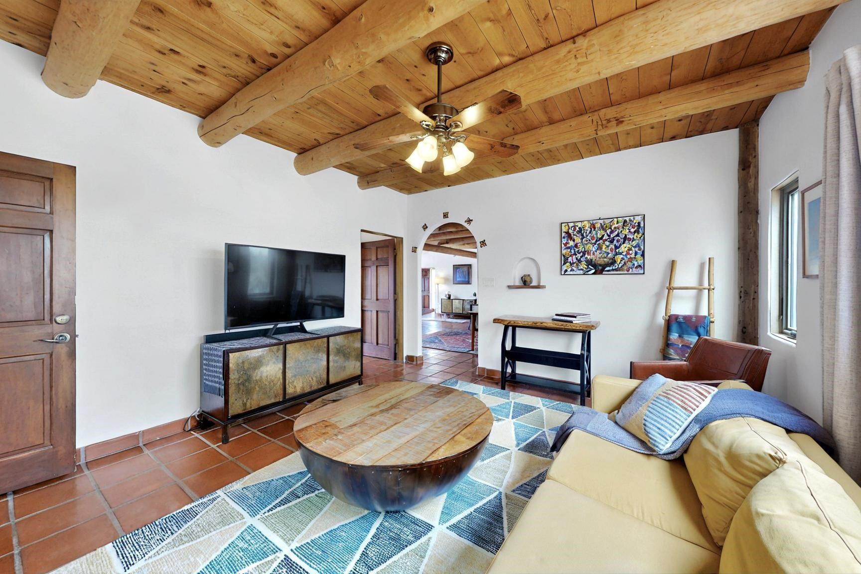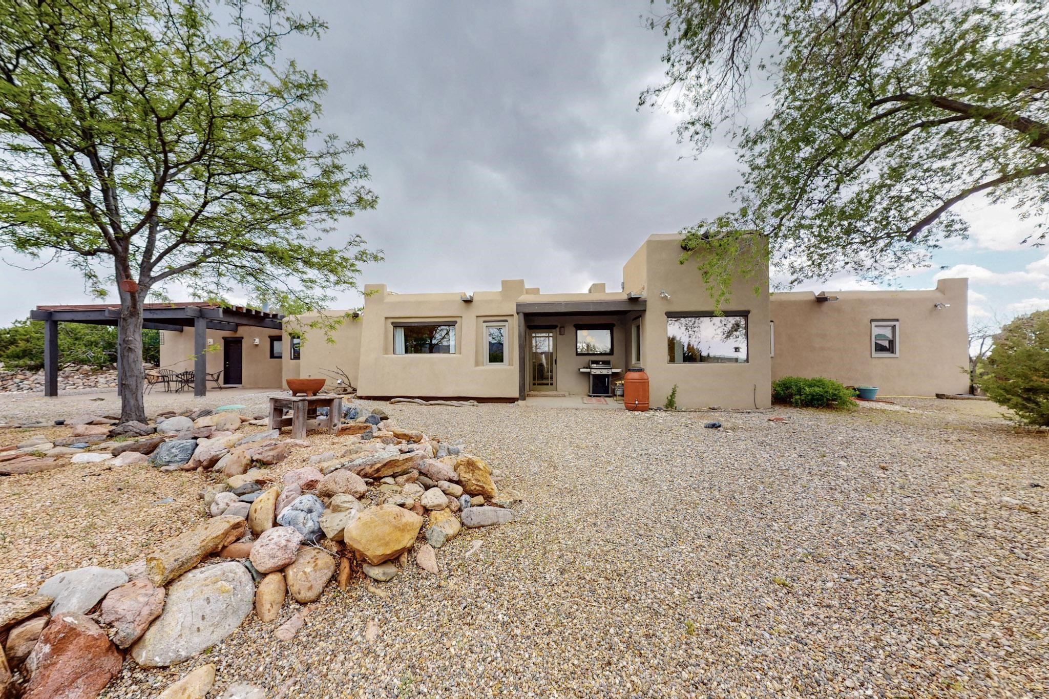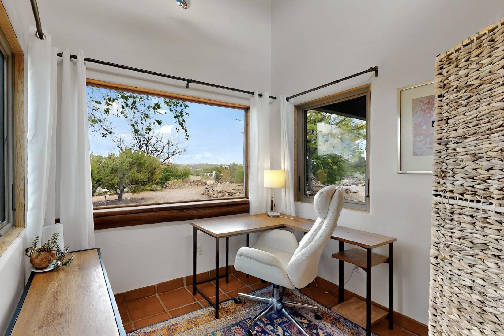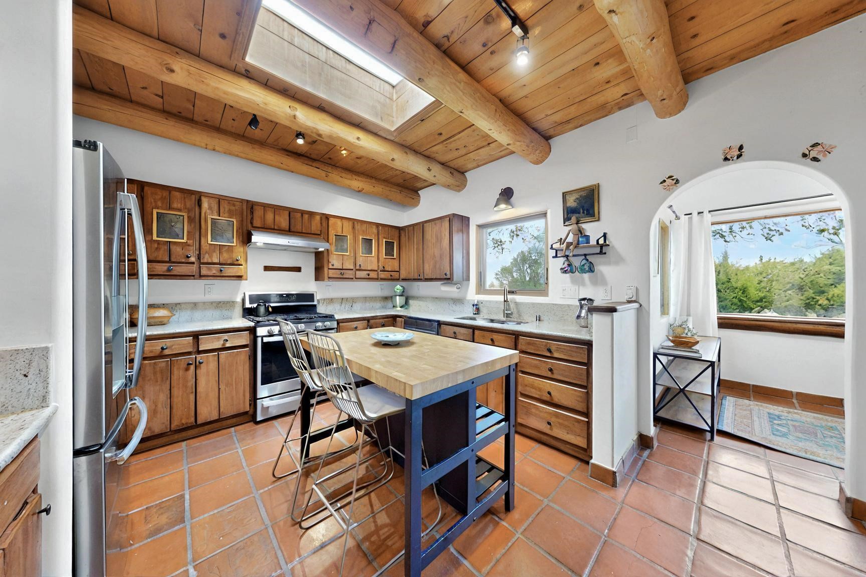 Stunning custom passive solar creation by Leif Backe nestled back from the road for ultimate privacy and mountain views. This split 3 bedroom design oozing with Santa Fe charm and ambience, is loaded with extra spaces for hobbies or meditation. Built to access light and lovely views from large windows in every room, gleaming Saltillo tile floors, rustic rough hewn vigas and beams, a traditional kiva fireplaces and 2 cosy natural gas stoves. 5 minisplits have been added for summer cool and winter heat. The totally remodeled kitchen is a perfect blend of pueblo and contemporary design. Enjoy the lovely view breakfast nook, large den and heated studio/workshop or simply relax in the naturally landscaped private gardens. The membrane roof is only 5 years old. This fabulous home accesses all of Eldorado amenities, close to local services and shopping plus only minutes into Santa Fe.