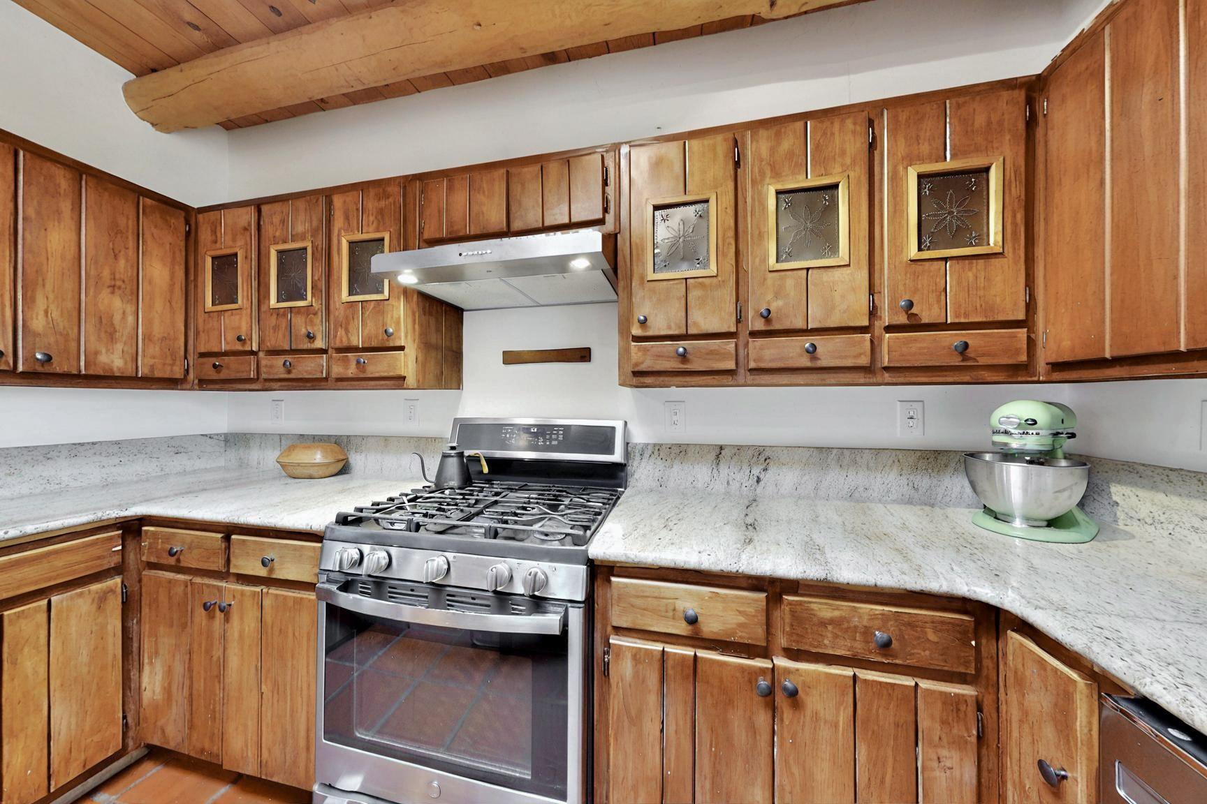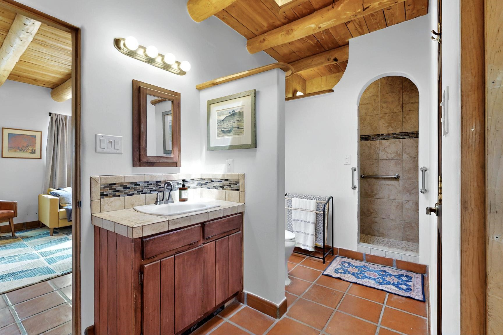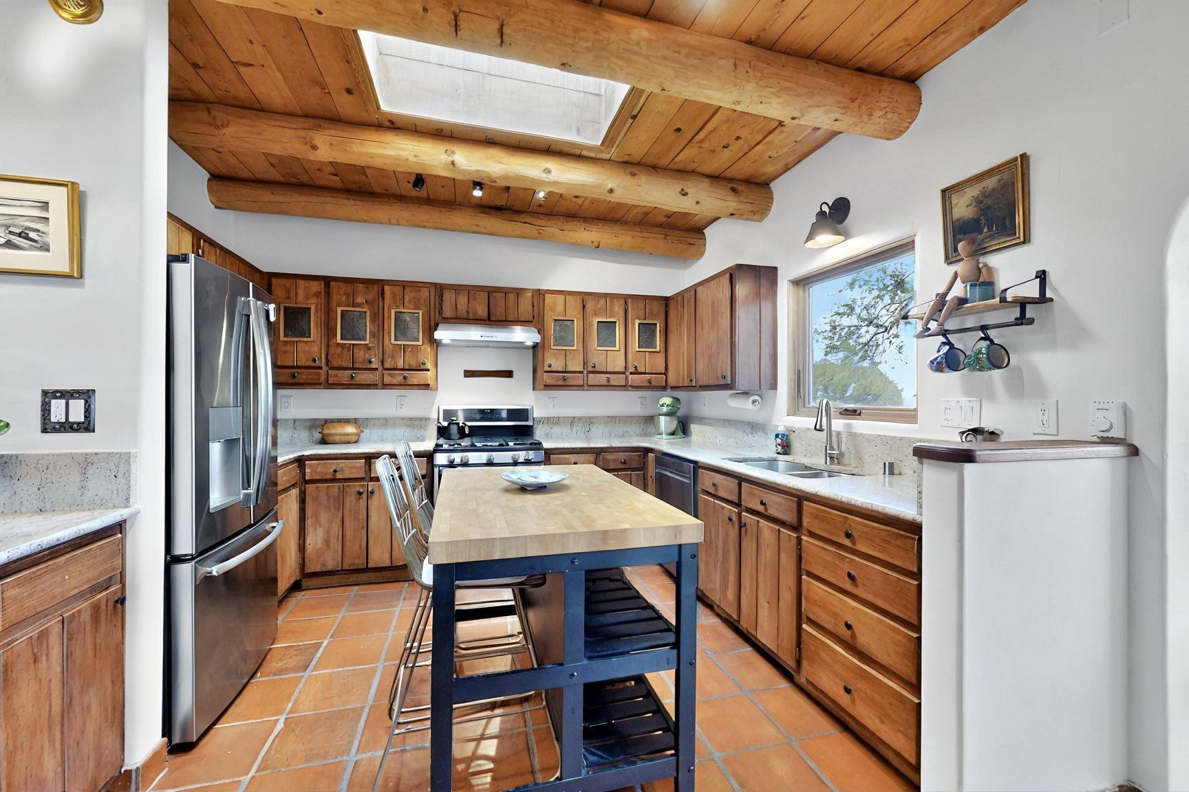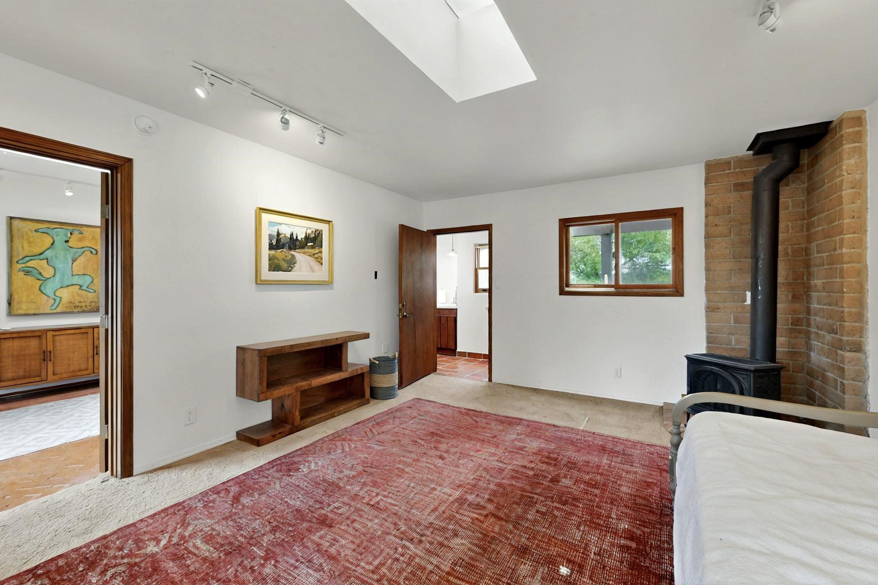 Stunning custom passive solar creation by Leif Backe nestled back from the road for ultimate privacy and mountain views. This split 3 bedroom design oozing with Santa Fe charm and ambience, is loaded with extra spaces for hobbies or meditation. Built to access light and lovely views from large windows in every room, gleaming Saltillo tile floors, rustic rough hewn vigas and beams, a traditional kiva fireplaces and 2 cosy natural gas stoves. 5 minisplits have been added for summer cool and winter heat. The totally remodeled kitchen is a perfect blend of pueblo and contemporary design. Enjoy the lovely view breakfast nook, large den and heated studio/workshop or simply relax in the naturally landscaped private gardens. The membrane roof is only 5 years old. This fabulous home accesses all of Eldorado amenities, close to local services and shopping plus only minutes into Santa Fe.
