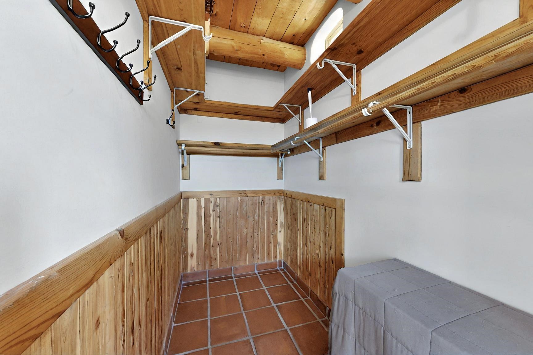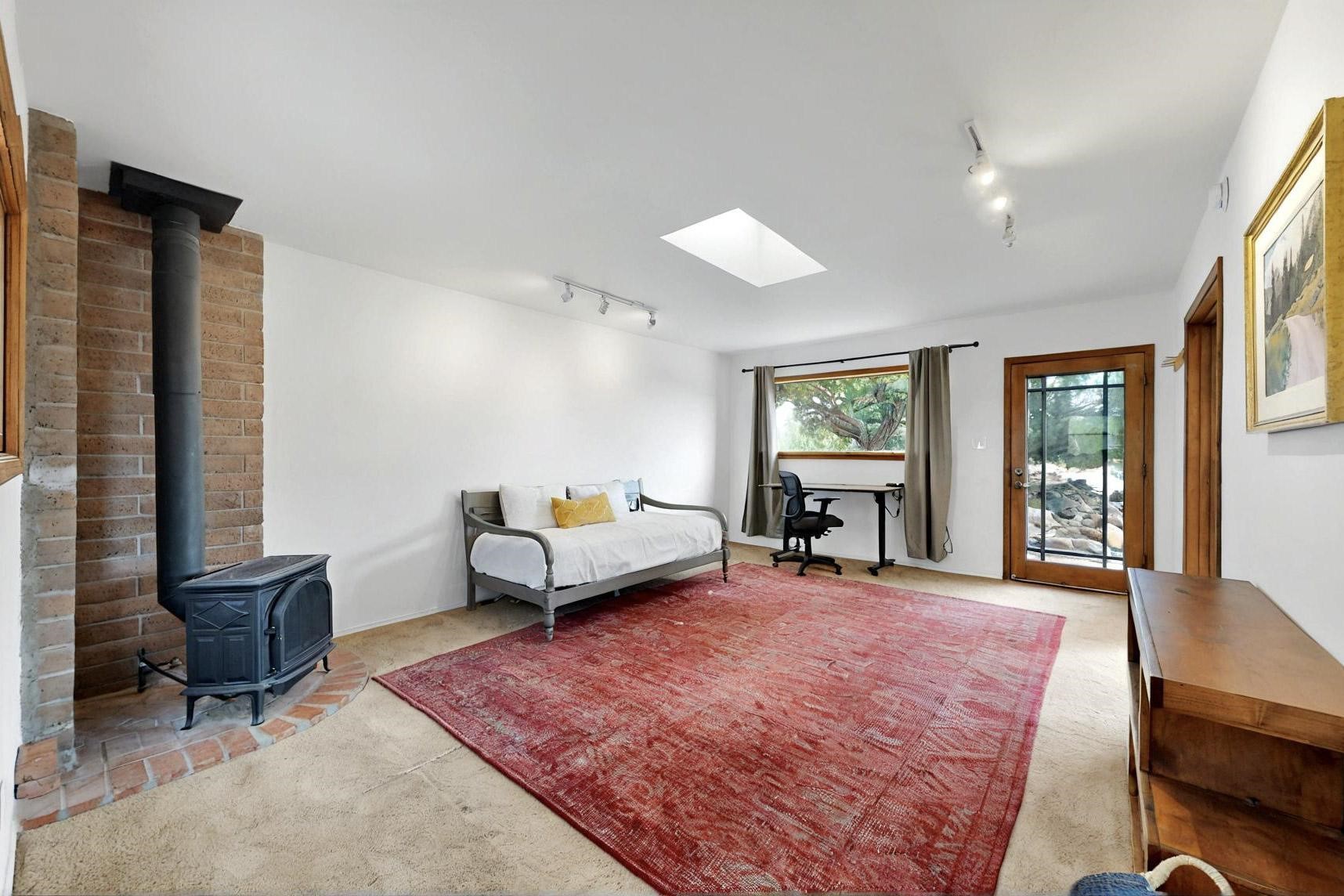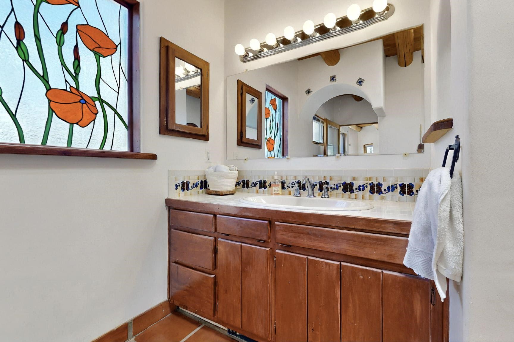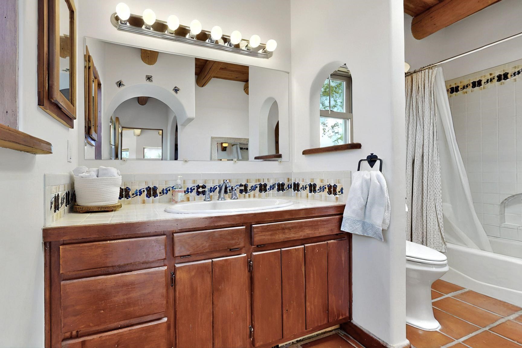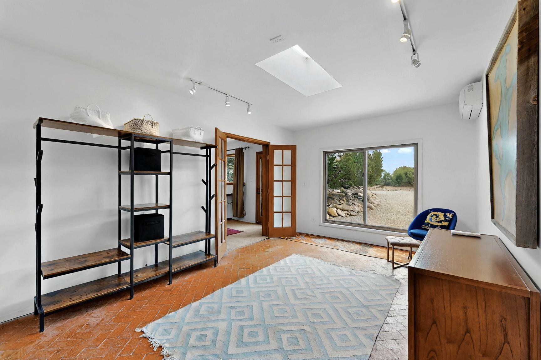 Stunning custom passive solar creation by Leif Backe nestled back from the road for ultimate privacy and mountain views. This split 3 bedroom design oozing with Santa Fe charm and ambience, is loaded with extra spaces for hobbies or meditation. Built to access light and lovely views from large windows in every room, gleaming Saltillo tile floors, rustic rough hewn vigas and beams, a traditional kiva fireplaces and 2 cosy natural gas stoves. 5 minisplits have been added for summer cool and winter heat. The totally remodeled kitchen is a perfect blend of pueblo and contemporary design. Enjoy the lovely view breakfast nook, large den and heated studio/workshop or simply relax in the naturally landscaped private gardens. The membrane roof is only 5 years old. This fabulous home accesses all of Eldorado amenities, close to local services and shopping plus only minutes into Santa Fe.