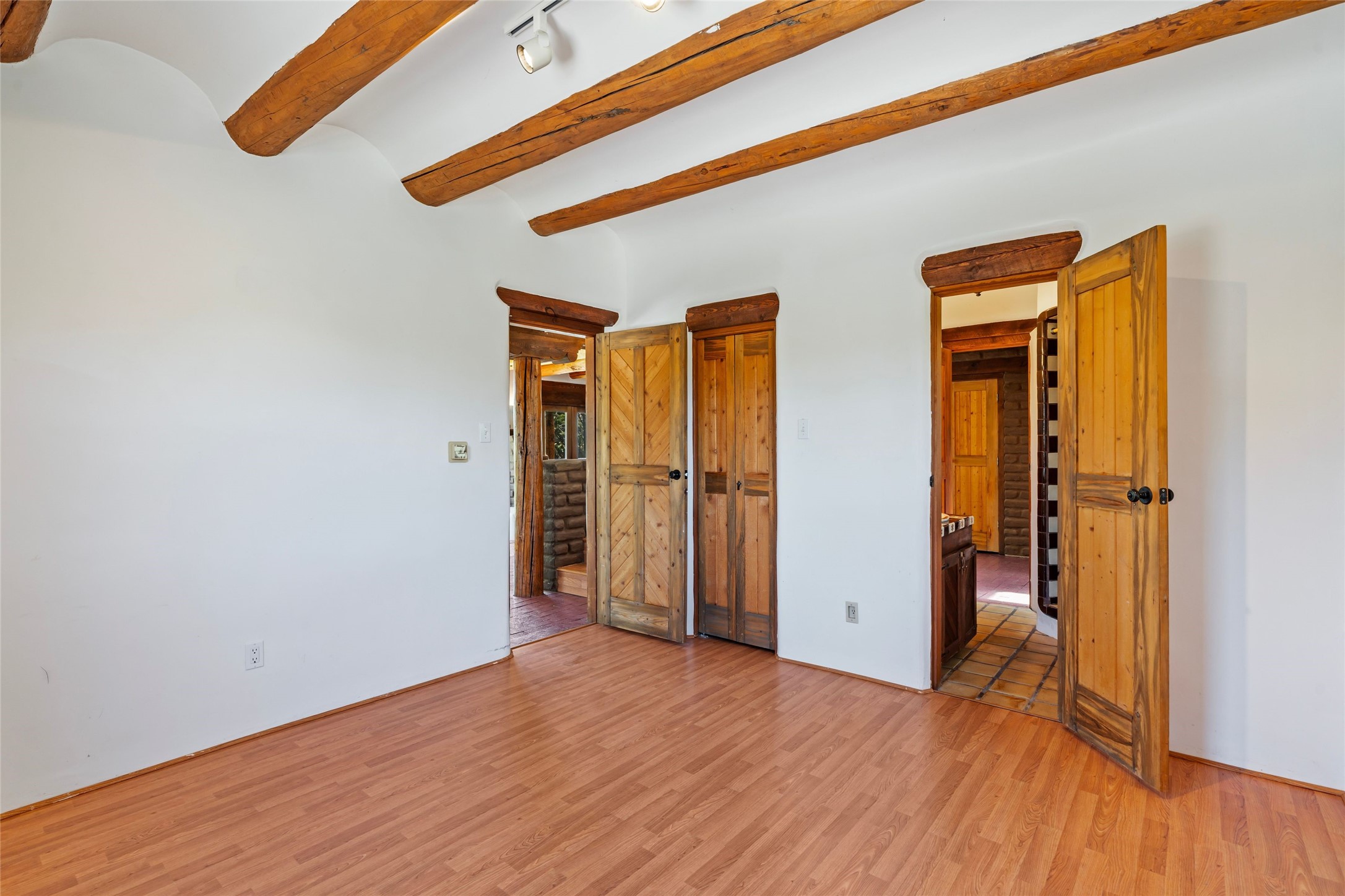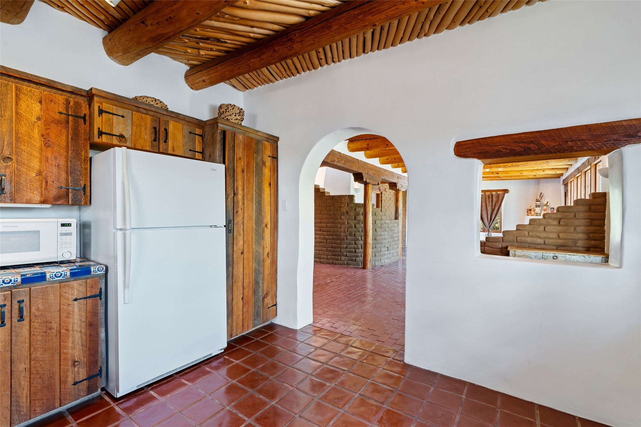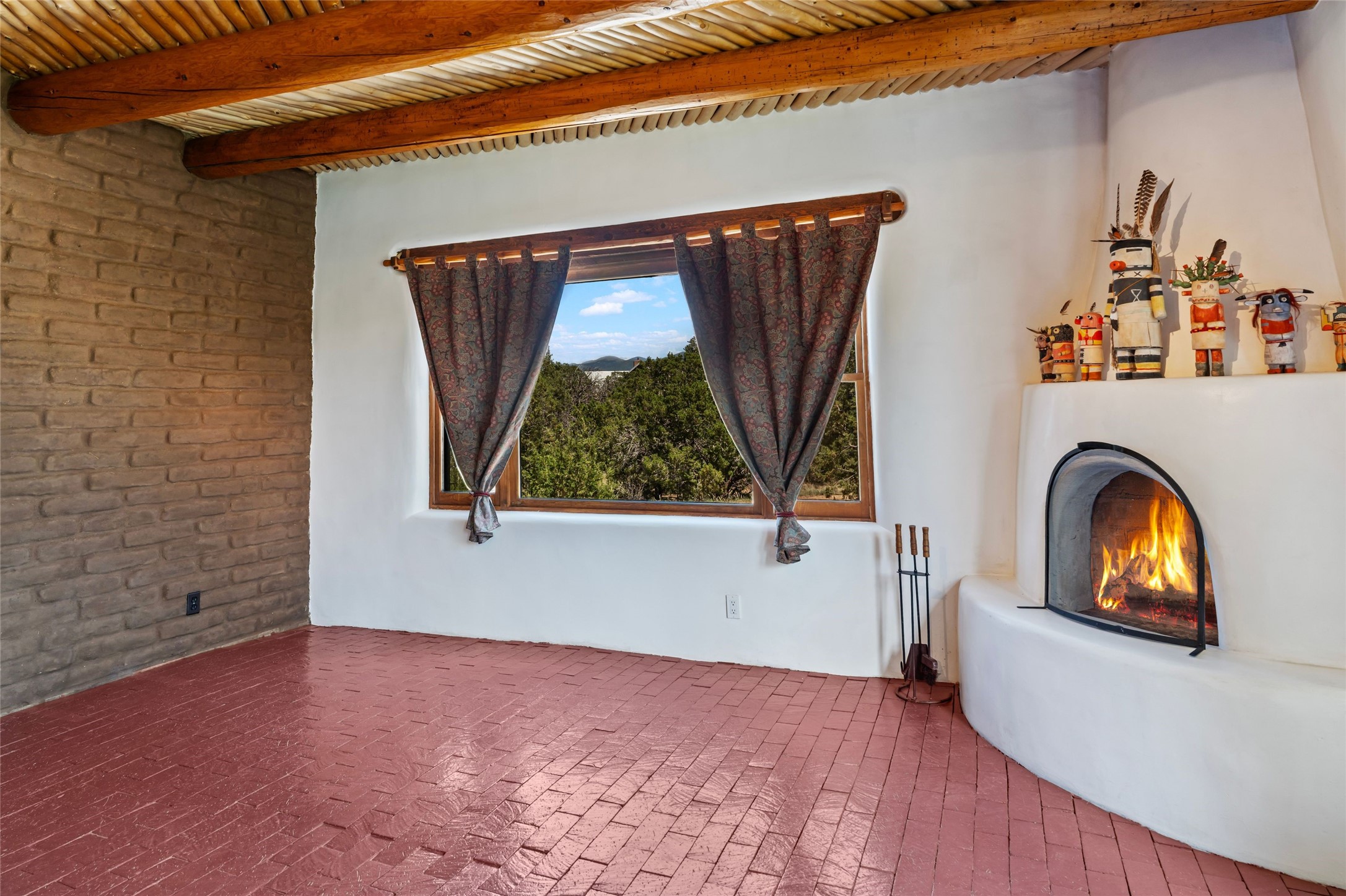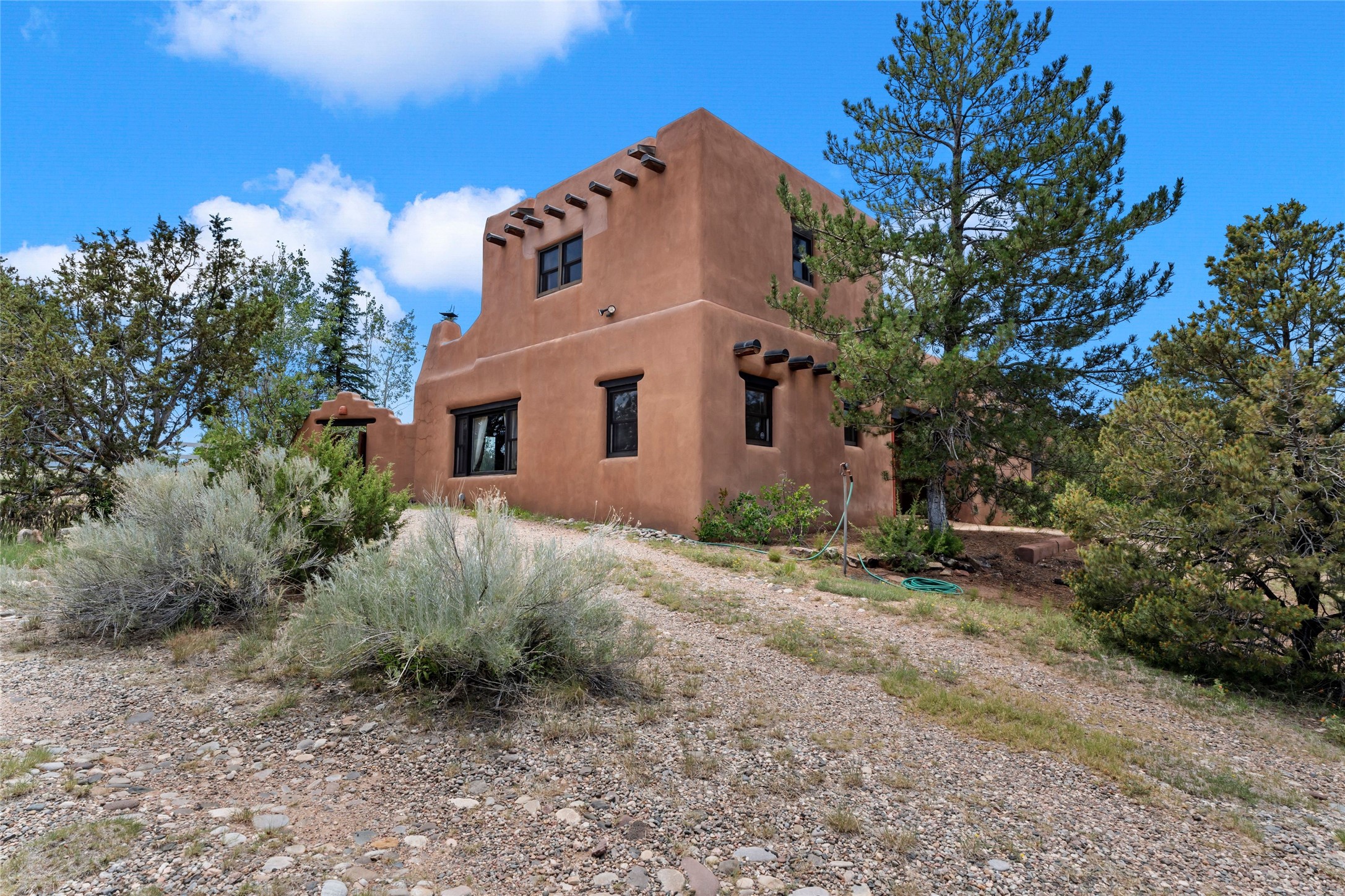 Sited on two and a half acres in a pastoral setting with pretty Sangre de Cristo mountain views, this charming Pueblo style adobe home offers traditional architectural details such as beautiful wood ceilings of vigas and latillas, also coved ceilings with vigas, plaster walls, solid wood doors, wooden lintels, brick and Saltillo tile floors, Talavera tile, and a kiva fireplace. The property features beautiful large pine trees, an enclosed yard with pretty plantings and lovely flower gardens, and a synthetic wood deck. The owner has added an art studio, which has blackout window coverings, so it can be used as a dark room as well. The original infrastructure was upgraded, the electrical system, new mechanical room added with hot water tank and boiler, roof and stucco, and the well was recently maintained with new pressure tanks installed. There's also a small horse barn on the lot.