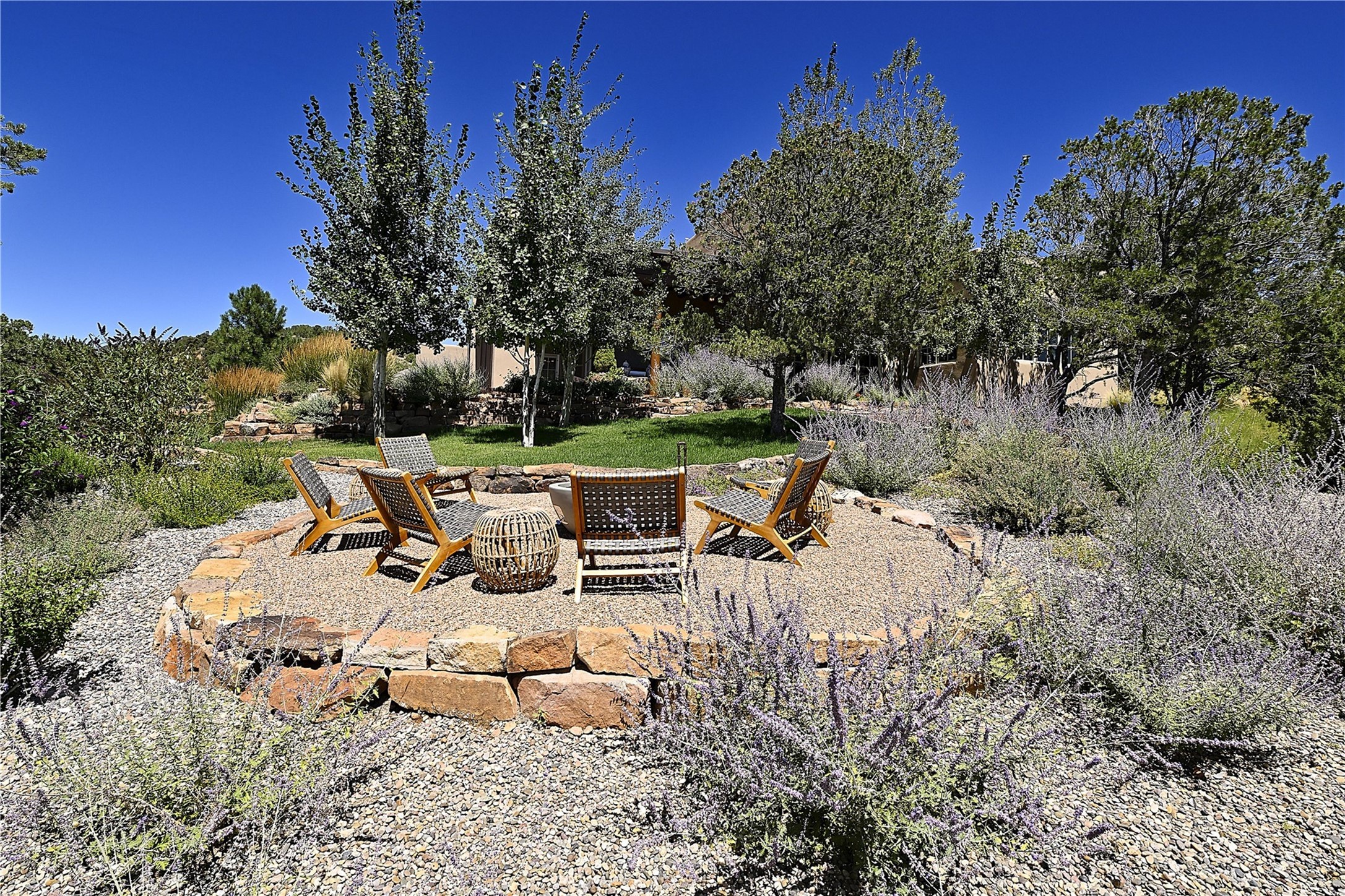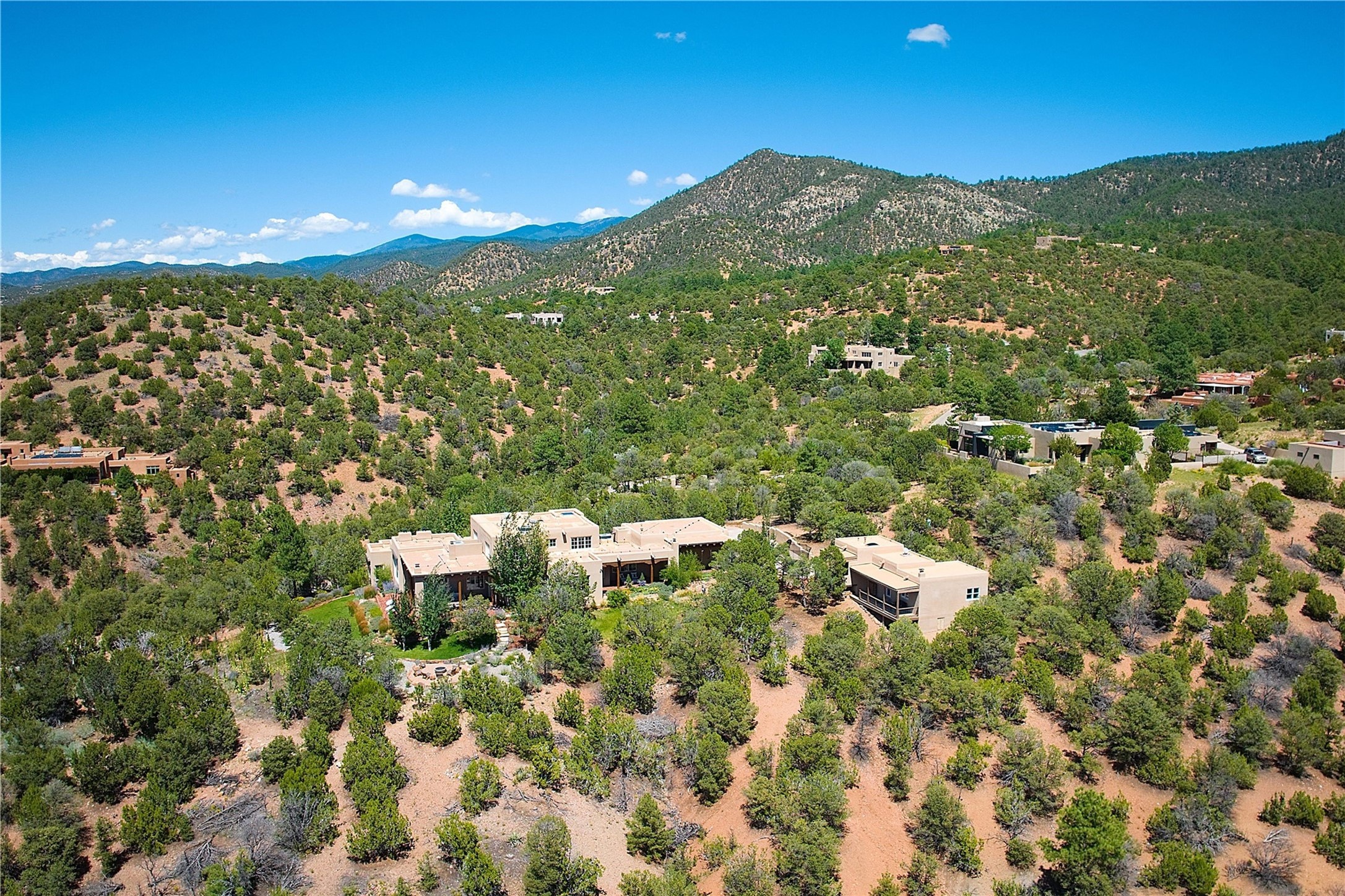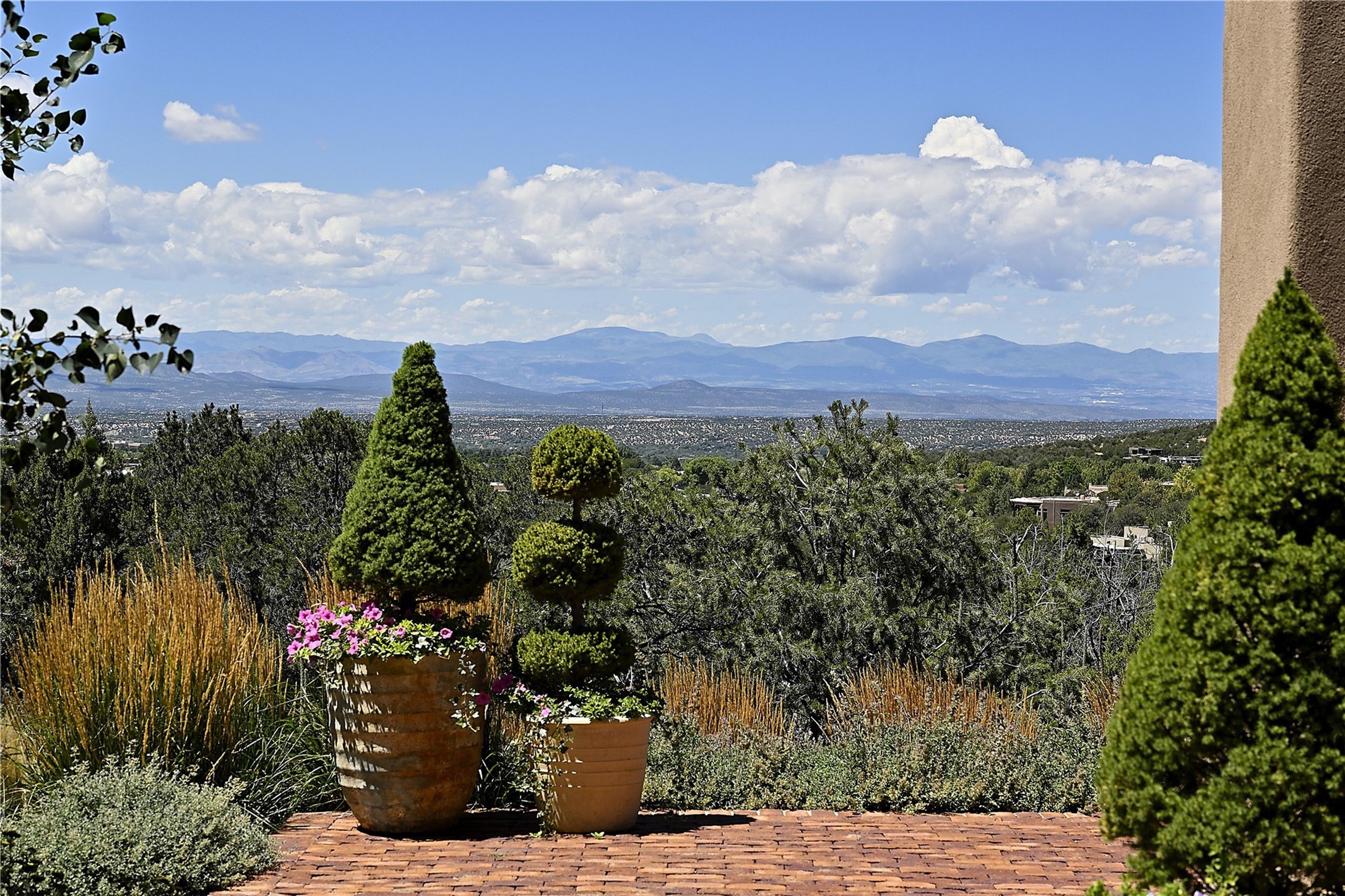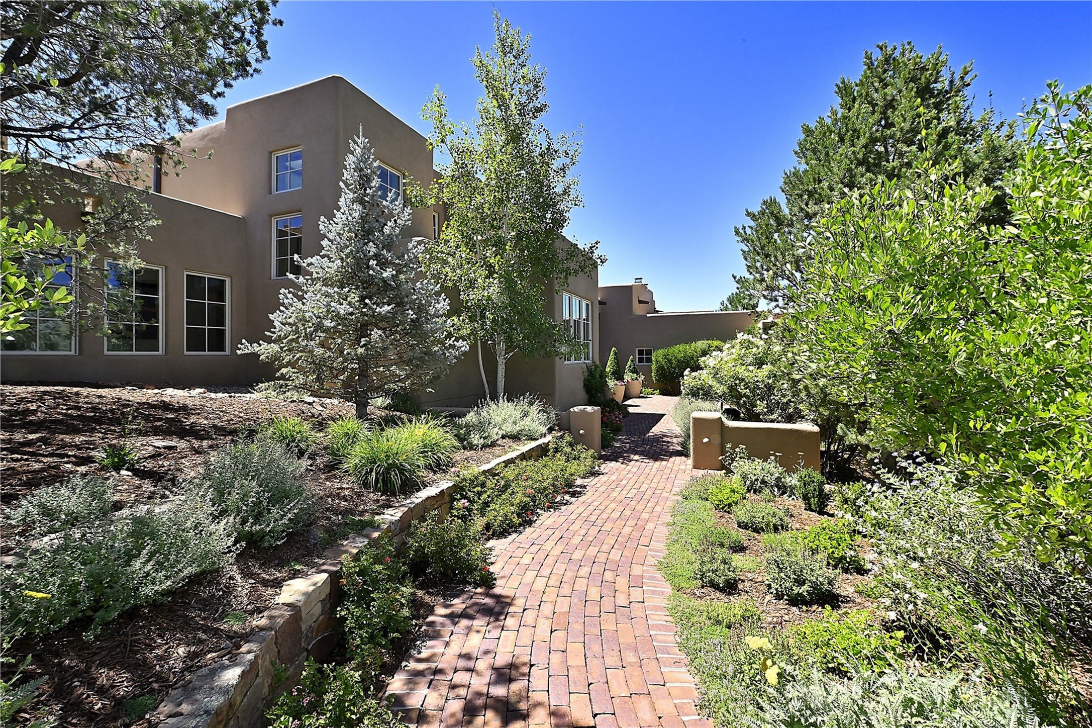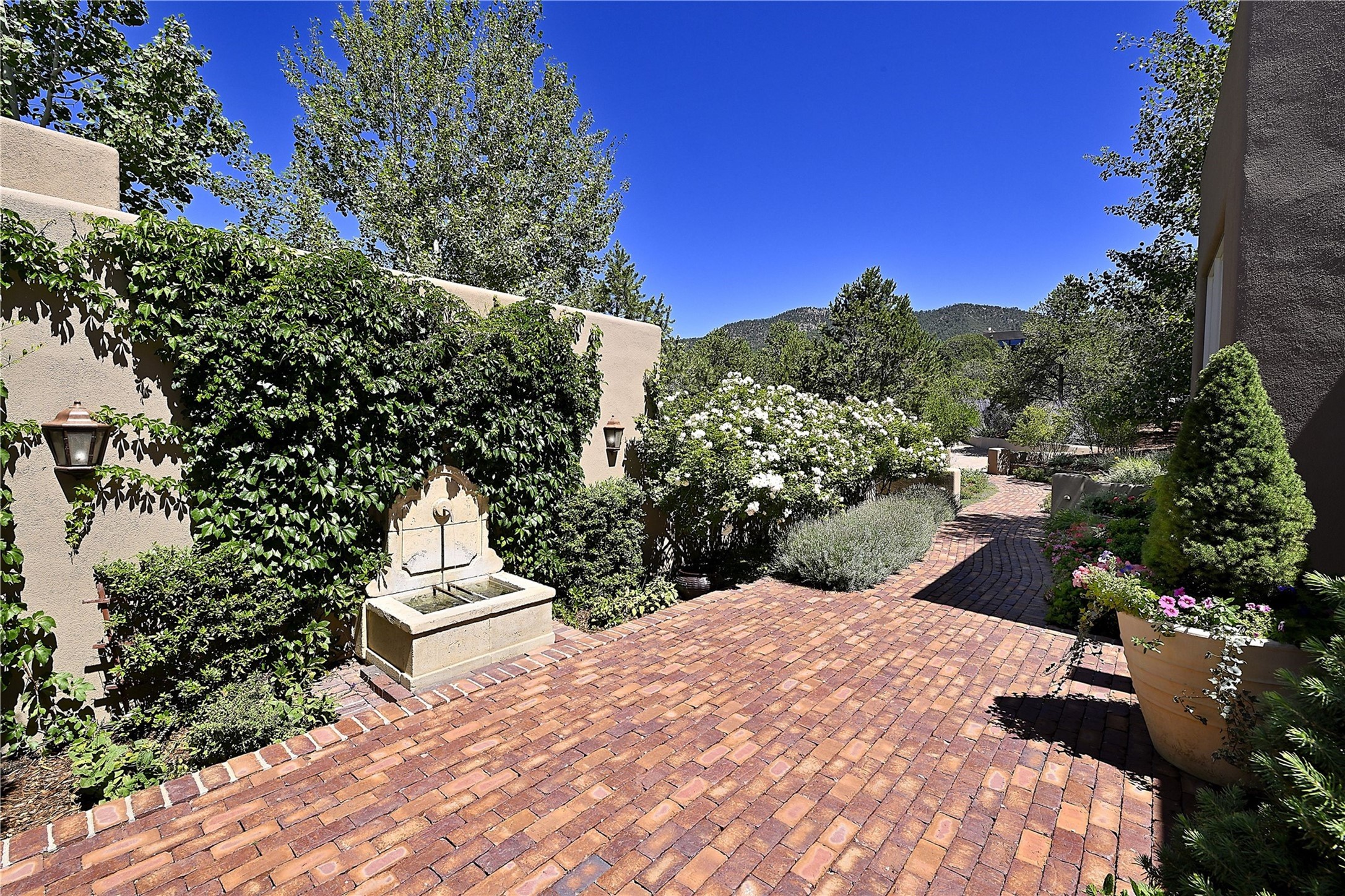Experience the pinnacle of sophisticated living at this stunning Santa Fe estate. European Elegance Meets Southwestern Splendor at 2216 Wilderness Arroyo! A sanctuary where refined taste meets unparalleled quality--discover the finest in Santa Fe living. Every detail has been meticulously crafted to provide a truly exceptional experience. Nestled on 5.25 acres, within the prestigious Wilderness Gate community, this Woods Builders masterpiece epitomizes European magnificence, seamlessly blending luxury with purposeful privacy. Upon arrival, you are greeted by a private gate, a gracefully curving cobblestone driveway, and beautifully landscaped grounds--an immediate indication of the exceptional quality that awaits. This extraordinary property offers breathtaking views that make it feel like a world apart, while still being conveniently close to downtown Santa Fe. Step inside to discover a home where no detail has been overlooked. The Chef's kitchen, equipped with top-of-the-line appliances, custom cabinetry and Taj Mahal Granite counters, is a culinary dream come true. Surrounding the kitchen, you'll find a formal sitting room, a cozy family gathering area, and a spacious media room--ideal for both grand entertaining and intimate relaxation. The owner's suite is a retreat unto itself, boasting a romantic balcony with sweeping views of the lush grounds, city lights, distant mountains and glorious sunsets. Indulge in the opulent primary bath, designed for ultimate relaxation and pampering. The main residence includes three additional guest bedrooms, thoughtfully separated for privacy. The two upstairs guest rooms feature their own living space and media room, ensuring comfort and convenience for all. Additionally, a separate, self-contained guest house with its own kitchen and laundry facilities offers an ideal space for visitors, extended family, or a remarkable Studio/Office.
