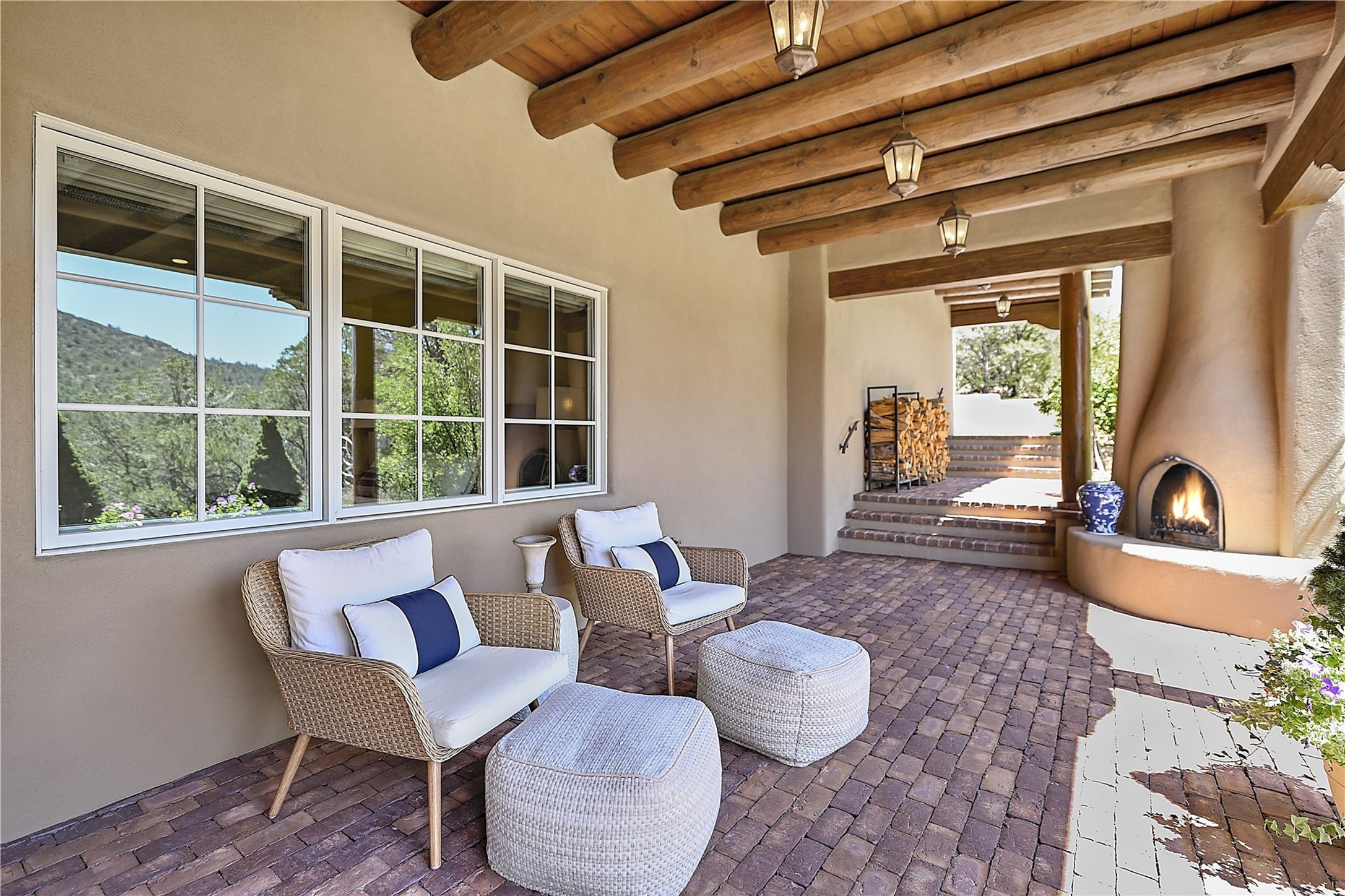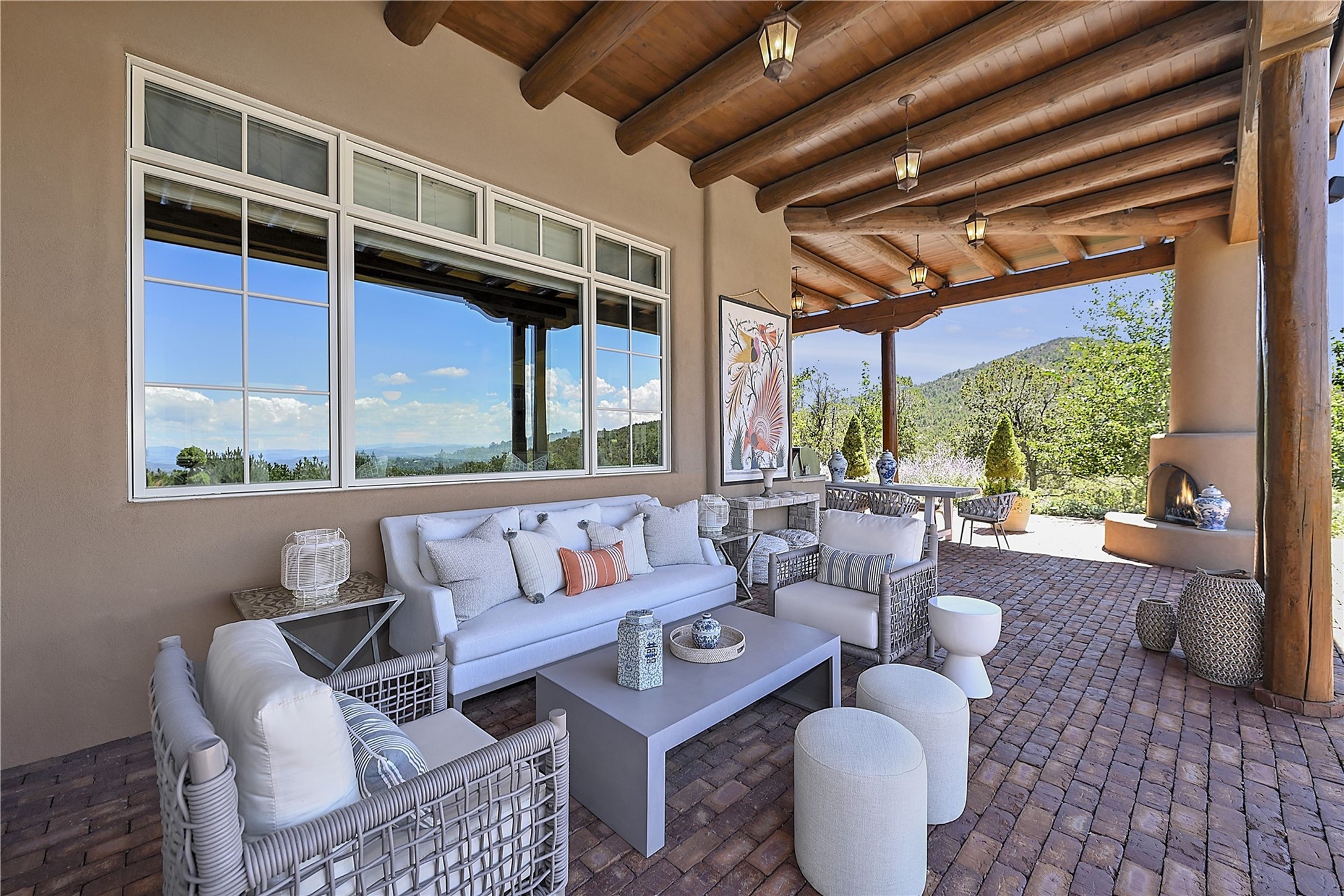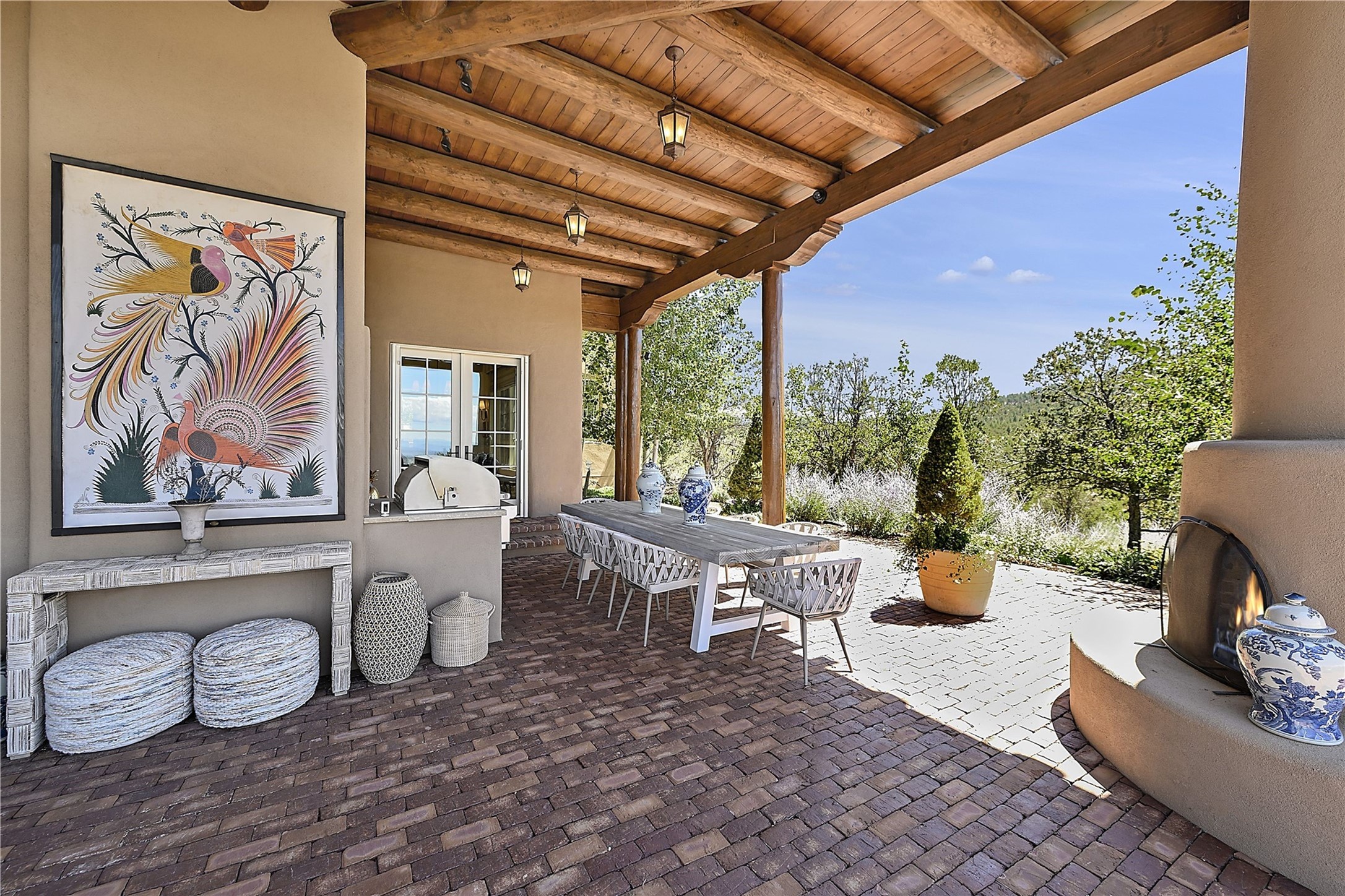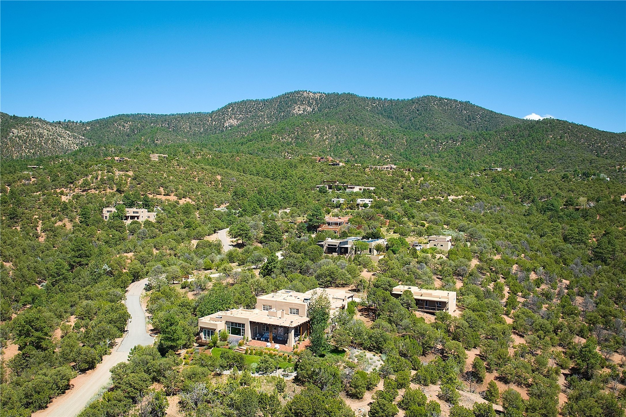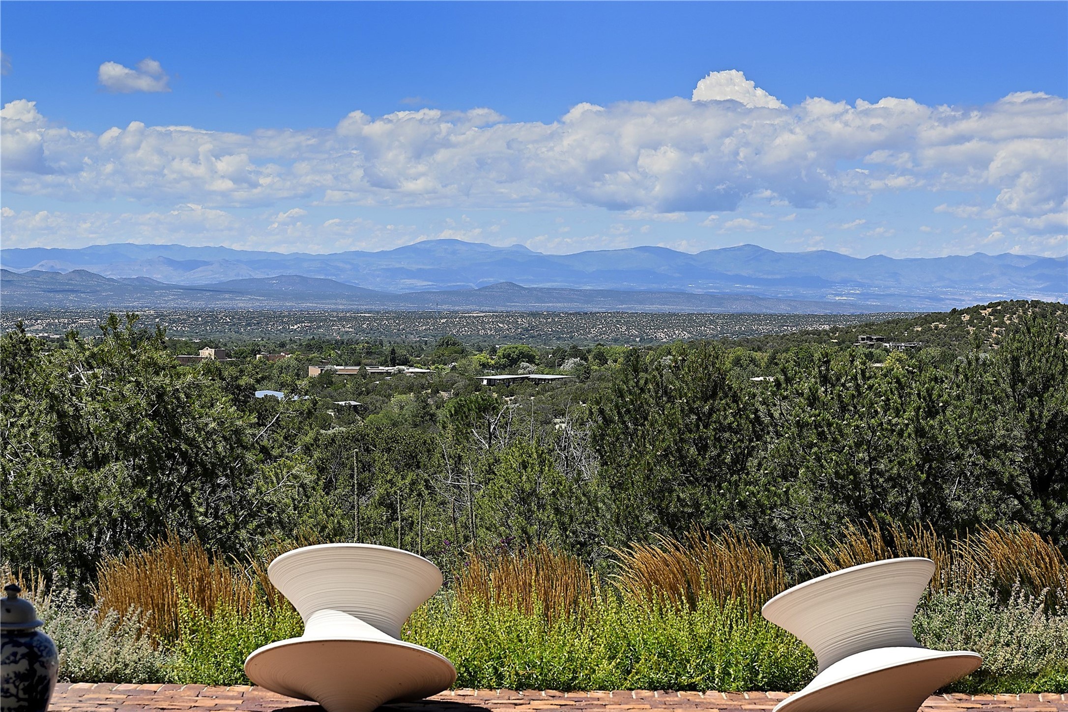 Experience the pinnacle of sophisticated living at this stunning Santa Fe estate. European Elegance Meets Southwestern Splendor at 2216 Wilderness Arroyo! A sanctuary where refined taste meets unparalleled quality--discover the finest in Santa Fe living. Every detail has been meticulously crafted to provide a truly exceptional experience. Nestled on 5.25 acres, within the prestigious Wilderness Gate community, this Woods Builders masterpiece epitomizes European magnificence, seamlessly blending luxury with purposeful privacy. Upon arrival, you are greeted by a private gate, a gracefully curving cobblestone driveway, and beautifully landscaped grounds--an immediate indication of the exceptional quality that awaits. This extraordinary property offers breathtaking views that make it feel like a world apart, while still being conveniently close to downtown Santa Fe. Step inside to discover a home where no detail has been overlooked. The Chef's kitchen, equipped with top-of-the-line appliances, custom cabinetry and Taj Mahal Granite counters, is a culinary dream come true. Surrounding the kitchen, you'll find a formal sitting room, a cozy family gathering area, and a spacious media room--ideal for both grand entertaining and intimate relaxation. The owner's suite is a retreat unto itself, boasting a romantic balcony with sweeping views of the lush grounds, city lights, distant mountains and glorious sunsets. Indulge in the opulent primary bath, designed for ultimate relaxation and pampering. The main residence includes three additional guest bedrooms, thoughtfully separated for privacy. The two upstairs guest rooms feature their own living space and media room, ensuring comfort and convenience for all. Additionally, a separate, self-contained guest house with its own kitchen and laundry facilities offers an ideal space for visitors, extended family, or a remarkable Studio/Office.
