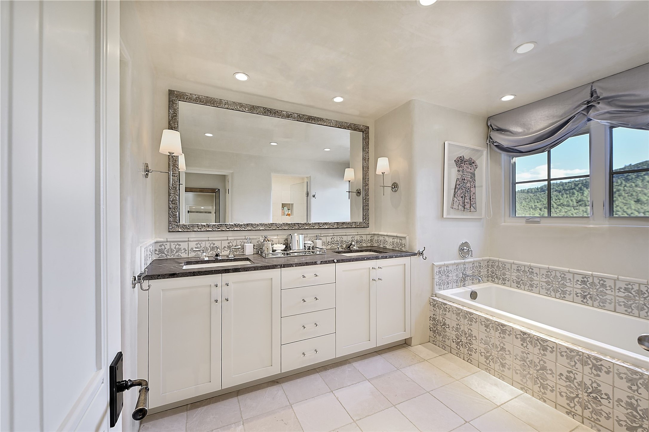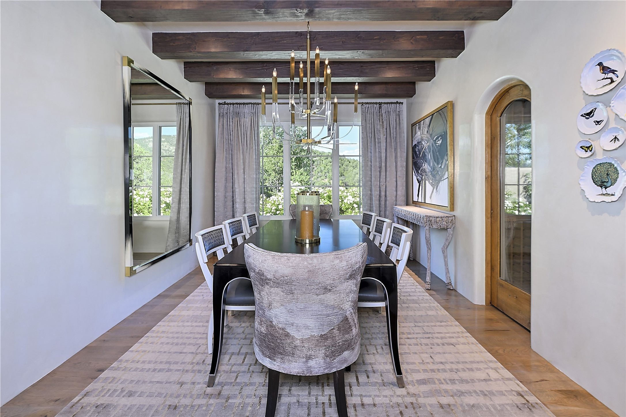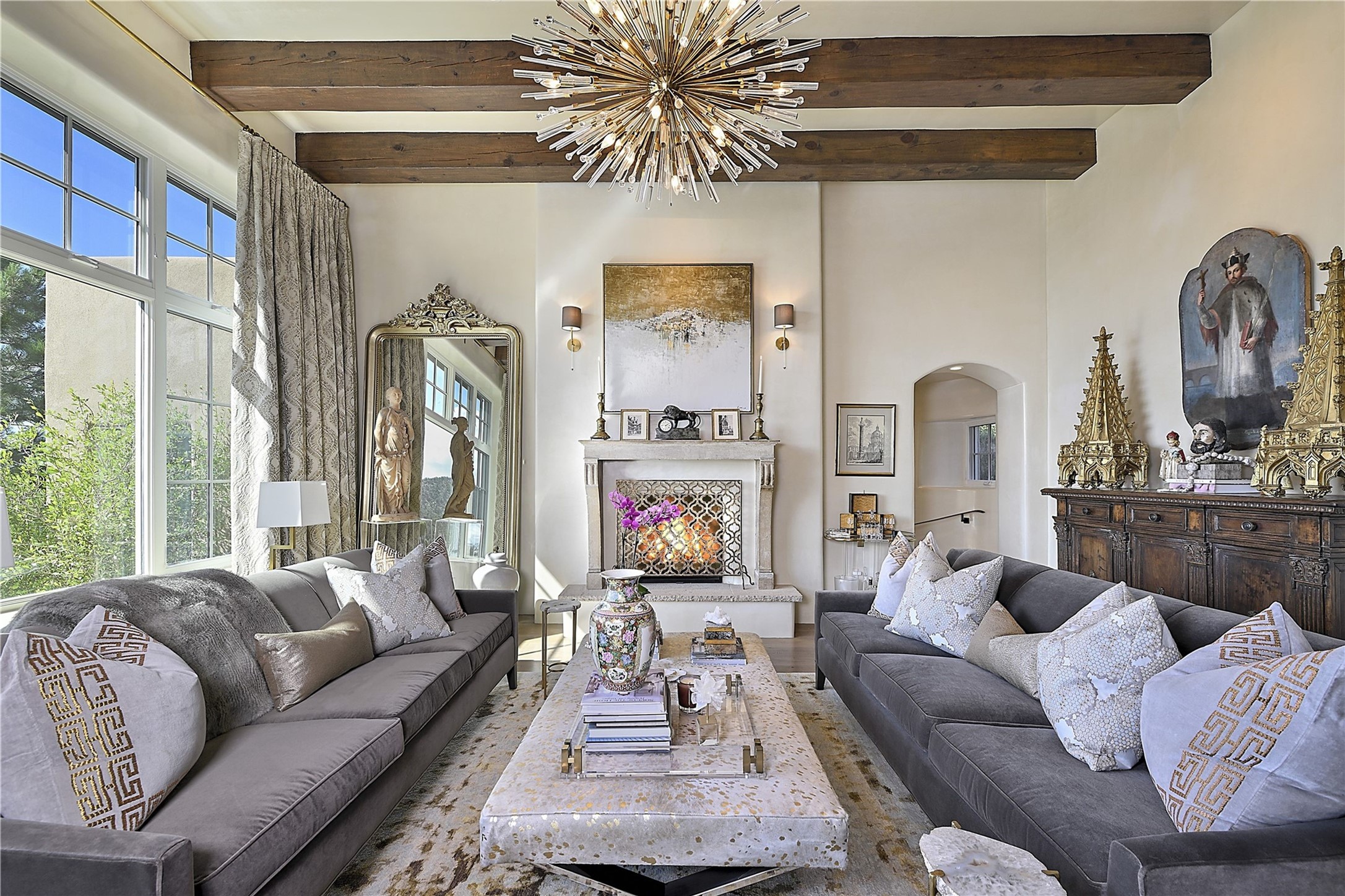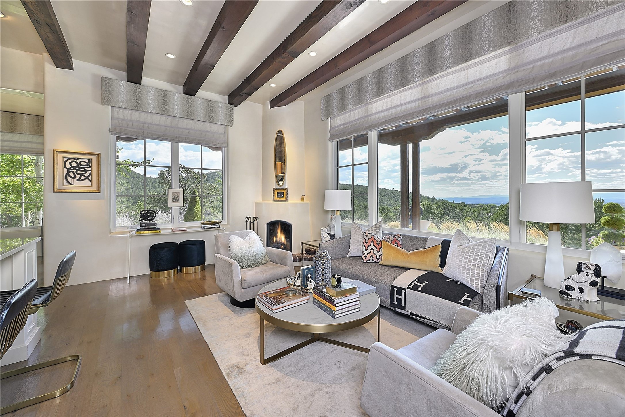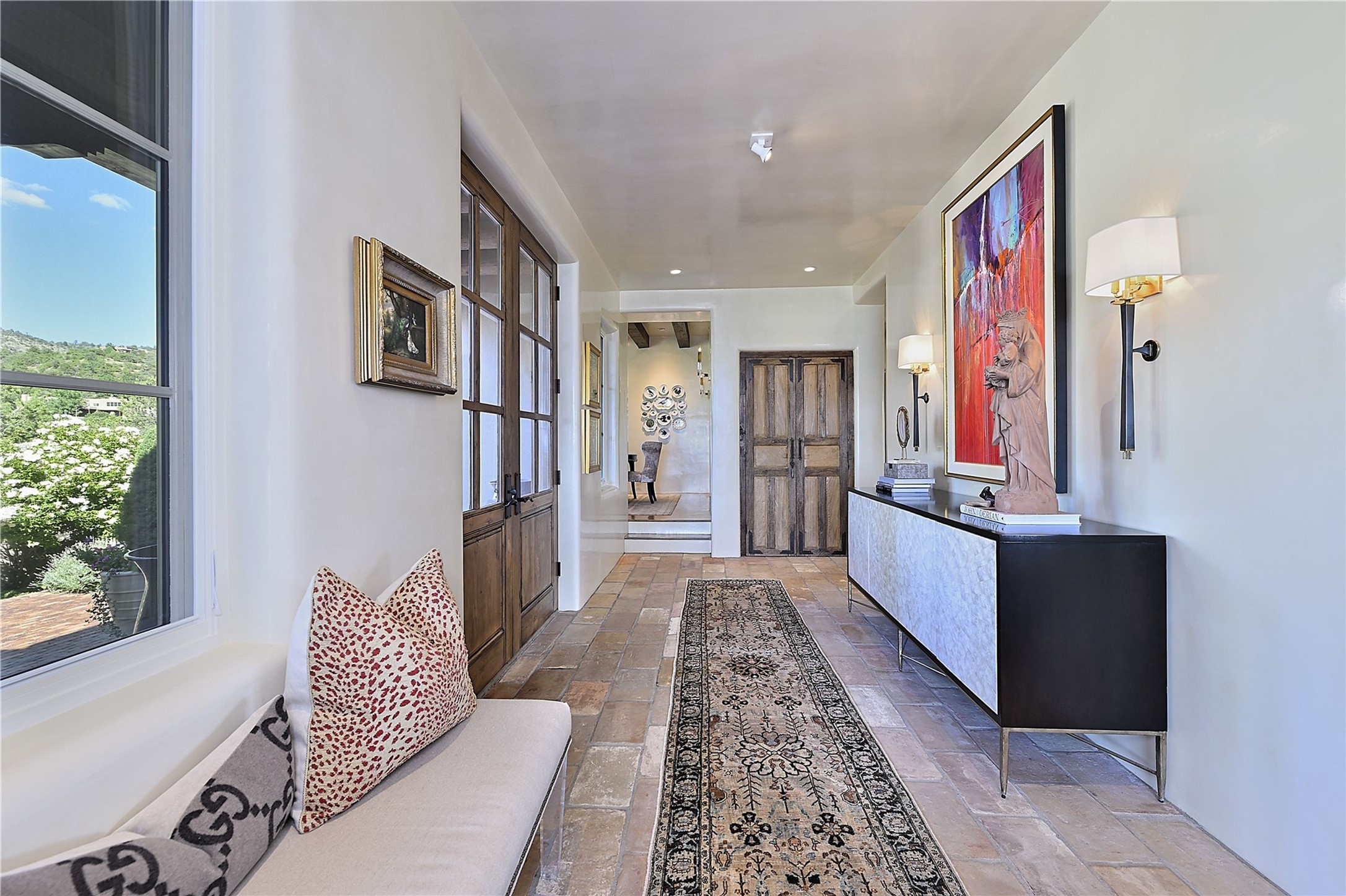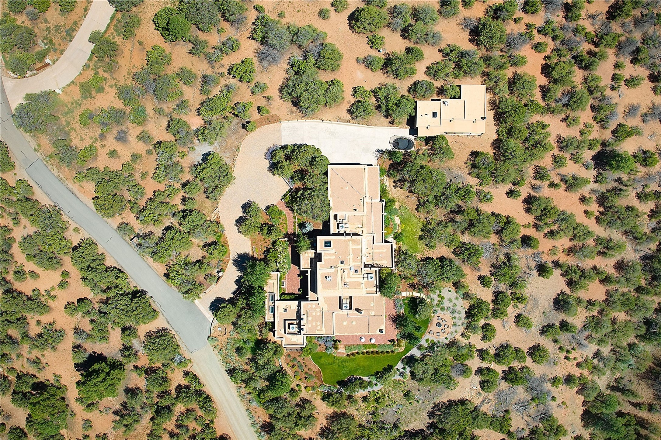 Experience the pinnacle of sophisticated living at this stunning Santa Fe estate. European Elegance Meets Southwestern Splendor at 2216 Wilderness Arroyo! A sanctuary where refined taste meets unparalleled quality--discover the finest in Santa Fe living. Every detail has been meticulously crafted to provide a truly exceptional experience. Nestled on 5.25 acres, within the prestigious Wilderness Gate community, this Woods Builders masterpiece epitomizes European magnificence, seamlessly blending luxury with purposeful privacy. Upon arrival, you are greeted by a private gate, a gracefully curving cobblestone driveway, and beautifully landscaped grounds--an immediate indication of the exceptional quality that awaits. This extraordinary property offers breathtaking views that make it feel like a world apart, while still being conveniently close to downtown Santa Fe. Step inside to discover a home where no detail has been overlooked. The Chef's kitchen, equipped with top-of-the-line appliances, custom cabinetry and Taj Mahal Granite counters, is a culinary dream come true. Surrounding the kitchen, you'll find a formal sitting room, a cozy family gathering area, and a spacious media room--ideal for both grand entertaining and intimate relaxation. The owner's suite is a retreat unto itself, boasting a romantic balcony with sweeping views of the lush grounds, city lights, distant mountains and glorious sunsets. Indulge in the opulent primary bath, designed for ultimate relaxation and pampering. The main residence includes three additional guest bedrooms, thoughtfully separated for privacy. The two upstairs guest rooms feature their own living space and media room, ensuring comfort and convenience for all. Additionally, a separate, self-contained guest house with its own kitchen and laundry facilities offers an ideal space for visitors, extended family, or a remarkable Studio/Office.