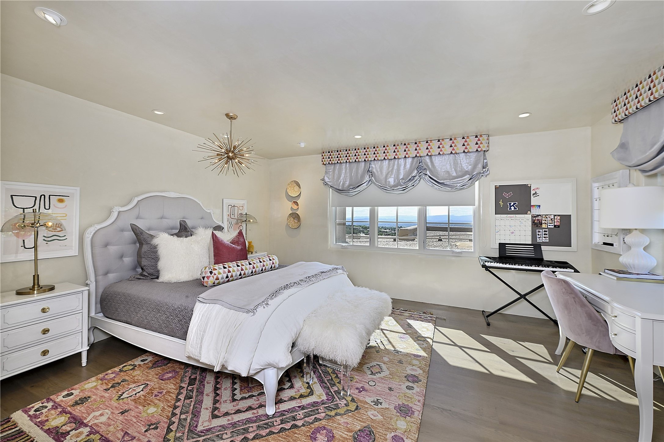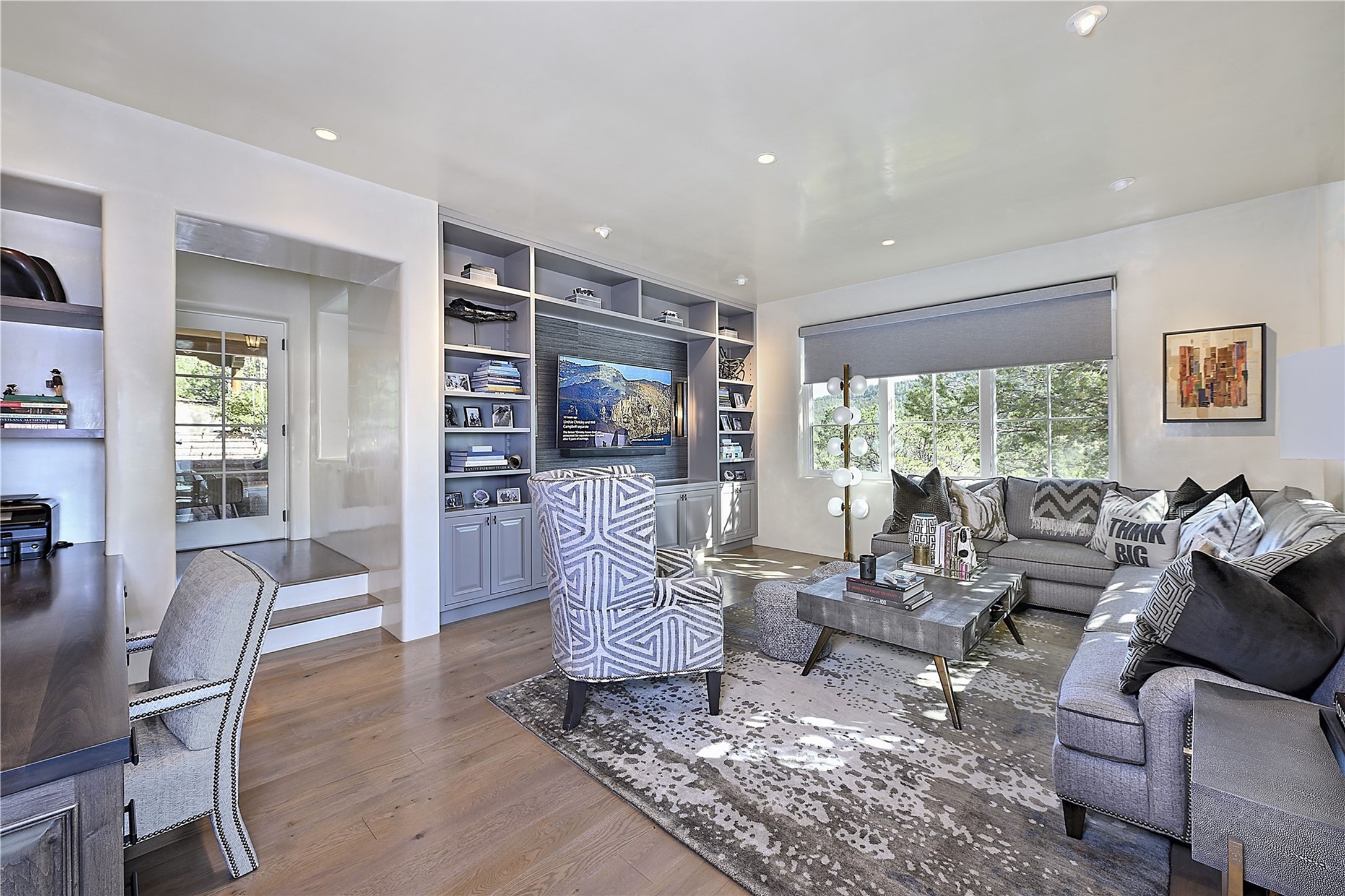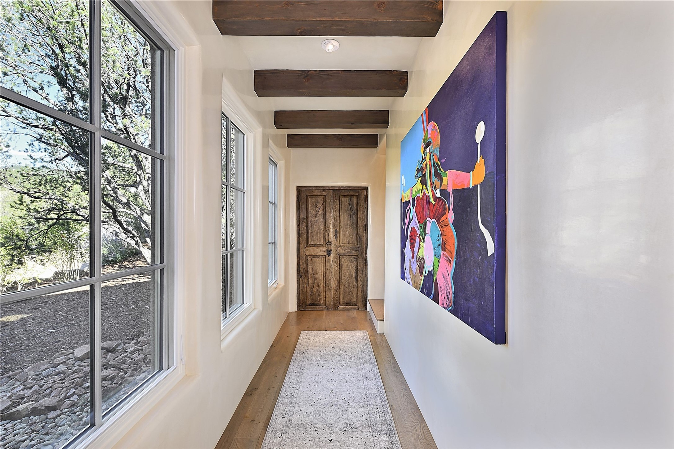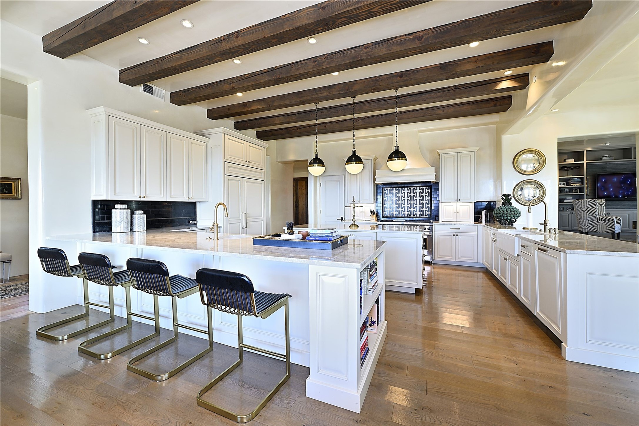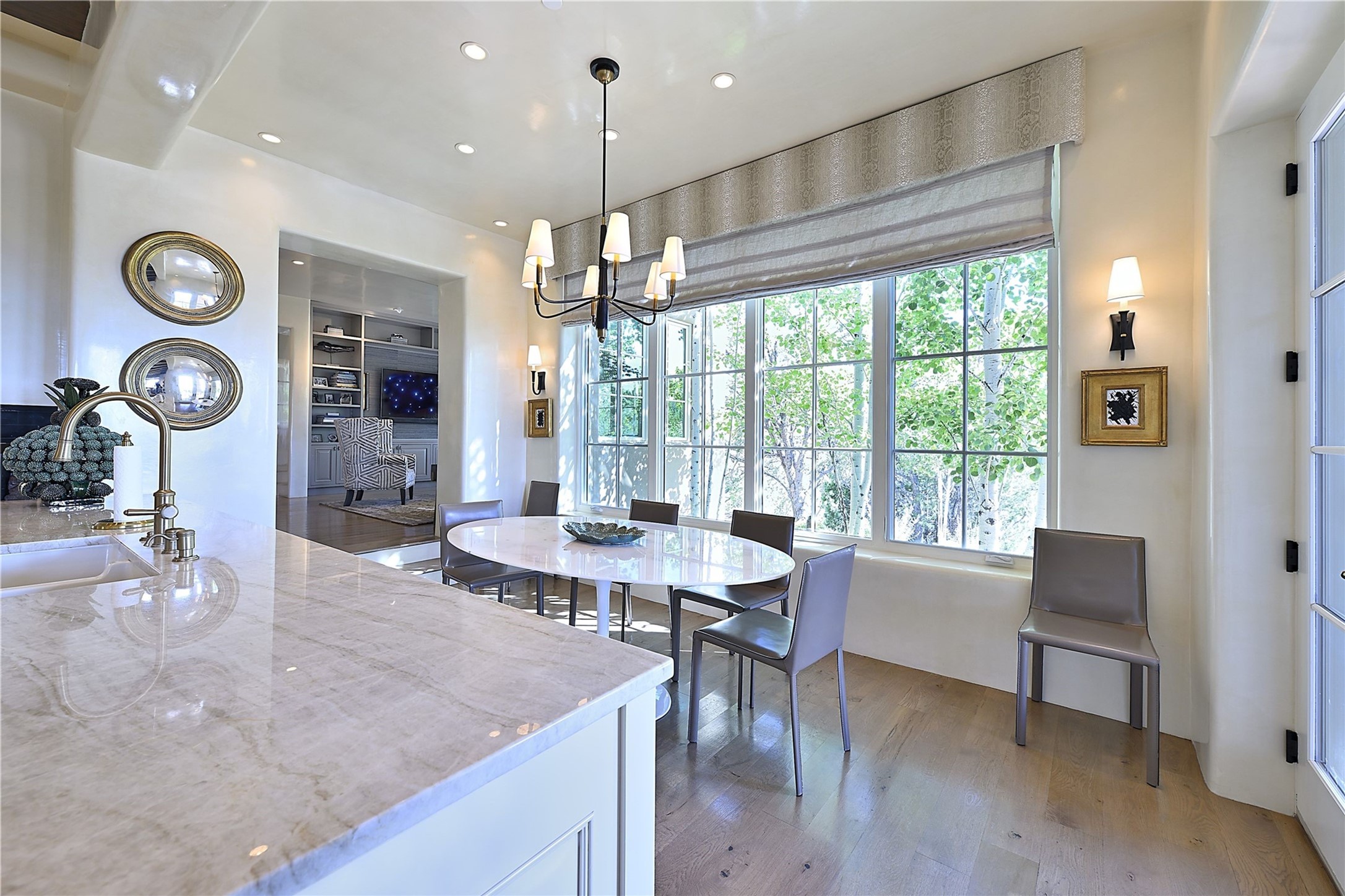 Experience the pinnacle of sophisticated living at this stunning Santa Fe estate. European Elegance Meets Southwestern Splendor at 2216 Wilderness Arroyo! A sanctuary where refined taste meets unparalleled quality--discover the finest in Santa Fe living. Every detail has been meticulously crafted to provide a truly exceptional experience. Nestled on 5.25 acres, within the prestigious Wilderness Gate community, this Woods Builders masterpiece epitomizes European magnificence, seamlessly blending luxury with purposeful privacy. Upon arrival, you are greeted by a private gate, a gracefully curving cobblestone driveway, and beautifully landscaped grounds--an immediate indication of the exceptional quality that awaits. This extraordinary property offers breathtaking views that make it feel like a world apart, while still being conveniently close to downtown Santa Fe. Step inside to discover a home where no detail has been overlooked. The Chef's kitchen, equipped with top-of-the-line appliances, custom cabinetry and Taj Mahal Granite counters, is a culinary dream come true. Surrounding the kitchen, you'll find a formal sitting room, a cozy family gathering area, and a spacious media room--ideal for both grand entertaining and intimate relaxation. The owner's suite is a retreat unto itself, boasting a romantic balcony with sweeping views of the lush grounds, city lights, distant mountains and glorious sunsets. Indulge in the opulent primary bath, designed for ultimate relaxation and pampering. The main residence includes three additional guest bedrooms, thoughtfully separated for privacy. The two upstairs guest rooms feature their own living space and media room, ensuring comfort and convenience for all. Additionally, a separate, self-contained guest house with its own kitchen and laundry facilities offers an ideal space for visitors, extended family, or a remarkable Studio/Office.