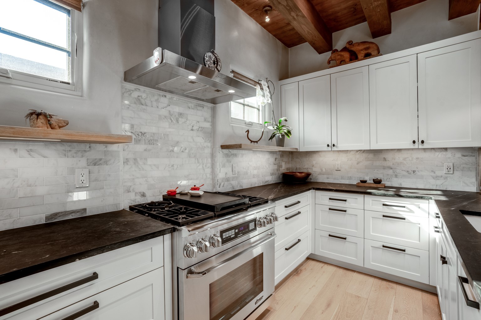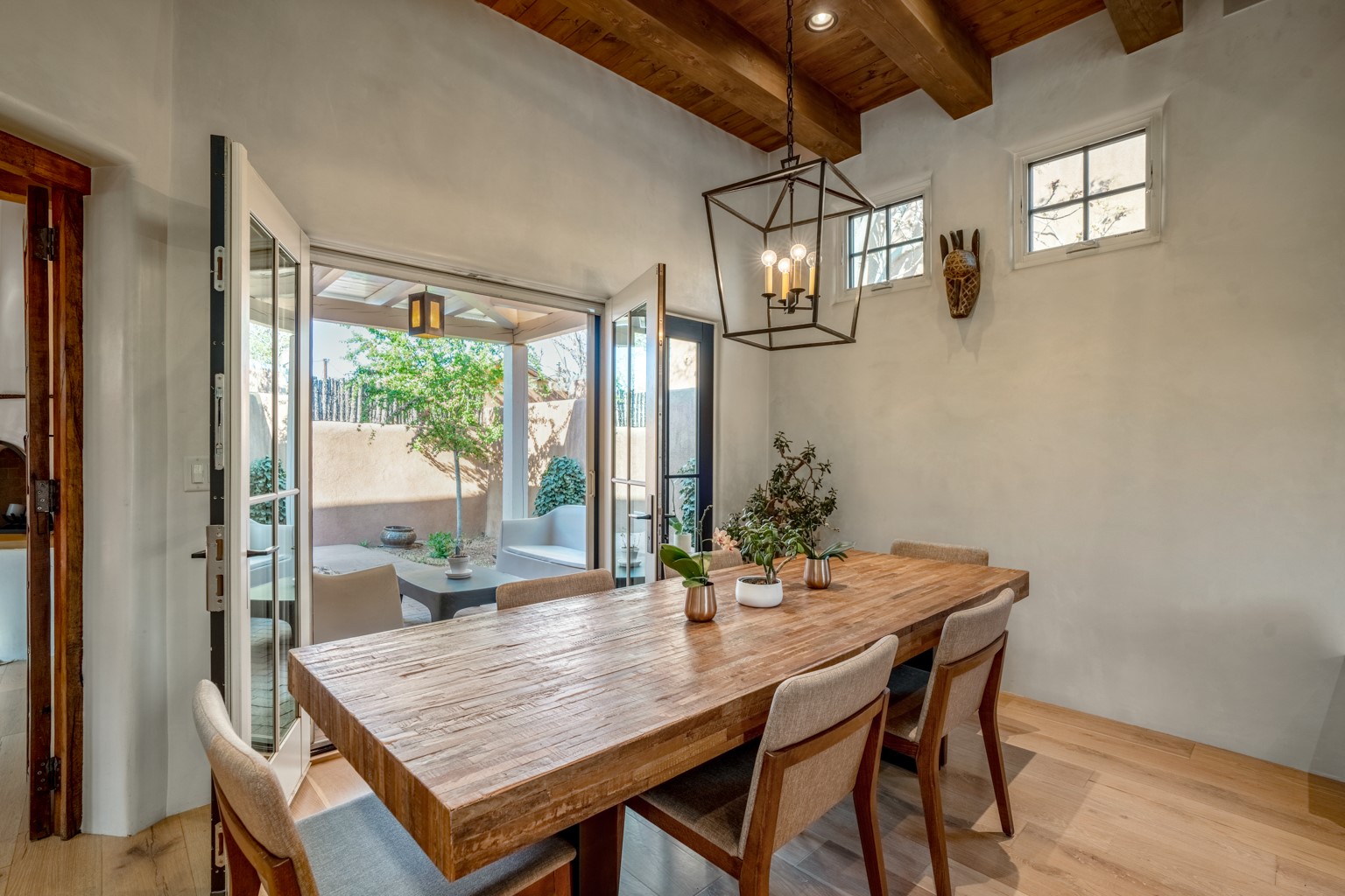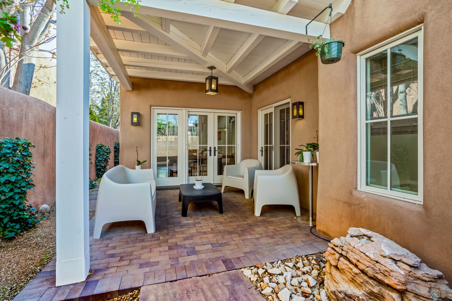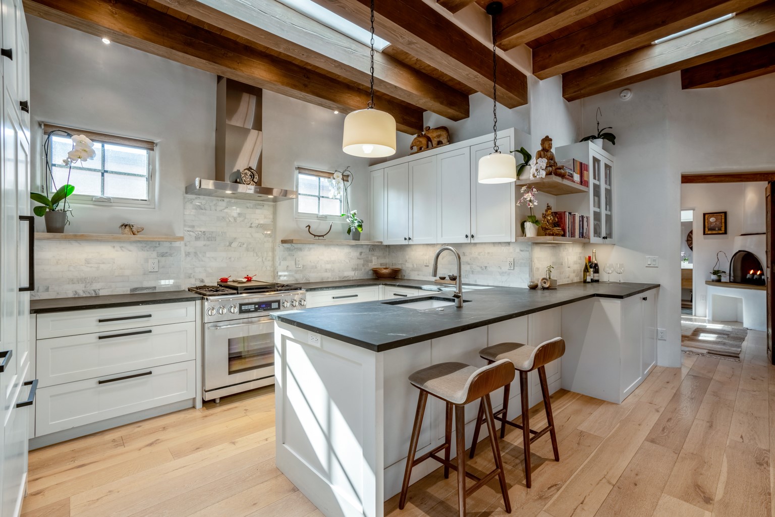 Built in 2017, this stylish 3-bedroom, 3-bath home offers modern comfort in a prime location near the Santa Fe Plaza and Railyard District. The design blends clean contemporary lines with traditional Southwestern elements, creating a warm yet sophisticated ambiance. The open-concept living, dining, and kitchen areas feature soaring ceilings, abundant natural light, and a seamless layout perfect for entertaining. The gourmet kitchen is equipped with high-end appliances, a skylight, generous windows, and a breakfast bar that seats two. French doors in the dining area lead to a covered portal, extending your living space outdoors for alfresco dining and gatherings. The bedrooms are thoughtfully separated for added privacy. The primary suite includes a cozy kiva fireplace, a spacious walk-in closet, and an elegant en suite bath. A finished lower-level bedroom with its own bath and private entrance offers flexible space ideal for a media room, home office, studio, or guest space. Additional highlights include wood and tile flooring throughout, attractive landscaping, a security system, two off-street parking spaces, and energy-efficient certification through Build Green New Mexico (ANSI Standard) and LEED-H.Enjoy easy access to nearby shopping, dining, theaters, museums, and galleries in one of Santa Fe's most desirable neighborhoods.