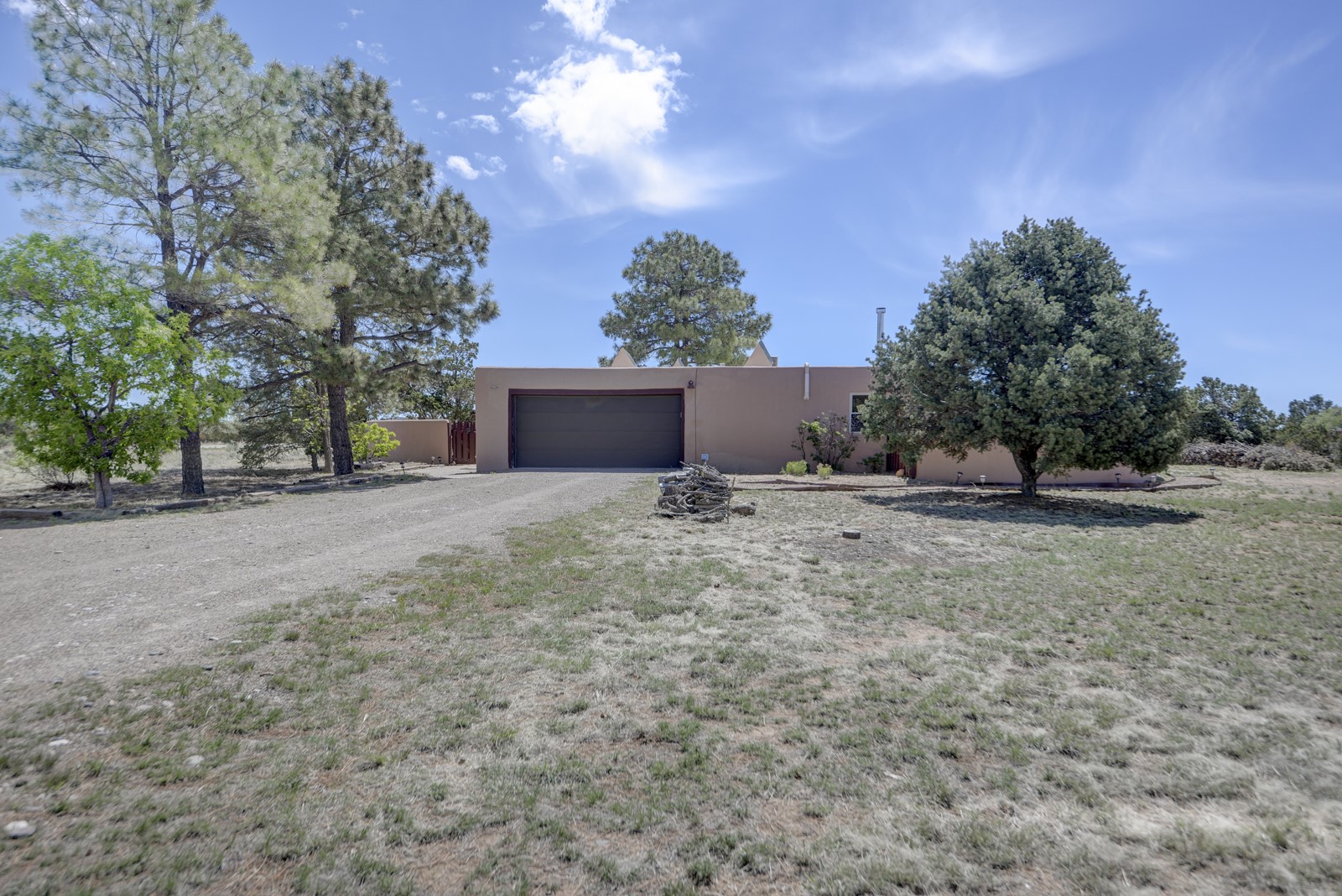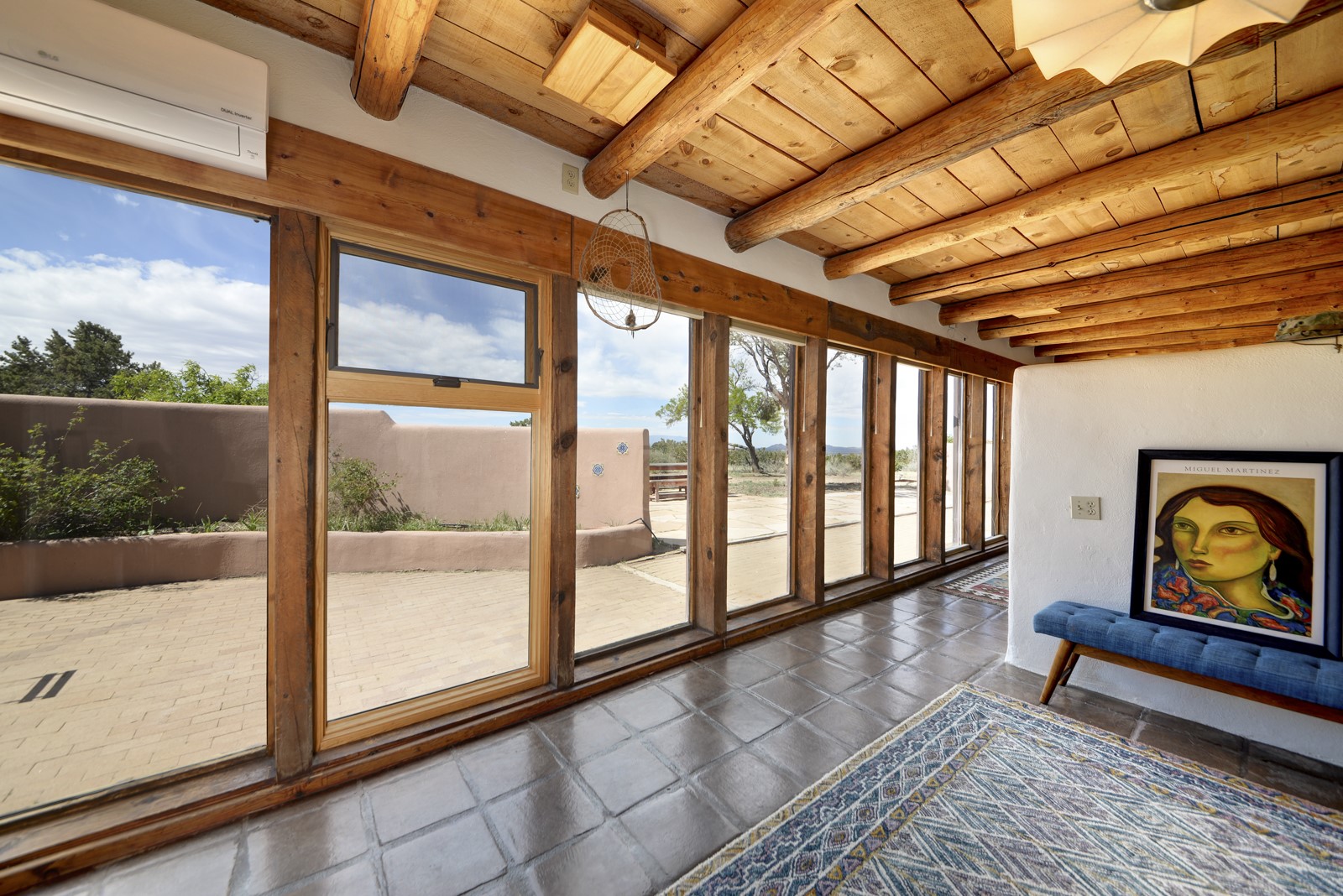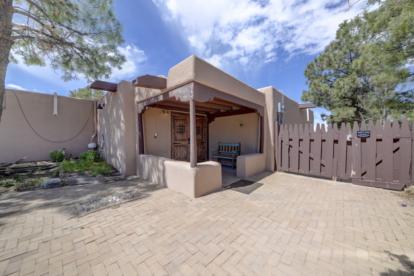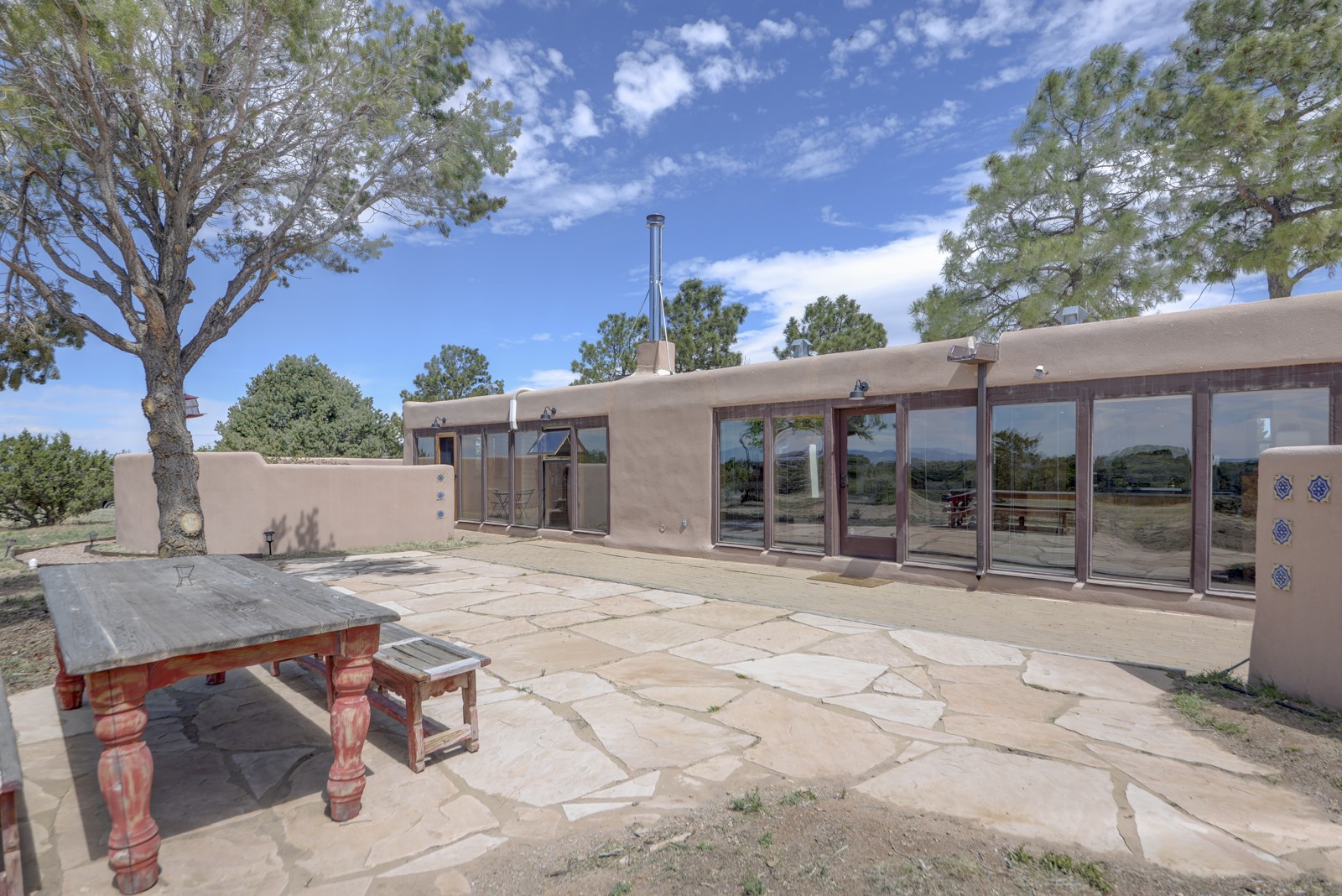 Updated charming ADOBE Passive solar home with a rustic contemporary vibe. It has two bedrooms and an office/bedroom, plus two full bathrooms on a large lot with STUNNING mountain views. The kitchen and both bathrooms were meticulously remodeled in late 2021, featuring sleek, quartz countertops, Fisher/ Paykel refrigerator, JennAir range, and a Bosch dishwasher. In addition, a new TPO roof, hot water tank, and a highly efficient Kuma wood-burning fireplace insert were also added. In 2023, two HVAC mini-split systems were installed, along with six inverters and a new washer/dryer. In 2024, a new hot tub/spa for relaxing and viewing the stellar sunsets, night sky, and bright stars. The primary bedroom features a kiva fireplace, a Trombe wall, and an en-suite bathroom. The bedrooms are on opposite sides of the home with private courtyards. The heated two-car garage has storage shelves and a workbench. The side yard is fully fenced and great for pets. Enjoy miles of walking and biking trails, a community center with a pool, tennis, pickleball courts, and dog parks. El Dorado has its own grocery store, convenience store, post office, gym, clinic, hardware store, senior center, restaurants, etc.. The home is also within blocks of one of the more highly regarded elementary schools in Santa Fe. All within a 15-20 minute drive to Santa Fe.