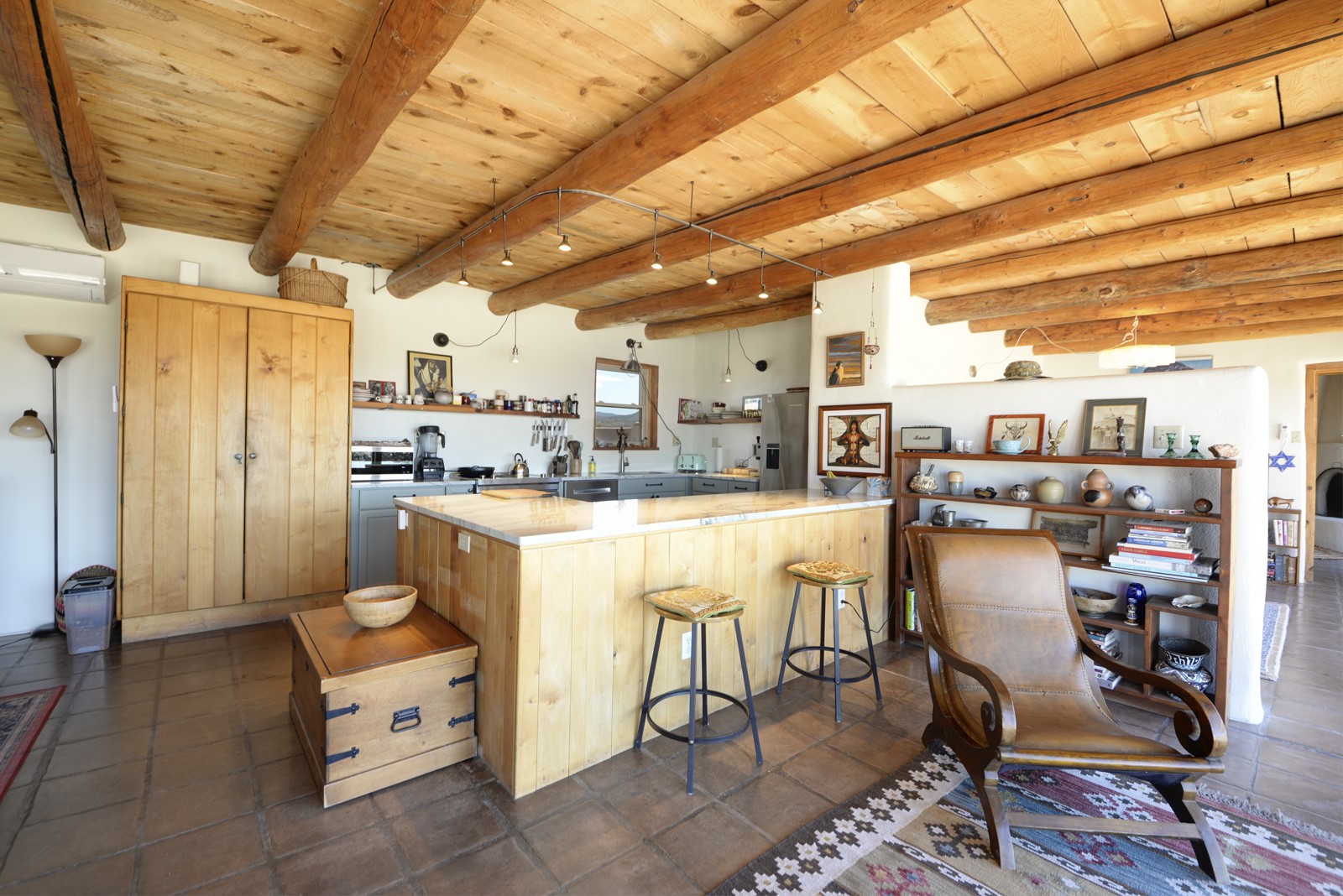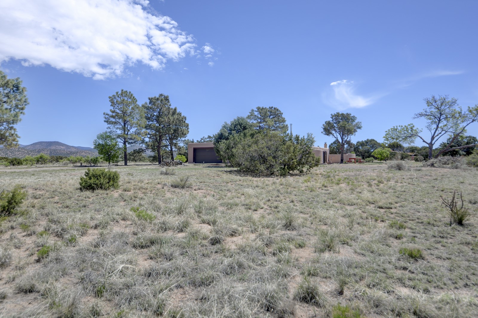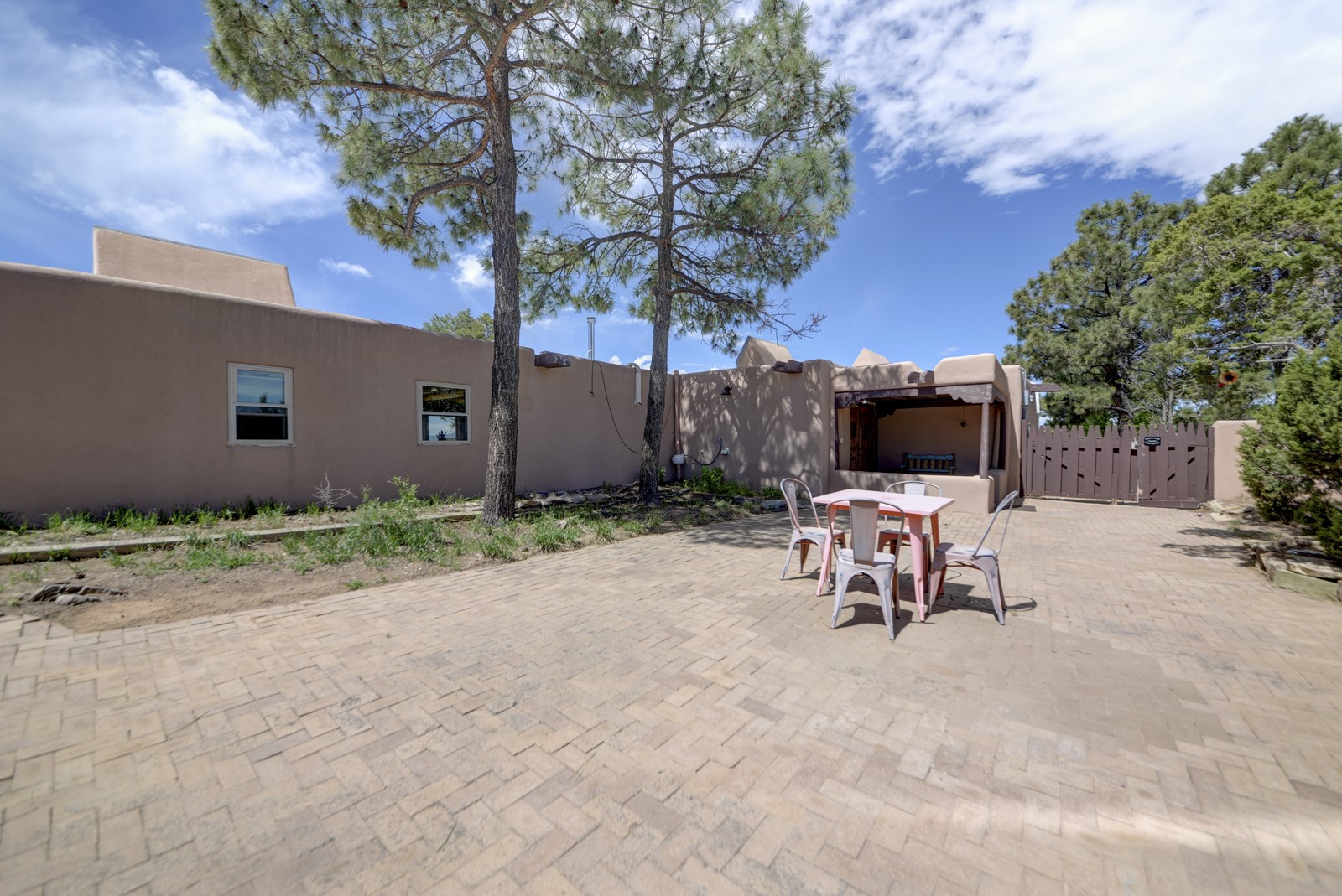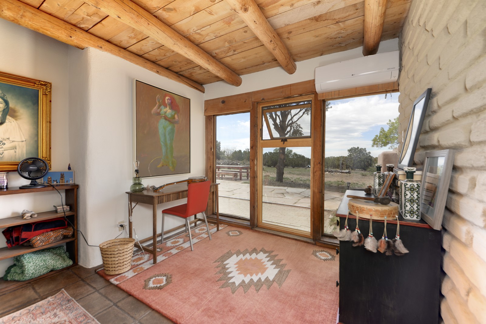 Updated charming ADOBE Passive solar home with a rustic contemporary vibe. It has two bedrooms and an office/bedroom, plus two full bathrooms on a large lot with STUNNING mountain views. The kitchen and both bathrooms were meticulously remodeled in late 2021, featuring sleek, quartz countertops, Fisher/ Paykel refrigerator, JennAir range, and a Bosch dishwasher. In addition, a new TPO roof, hot water tank, and a highly efficient Kuma wood-burning fireplace insert were also added. In 2023, two HVAC mini-split systems were installed, along with six inverters and a new washer/dryer. In 2024, a new hot tub/spa for relaxing and viewing the stellar sunsets, night sky, and bright stars. The primary bedroom features a kiva fireplace, a Trombe wall, and an en-suite bathroom. The bedrooms are on opposite sides of the home with private courtyards. The heated two-car garage has storage shelves and a workbench. The side yard is fully fenced and great for pets. Enjoy miles of walking and biking trails, a community center with a pool, tennis, pickleball courts, and dog parks. El Dorado has its own grocery store, convenience store, post office, gym, clinic, hardware store, senior center, restaurants, etc.. The home is also within blocks of one of the more highly regarded elementary schools in Santa Fe. All within a 15-20 minute drive to Santa Fe.