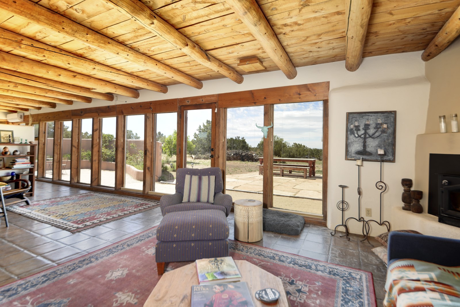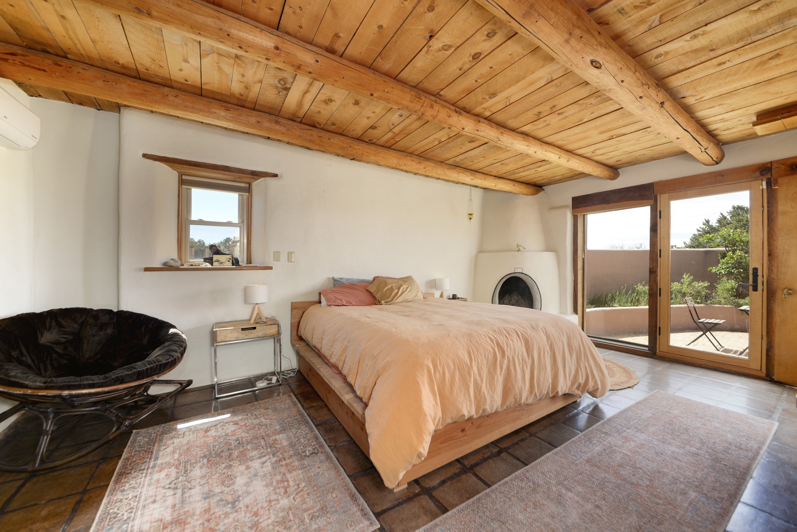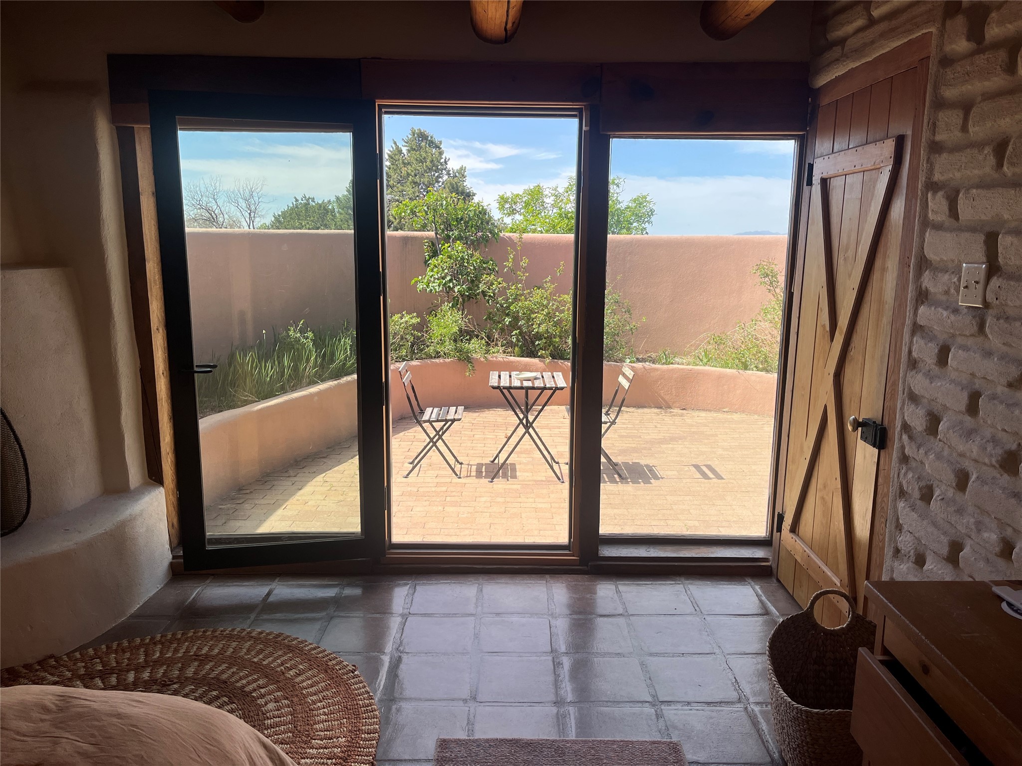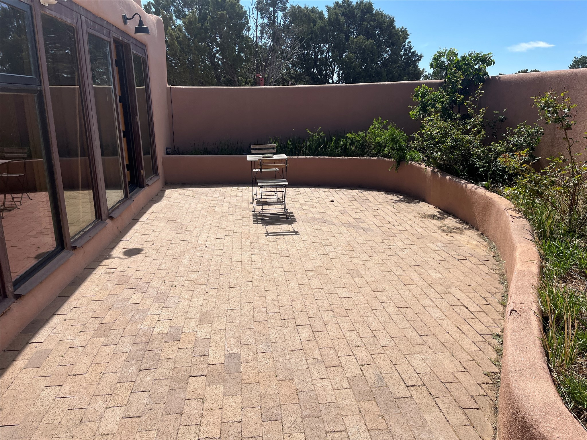 Updated charming ADOBE Passive solar home with a rustic contemporary vibe. It has two bedrooms and an office/bedroom, plus two full bathrooms on a large lot with STUNNING mountain views. The kitchen and both bathrooms were meticulously remodeled in late 2021, featuring sleek, quartz countertops, Fisher/ Paykel refrigerator, JennAir range, and a Bosch dishwasher. In addition, a new TPO roof, hot water tank, and a highly efficient Kuma wood-burning fireplace insert were also added. In 2023, two HVAC mini-split systems were installed, along with six inverters and a new washer/dryer. In 2024, a new hot tub/spa for relaxing and viewing the stellar sunsets, night sky, and bright stars. The primary bedroom features a kiva fireplace, a Trombe wall, and an en-suite bathroom. The bedrooms are on opposite sides of the home with private courtyards. The heated two-car garage has storage shelves and a workbench. The side yard is fully fenced and great for pets. Enjoy miles of walking and biking trails, a community center with a pool, tennis, pickleball courts, and dog parks. El Dorado has its own grocery store, convenience store, post office, gym, clinic, hardware store, senior center, restaurants, etc.. The home is also within blocks of one of the more highly regarded elementary schools in Santa Fe. All within a 15-20 minute drive to Santa Fe.