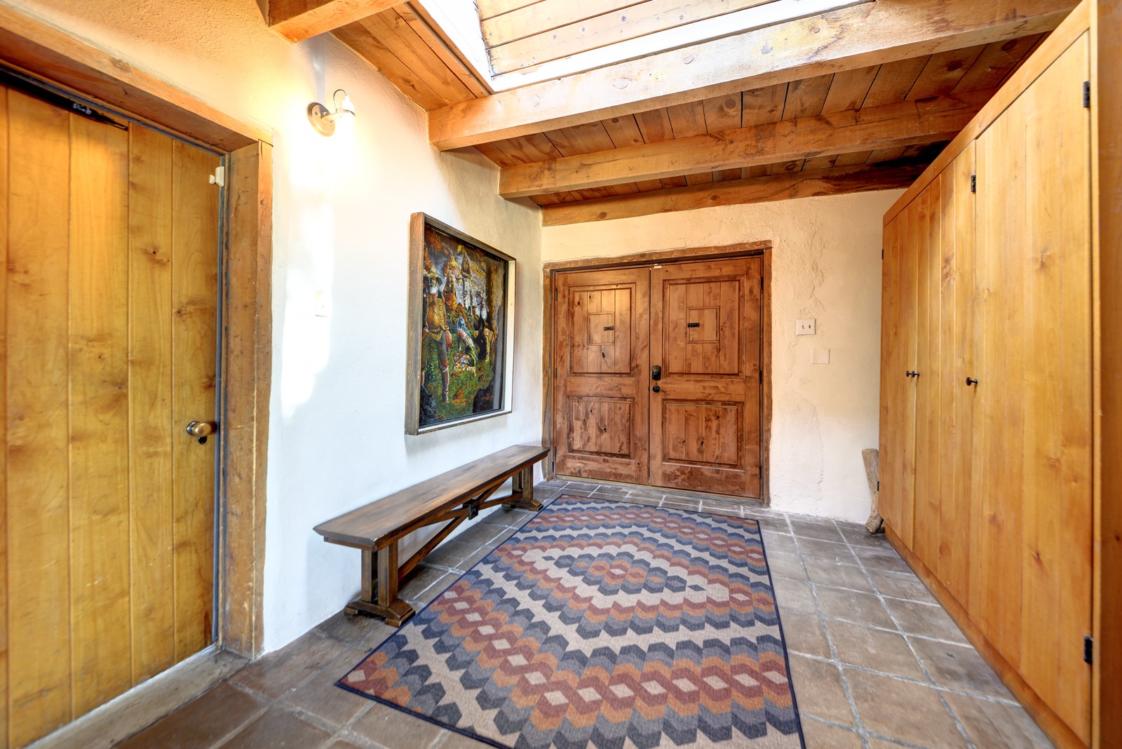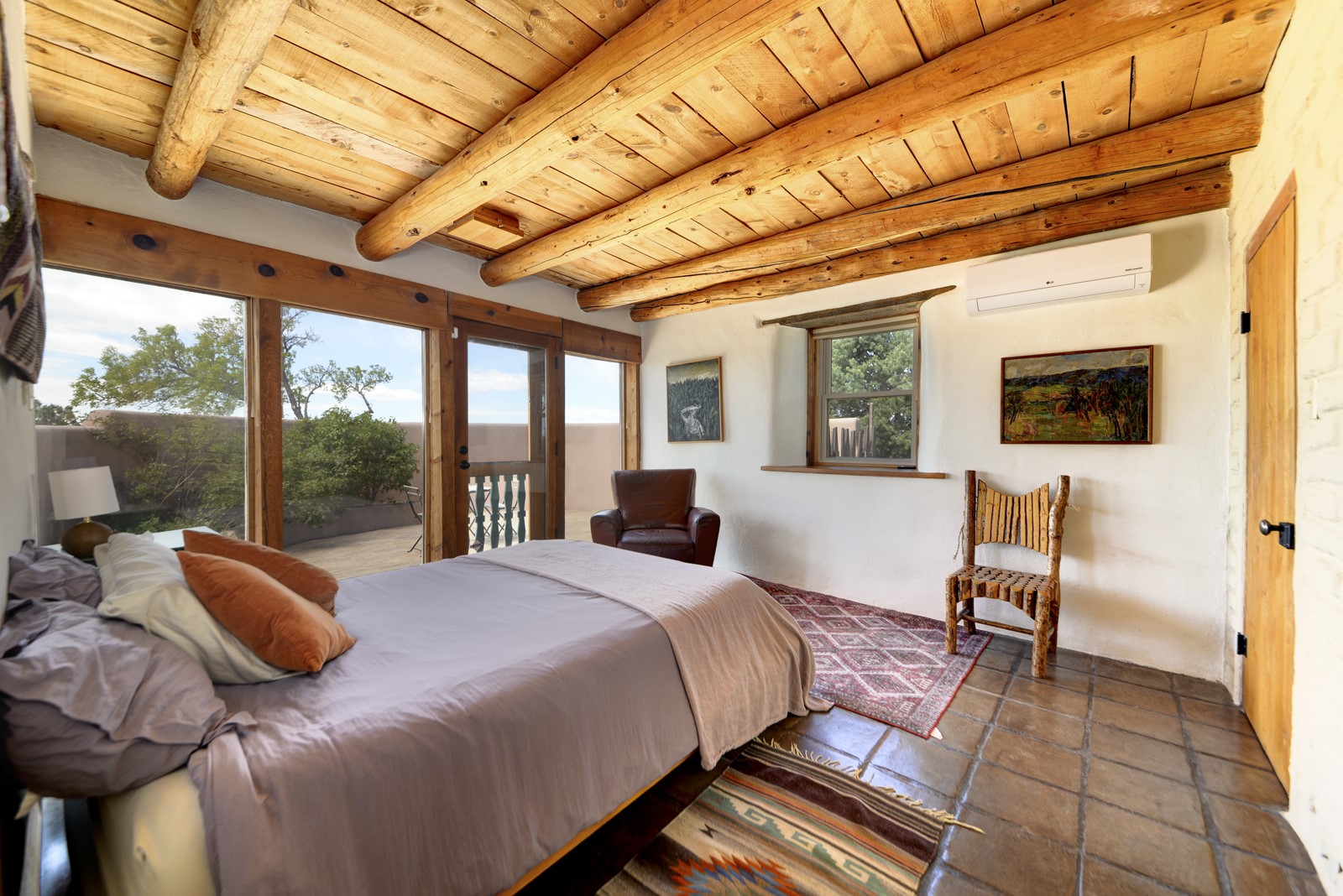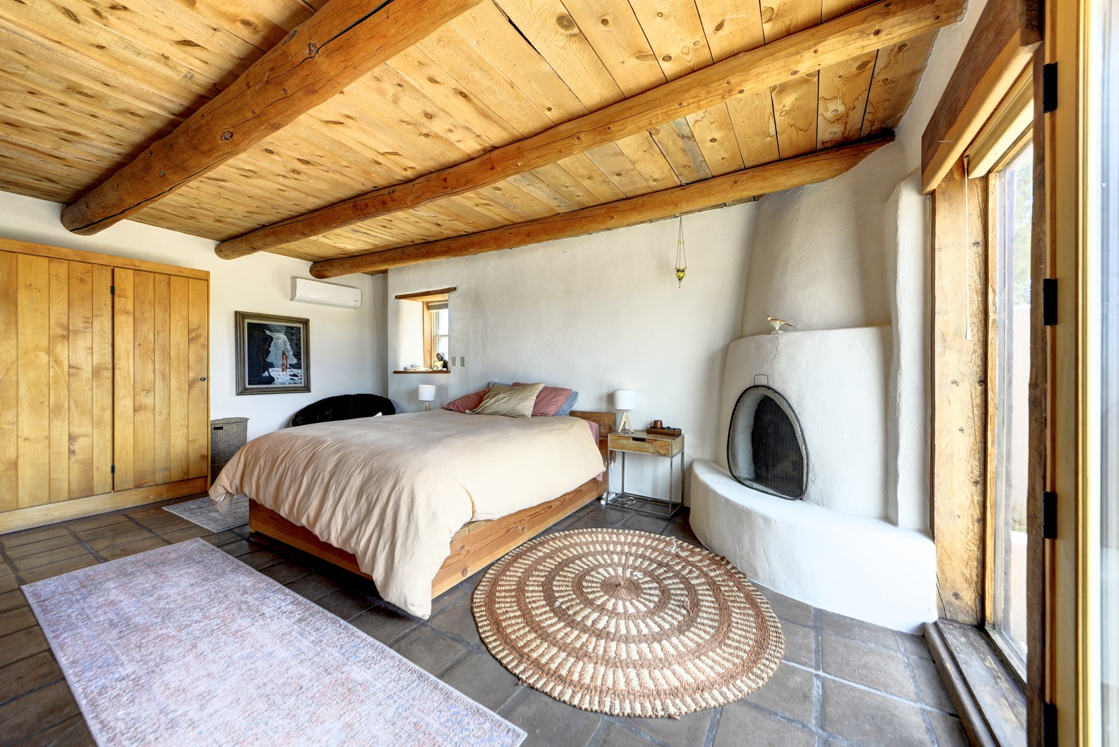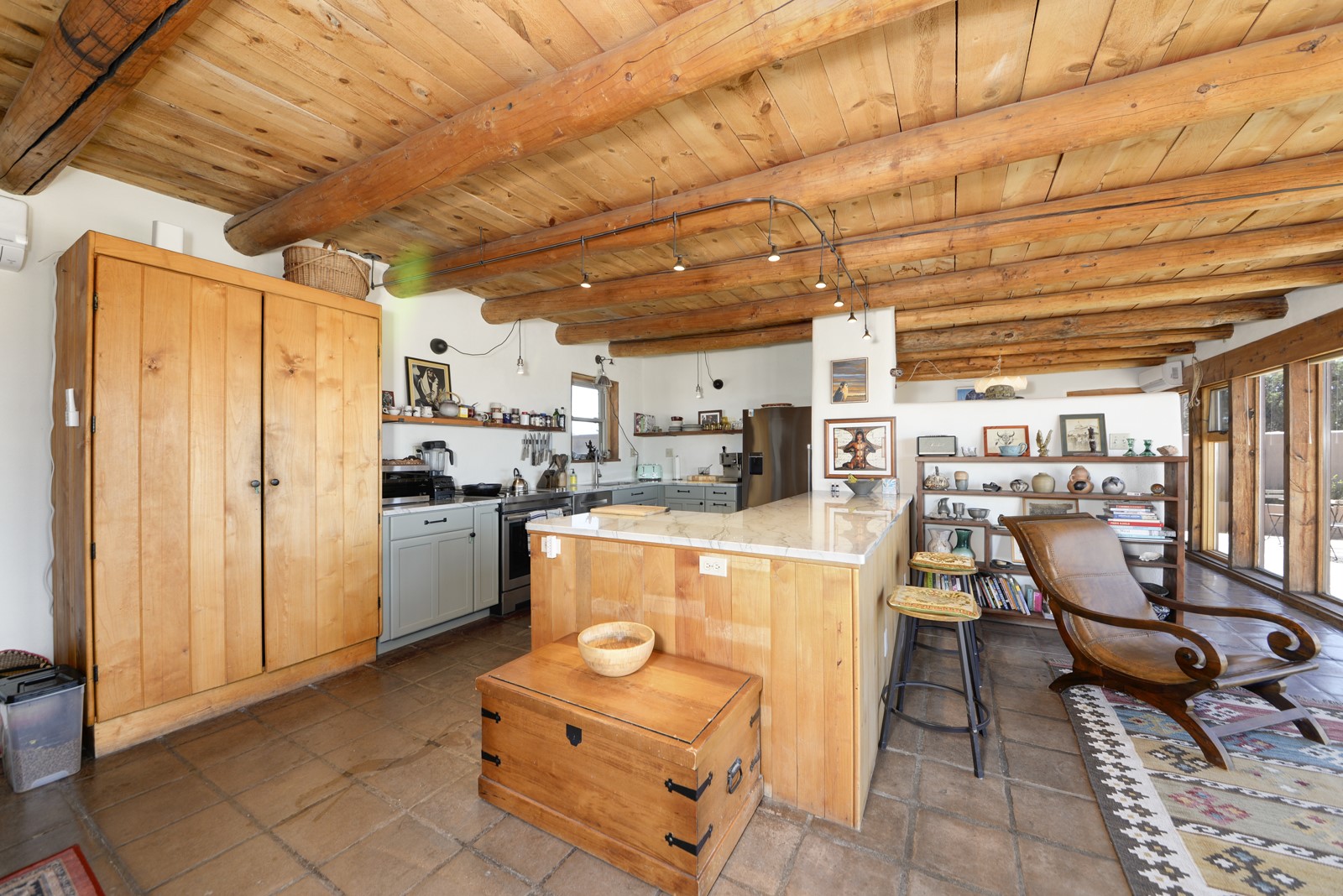 Updated charming ADOBE Passive solar home with a rustic contemporary vibe. It has two bedrooms and an office/bedroom, plus two full bathrooms on a large lot with STUNNING mountain views. The kitchen and both bathrooms were meticulously remodeled in late 2021, featuring sleek, quartz countertops, Fisher/ Paykel refrigerator, JennAir range, and a Bosch dishwasher. In addition, a new TPO roof, hot water tank, and a highly efficient Kuma wood-burning fireplace insert were also added. In 2023, two HVAC mini-split systems were installed, along with six inverters and a new washer/dryer. In 2024, a new hot tub/spa for relaxing and viewing the stellar sunsets, night sky, and bright stars. The primary bedroom features a kiva fireplace, a Trombe wall, and an en-suite bathroom. The bedrooms are on opposite sides of the home with private courtyards. The heated two-car garage has storage shelves and a workbench. The side yard is fully fenced and great for pets. Enjoy miles of walking and biking trails, a community center with a pool, tennis, pickleball courts, and dog parks. El Dorado has its own grocery store, convenience store, post office, gym, clinic, hardware store, senior center, restaurants, etc.. The home is also within blocks of one of the more highly regarded elementary schools in Santa Fe. All within a 15-20 minute drive to Santa Fe.
