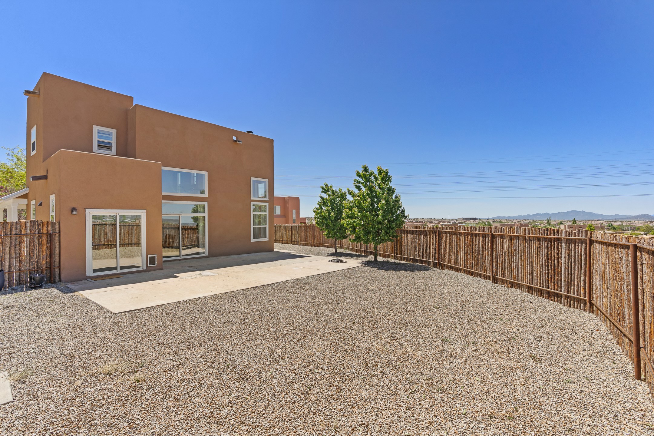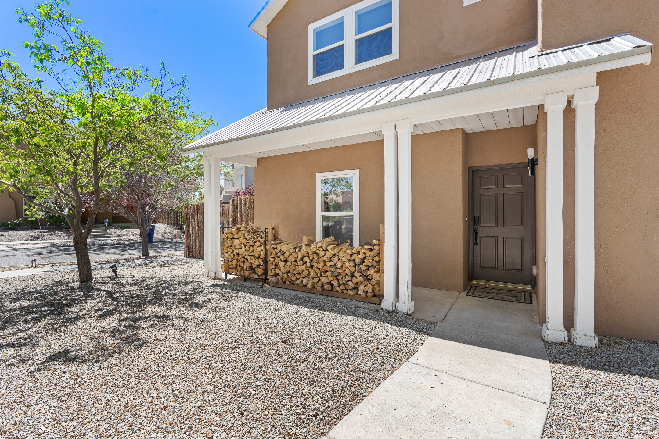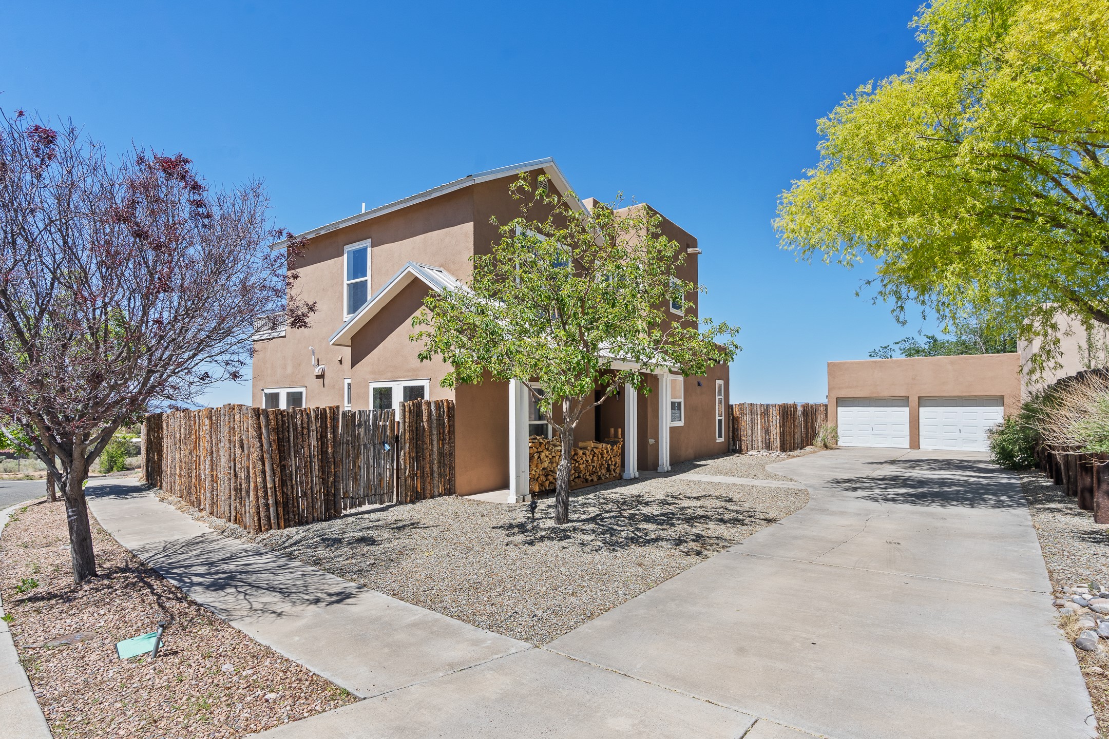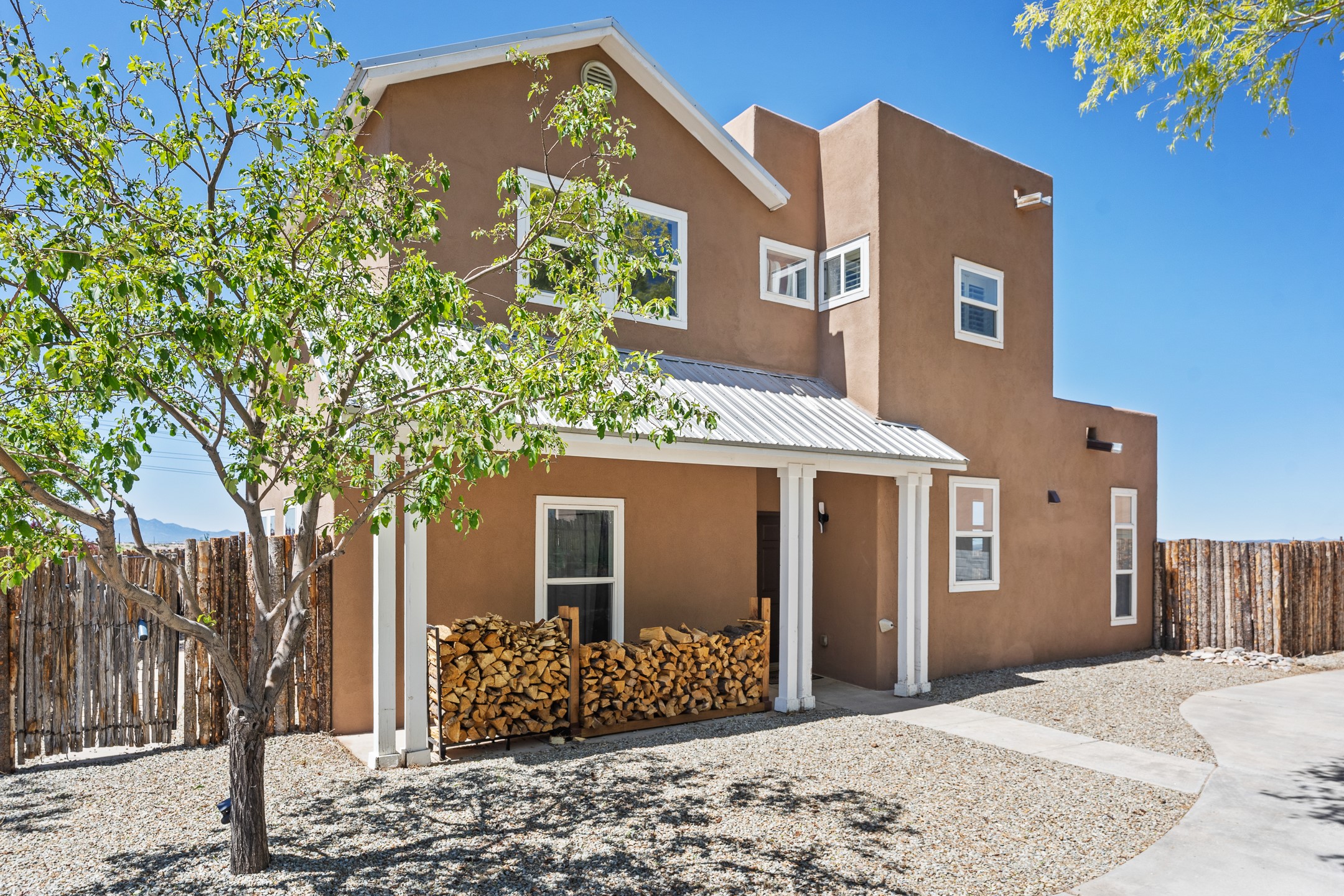 Welcome to 4124 Big Sky Road, a beautifully updated home in the highly desirable Nava Ade Subdivision. With 1,632 square feet of stylish and comfortable living space, this light-filled residence offers thoughtful design and exceptional outdoor living. The spacious primary suite is located upstairs, featuring a walk-in closet and a luxurious ensuite bath complete with double sinks, a freestanding soaking tub, and a separate shower. Downstairs, two guest bedrooms provide privacy for family or visitors and are conveniently located near a full guest bath and laundry room. Generous closet space throughout ensures plenty of storage. The living room impresses with soaring ceilings, large picture windows that flood the space with natural light, and a cozy fireplace--complete with stacked wood ready for crisp fall and winter nights. Two sliding glass doors--one off the dining area and another off the breakfast nook--open to a generous backyard enclosed with coyote fencing. Enjoy summer evenings on the spacious patio, gravel-lined walkways, and a perfect view of Santa Fe Place Mall's Fourth of July fireworks, giving you a front-row seat to your own private show. The updated kitchen showcases modern flair with quartz countertops, floating shelves, a designer backsplash, high-end appliances, a custom hood, and a freestanding island from Raven that stays with the home. Tiled flooring throughout adds a cohesive and elegant touch. A long private driveway leads to a detached two-car garage, and residents enjoy access to Nava Ade's clubhouse, pool, and parks. Don't miss this opportunity to own a stunning home in one of Santa Fe's most beloved communities. The sellers were drawn to this home for its stunning evening skies--and they know the new owners will fall in love with them too.