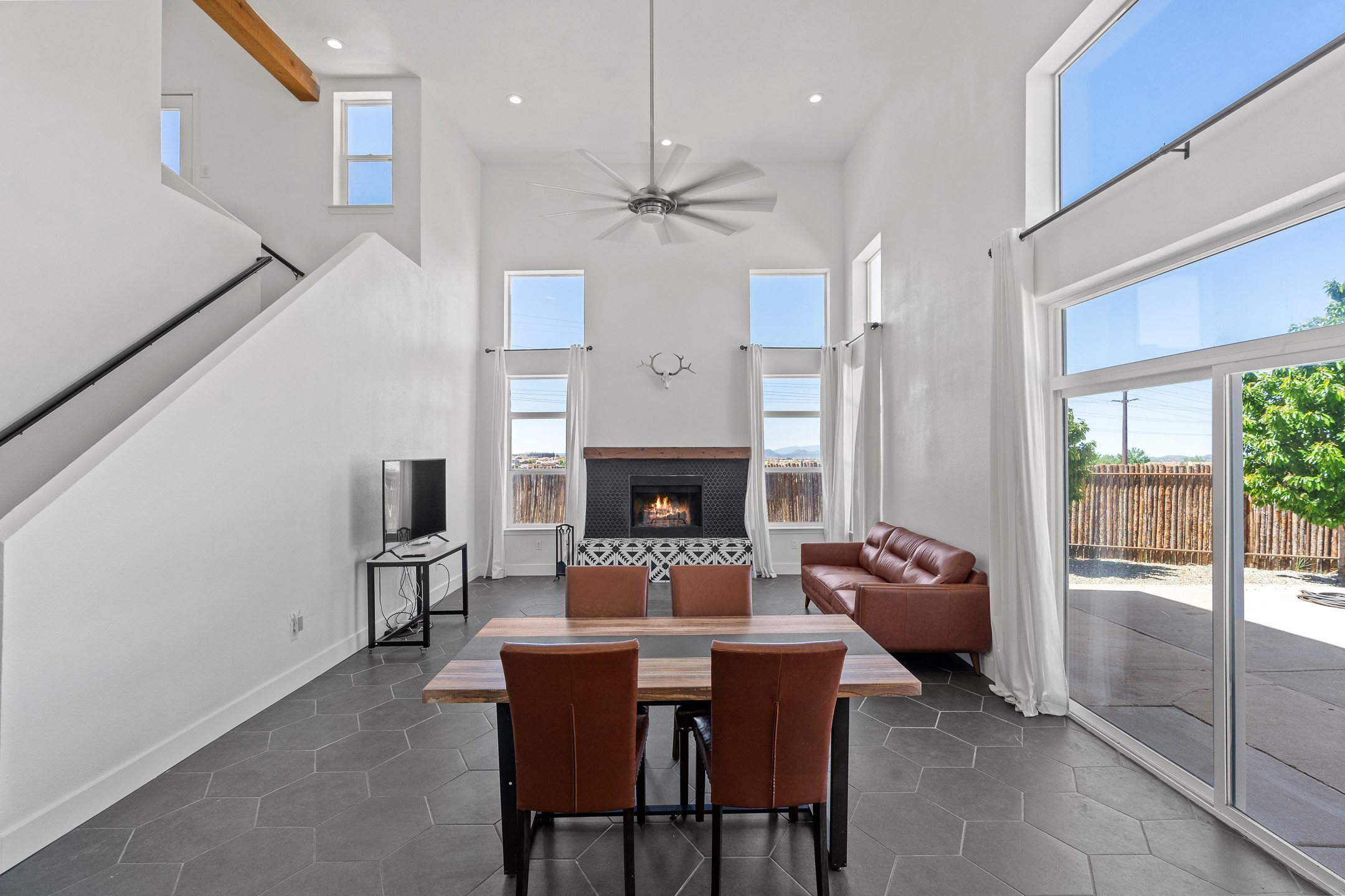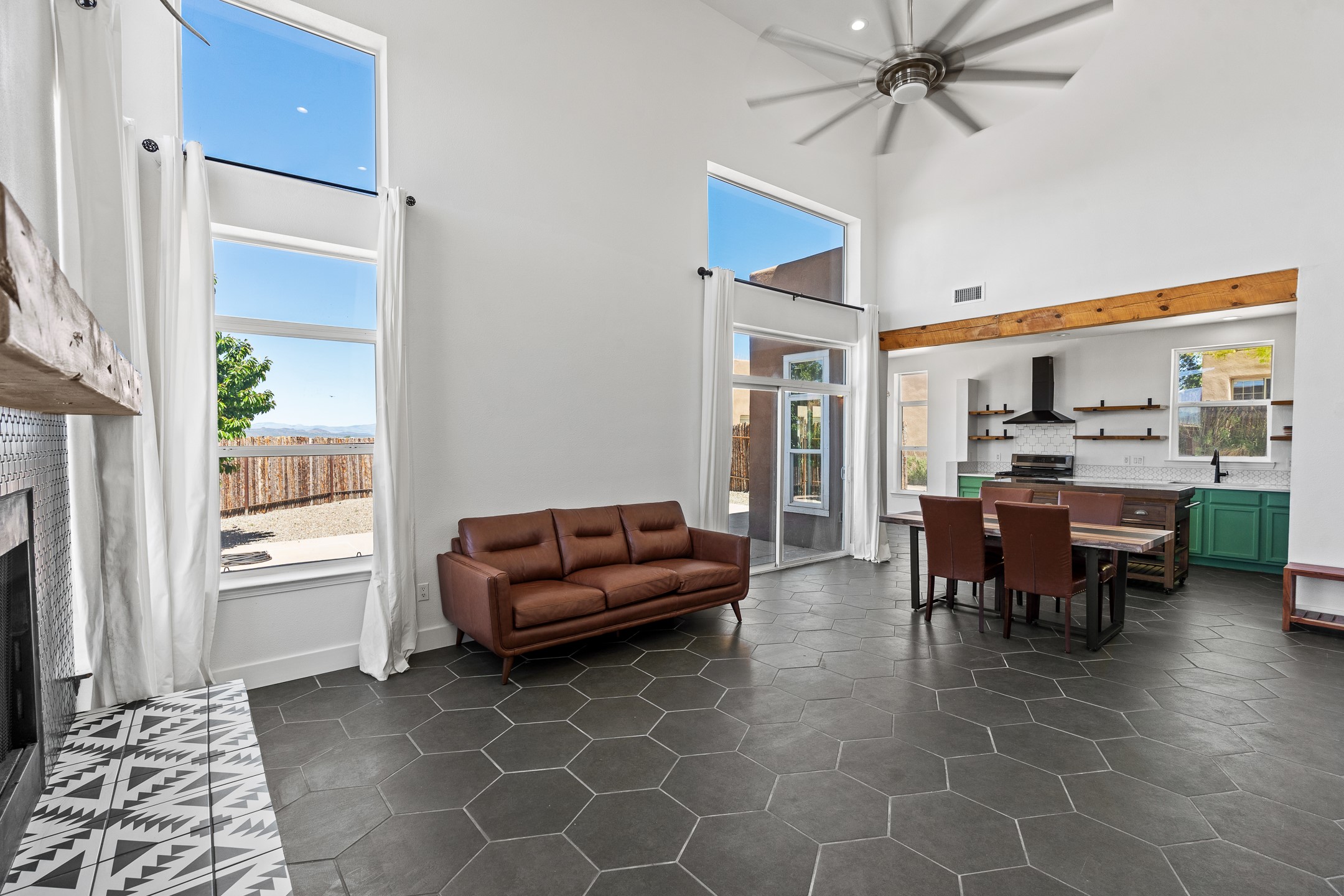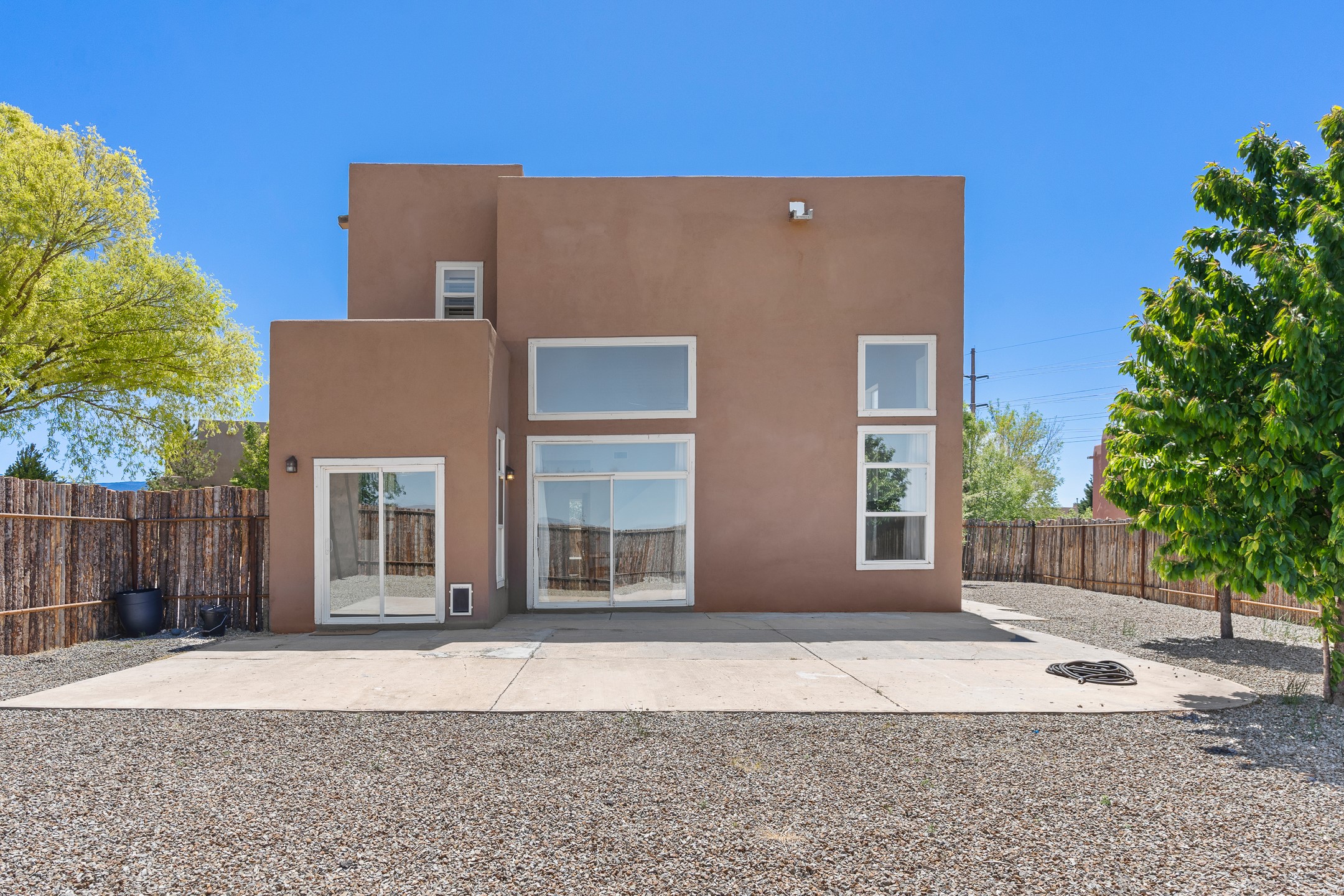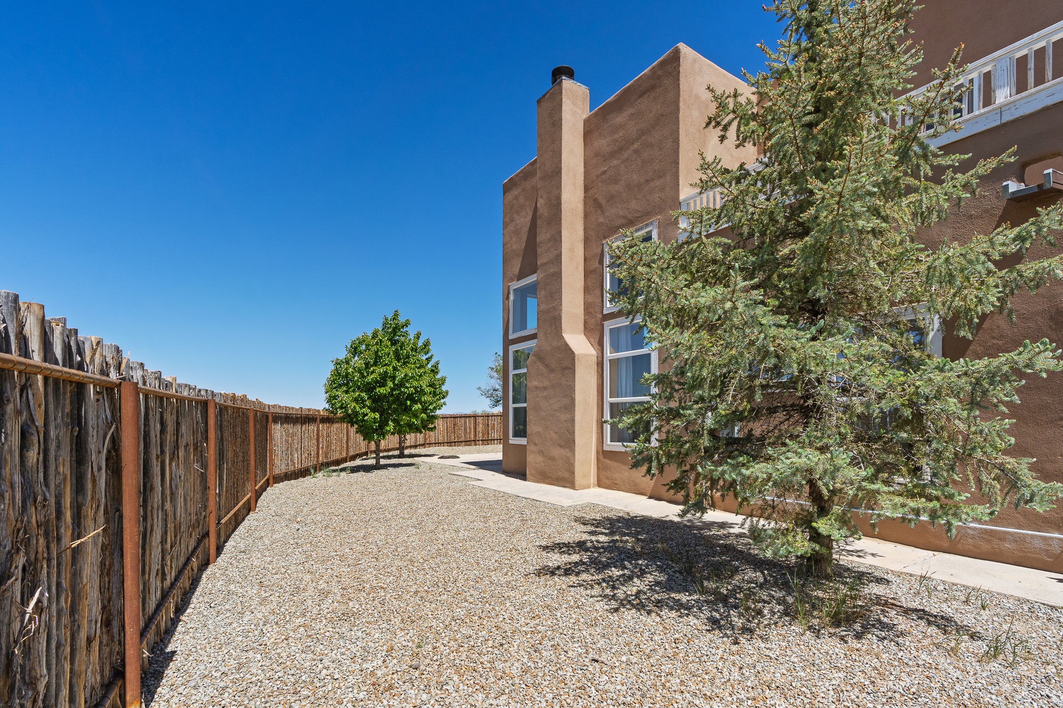 Welcome to 4124 Big Sky Road, a beautifully updated home in the highly desirable Nava Ade Subdivision. With 1,632 square feet of stylish and comfortable living space, this light-filled residence offers thoughtful design and exceptional outdoor living. The spacious primary suite is located upstairs, featuring a walk-in closet and a luxurious ensuite bath complete with double sinks, a freestanding soaking tub, and a separate shower. Downstairs, two guest bedrooms provide privacy for family or visitors and are conveniently located near a full guest bath and laundry room. Generous closet space throughout ensures plenty of storage. The living room impresses with soaring ceilings, large picture windows that flood the space with natural light, and a cozy fireplace--complete with stacked wood ready for crisp fall and winter nights. Two sliding glass doors--one off the dining area and another off the breakfast nook--open to a generous backyard enclosed with coyote fencing. Enjoy summer evenings on the spacious patio, gravel-lined walkways, and a perfect view of Santa Fe Place Mall's Fourth of July fireworks, giving you a front-row seat to your own private show. The updated kitchen showcases modern flair with quartz countertops, floating shelves, a designer backsplash, high-end appliances, a custom hood, and a freestanding island from Raven that stays with the home. Tiled flooring throughout adds a cohesive and elegant touch. A long private driveway leads to a detached two-car garage, and residents enjoy access to Nava Ade's clubhouse, pool, and parks. Don't miss this opportunity to own a stunning home in one of Santa Fe's most beloved communities. The sellers were drawn to this home for its stunning evening skies--and they know the new owners will fall in love with them too.