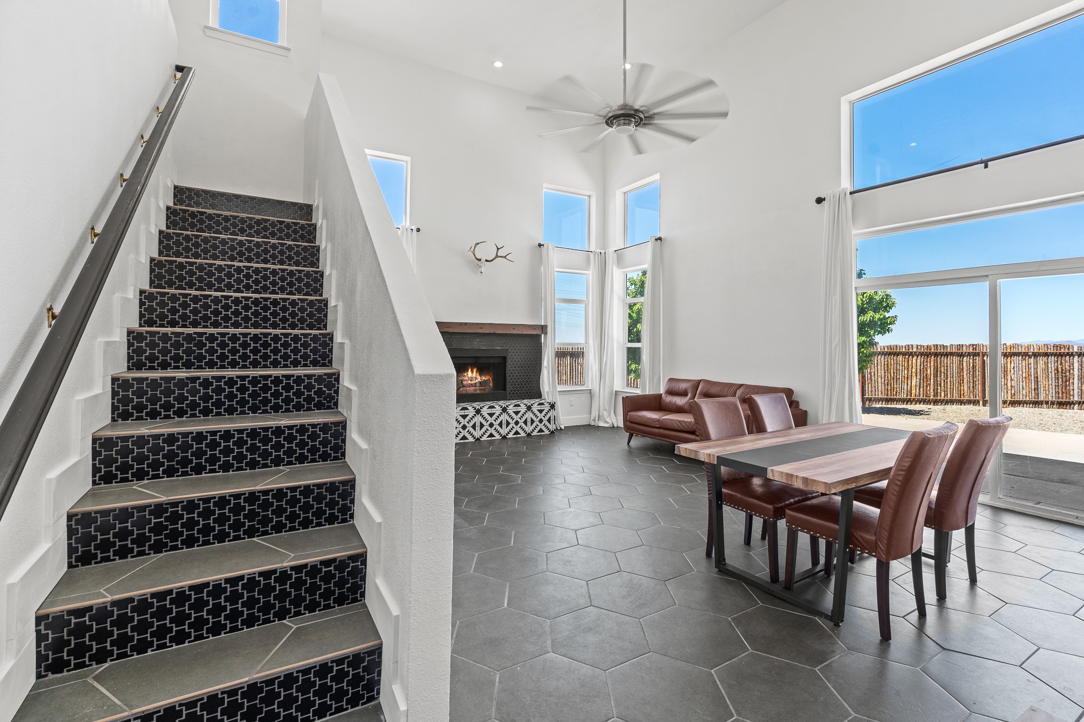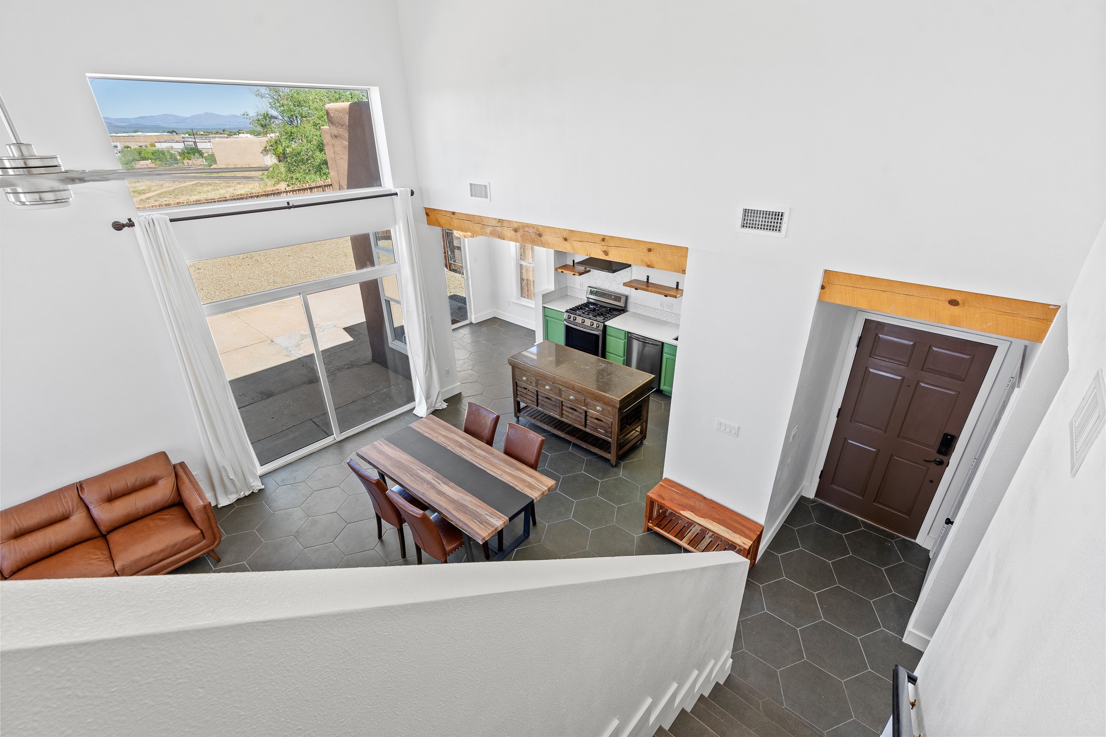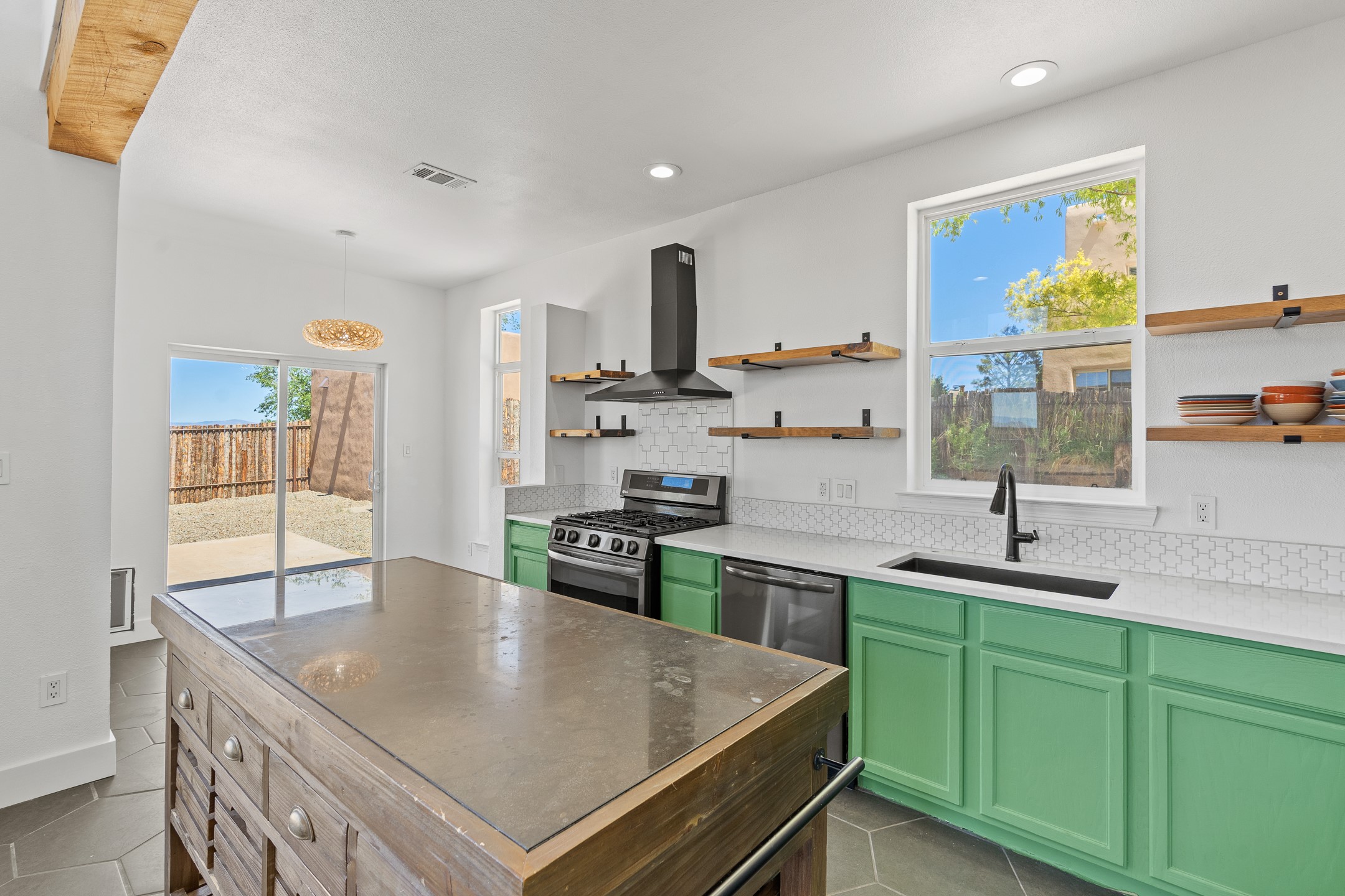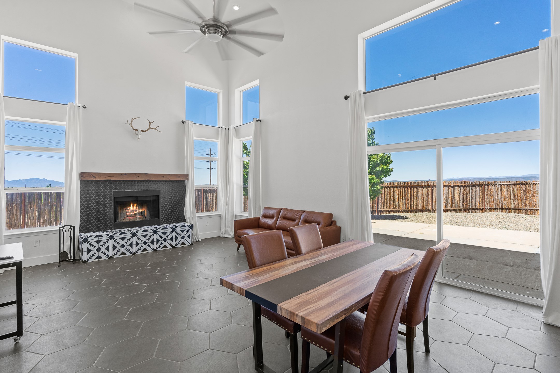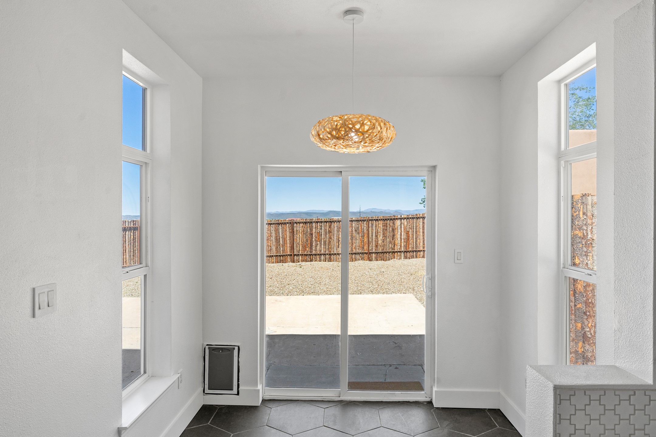 Welcome to 4124 Big Sky Road, a beautifully updated home in the highly desirable Nava Ade Subdivision. With 1,632 square feet of stylish and comfortable living space, this light-filled residence offers thoughtful design and exceptional outdoor living. The spacious primary suite is located upstairs, featuring a walk-in closet and a luxurious ensuite bath complete with double sinks, a freestanding soaking tub, and a separate shower. Downstairs, two guest bedrooms provide privacy for family or visitors and are conveniently located near a full guest bath and laundry room. Generous closet space throughout ensures plenty of storage. The living room impresses with soaring ceilings, large picture windows that flood the space with natural light, and a cozy fireplace--complete with stacked wood ready for crisp fall and winter nights. Two sliding glass doors--one off the dining area and another off the breakfast nook--open to a generous backyard enclosed with coyote fencing. Enjoy summer evenings on the spacious patio, gravel-lined walkways, and a perfect view of Santa Fe Place Mall's Fourth of July fireworks, giving you a front-row seat to your own private show. The updated kitchen showcases modern flair with quartz countertops, floating shelves, a designer backsplash, high-end appliances, a custom hood, and a freestanding island from Raven that stays with the home. Tiled flooring throughout adds a cohesive and elegant touch. A long private driveway leads to a detached two-car garage, and residents enjoy access to Nava Ade's clubhouse, pool, and parks. Don't miss this opportunity to own a stunning home in one of Santa Fe's most beloved communities. The sellers were drawn to this home for its stunning evening skies--and they know the new owners will fall in love with them too.