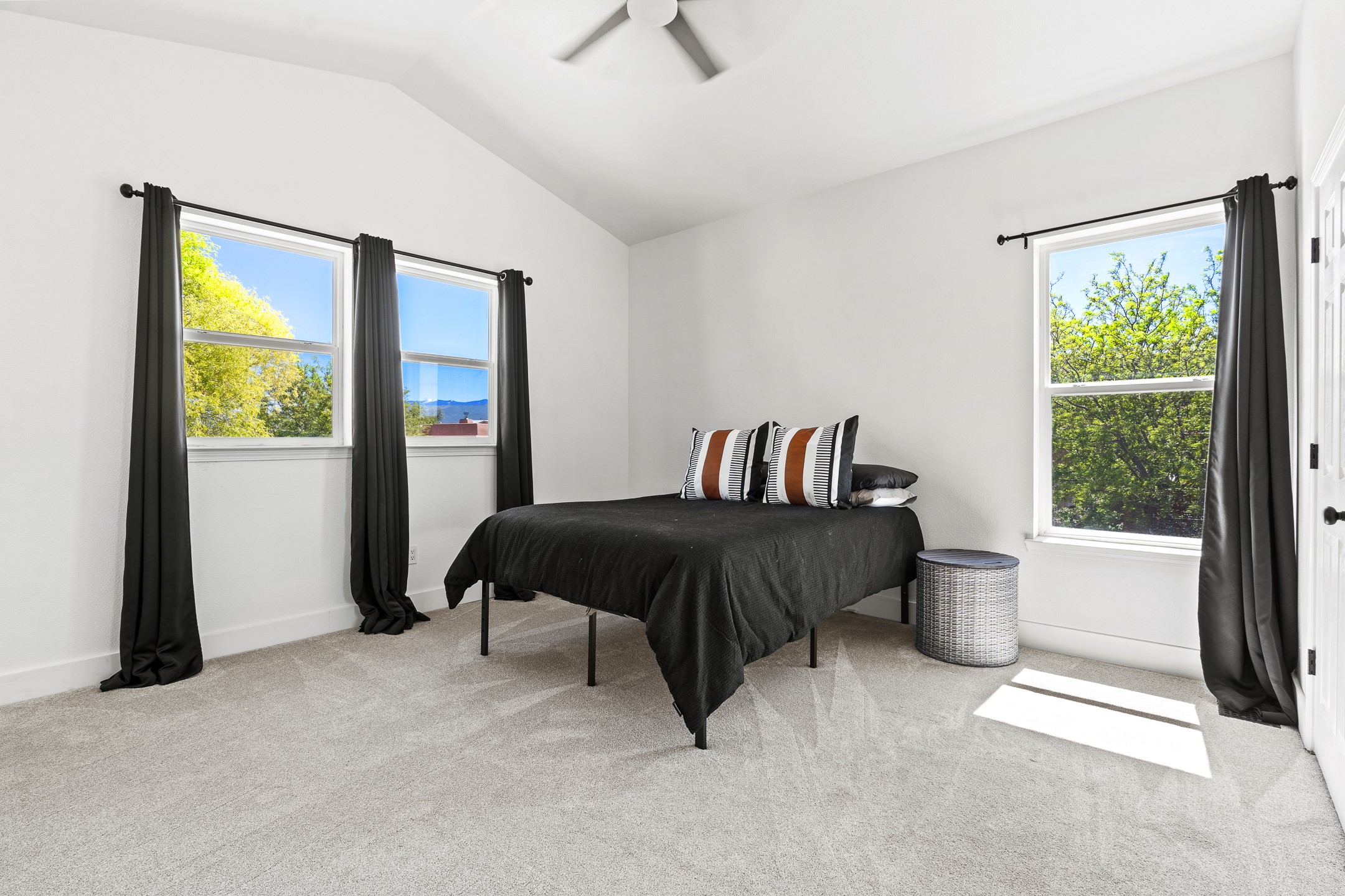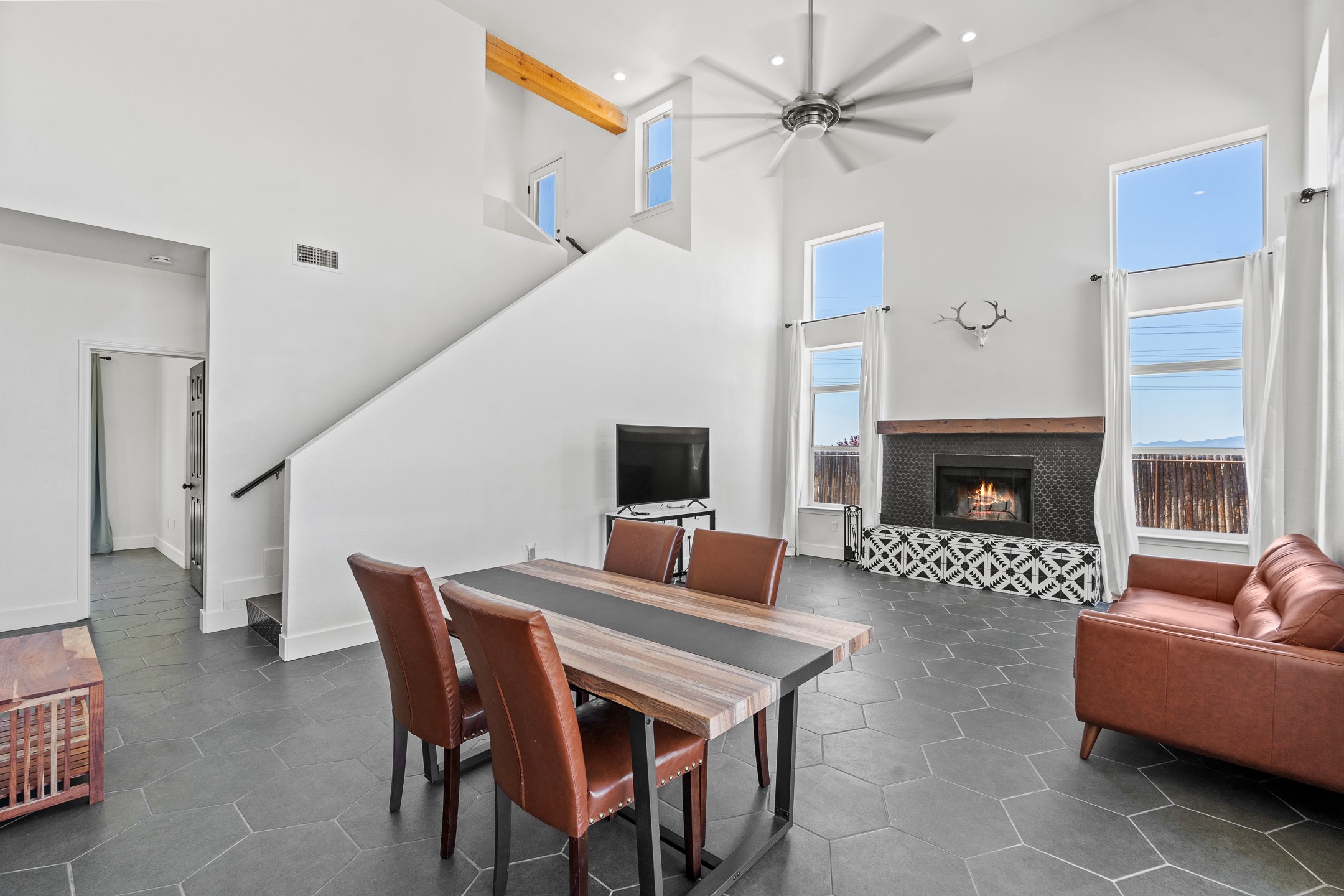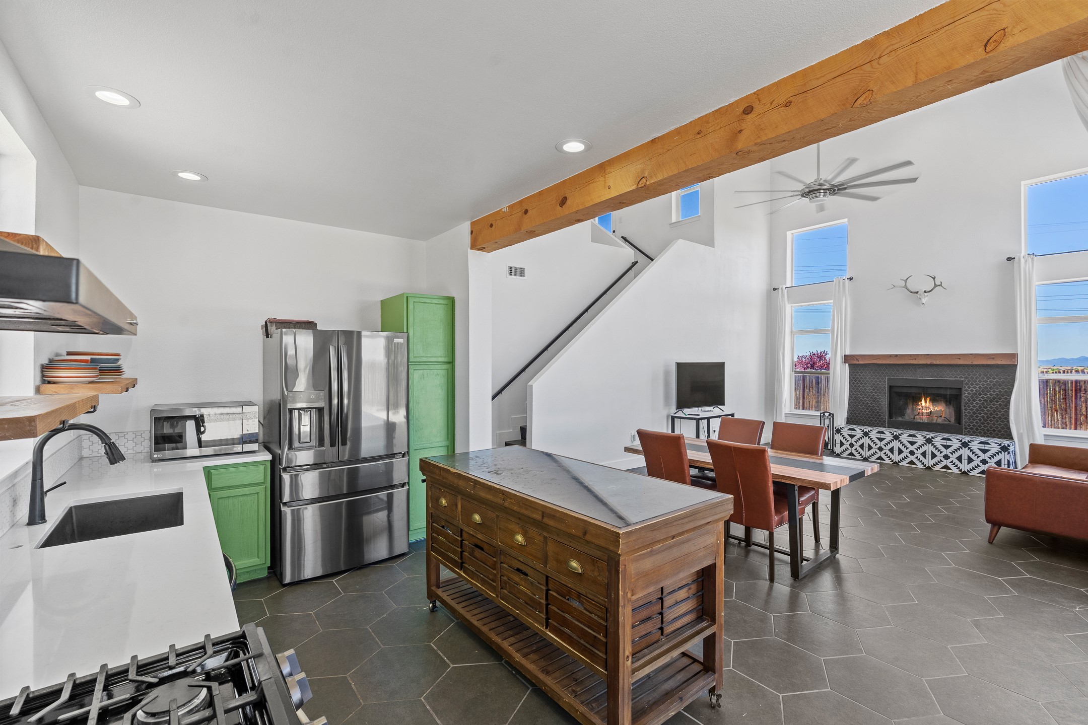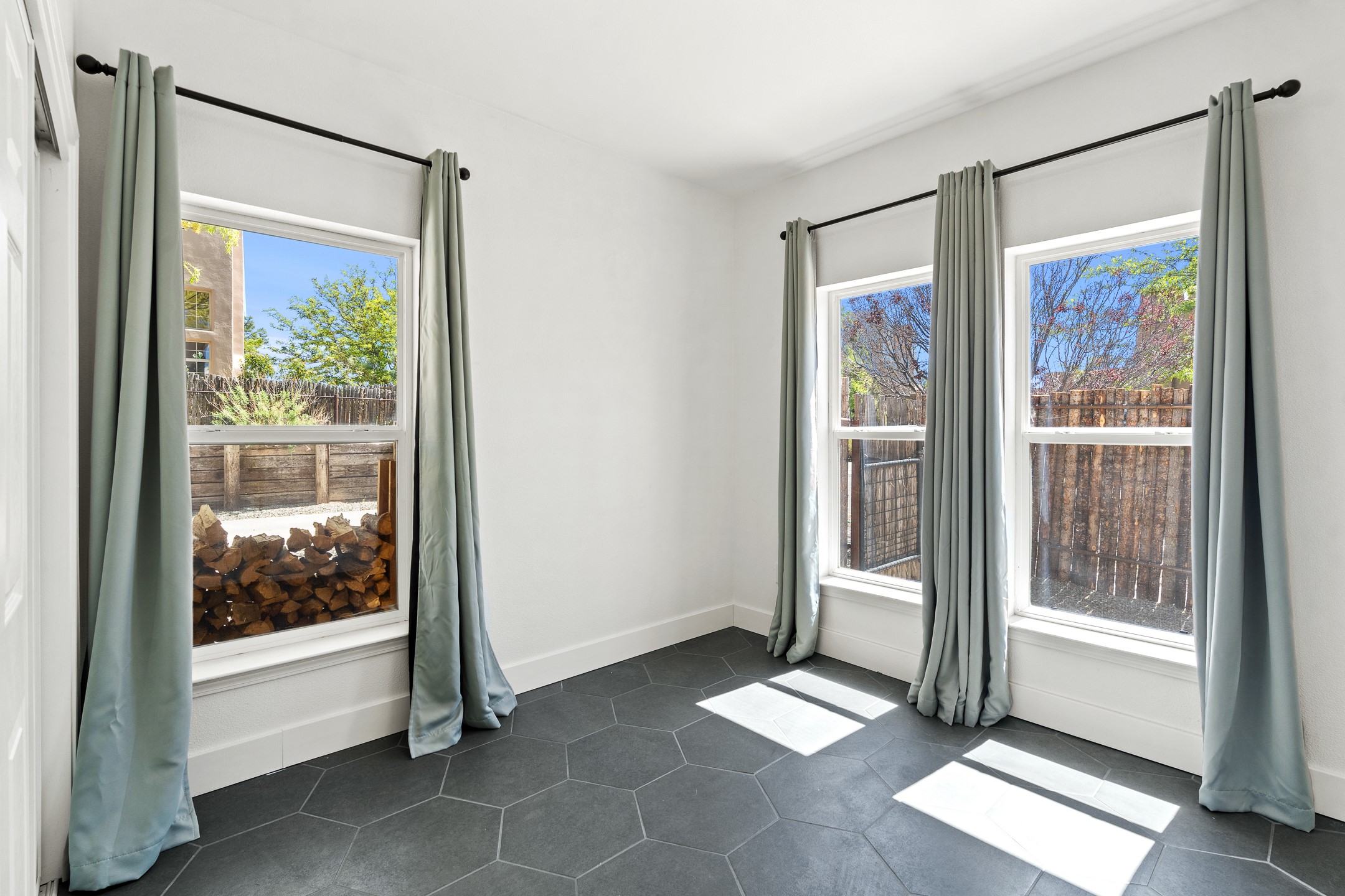 Welcome to 4124 Big Sky Road, a beautifully updated home in the highly desirable Nava Ade Subdivision. With 1,632 square feet of stylish and comfortable living space, this light-filled residence offers thoughtful design and exceptional outdoor living. The spacious primary suite is located upstairs, featuring a walk-in closet and a luxurious ensuite bath complete with double sinks, a freestanding soaking tub, and a separate shower. Downstairs, two guest bedrooms provide privacy for family or visitors and are conveniently located near a full guest bath and laundry room. Generous closet space throughout ensures plenty of storage. The living room impresses with soaring ceilings, large picture windows that flood the space with natural light, and a cozy fireplace--complete with stacked wood ready for crisp fall and winter nights. Two sliding glass doors--one off the dining area and another off the breakfast nook--open to a generous backyard enclosed with coyote fencing. Enjoy summer evenings on the spacious patio, gravel-lined walkways, and a perfect view of Santa Fe Place Mall's Fourth of July fireworks, giving you a front-row seat to your own private show. The updated kitchen showcases modern flair with quartz countertops, floating shelves, a designer backsplash, high-end appliances, a custom hood, and a freestanding island from Raven that stays with the home. Tiled flooring throughout adds a cohesive and elegant touch. A long private driveway leads to a detached two-car garage, and residents enjoy access to Nava Ade's clubhouse, pool, and parks. Don't miss this opportunity to own a stunning home in one of Santa Fe's most beloved communities. The sellers were drawn to this home for its stunning evening skies--and they know the new owners will fall in love with them too.