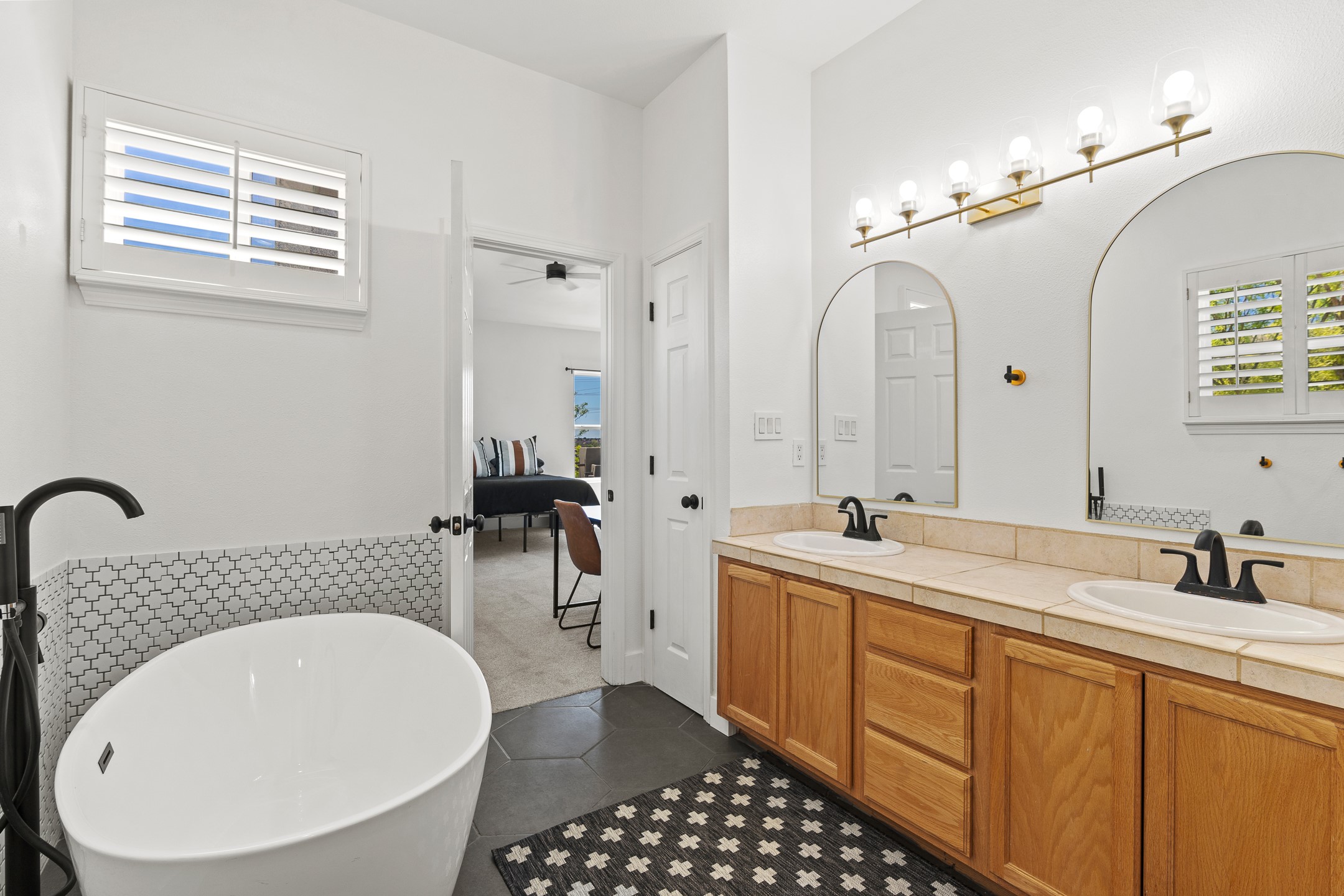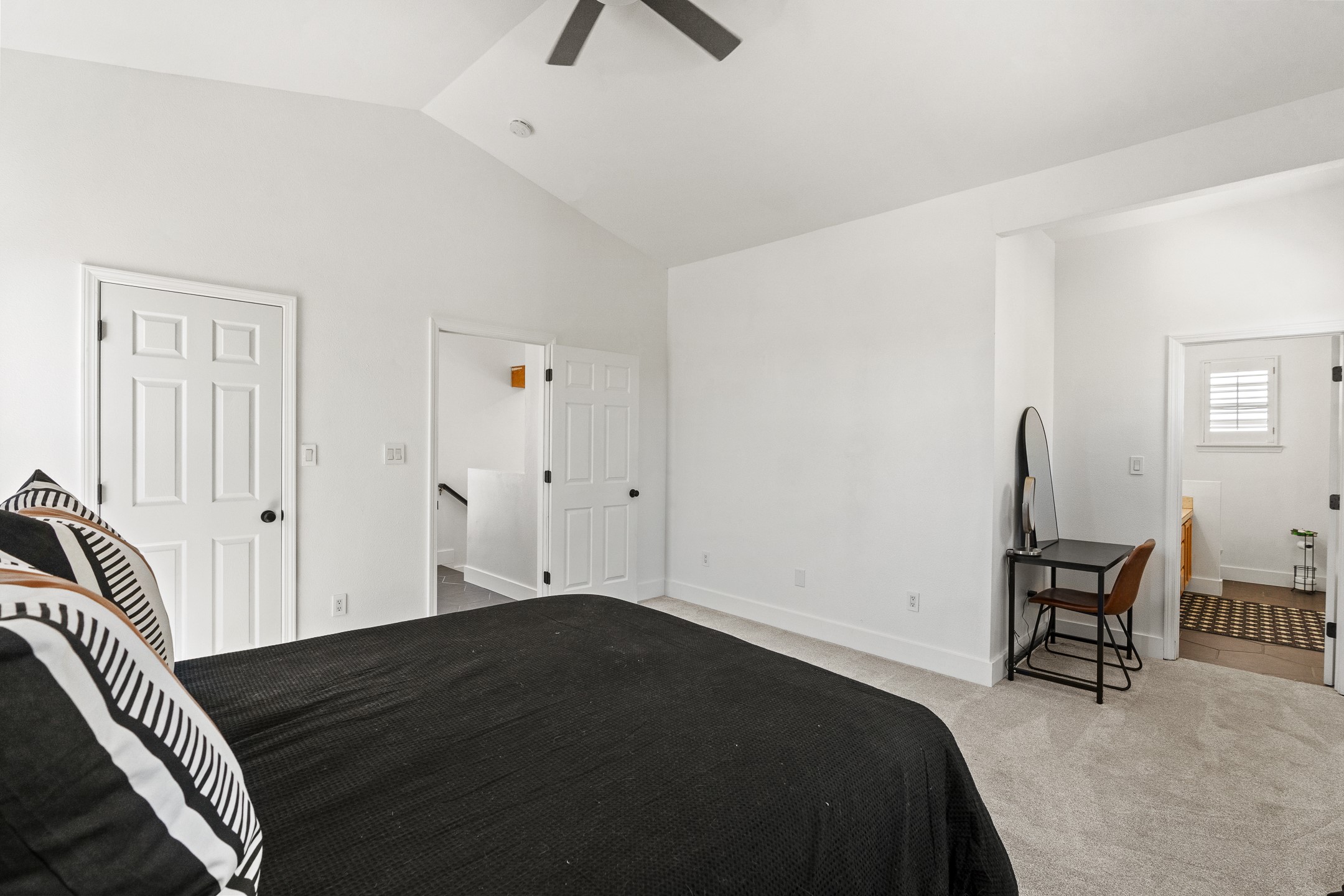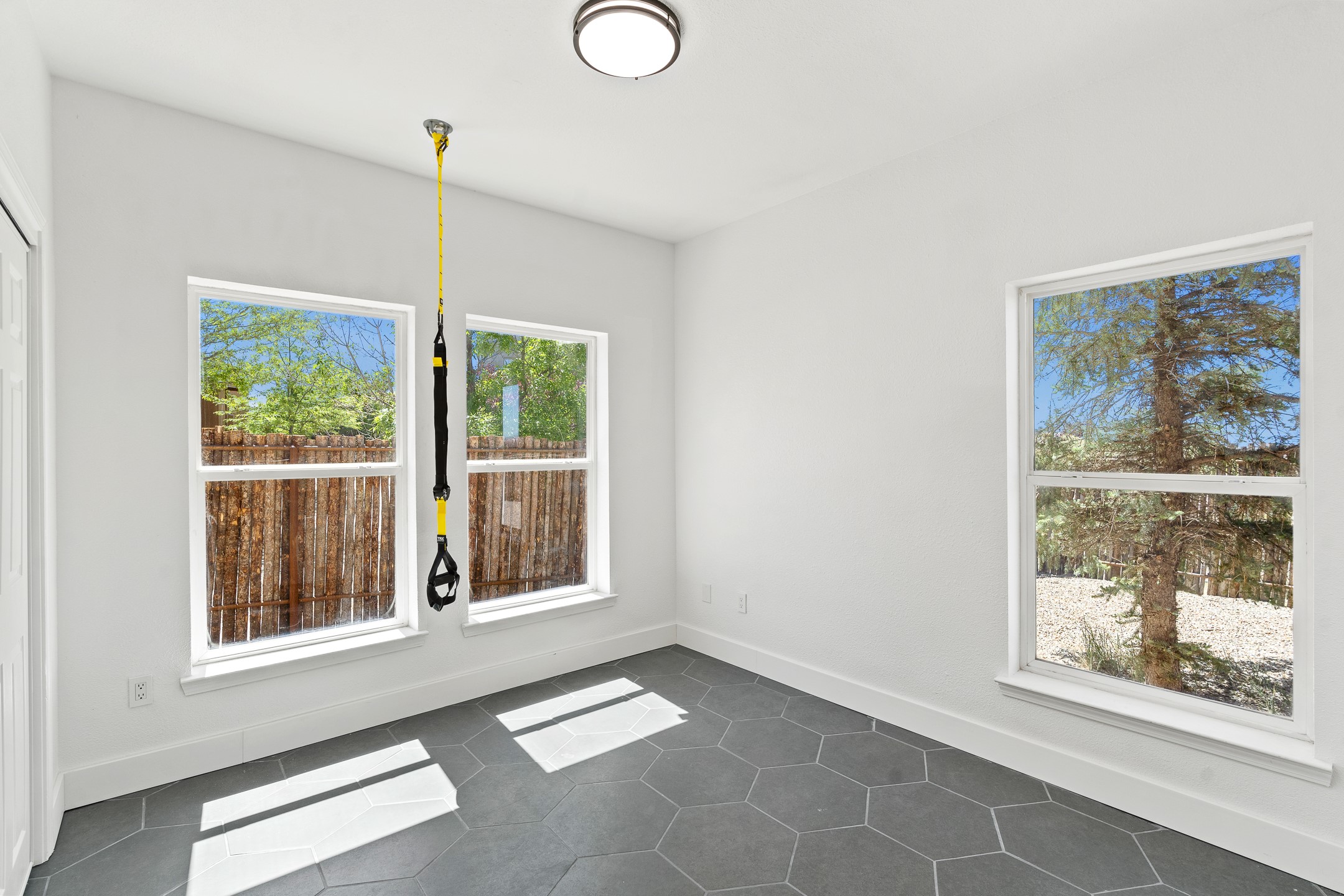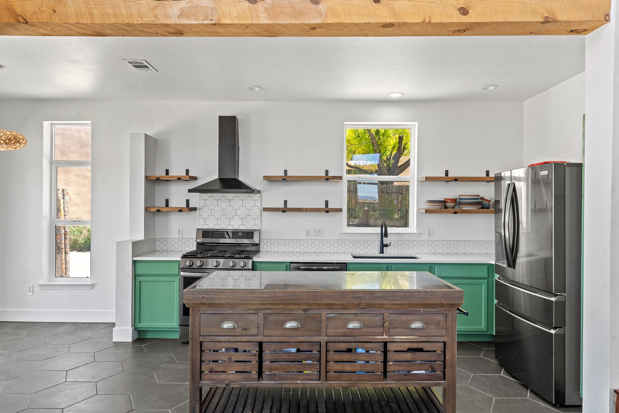 Welcome to 4124 Big Sky Road, a beautifully updated home in the highly desirable Nava Ade Subdivision. With 1,632 square feet of stylish and comfortable living space, this light-filled residence offers thoughtful design and exceptional outdoor living. The spacious primary suite is located upstairs, featuring a walk-in closet and a luxurious ensuite bath complete with double sinks, a freestanding soaking tub, and a separate shower. Downstairs, two guest bedrooms provide privacy for family or visitors and are conveniently located near a full guest bath and laundry room. Generous closet space throughout ensures plenty of storage. The living room impresses with soaring ceilings, large picture windows that flood the space with natural light, and a cozy fireplace--complete with stacked wood ready for crisp fall and winter nights. Two sliding glass doors--one off the dining area and another off the breakfast nook--open to a generous backyard enclosed with coyote fencing. Enjoy summer evenings on the spacious patio, gravel-lined walkways, and a perfect view of Santa Fe Place Mall's Fourth of July fireworks, giving you a front-row seat to your own private show. The updated kitchen showcases modern flair with quartz countertops, floating shelves, a designer backsplash, high-end appliances, a custom hood, and a freestanding island from Raven that stays with the home. Tiled flooring throughout adds a cohesive and elegant touch. A long private driveway leads to a detached two-car garage, and residents enjoy access to Nava Ade's clubhouse, pool, and parks. Don't miss this opportunity to own a stunning home in one of Santa Fe's most beloved communities. The sellers were drawn to this home for its stunning evening skies--and they know the new owners will fall in love with them too.