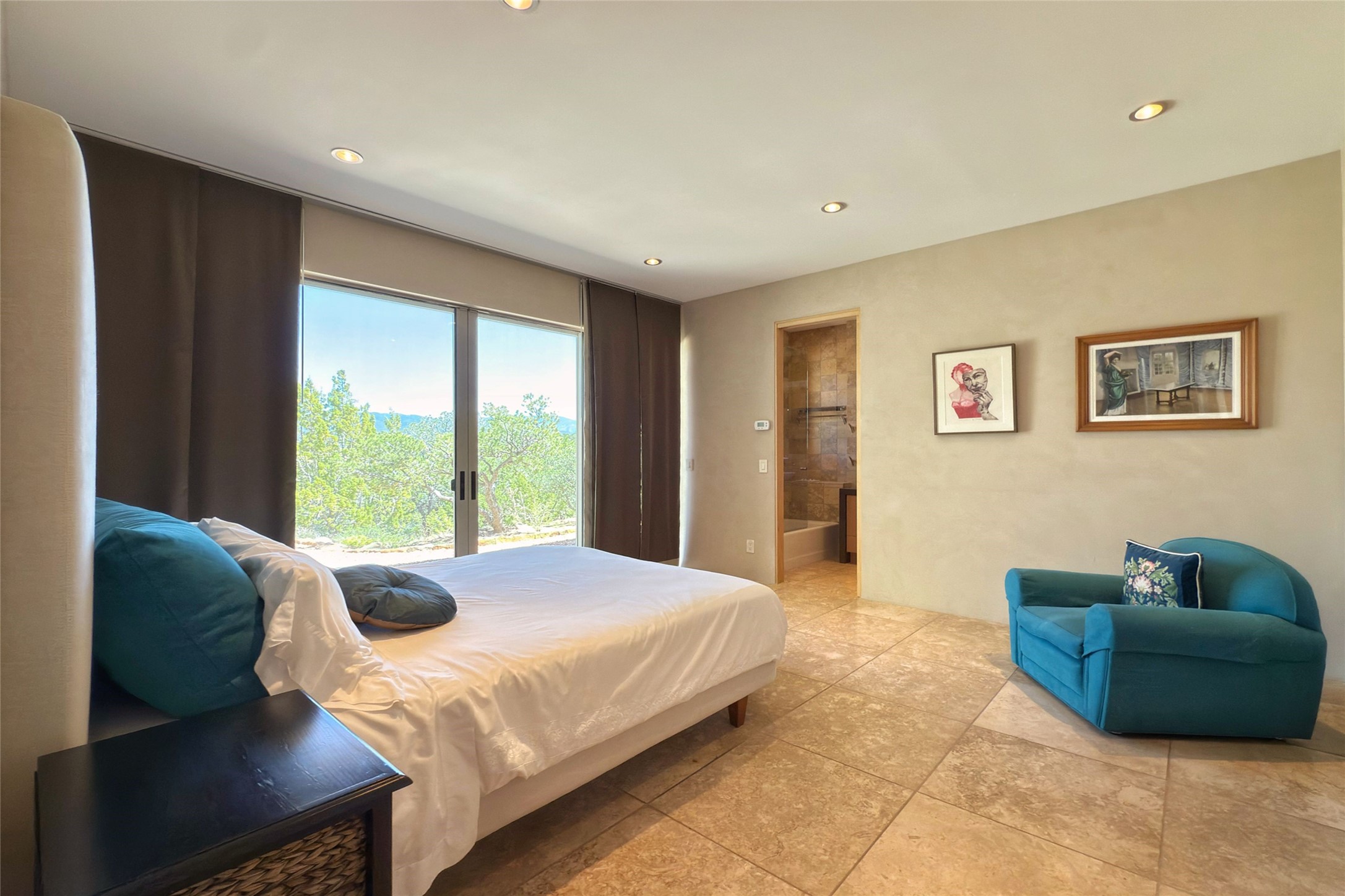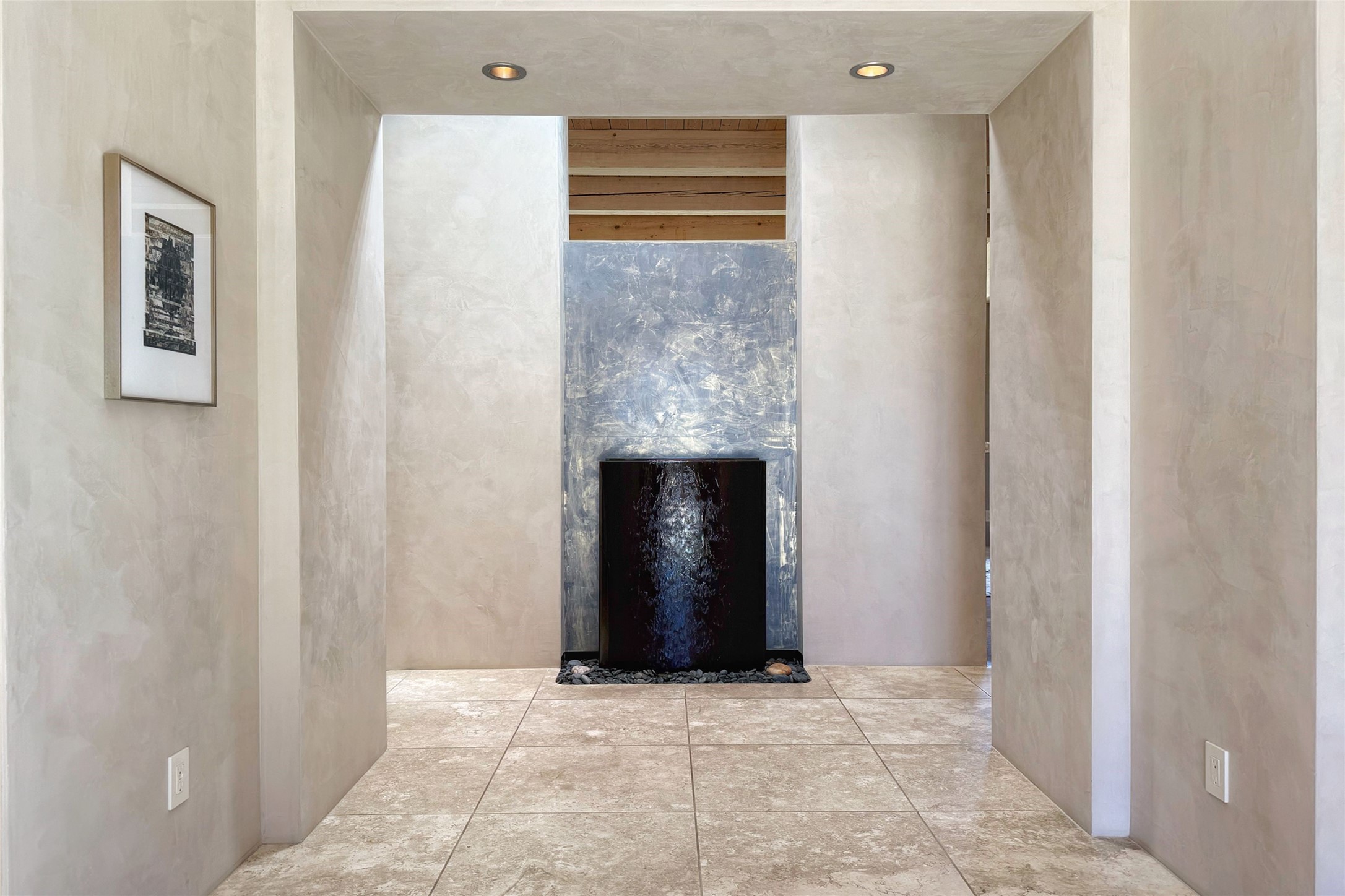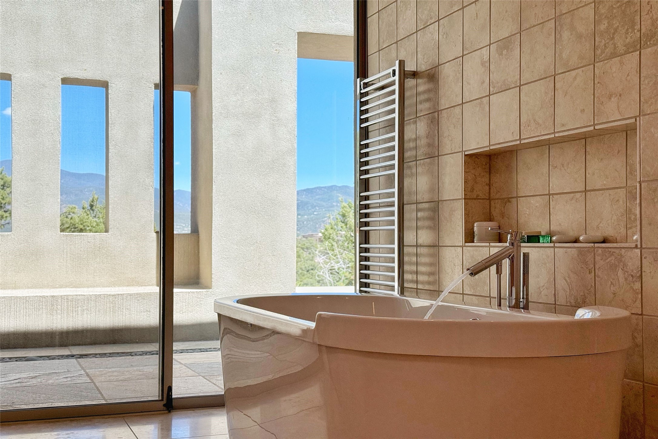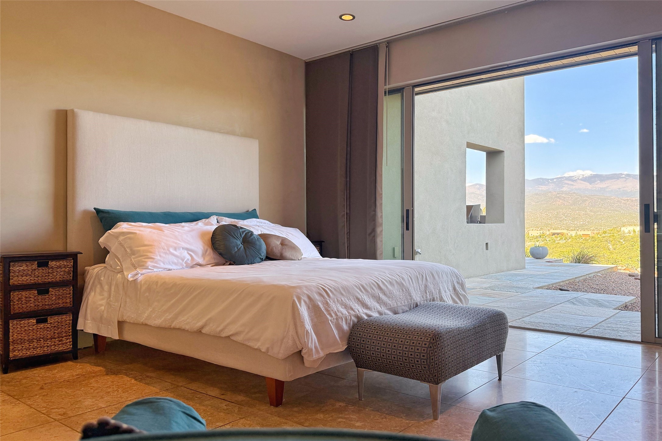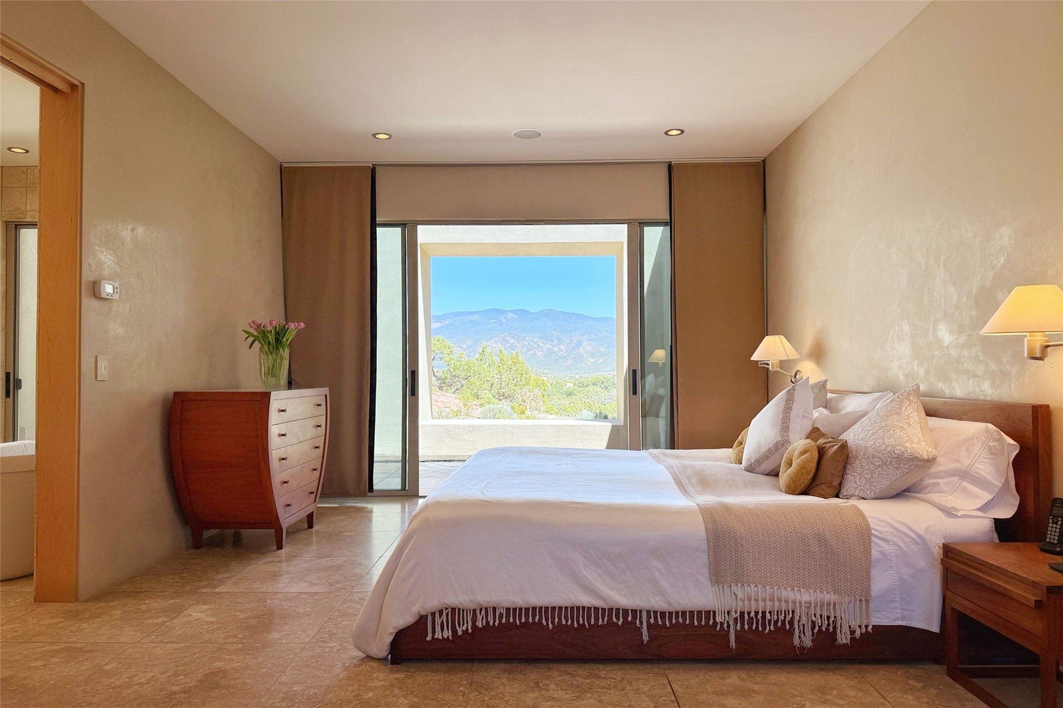 Spectacular and mesmerizing views of the Sangre de Cristo Mountains define this approximate 3,150 sq ft single-level contemporary home atop Monte Sereno, just six minutes from the Plaza. Designed to maximize views from every room, the home features soaring 12-foot ceilings in the great room and kitchen, expansive floor-to-ceiling windows, and no interior steps. Jerusalem limestone flooring runs throughout, complemented by artisan plaster walls and exposed woodbeams. The gourmet kitchen is outfitted with top-of-the-line Thermador and Miele appliances, custom cabinetry, and a large island workspace. A versatile flex room with a built-in Murphy bed serves as an ideal overflow bedroom. Additional highlights include an entryway water feature, radiant floor heating, forced-air HVAC with CleanEffects air filtration, a Lutron lighting system, solar thermal and PV panels, whole-house water filtration with reverse osmosis at thekitchen sink, and a new roof. The 1.58-acre property offers privacy, direct access to hiking trails, and a circular driveway with parking for six or more vehicles.