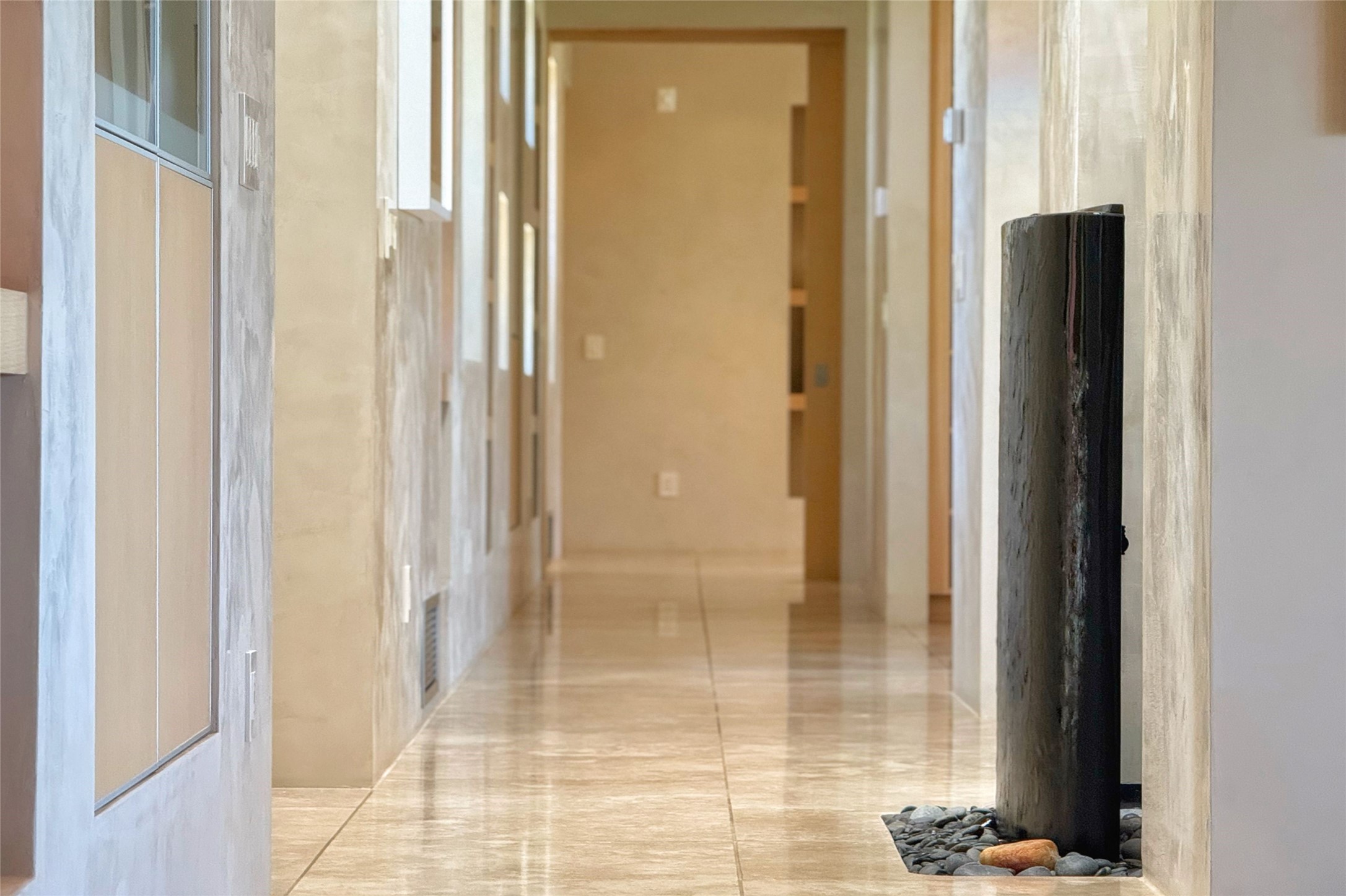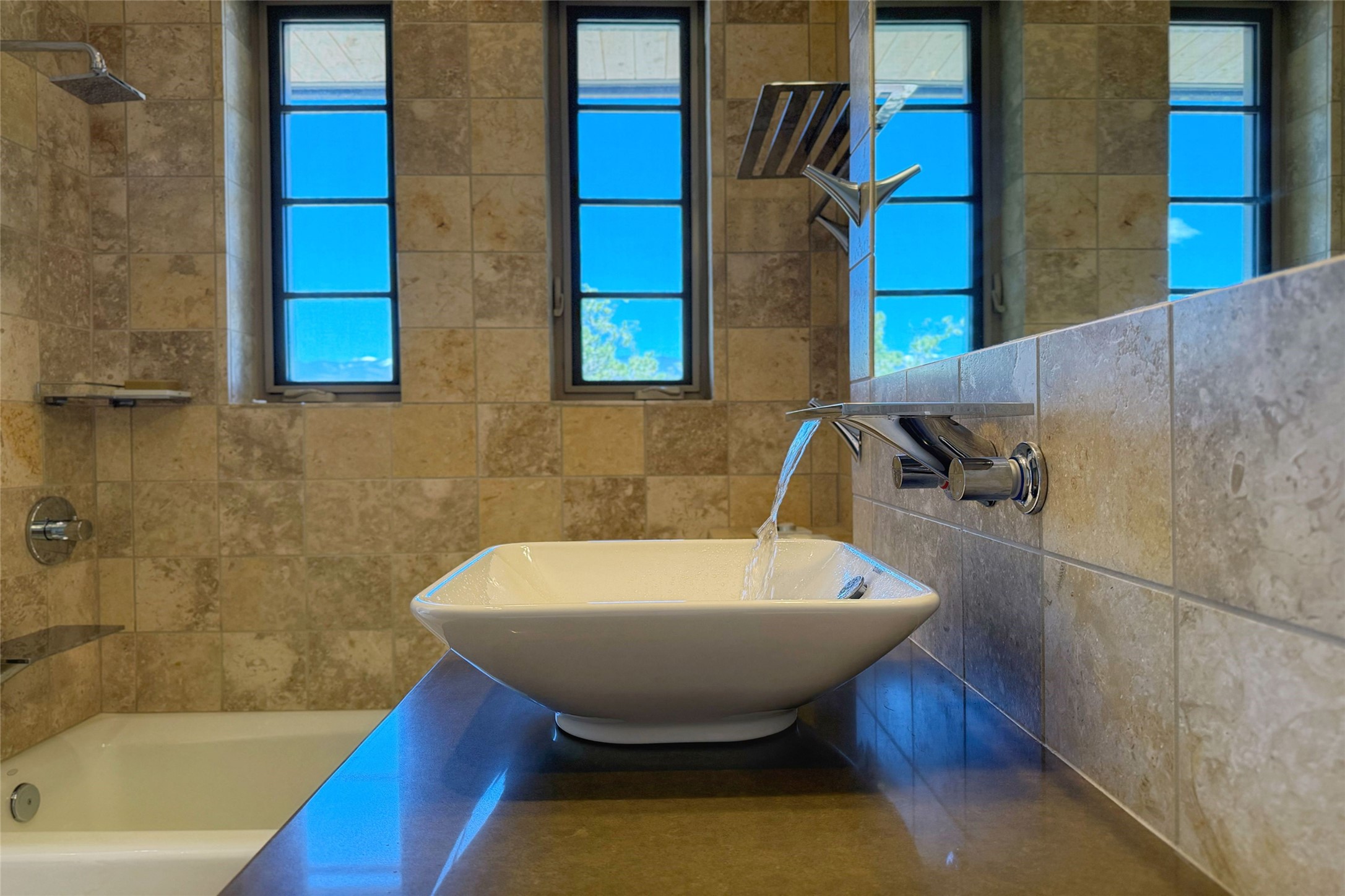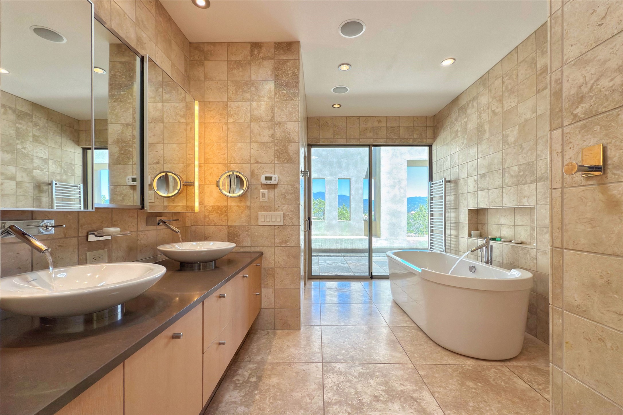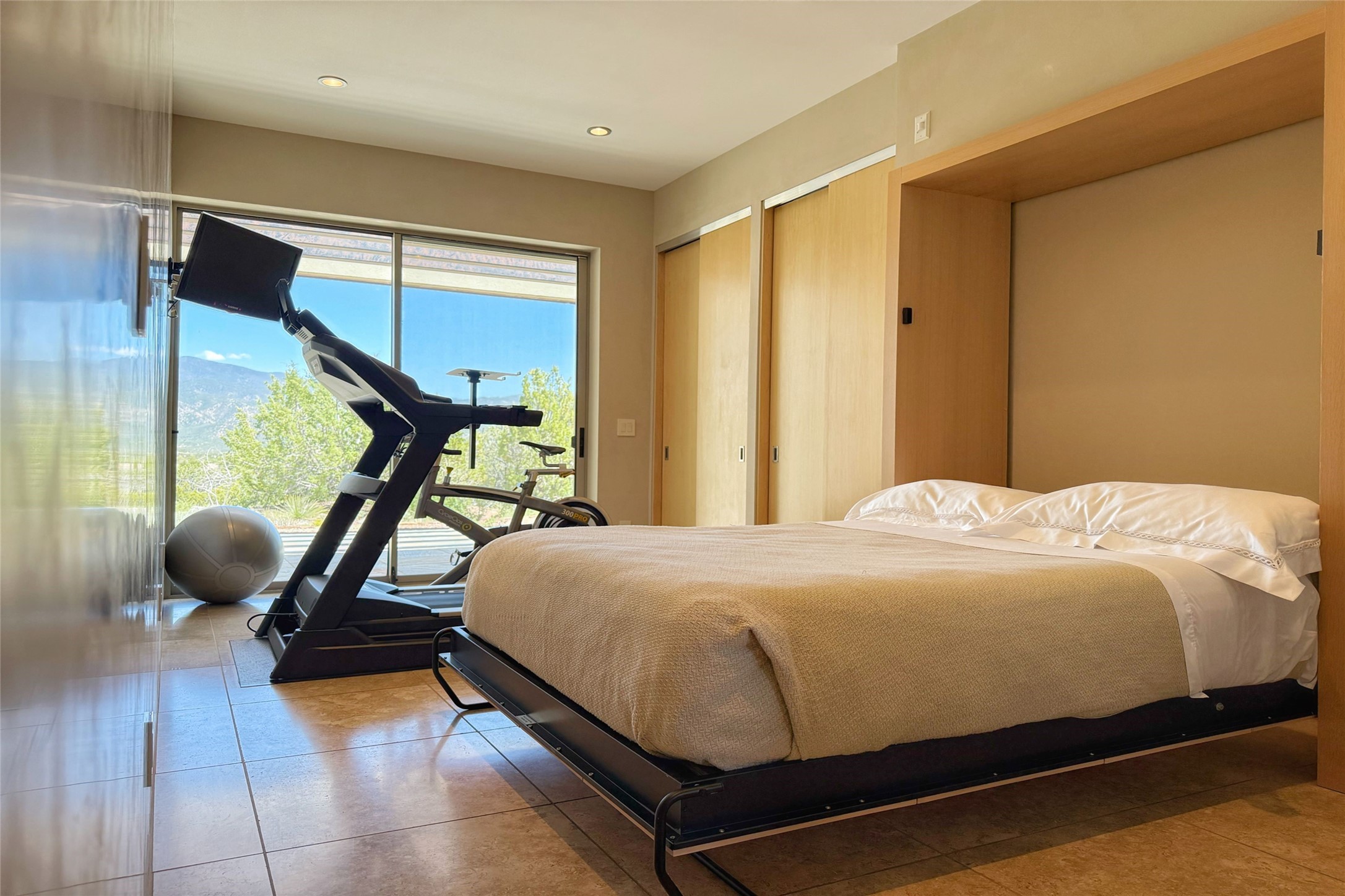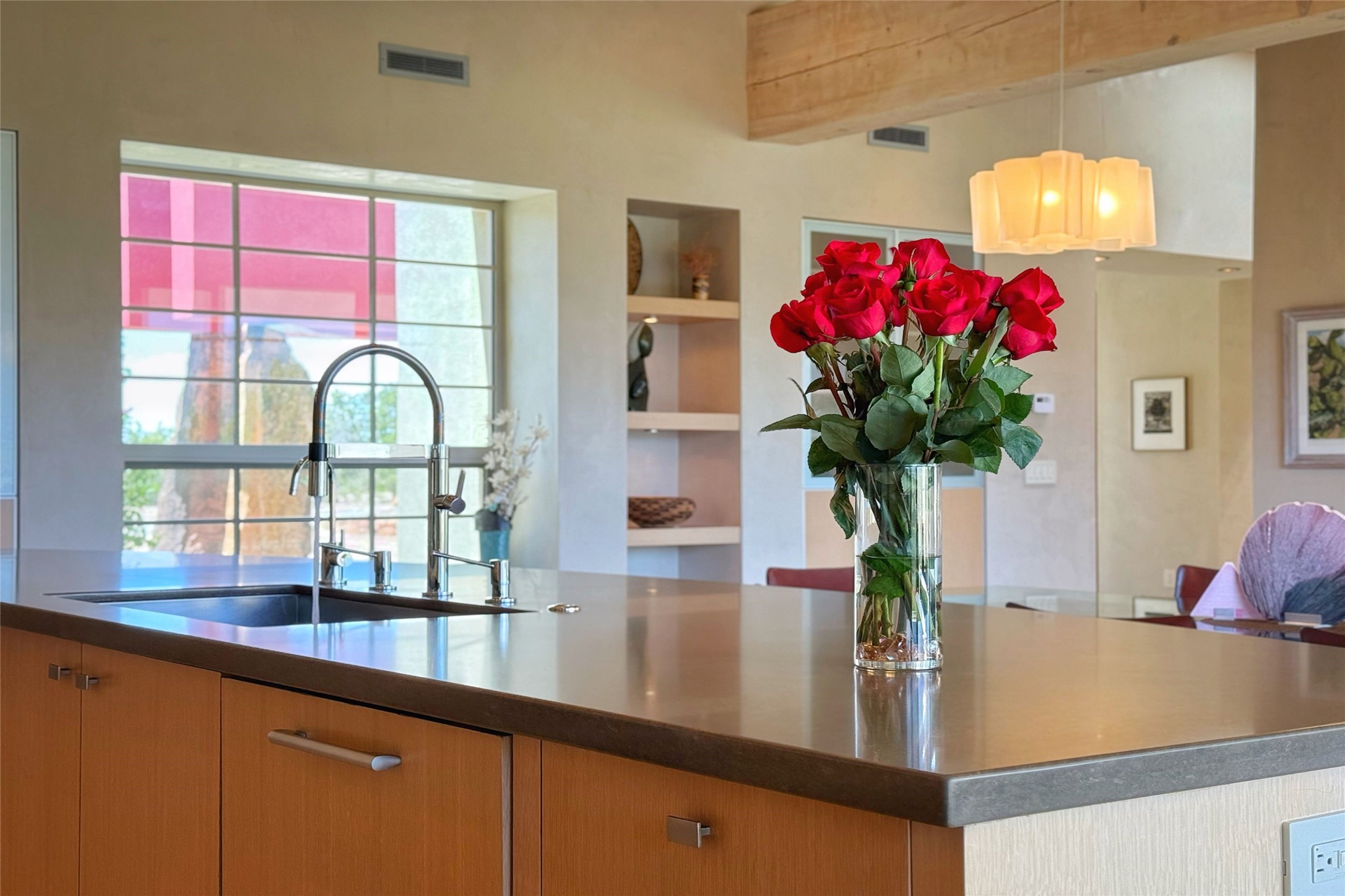 Spectacular and mesmerizing views of the Sangre de Cristo Mountains define this approximate 3,150 sq ft single-level contemporary home atop Monte Sereno, just six minutes from the Plaza. Designed to maximize views from every room, the home features soaring 12-foot ceilings in the great room and kitchen, expansive floor-to-ceiling windows, and no interior steps. Jerusalem limestone flooring runs throughout, complemented by artisan plaster walls and exposed woodbeams. The gourmet kitchen is outfitted with top-of-the-line Thermador and Miele appliances, custom cabinetry, and a large island workspace. A versatile flex room with a built-in Murphy bed serves as an ideal overflow bedroom. Additional highlights include an entryway water feature, radiant floor heating, forced-air HVAC with CleanEffects air filtration, a Lutron lighting system, solar thermal and PV panels, whole-house water filtration with reverse osmosis at thekitchen sink, and a new roof. The 1.58-acre property offers privacy, direct access to hiking trails, and a circular driveway with parking for six or more vehicles.