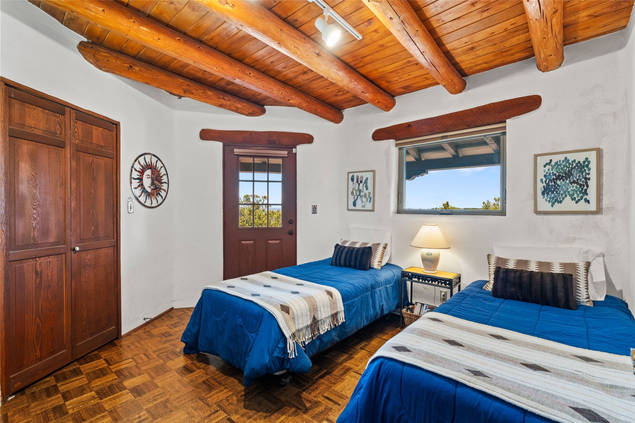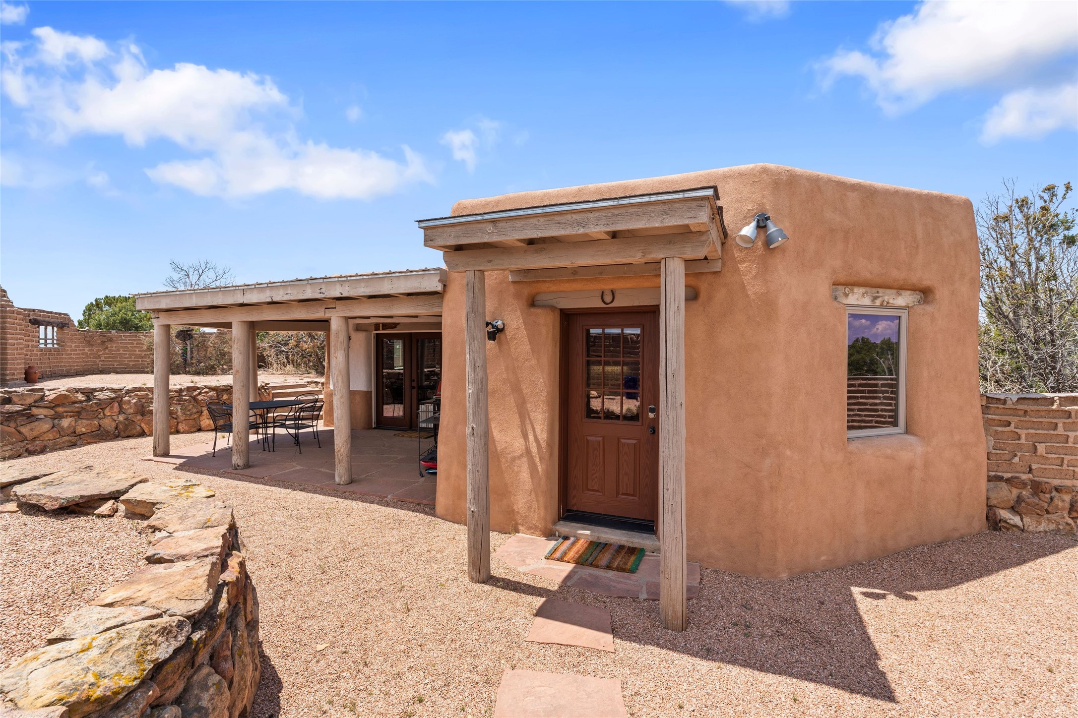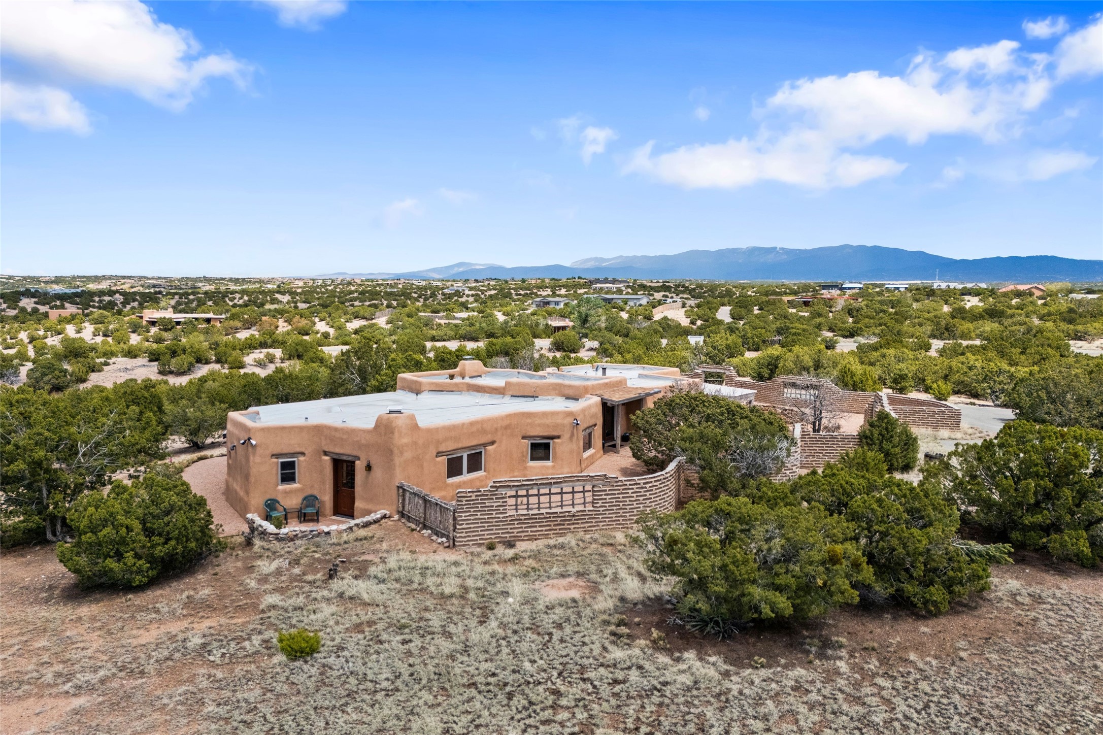 Presenting an extraordinary opportunity to own a 3-bedroom, 2-bath real adobe home on 3.04 acres. This property sits at the highest elevation in the Puesta Del Sol subdivision, offering breathtaking views of four mountain ranges, the Jemez, Ortiz, Sandia and Sangre de Christo Mountains and the twinkling lights of Los Alamos. A wonderful location for exploring the neighborhood and enjoying the spectacular views. The residence is securely surrounded by a butter brick wall, providing both privacy and a sense of enclosure. With a favorable north-south exposure, sunlight fills the interior throughout the day. The primary suite features a full ensuite bath, ensuring comfort and convenience. Recent upgrades include most plumbing updated, along with new stucco, Pella windows, and new doors. A brand-new washer/dryer and dishwasher enhances functionality. Additional features include a pellet stove in the dining room for warmth, and fireplaces in the primary bedroom and living/media room, creating inviting spaces for relaxation or work. Conveniently located with easy access to NM-599, this home is just a short drive from the Santa Fe Plaza and the Santa Fe Regional Airport.