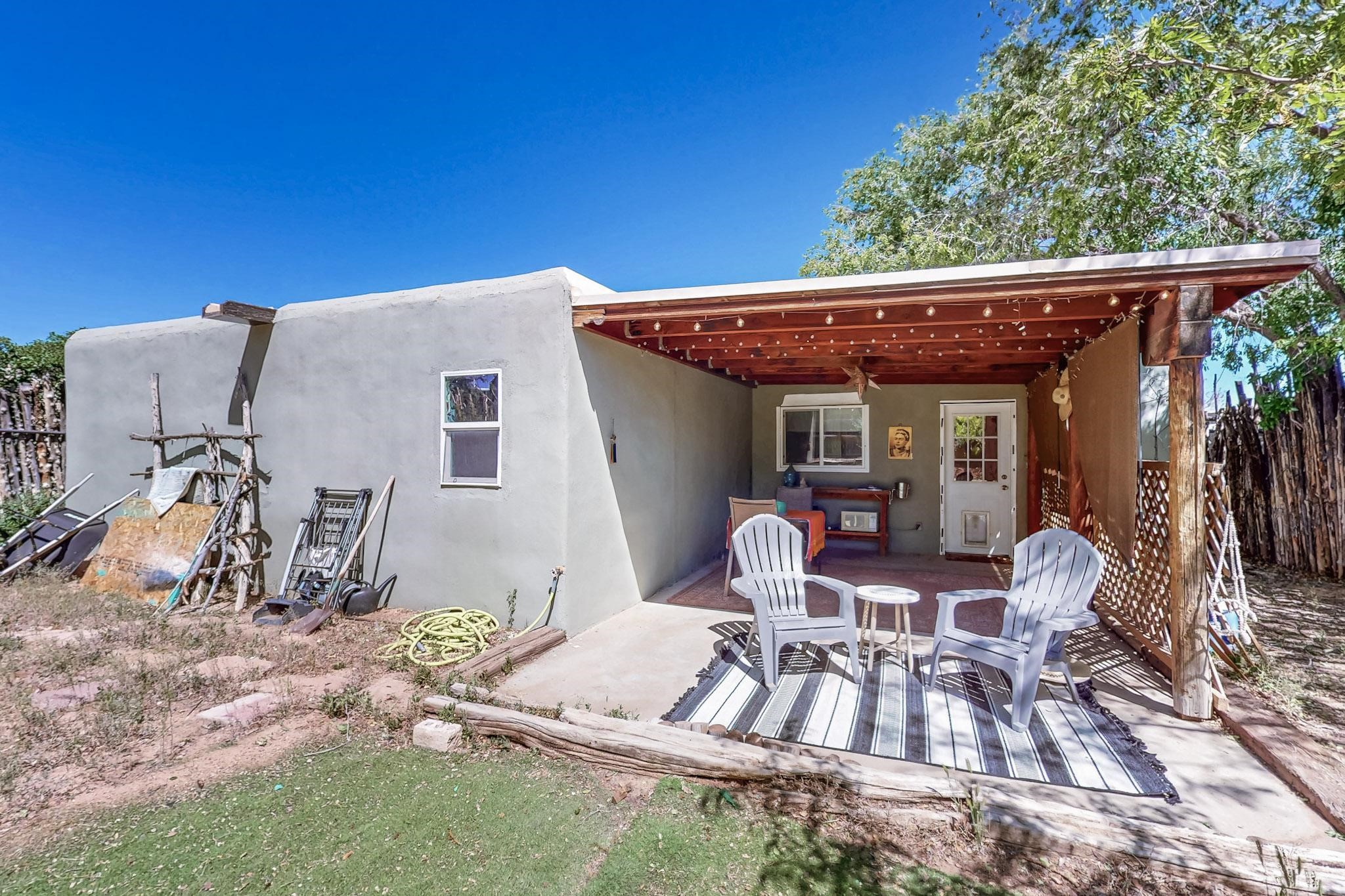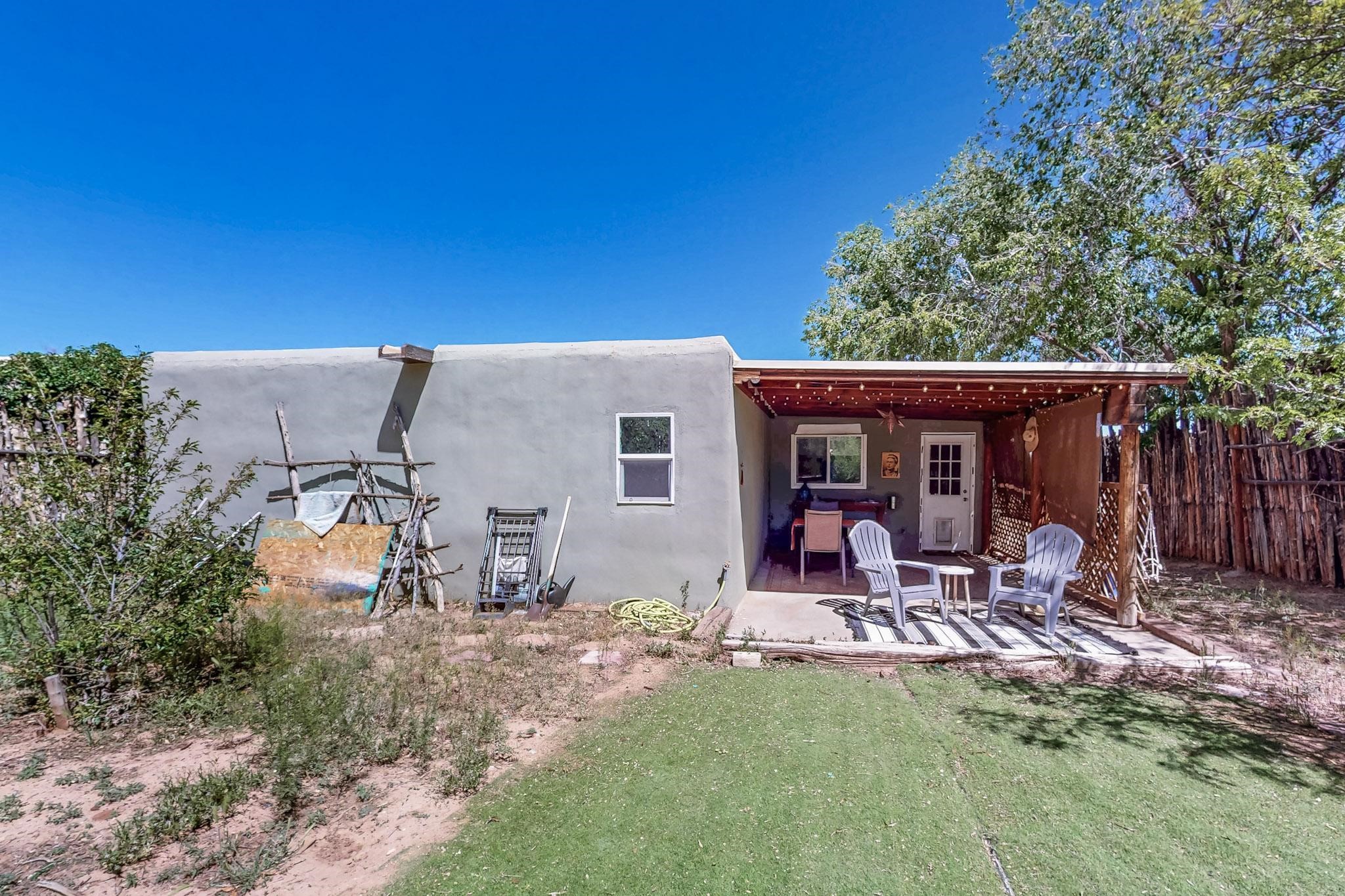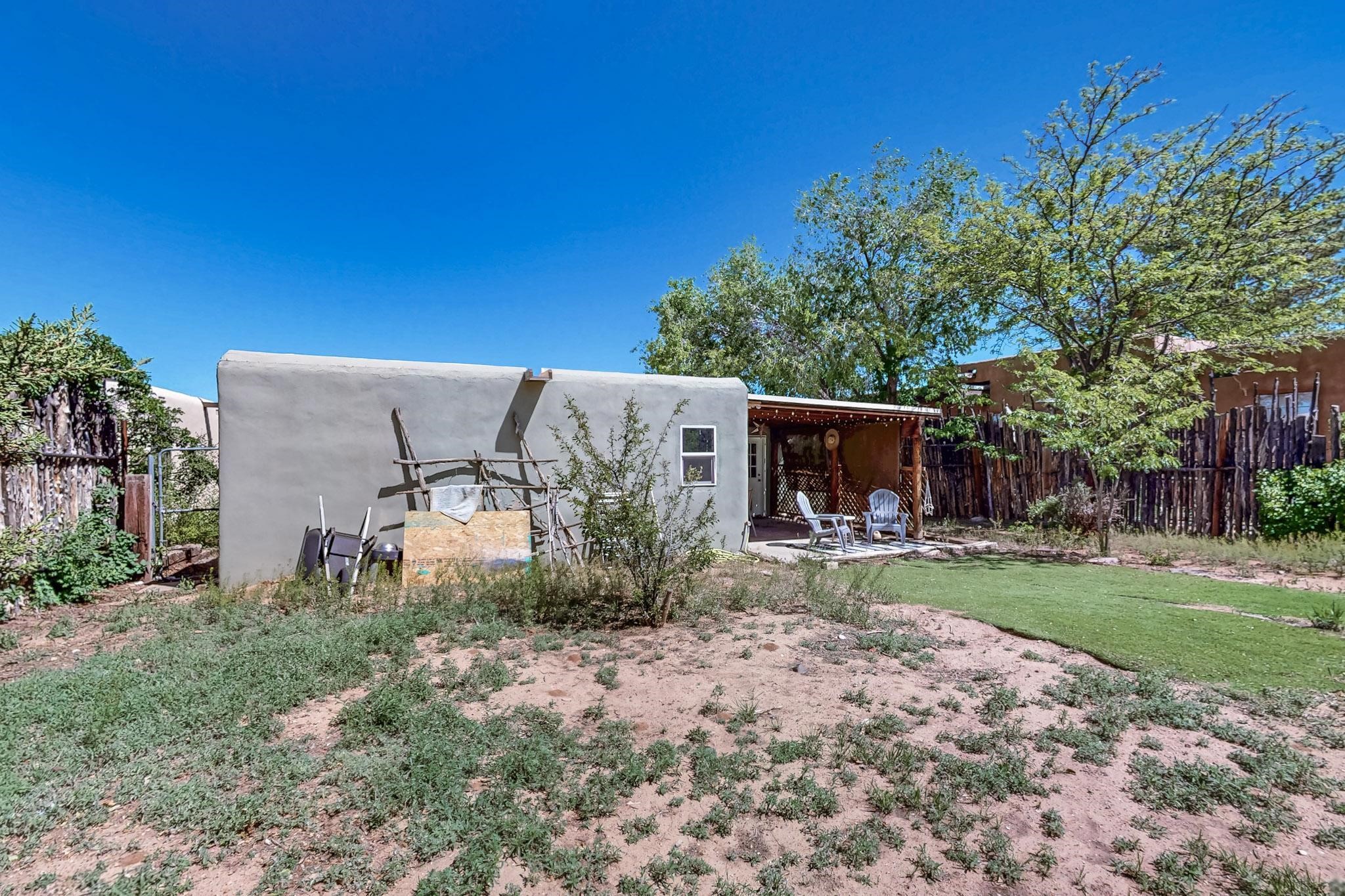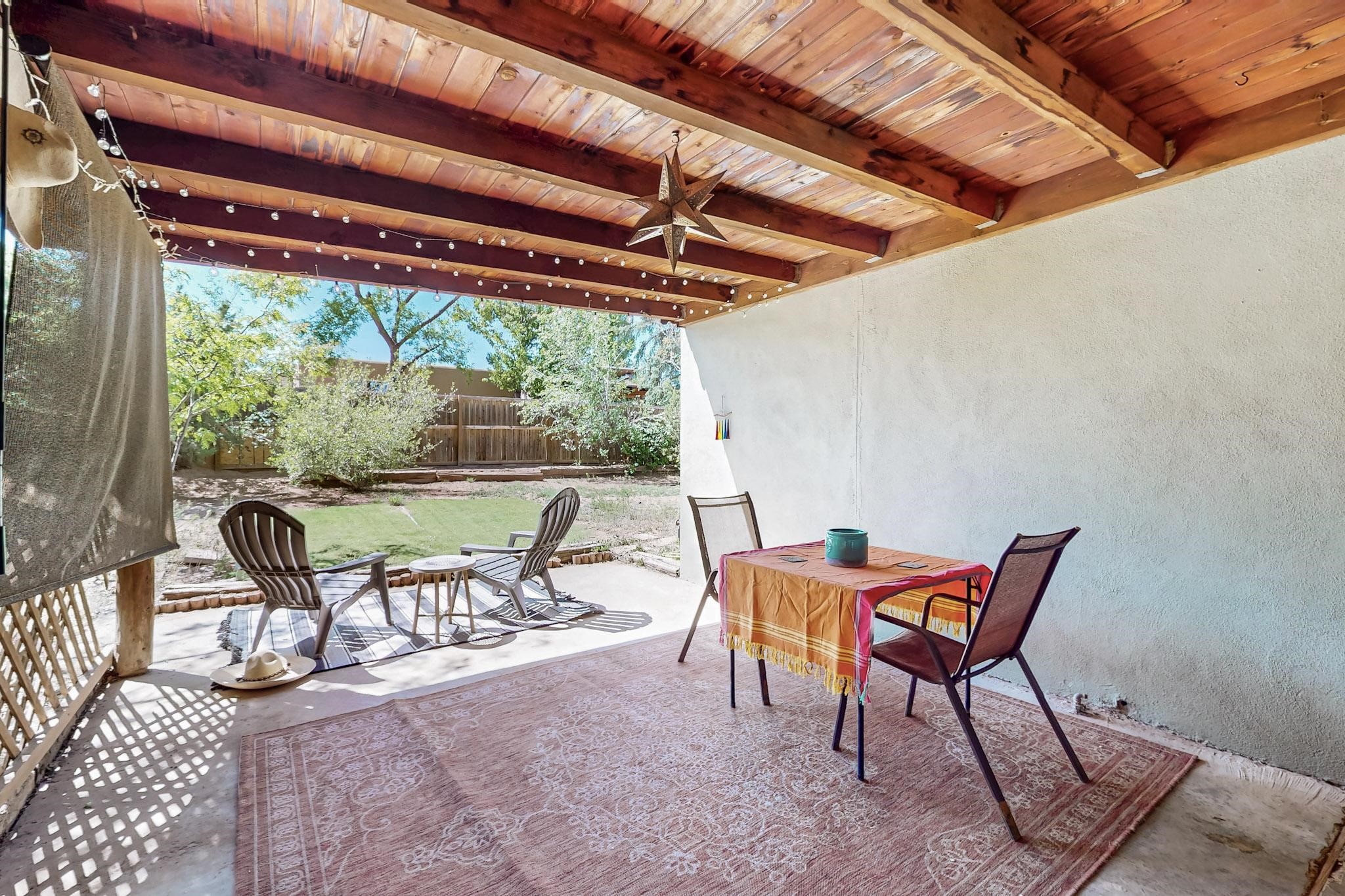 Charming 2-bedroom home in beautiful Santa Fe! This cozy retreat features classic Southwestern details including viga ceilings, tile floors, three skylights that fill the space with natural light and a stunning kiva fireplace. The kitchen opens to the dining area, creating a warm and functional layout. The second bedroom offers cozy carpeting, while the primary bath boasts a custom steam shower with three luxury shower heads! A large walk-in closet completes the master retreat. Step outside to an open patio and oversized backyard, ideal for entertaining or relaxing under the Santa Fe sky. A true blend of comfort and New Mexico charm!