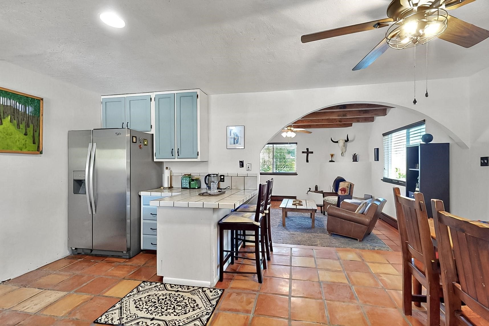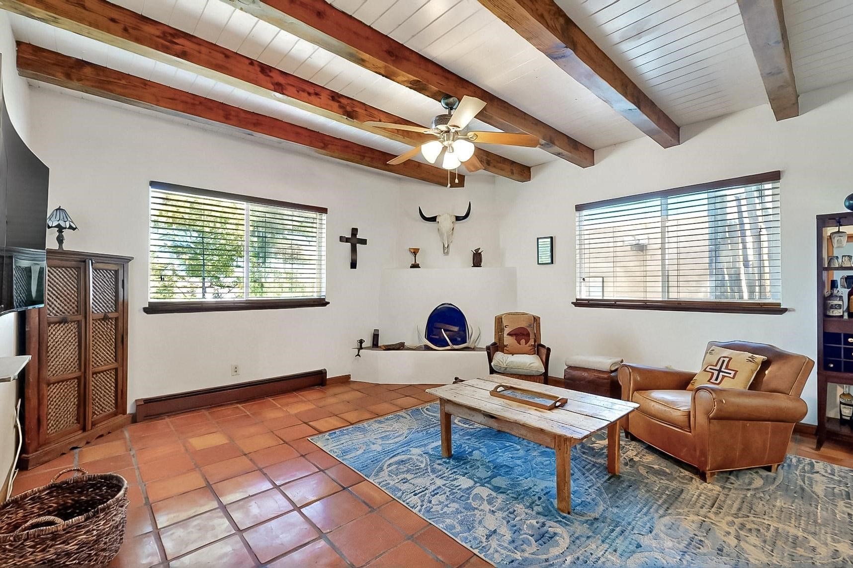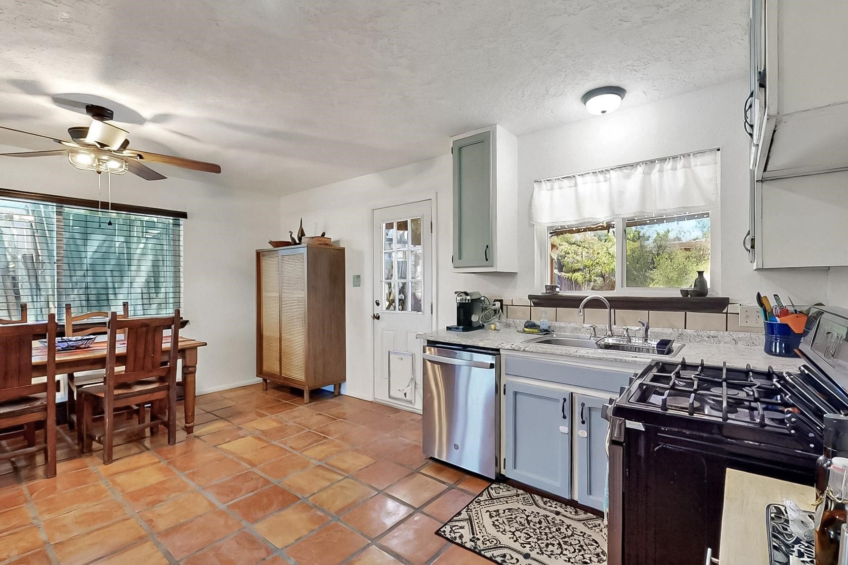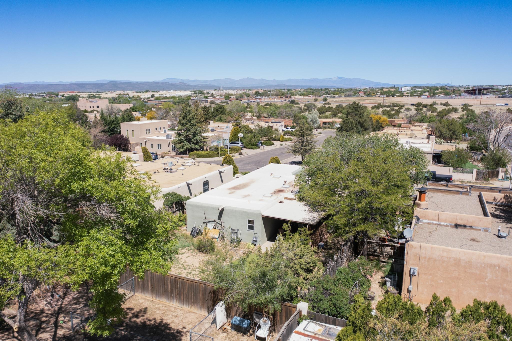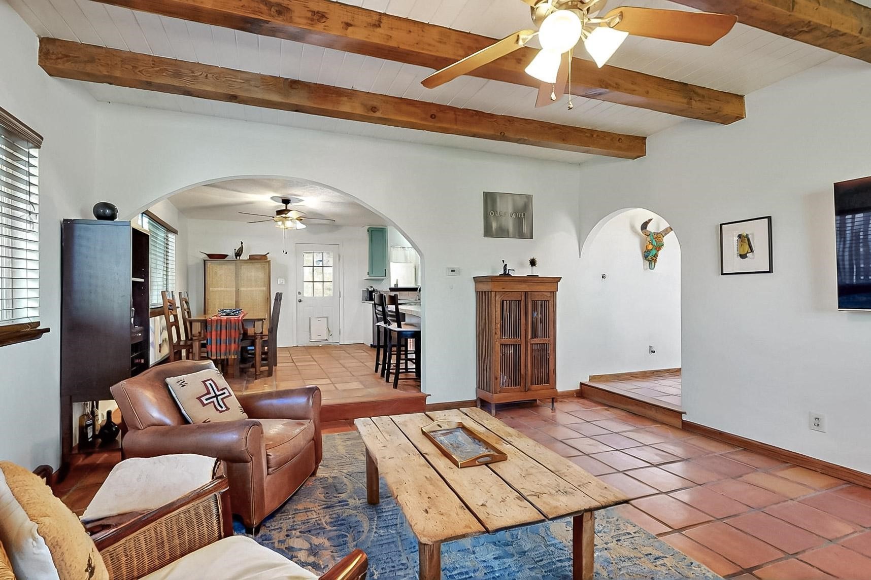 Charming 2-bedroom home in beautiful Santa Fe! This cozy retreat features classic Southwestern details including viga ceilings, tile floors, three skylights that fill the space with natural light and a stunning kiva fireplace. The kitchen opens to the dining area, creating a warm and functional layout. The second bedroom offers cozy carpeting, while the primary bath boasts a custom steam shower with three luxury shower heads! A large walk-in closet completes the master retreat. Step outside to an open patio and oversized backyard, ideal for entertaining or relaxing under the Santa Fe sky. A true blend of comfort and New Mexico charm!
