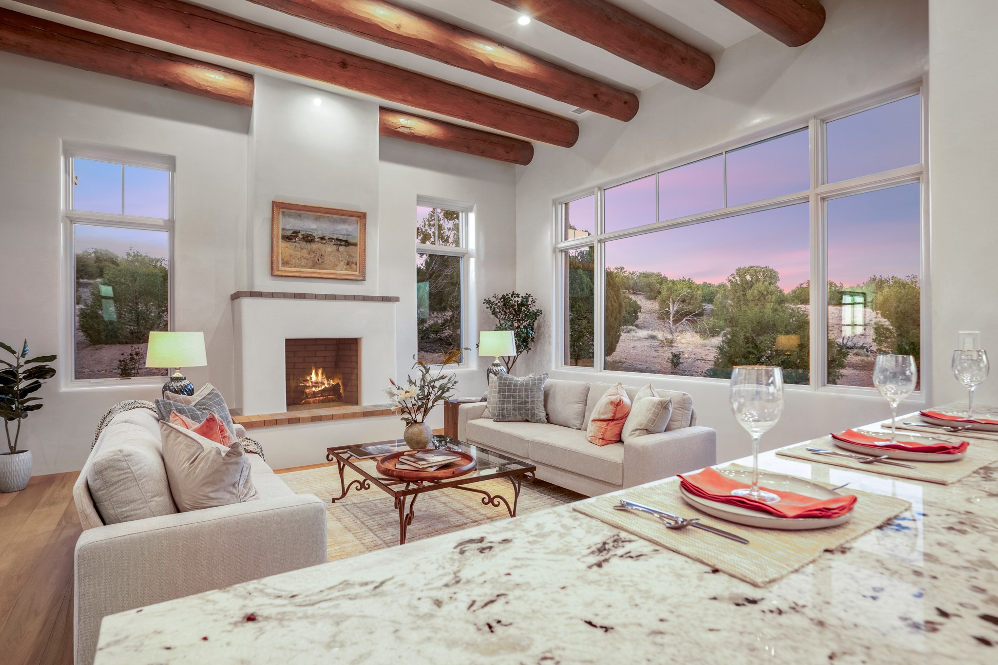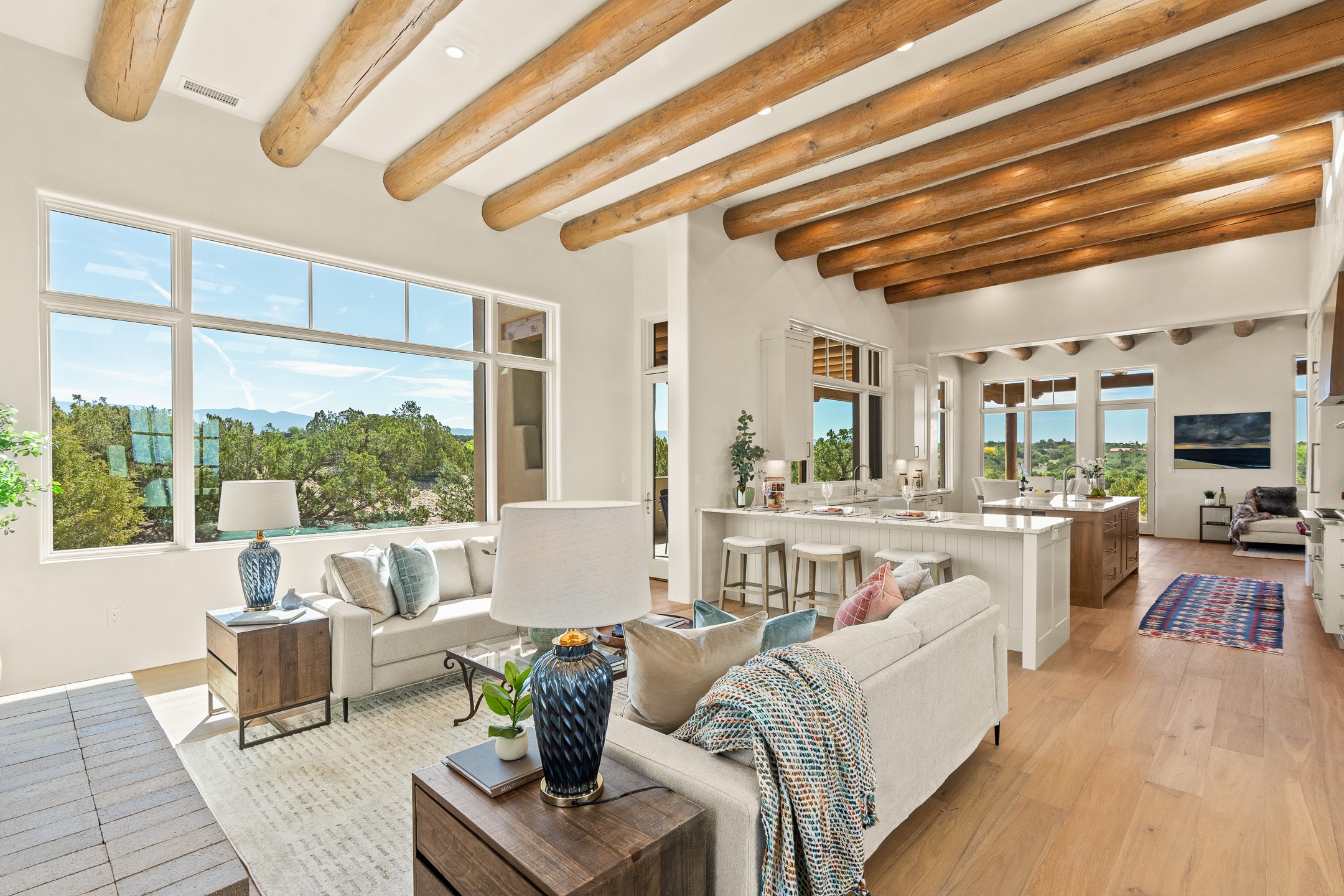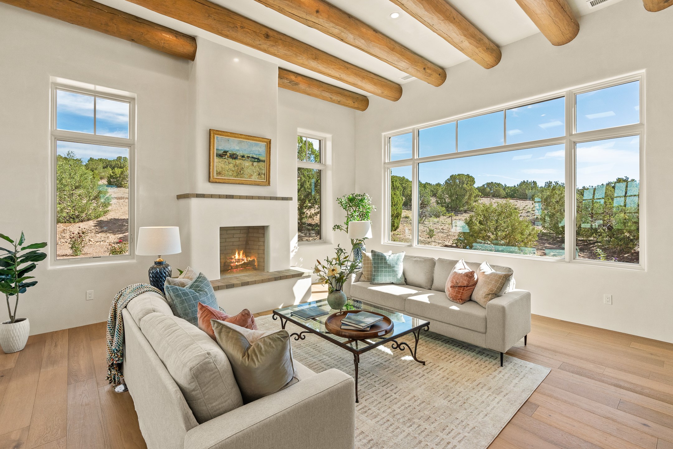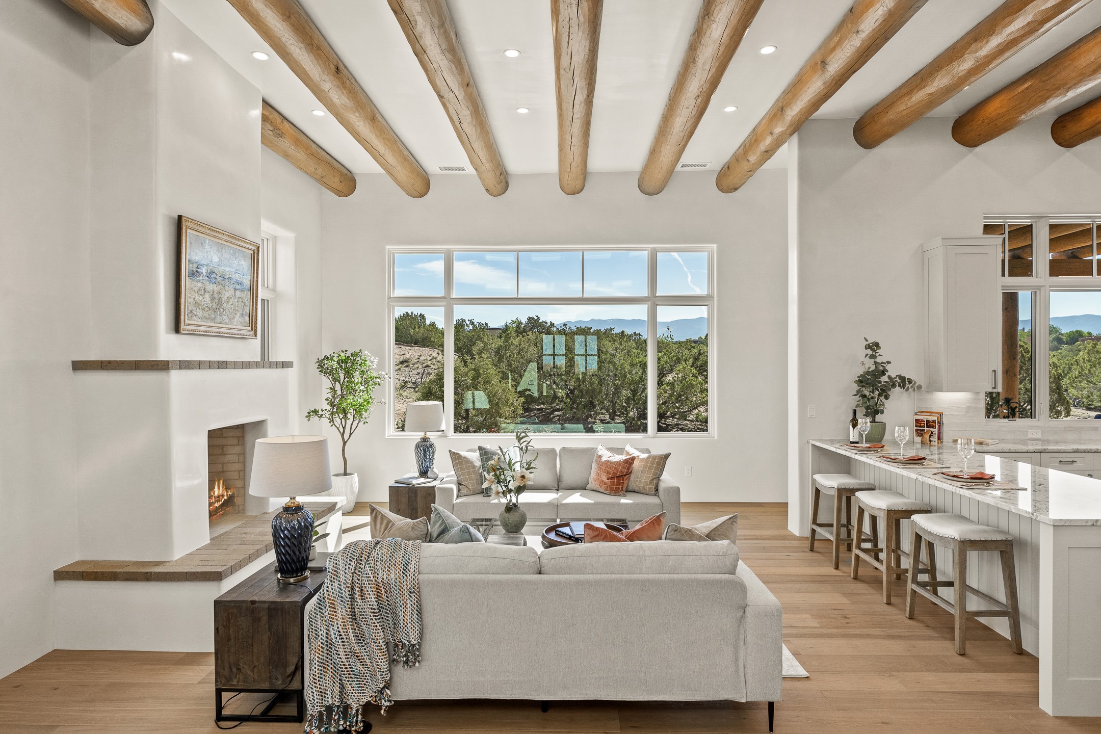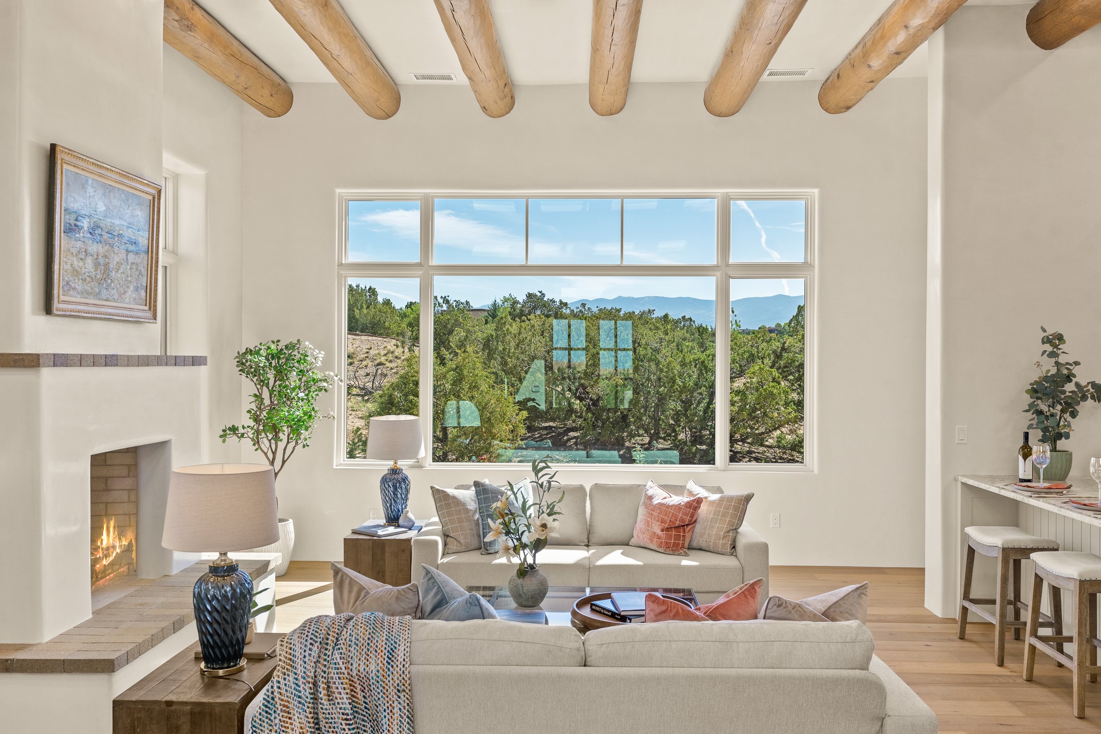 Newly constructed and just 15 minutes from The Plaza, this stunning 3,251 sq. ft. single-level home is bathed in soft natural light and offers sweeping views of the Sangre de Cristo Mountains. From the moment you enter, the sophisticated blend of Southwestern and contemporary architecture is evident, featuring hand-troweled diamond plaster walls, white oak flooring, and striking vigas. Expansive picture windows, accented with divided light transoms, frame dramatic mountain views, bringing Santa Fe's natural light into every room. The kitchen is a natural gathering spot with a generous island and sink for prep and socializing, an eat-in bar for casual dining, a 6-burner Wolf gas cooktop, Subzero appliances, custom cabinetry, and a perfectly positioned sink that captures the mountain vistas. The deep east-facing brick portal, accessible from the living and dining areas, extends the Southwestern experience outdoors with high ceilings, vigas, and a traditional wood-burning kiva fireplace. Tucked in the southeast wing, the private primary suite features a corner gas fireplace and direct access to the rear portal, offering seclusion and views. The ensuite bath includes dual vanities, a deep soaking tub, walk-in shower, and a closet spacious enough for even the most devoted shopper. The large laundry room connects directly to the primary closet for convenience. The guest wing offers two ensuite bedrooms with full bathrooms, designed for visitor comfort and privacy. In-floor radiant heat, forced air heating, central air conditioning, and a spacious 3-car garage add exceptional comfort and value. A special bonus: 6 Sierra Ct is located in Colinas Verdes, a distinct neighborhood with its own HOA within the gates of Las Campanas. Discover a home where elegance, comfort, and the beauty of Santa Fe come together seamlessly--your sanctuary awaits at 6 Sierra Ct.