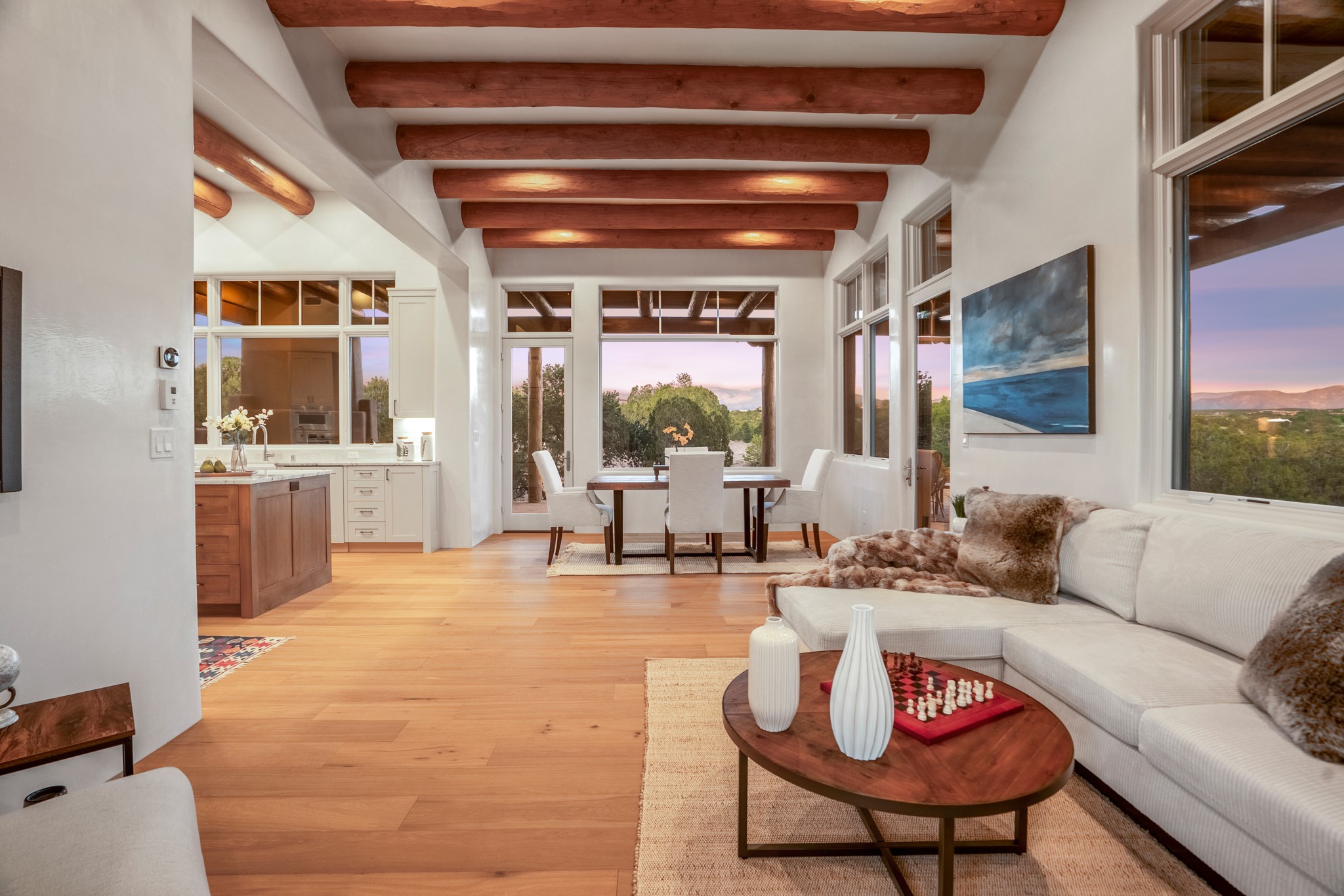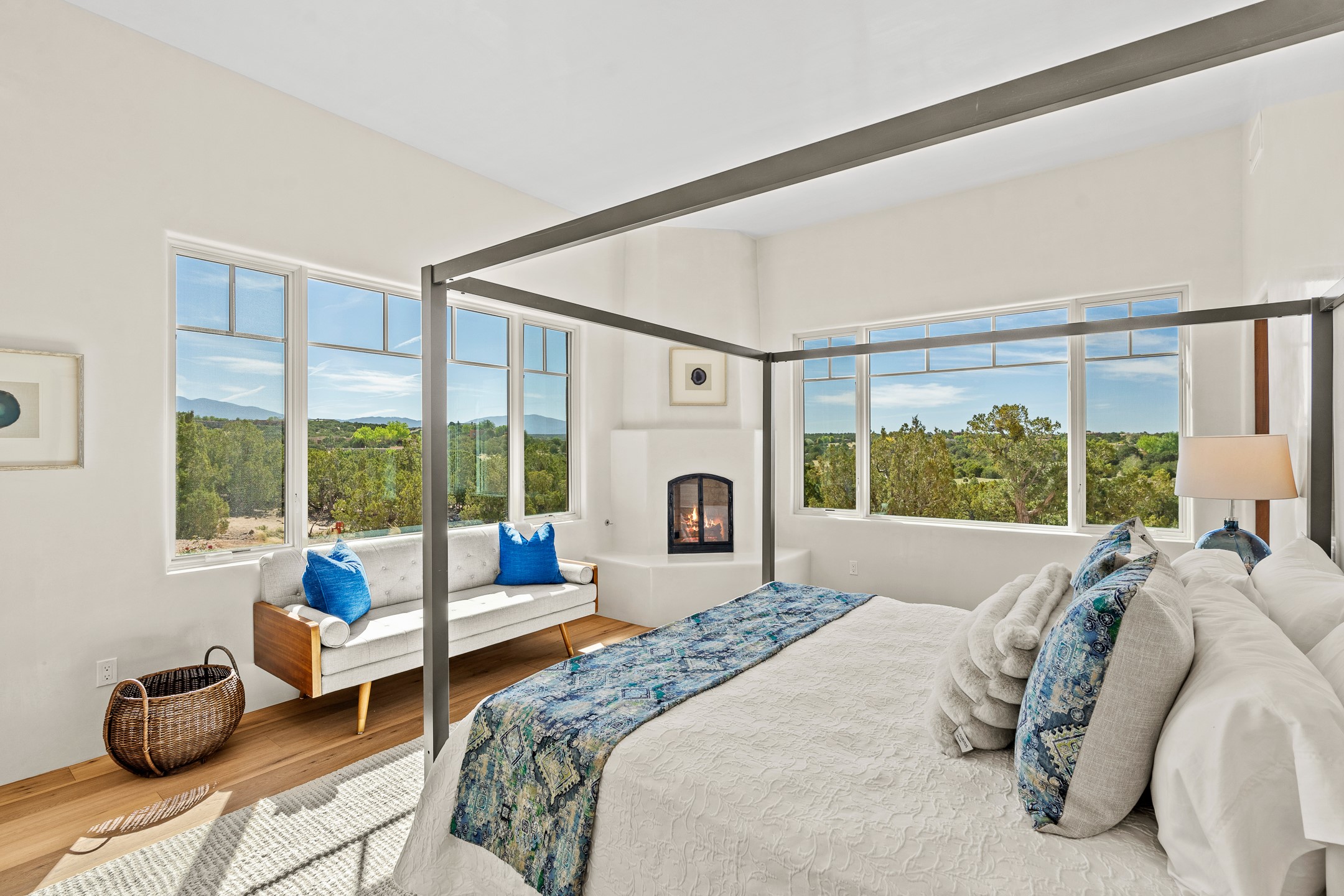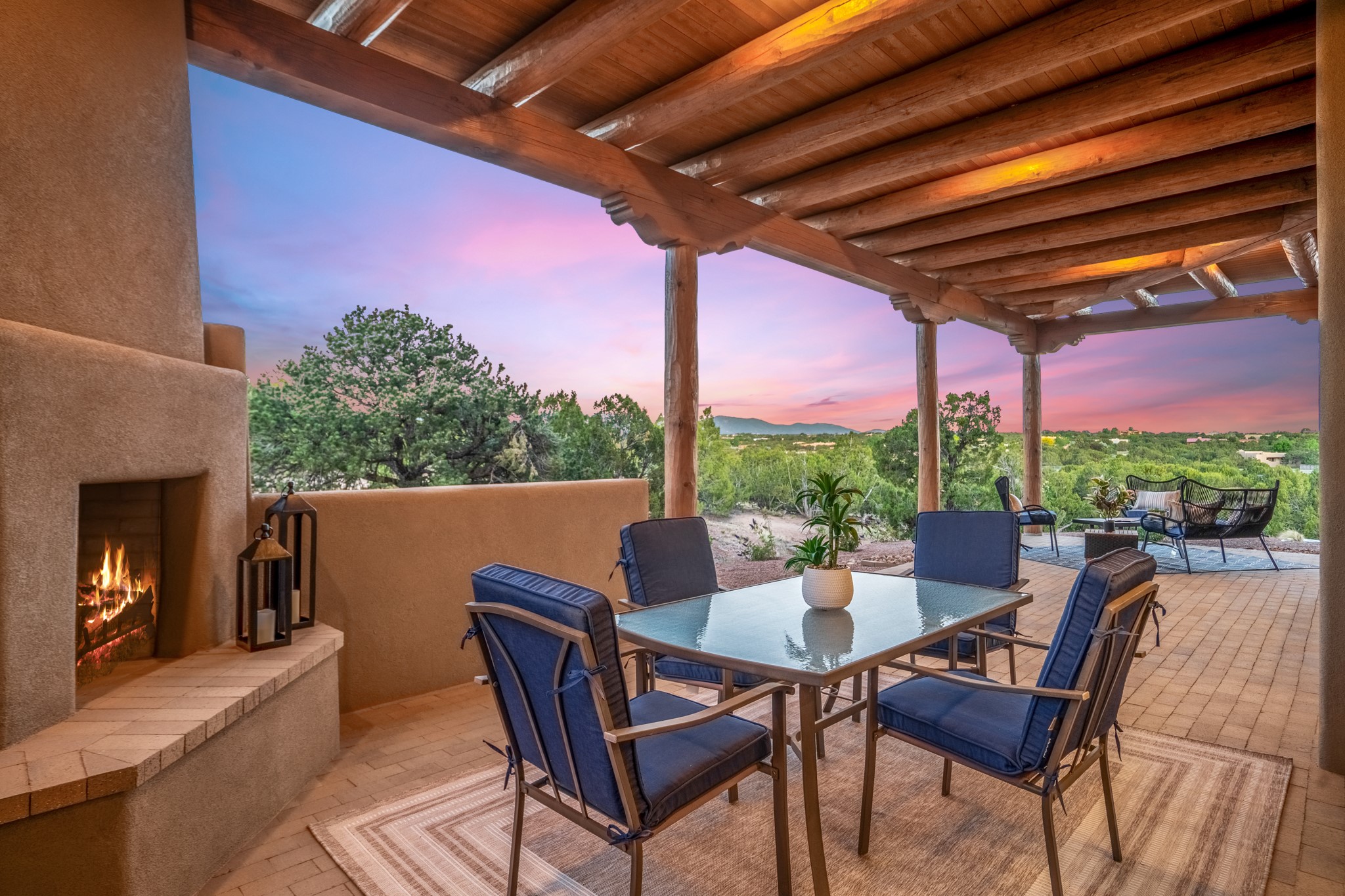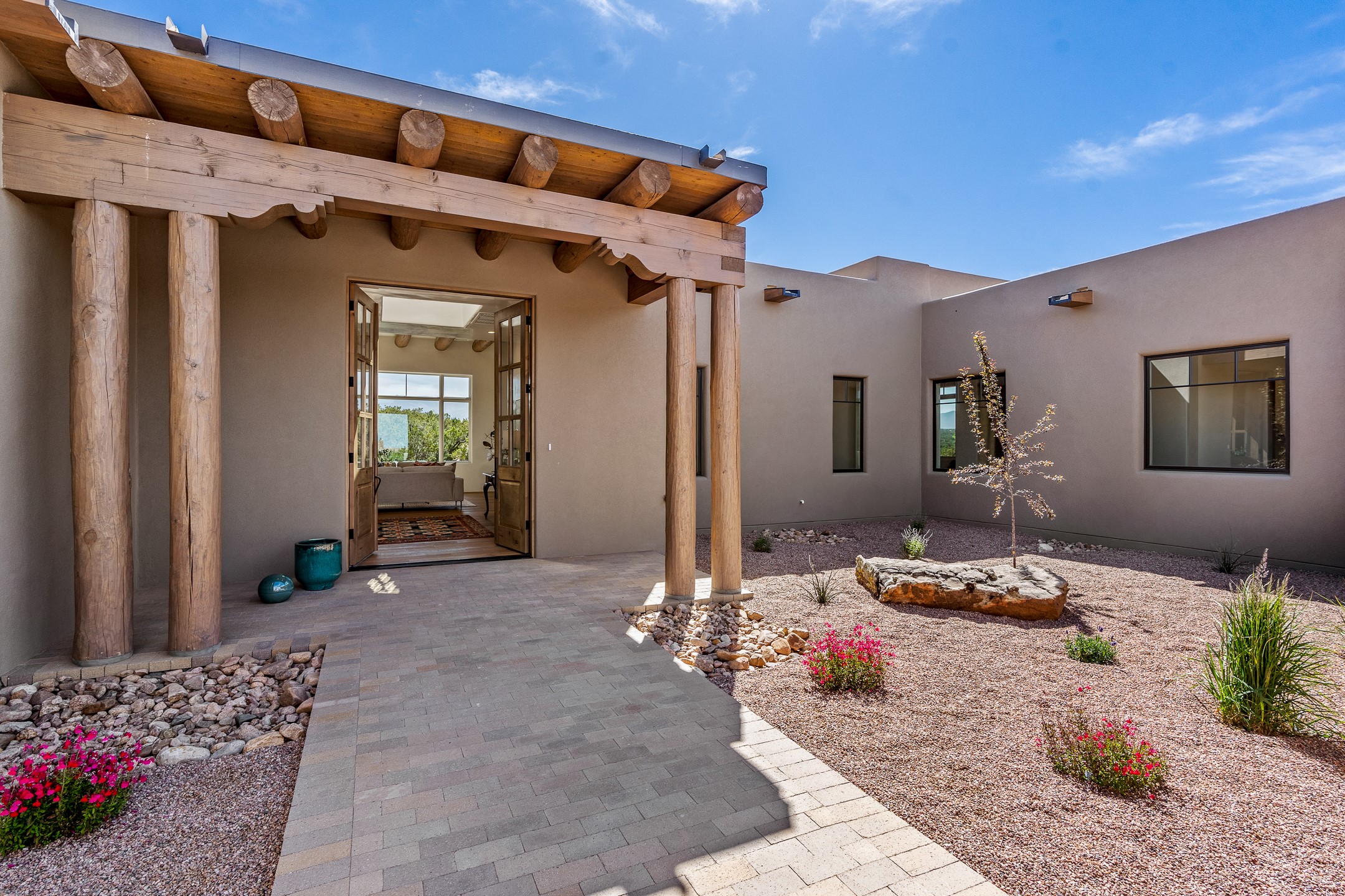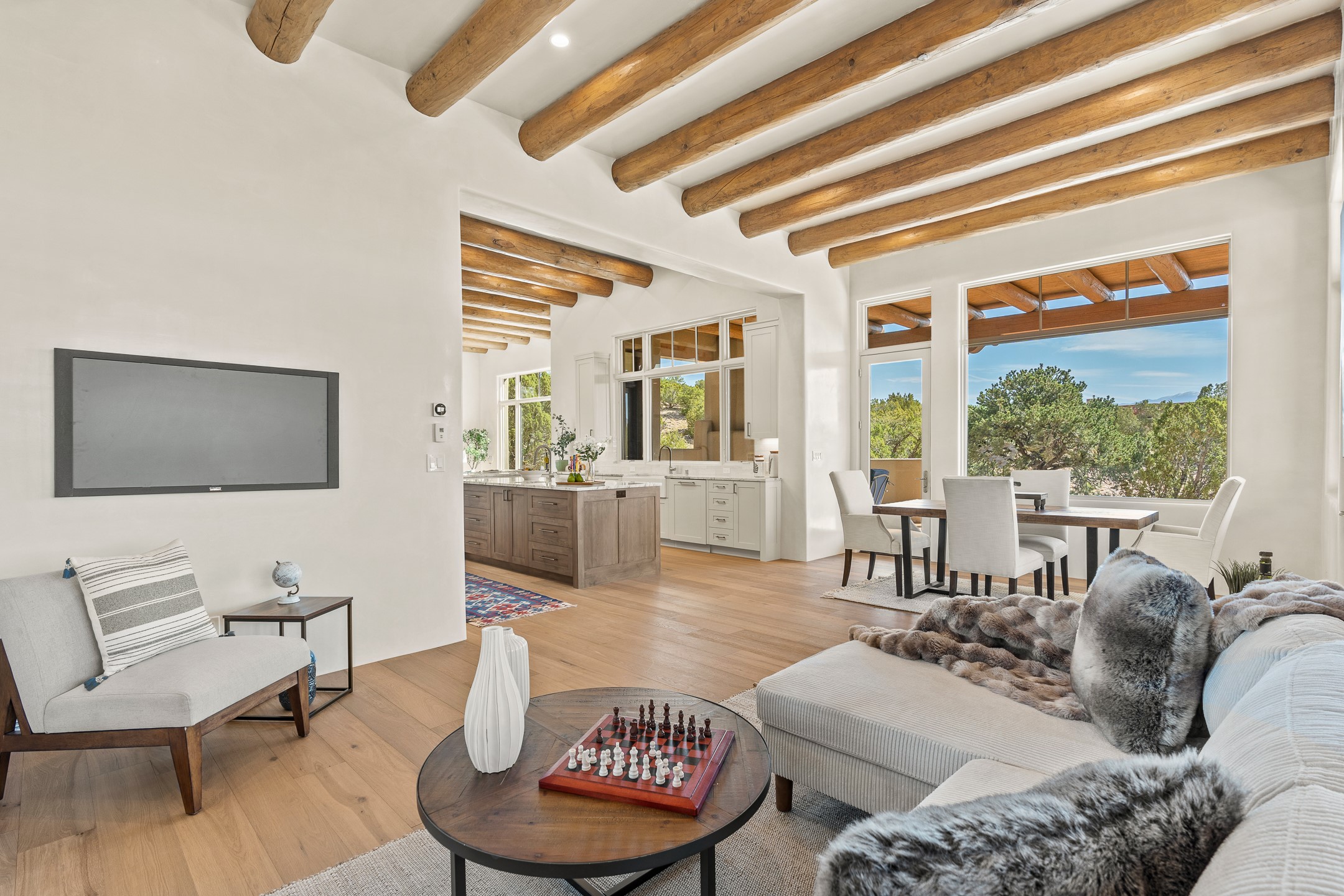 Newly constructed and just 15 minutes from The Plaza, this stunning 3,251 sq. ft. single-level home is bathed in soft natural light and offers sweeping views of the Sangre de Cristo Mountains. From the moment you enter, the sophisticated blend of Southwestern and contemporary architecture is evident, featuring hand-troweled diamond plaster walls, white oak flooring, and striking vigas. Expansive picture windows, accented with divided light transoms, frame dramatic mountain views, bringing Santa Fe's natural light into every room. The kitchen is a natural gathering spot with a generous island and sink for prep and socializing, an eat-in bar for casual dining, a 6-burner Wolf gas cooktop, Subzero appliances, custom cabinetry, and a perfectly positioned sink that captures the mountain vistas. The deep east-facing brick portal, accessible from the living and dining areas, extends the Southwestern experience outdoors with high ceilings, vigas, and a traditional wood-burning kiva fireplace. Tucked in the southeast wing, the private primary suite features a corner gas fireplace and direct access to the rear portal, offering seclusion and views. The ensuite bath includes dual vanities, a deep soaking tub, walk-in shower, and a closet spacious enough for even the most devoted shopper. The large laundry room connects directly to the primary closet for convenience. The guest wing offers two ensuite bedrooms with full bathrooms, designed for visitor comfort and privacy. In-floor radiant heat, forced air heating, central air conditioning, and a spacious 3-car garage add exceptional comfort and value. A special bonus: 6 Sierra Ct is located in Colinas Verdes, a distinct neighborhood with its own HOA within the gates of Las Campanas. Discover a home where elegance, comfort, and the beauty of Santa Fe come together seamlessly--your sanctuary awaits at 6 Sierra Ct.