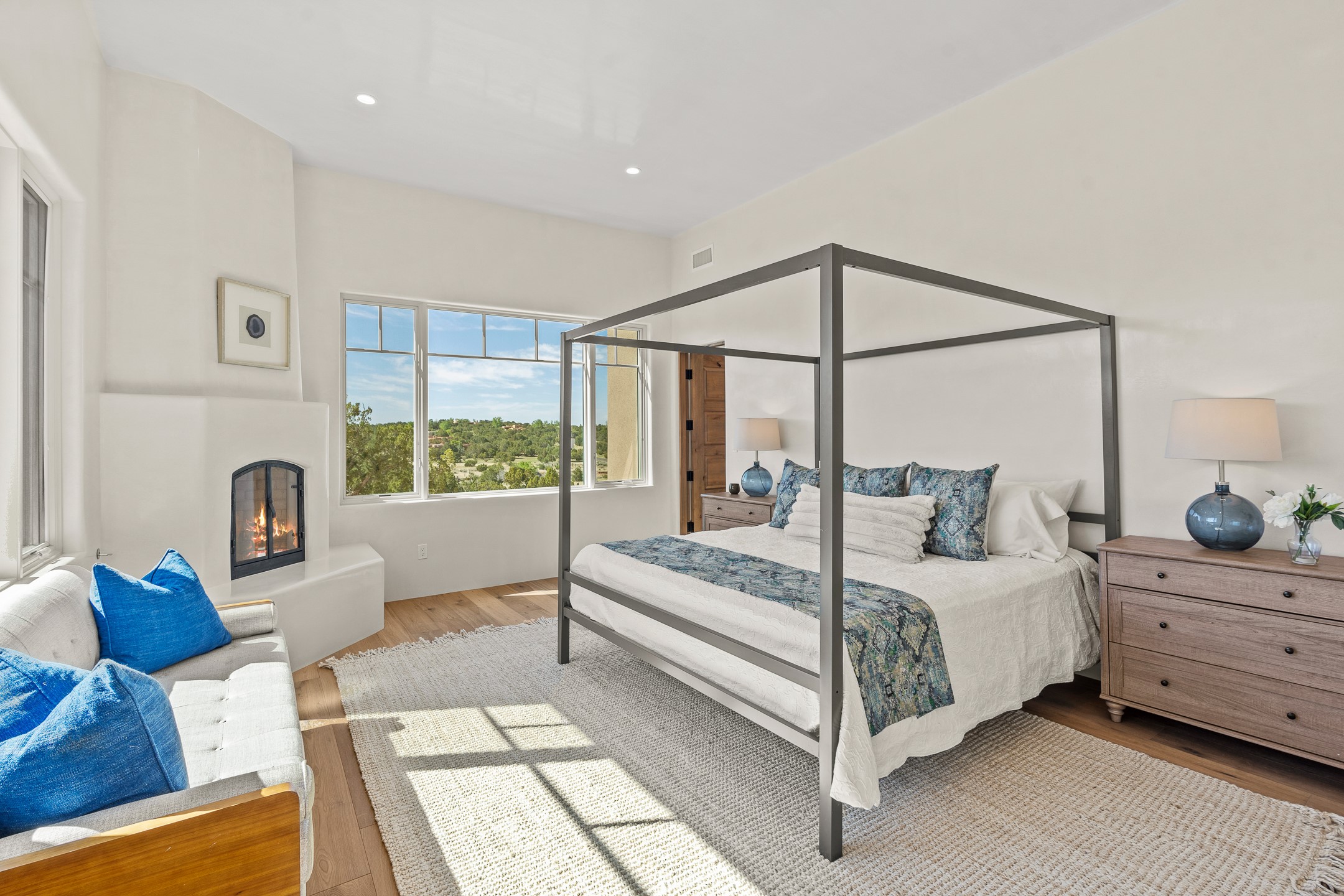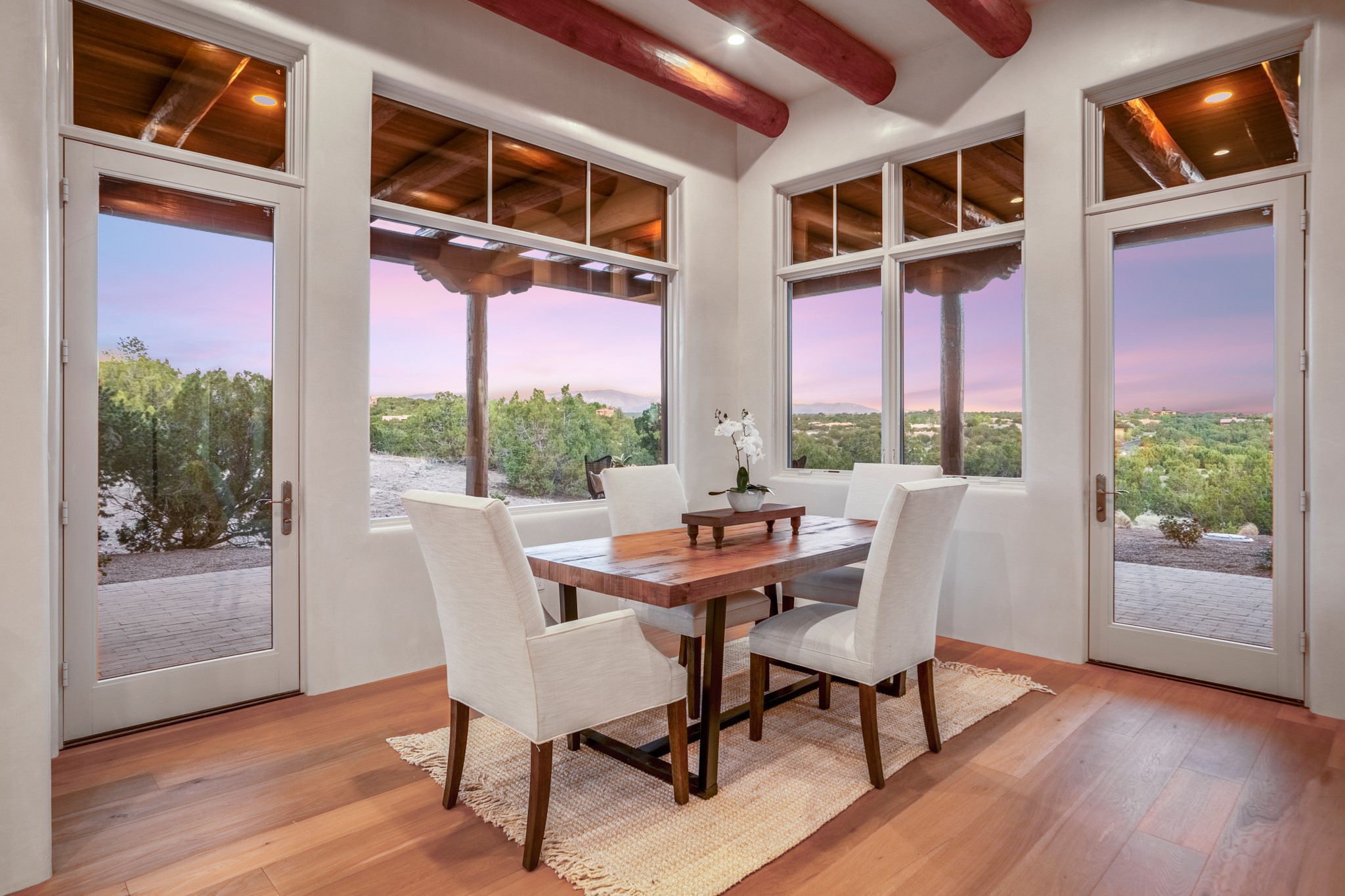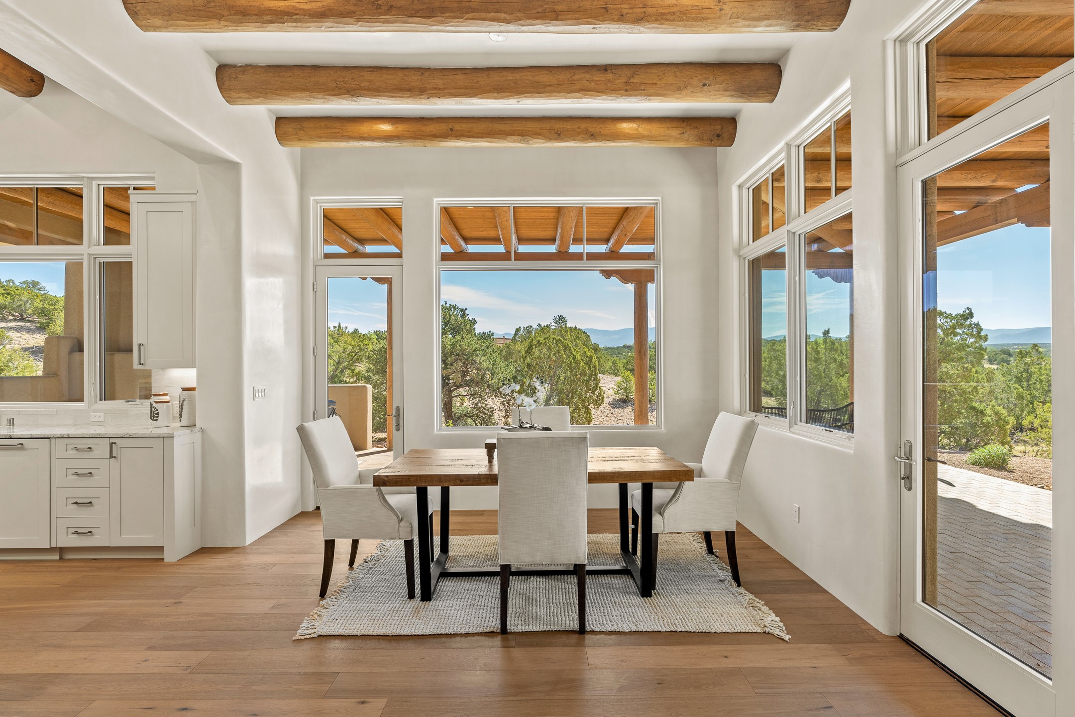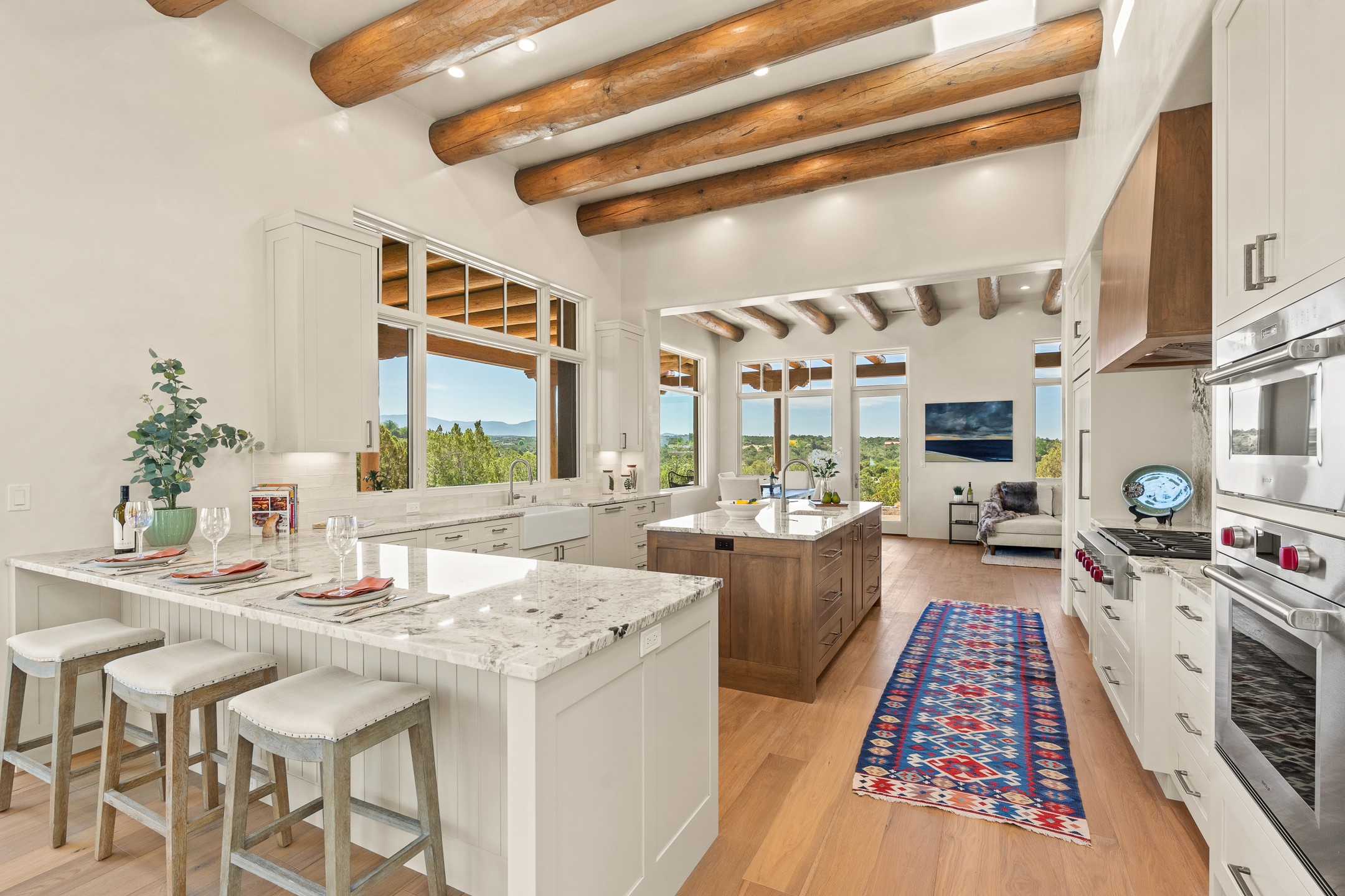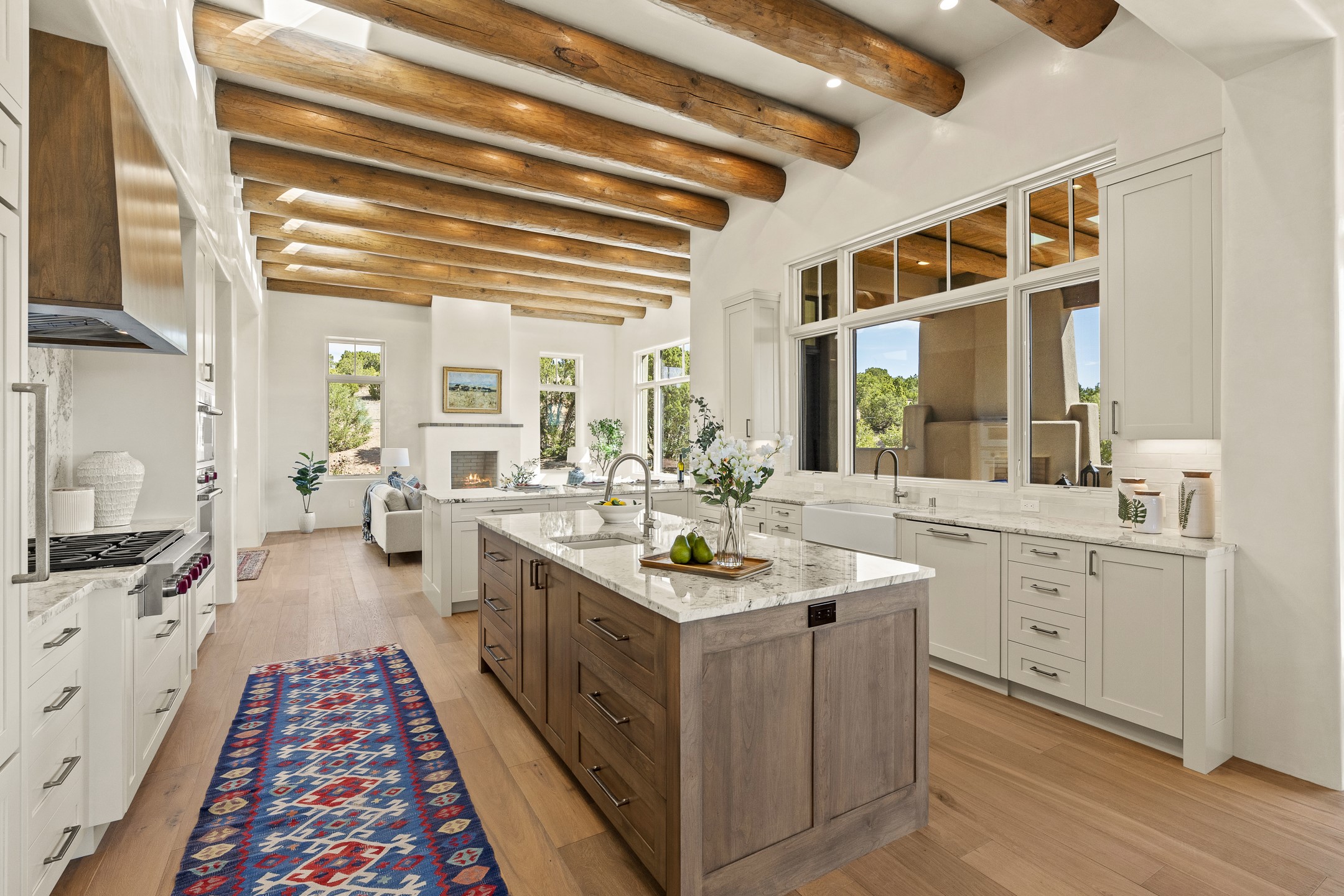Newly constructed and just 15 minutes from The Plaza, this stunning 3,251 sq. ft. single-level home is bathed in soft natural light and offers sweeping views of the Sangre de Cristo Mountains. From the moment you enter, the sophisticated blend of Southwestern and contemporary architecture is evident, featuring hand-troweled diamond plaster walls, white oak flooring, and striking vigas. Expansive picture windows, accented with divided light transoms, frame dramatic mountain views, bringing Santa Fe's natural light into every room. The kitchen is a natural gathering spot with a generous island and sink for prep and socializing, an eat-in bar for casual dining, a 6-burner Wolf gas cooktop, Subzero appliances, custom cabinetry, and a perfectly positioned sink that captures the mountain vistas. The deep east-facing brick portal, accessible from the living and dining areas, extends the Southwestern experience outdoors with high ceilings, vigas, and a traditional wood-burning kiva fireplace. Tucked in the southeast wing, the private primary suite features a corner gas fireplace and direct access to the rear portal, offering seclusion and views. The ensuite bath includes dual vanities, a deep soaking tub, walk-in shower, and a closet spacious enough for even the most devoted shopper. The large laundry room connects directly to the primary closet for convenience. The guest wing offers two ensuite bedrooms with full bathrooms, designed for visitor comfort and privacy. In-floor radiant heat, forced air heating, central air conditioning, and a spacious 3-car garage add exceptional comfort and value. A special bonus: 6 Sierra Ct is located in Colinas Verdes, a distinct neighborhood with its own HOA within the gates of Las Campanas. Discover a home where elegance, comfort, and the beauty of Santa Fe come together seamlessly--your sanctuary awaits at 6 Sierra Ct.