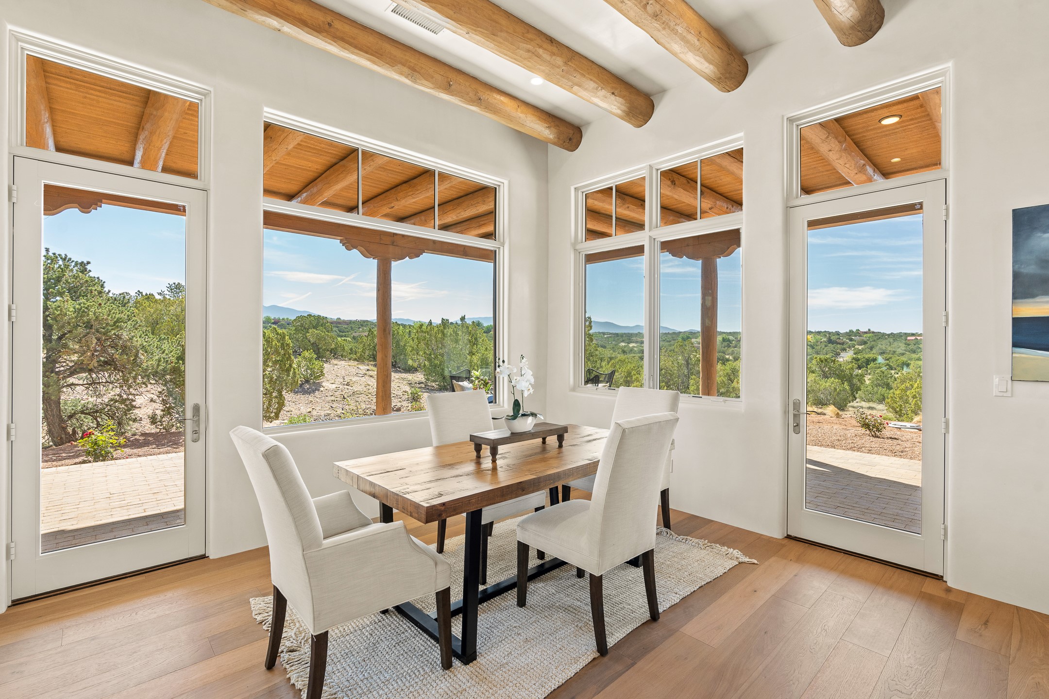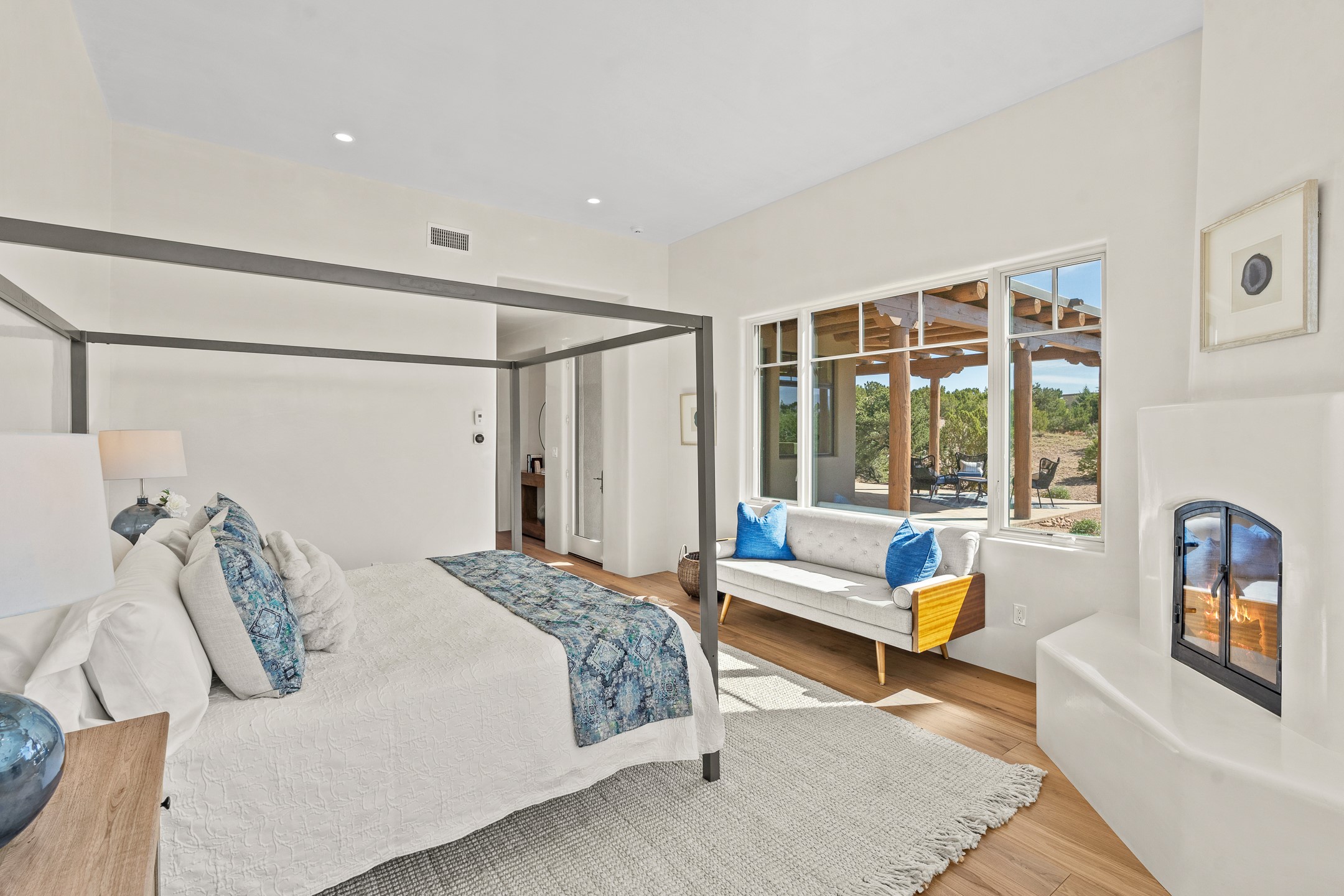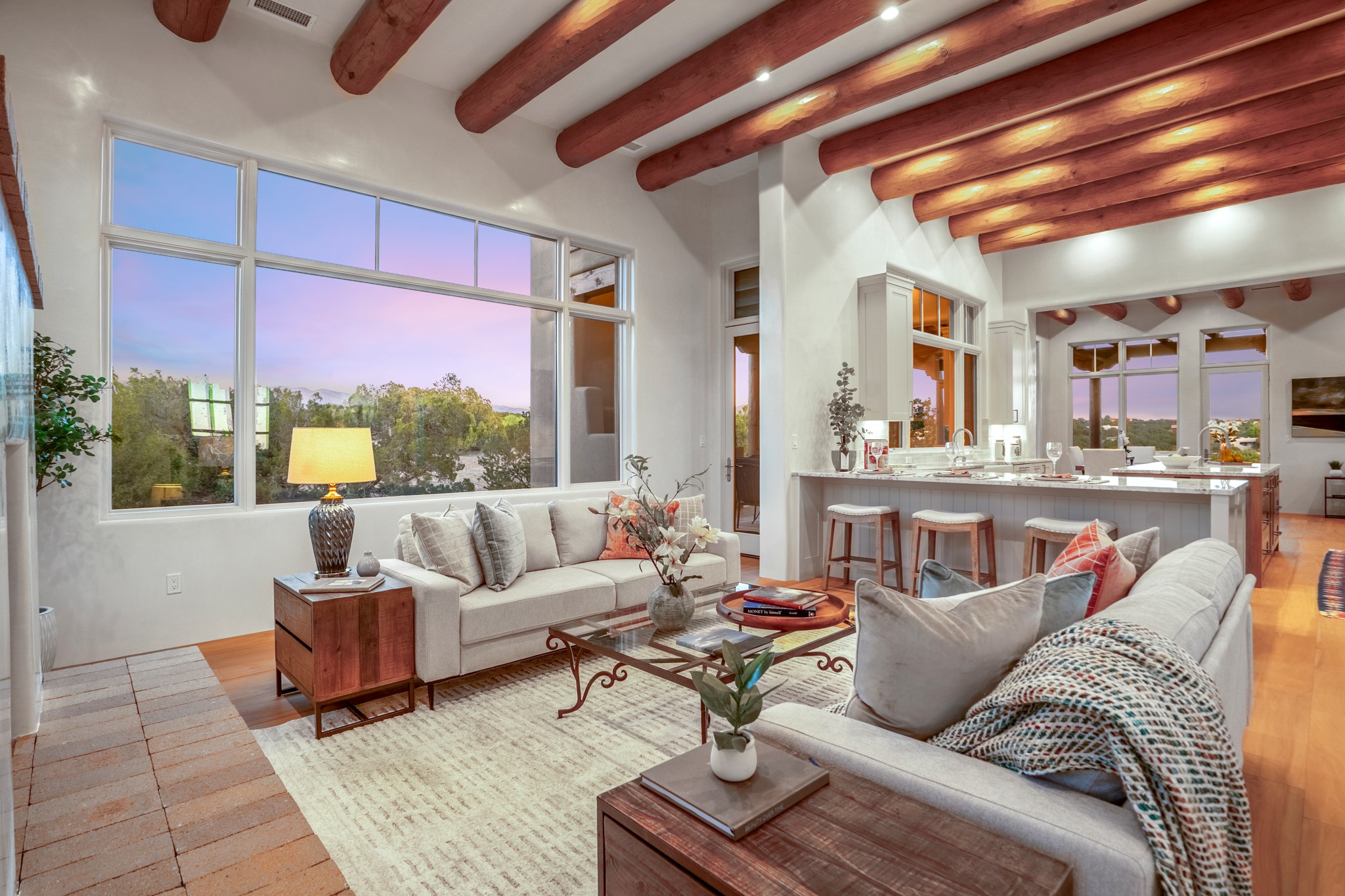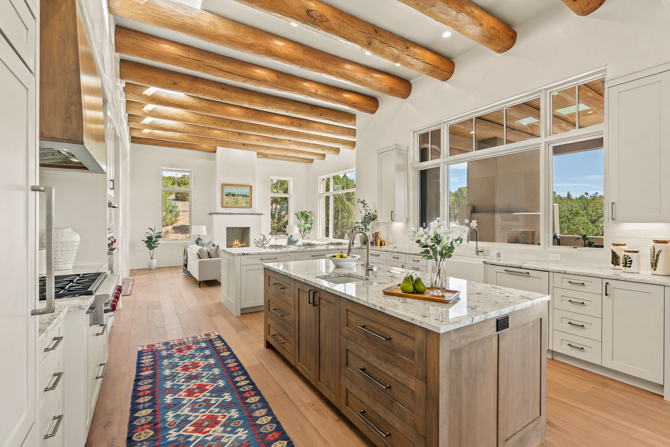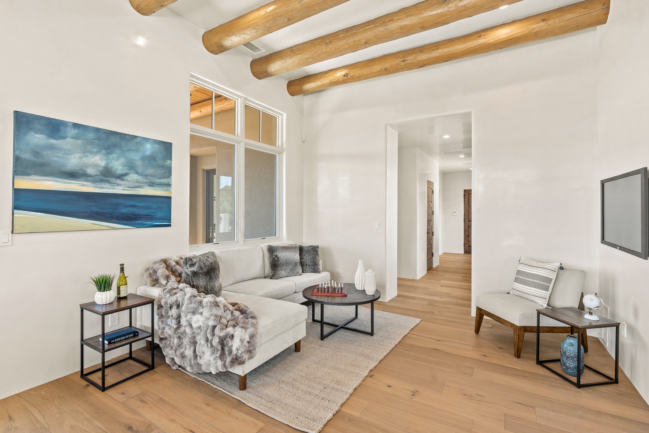 Newly constructed and just 15 minutes from The Plaza, this stunning 3,251 sq. ft. single-level home is bathed in soft natural light and offers sweeping views of the Sangre de Cristo Mountains. From the moment you enter, the sophisticated blend of Southwestern and contemporary architecture is evident, featuring hand-troweled diamond plaster walls, white oak flooring, and striking vigas. Expansive picture windows, accented with divided light transoms, frame dramatic mountain views, bringing Santa Fe's natural light into every room. The kitchen is a natural gathering spot with a generous island and sink for prep and socializing, an eat-in bar for casual dining, a 6-burner Wolf gas cooktop, Subzero appliances, custom cabinetry, and a perfectly positioned sink that captures the mountain vistas. The deep east-facing brick portal, accessible from the living and dining areas, extends the Southwestern experience outdoors with high ceilings, vigas, and a traditional wood-burning kiva fireplace. Tucked in the southeast wing, the private primary suite features a corner gas fireplace and direct access to the rear portal, offering seclusion and views. The ensuite bath includes dual vanities, a deep soaking tub, walk-in shower, and a closet spacious enough for even the most devoted shopper. The large laundry room connects directly to the primary closet for convenience. The guest wing offers two ensuite bedrooms with full bathrooms, designed for visitor comfort and privacy. In-floor radiant heat, forced air heating, central air conditioning, and a spacious 3-car garage add exceptional comfort and value. A special bonus: 6 Sierra Ct is located in Colinas Verdes, a distinct neighborhood with its own HOA within the gates of Las Campanas. Discover a home where elegance, comfort, and the beauty of Santa Fe come together seamlessly--your sanctuary awaits at 6 Sierra Ct.