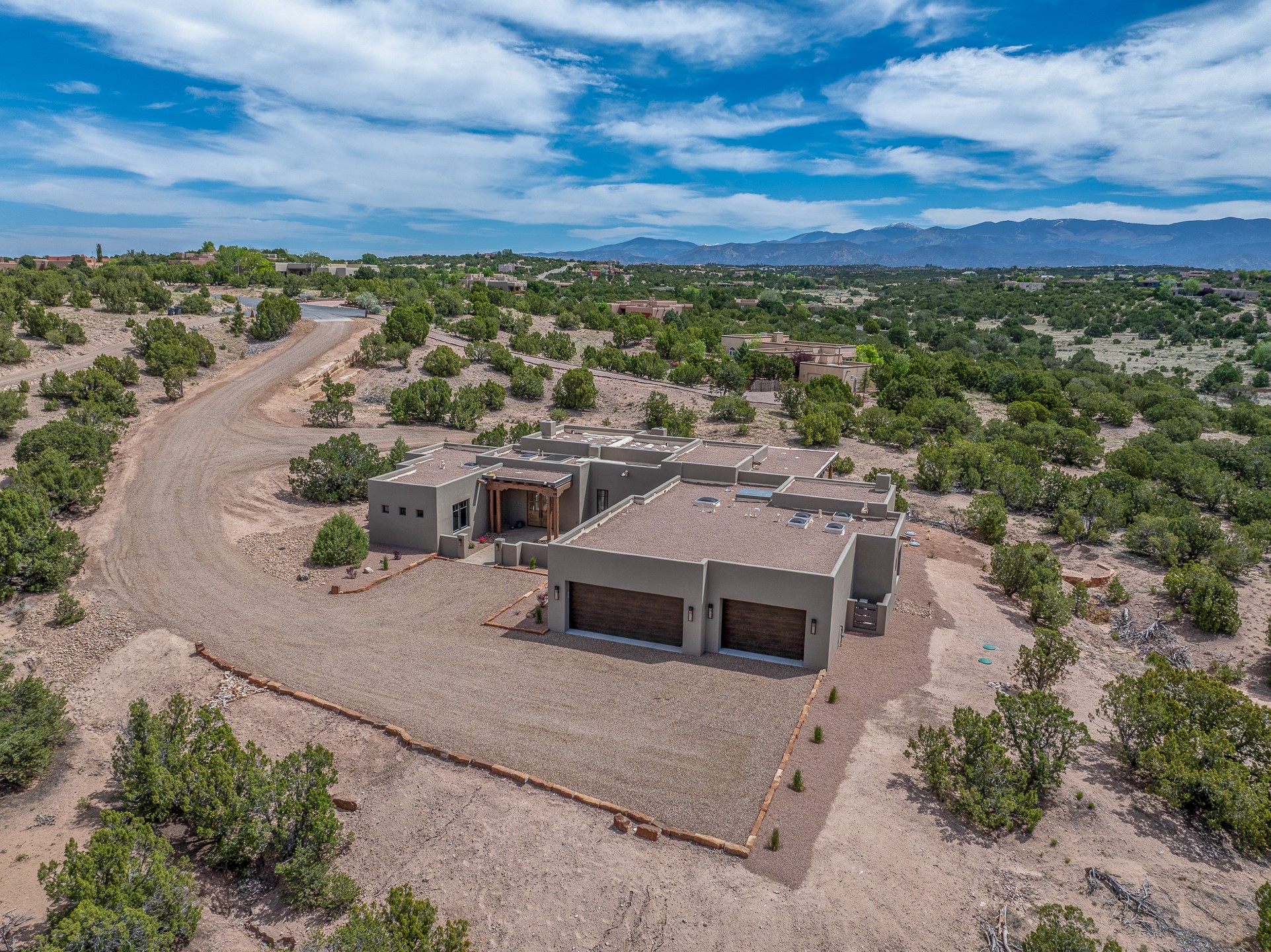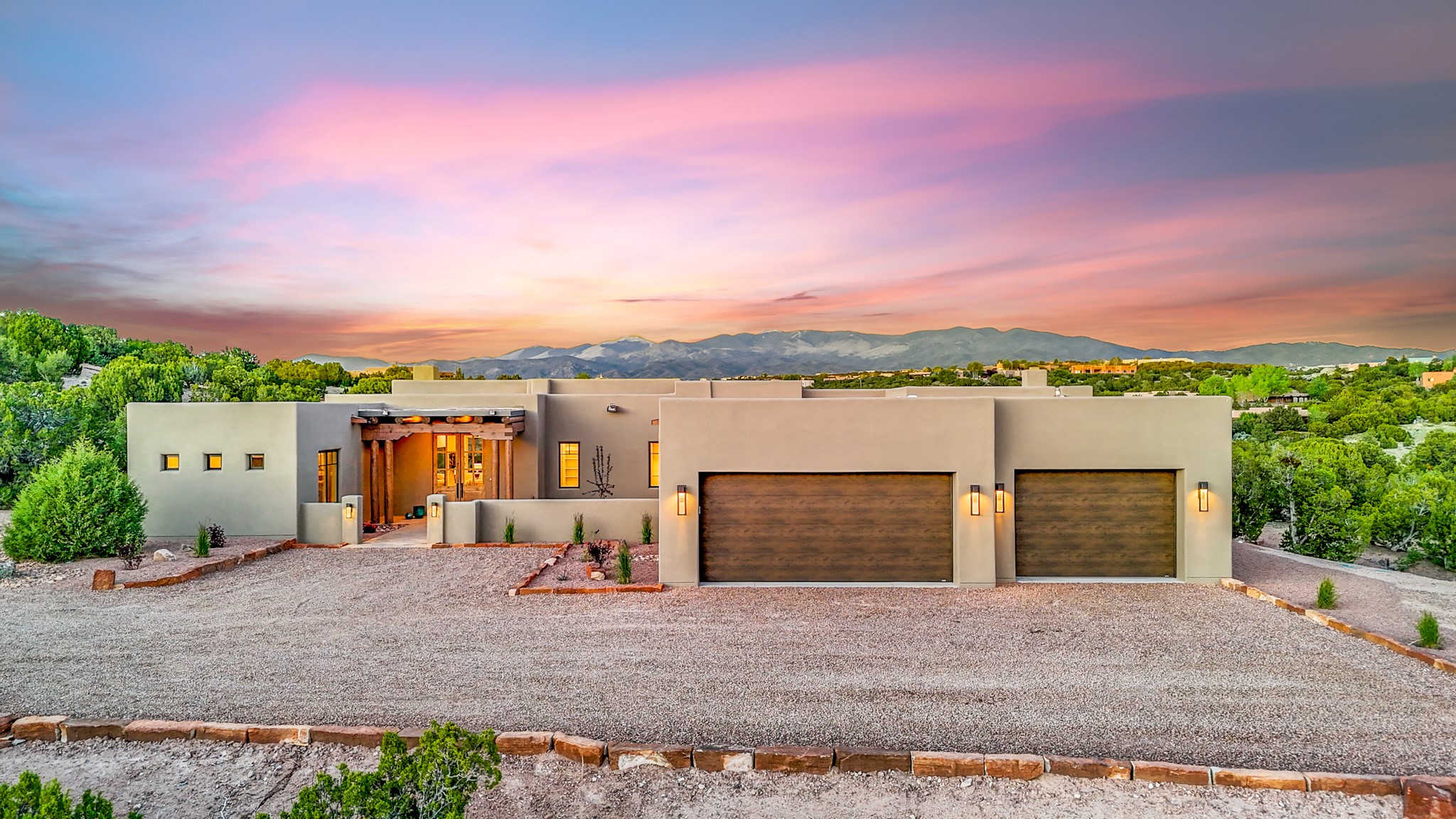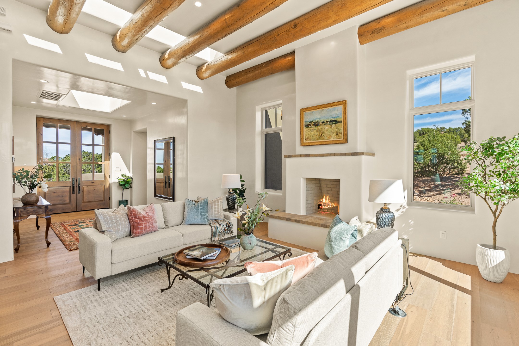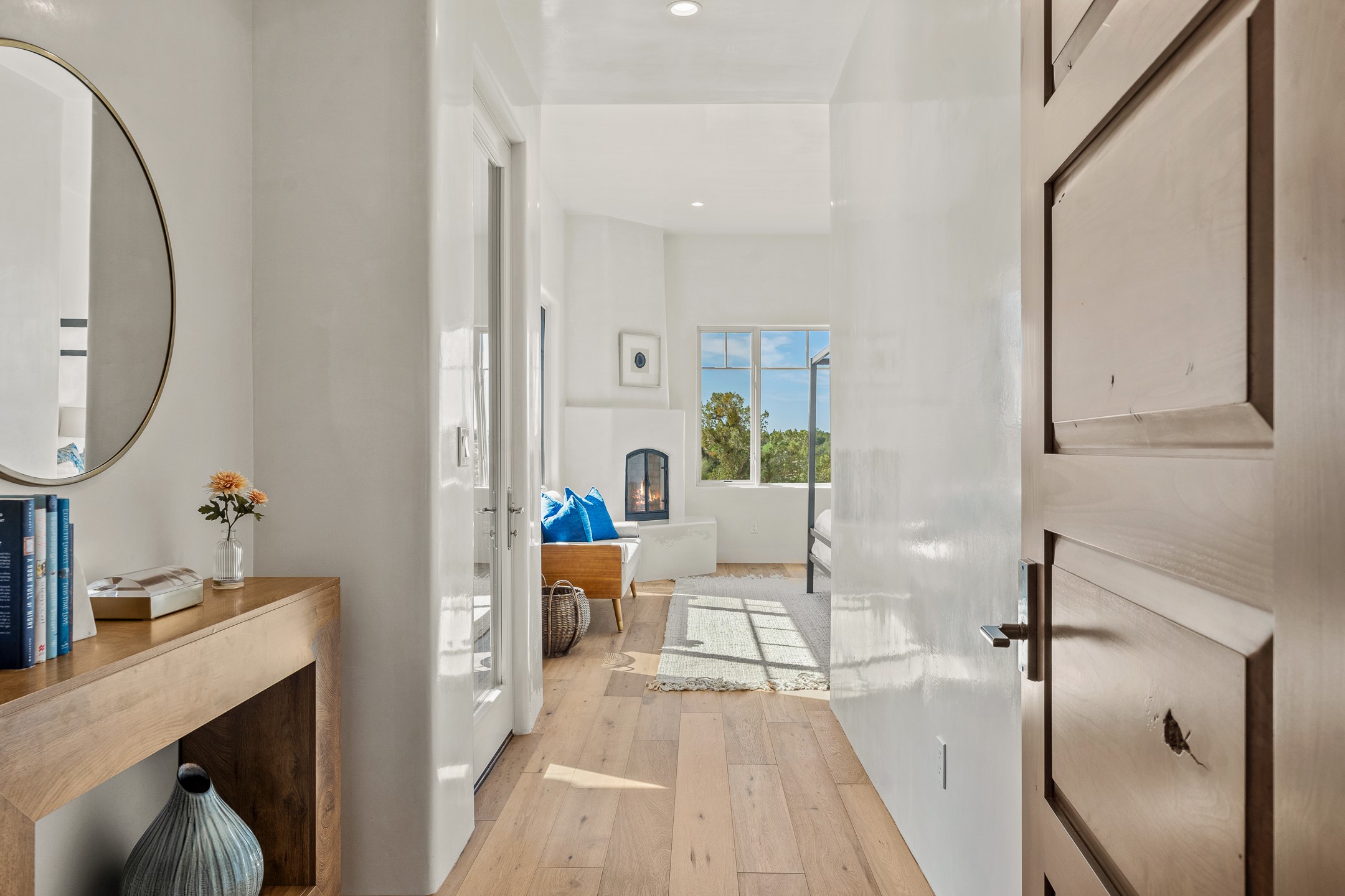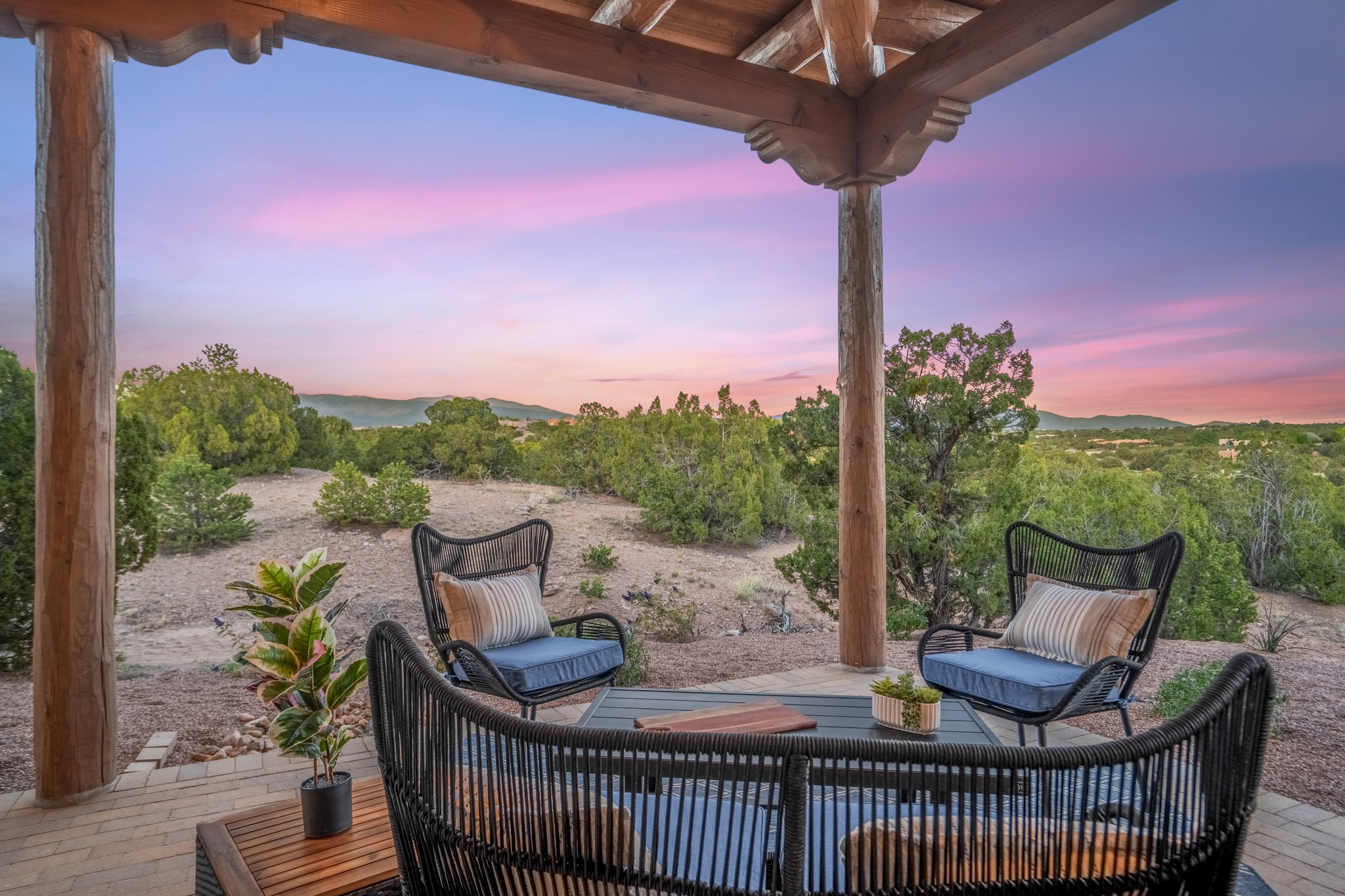 Newly constructed and just 15 minutes from The Plaza, this stunning 3,251 sq. ft. single-level home is bathed in soft natural light and offers sweeping views of the Sangre de Cristo Mountains. From the moment you enter, the sophisticated blend of Southwestern and contemporary architecture is evident, featuring hand-troweled diamond plaster walls, white oak flooring, and striking vigas. Expansive picture windows, accented with divided light transoms, frame dramatic mountain views, bringing Santa Fe's natural light into every room. The kitchen is a natural gathering spot with a generous island and sink for prep and socializing, an eat-in bar for casual dining, a 6-burner Wolf gas cooktop, Subzero appliances, custom cabinetry, and a perfectly positioned sink that captures the mountain vistas. The deep east-facing brick portal, accessible from the living and dining areas, extends the Southwestern experience outdoors with high ceilings, vigas, and a traditional wood-burning kiva fireplace. Tucked in the southeast wing, the private primary suite features a corner gas fireplace and direct access to the rear portal, offering seclusion and views. The ensuite bath includes dual vanities, a deep soaking tub, walk-in shower, and a closet spacious enough for even the most devoted shopper. The large laundry room connects directly to the primary closet for convenience. The guest wing offers two ensuite bedrooms with full bathrooms, designed for visitor comfort and privacy. In-floor radiant heat, forced air heating, central air conditioning, and a spacious 3-car garage add exceptional comfort and value. A special bonus: 6 Sierra Ct is located in Colinas Verdes, a distinct neighborhood with its own HOA within the gates of Las Campanas. Discover a home where elegance, comfort, and the beauty of Santa Fe come together seamlessly--your sanctuary awaits at 6 Sierra Ct.
