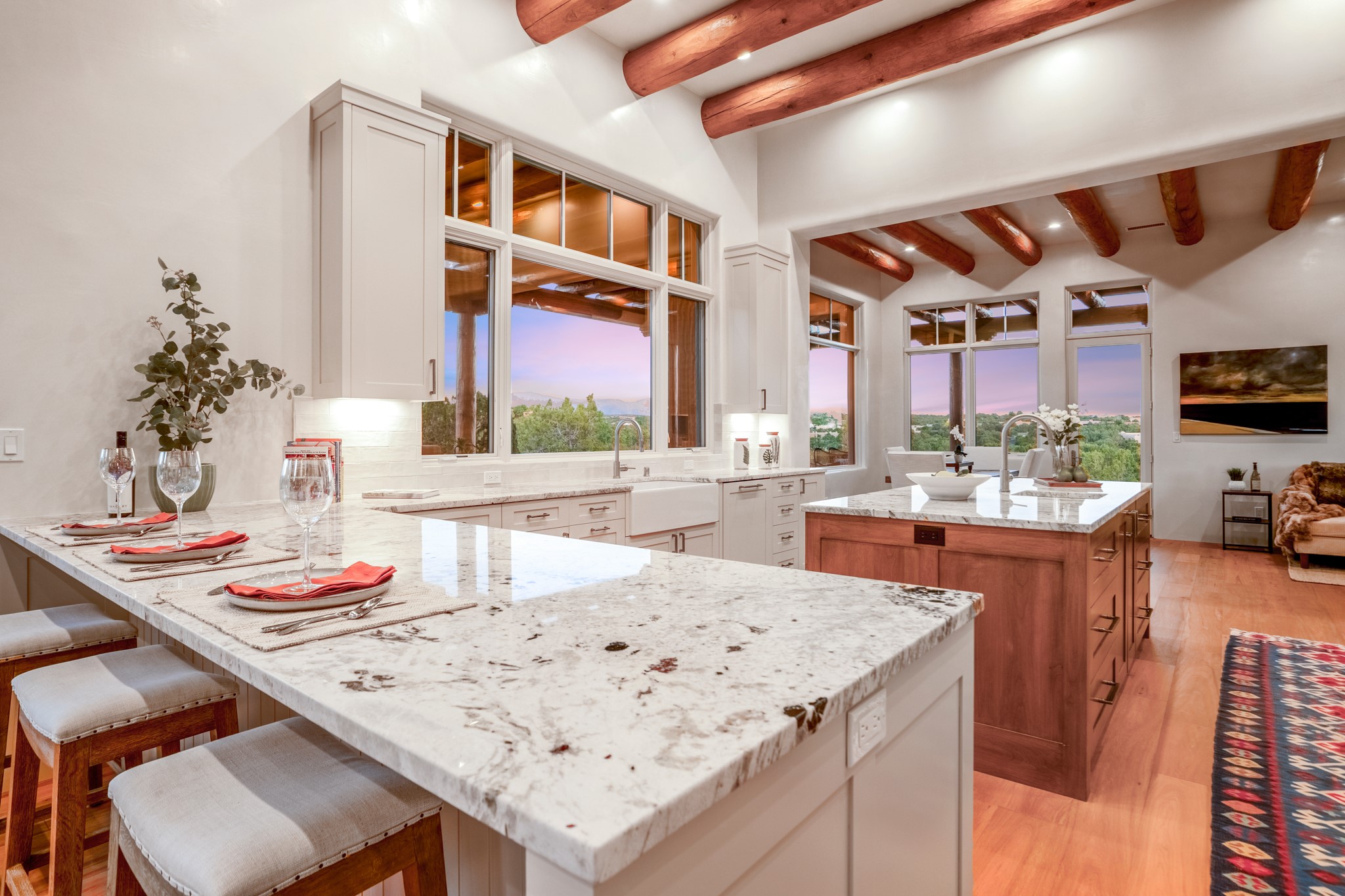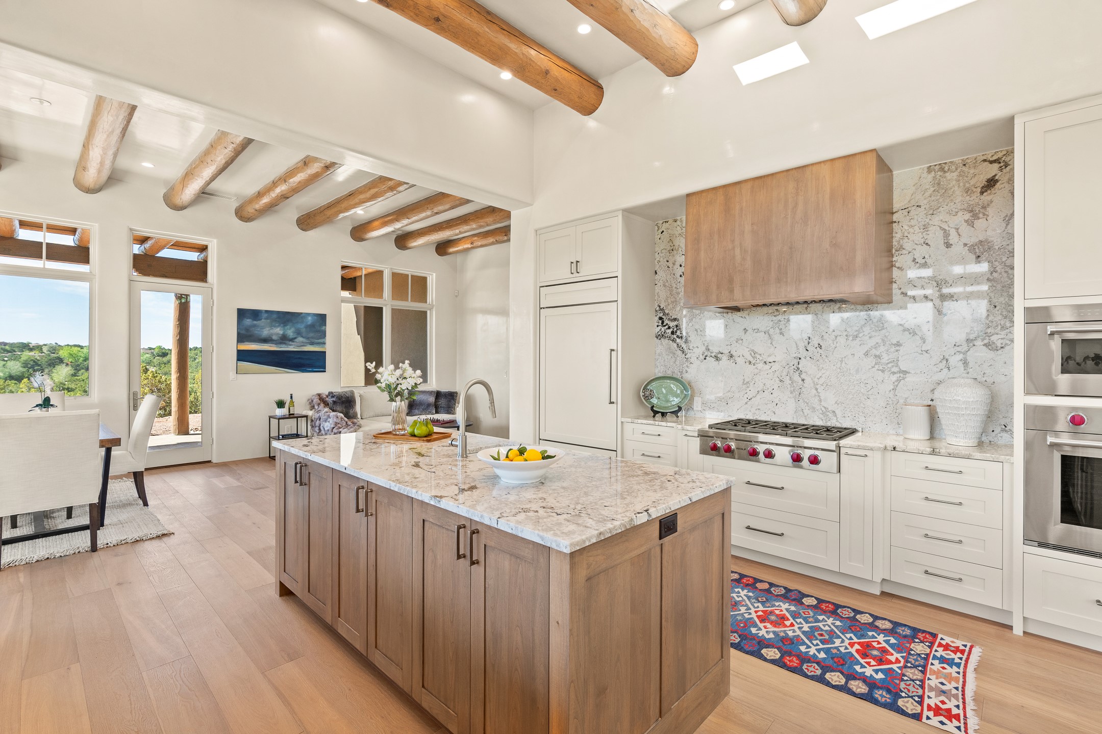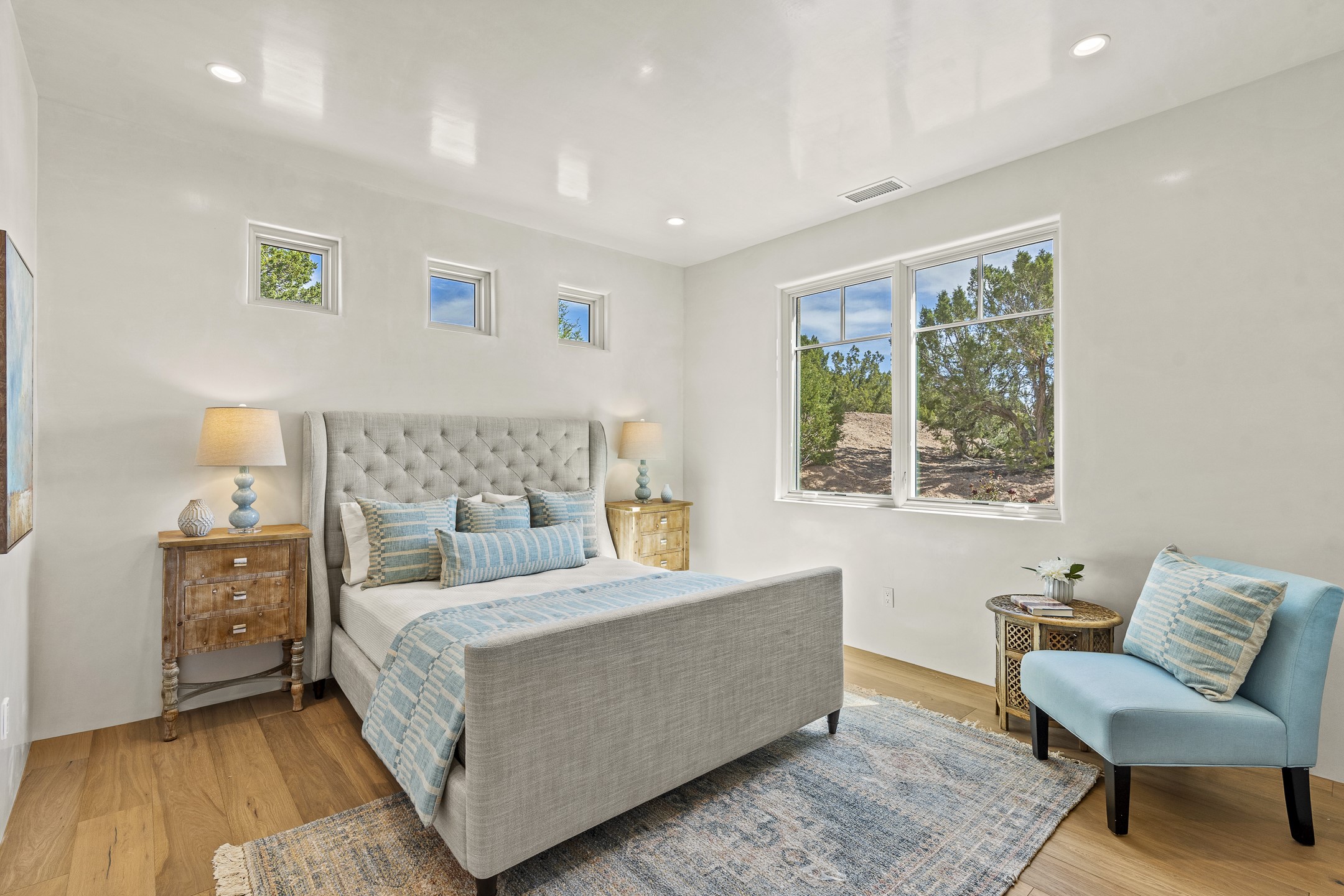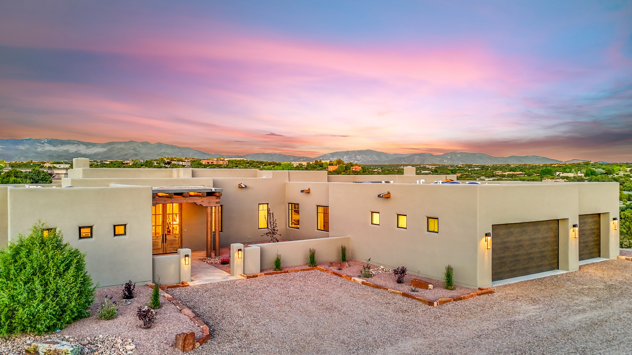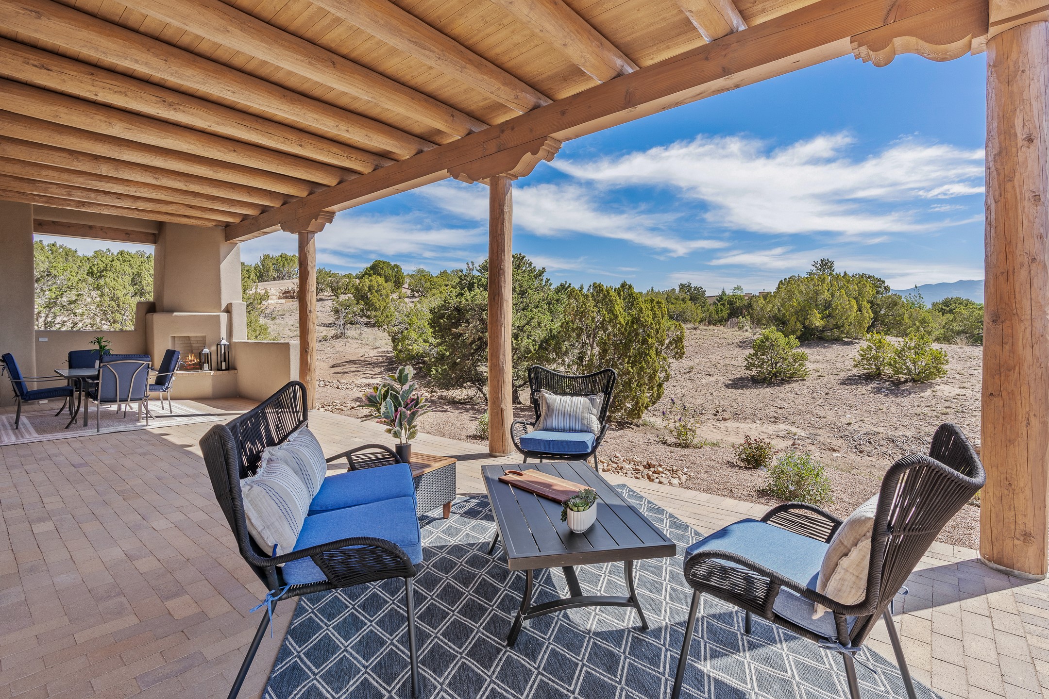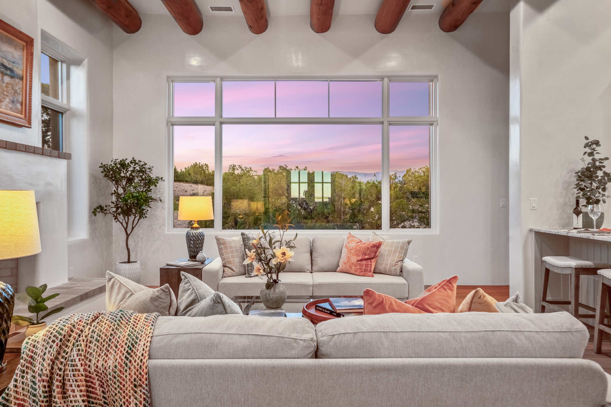 Newly constructed and just 15 minutes from The Plaza, this stunning 3,251 sq. ft. single-level home is bathed in soft natural light and offers sweeping views of the Sangre de Cristo Mountains. From the moment you enter, the sophisticated blend of Southwestern and contemporary architecture is evident, featuring hand-troweled diamond plaster walls, white oak flooring, and striking vigas. Expansive picture windows, accented with divided light transoms, frame dramatic mountain views, bringing Santa Fe's natural light into every room. The kitchen is a natural gathering spot with a generous island and sink for prep and socializing, an eat-in bar for casual dining, a 6-burner Wolf gas cooktop, Subzero appliances, custom cabinetry, and a perfectly positioned sink that captures the mountain vistas. The deep east-facing brick portal, accessible from the living and dining areas, extends the Southwestern experience outdoors with high ceilings, vigas, and a traditional wood-burning kiva fireplace. Tucked in the southeast wing, the private primary suite features a corner gas fireplace and direct access to the rear portal, offering seclusion and views. The ensuite bath includes dual vanities, a deep soaking tub, walk-in shower, and a closet spacious enough for even the most devoted shopper. The large laundry room connects directly to the primary closet for convenience. The guest wing offers two ensuite bedrooms with full bathrooms, designed for visitor comfort and privacy. In-floor radiant heat, forced air heating, central air conditioning, and a spacious 3-car garage add exceptional comfort and value. A special bonus: 6 Sierra Ct is located in Colinas Verdes, a distinct neighborhood with its own HOA within the gates of Las Campanas. Discover a home where elegance, comfort, and the beauty of Santa Fe come together seamlessly--your sanctuary awaits at 6 Sierra Ct.