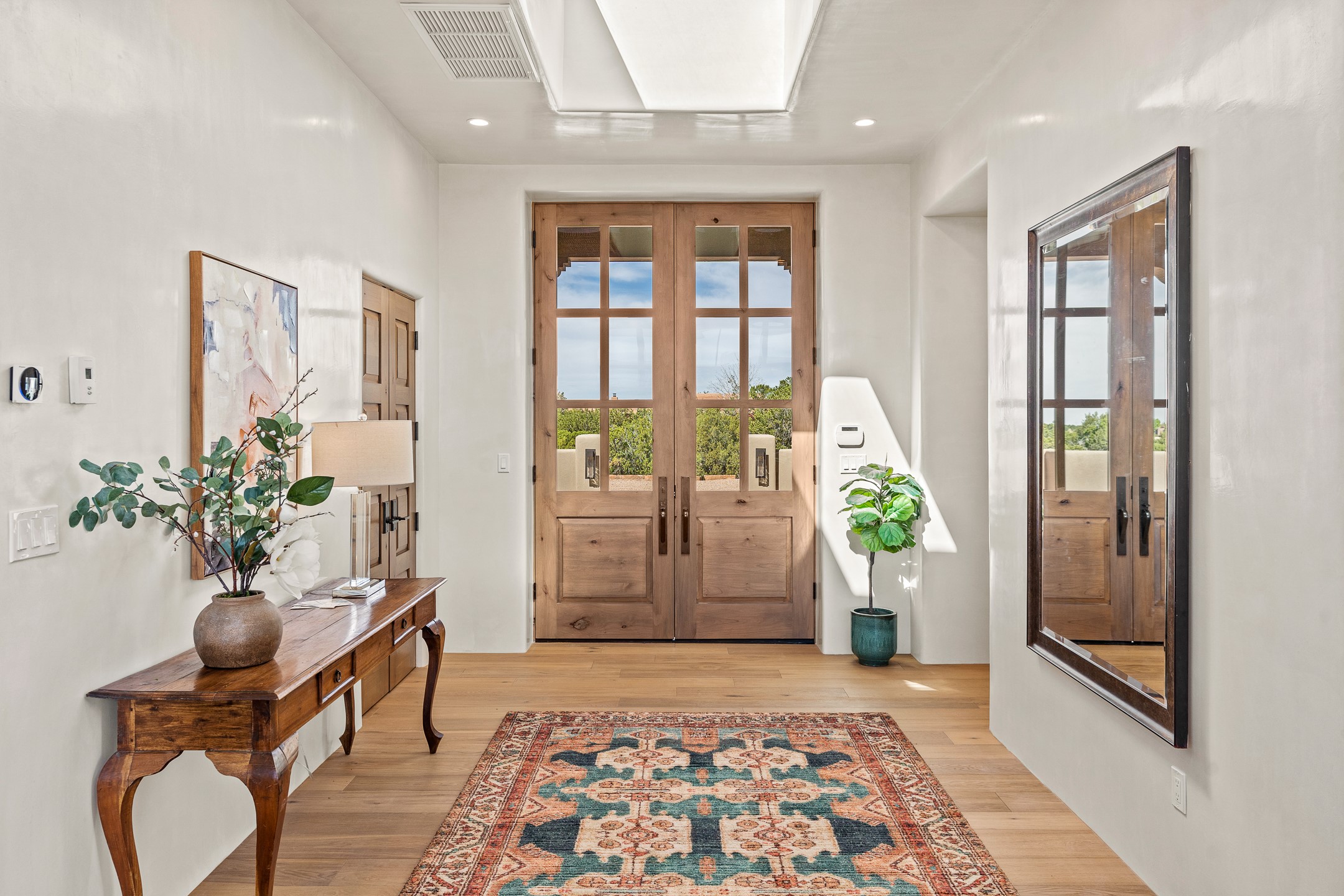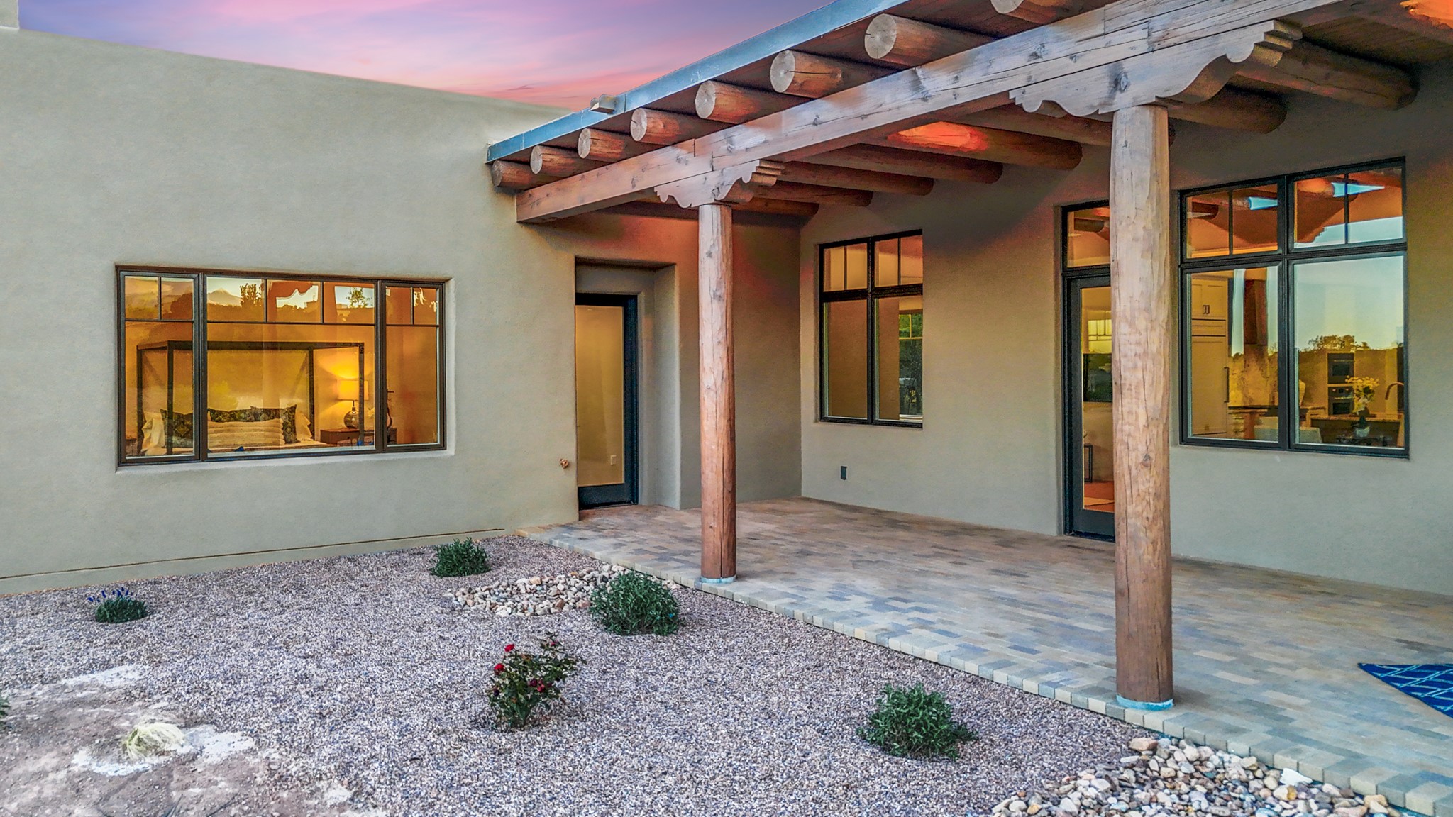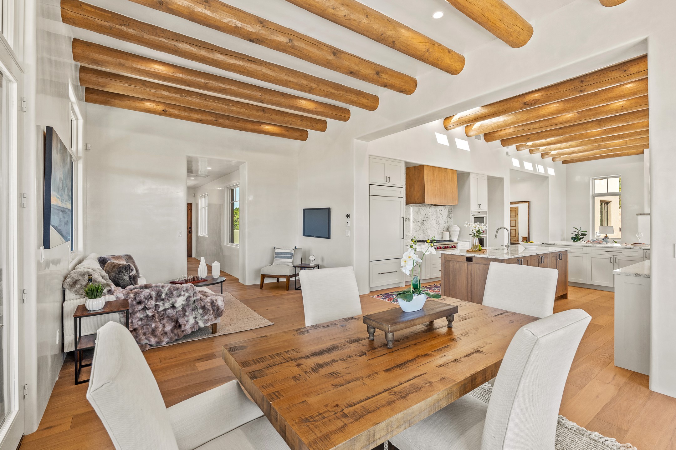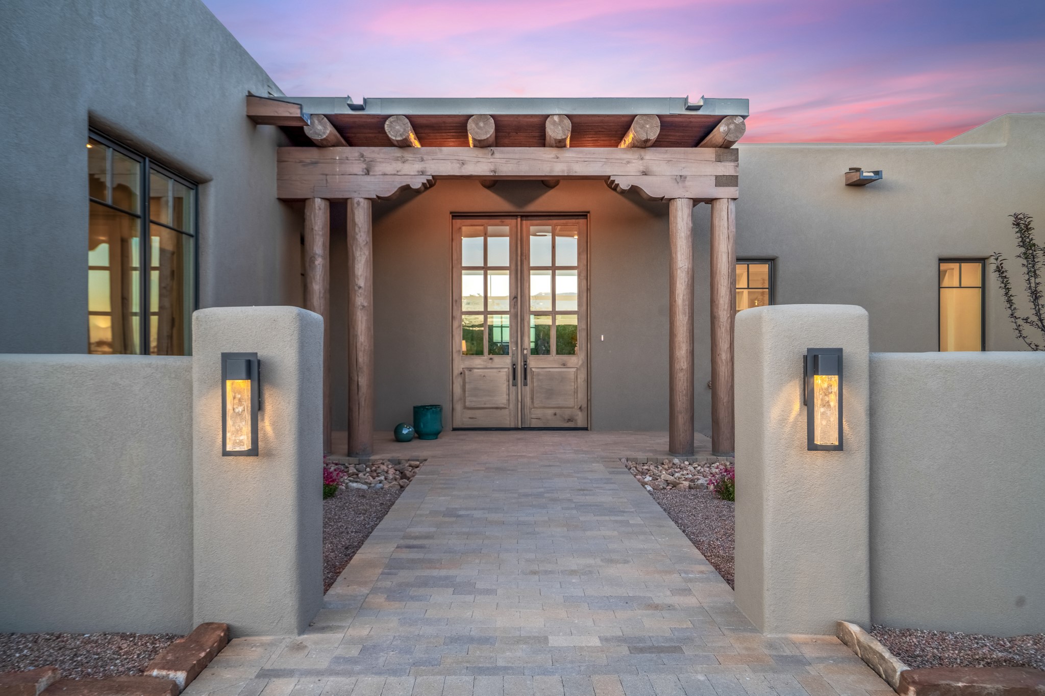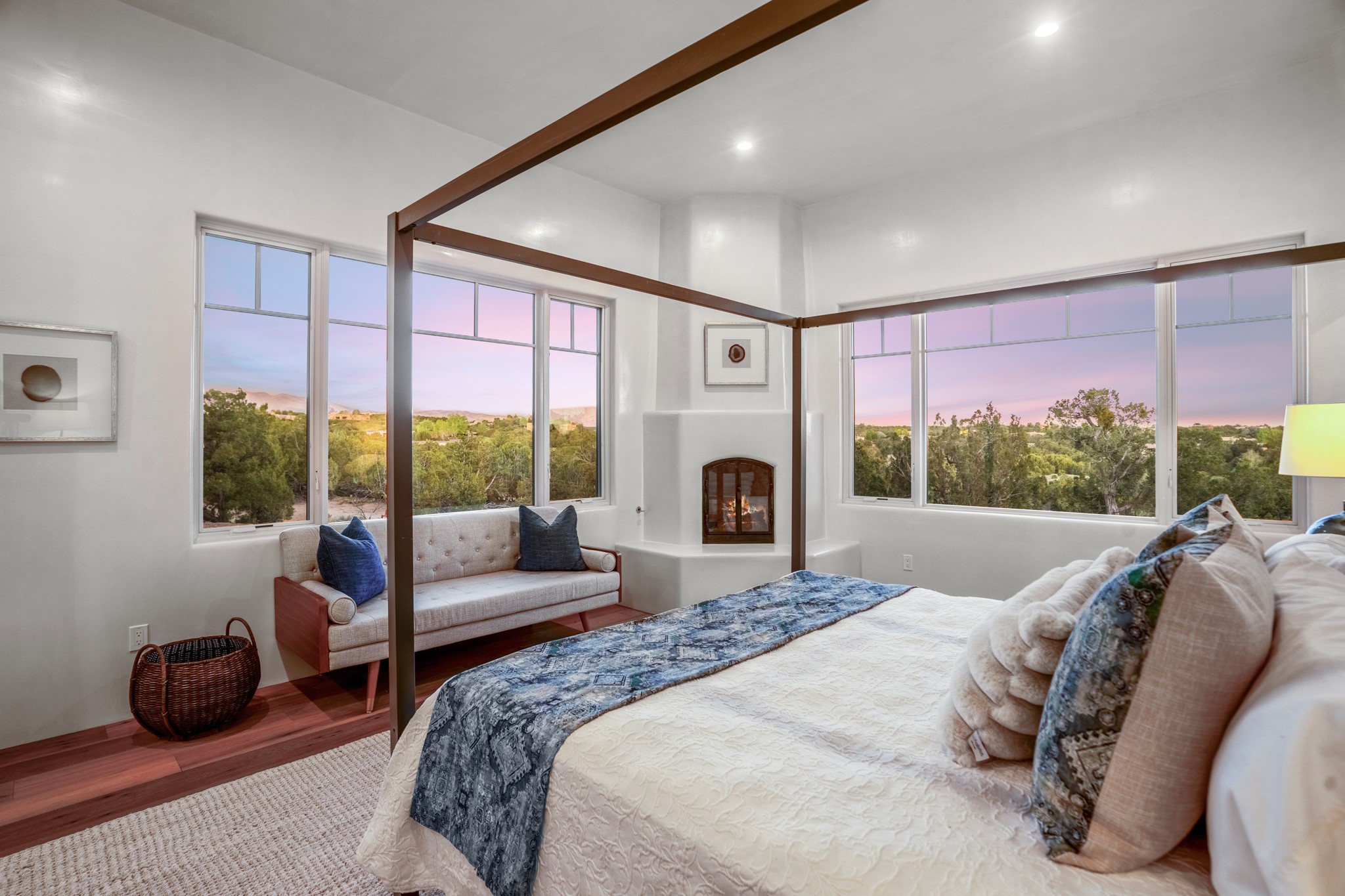 Newly constructed and just 15 minutes from The Plaza, this stunning 3,251 sq. ft. single-level home is bathed in soft natural light and offers sweeping views of the Sangre de Cristo Mountains. From the moment you enter, the sophisticated blend of Southwestern and contemporary architecture is evident, featuring hand-troweled diamond plaster walls, white oak flooring, and striking vigas. Expansive picture windows, accented with divided light transoms, frame dramatic mountain views, bringing Santa Fe's natural light into every room. The kitchen is a natural gathering spot with a generous island and sink for prep and socializing, an eat-in bar for casual dining, a 6-burner Wolf gas cooktop, Subzero appliances, custom cabinetry, and a perfectly positioned sink that captures the mountain vistas. The deep east-facing brick portal, accessible from the living and dining areas, extends the Southwestern experience outdoors with high ceilings, vigas, and a traditional wood-burning kiva fireplace. Tucked in the southeast wing, the private primary suite features a corner gas fireplace and direct access to the rear portal, offering seclusion and views. The ensuite bath includes dual vanities, a deep soaking tub, walk-in shower, and a closet spacious enough for even the most devoted shopper. The large laundry room connects directly to the primary closet for convenience. The guest wing offers two ensuite bedrooms with full bathrooms, designed for visitor comfort and privacy. In-floor radiant heat, forced air heating, central air conditioning, and a spacious 3-car garage add exceptional comfort and value. A special bonus: 6 Sierra Ct is located in Colinas Verdes, a distinct neighborhood with its own HOA within the gates of Las Campanas. Discover a home where elegance, comfort, and the beauty of Santa Fe come together seamlessly--your sanctuary awaits at 6 Sierra Ct.