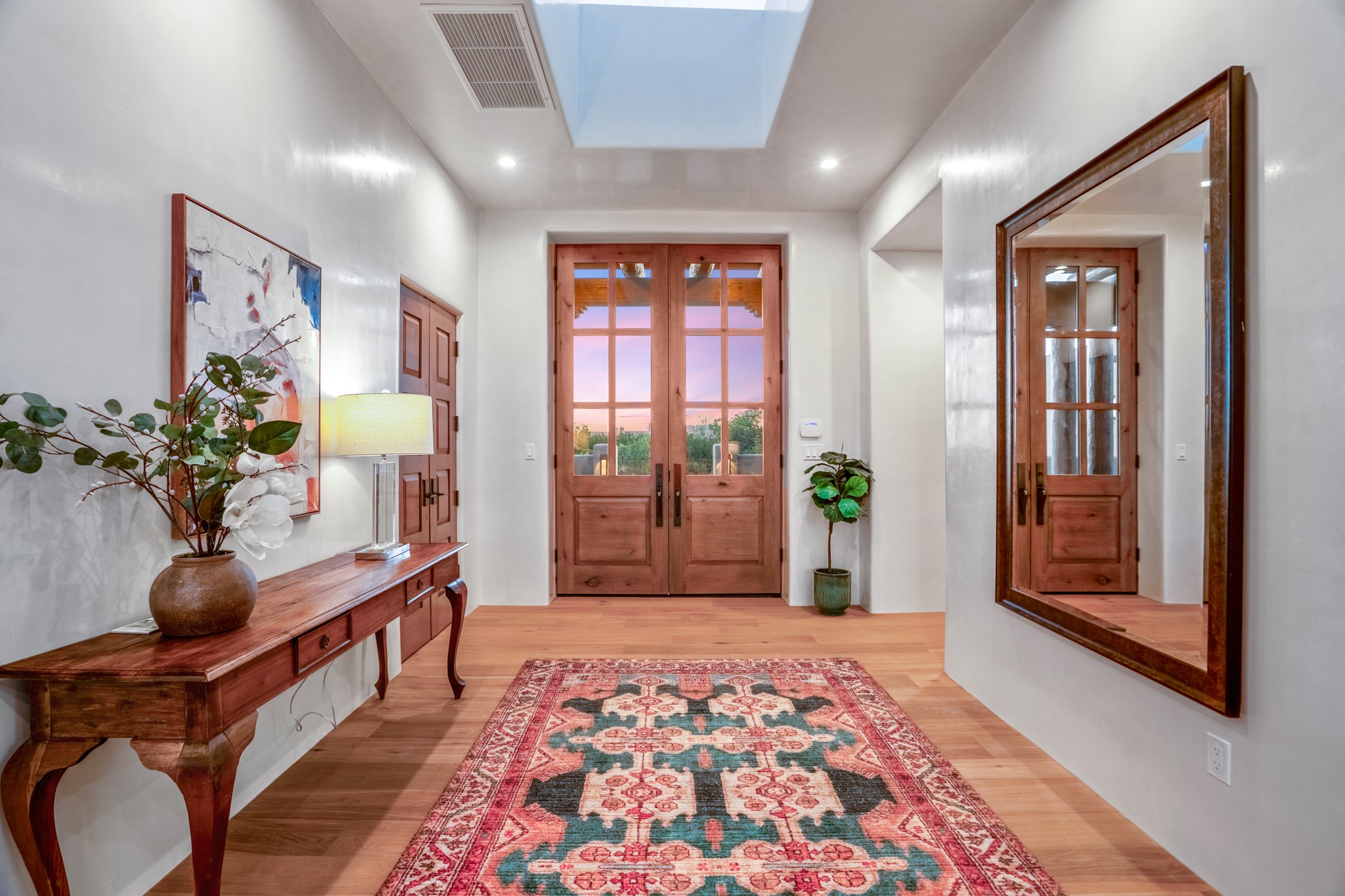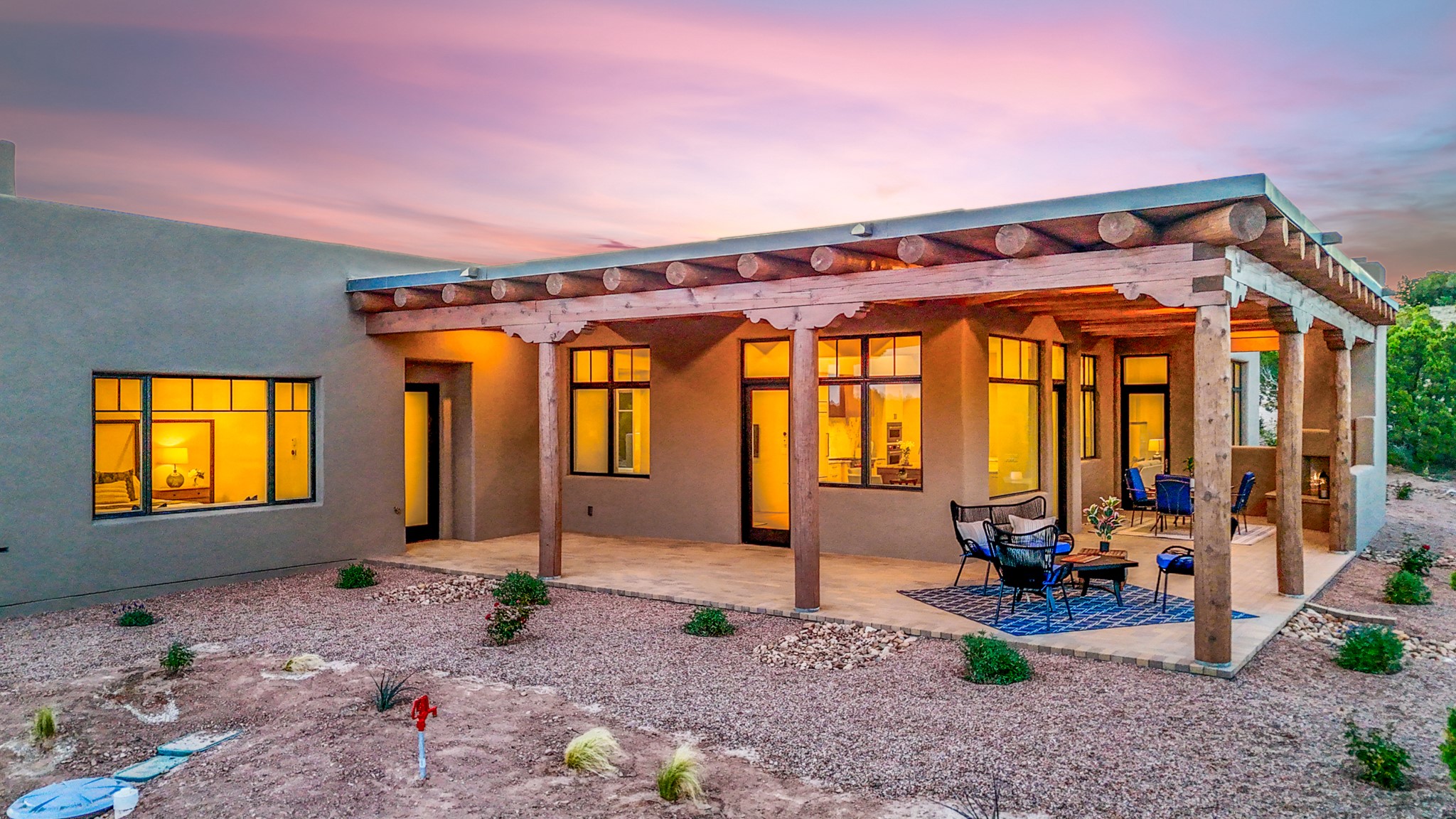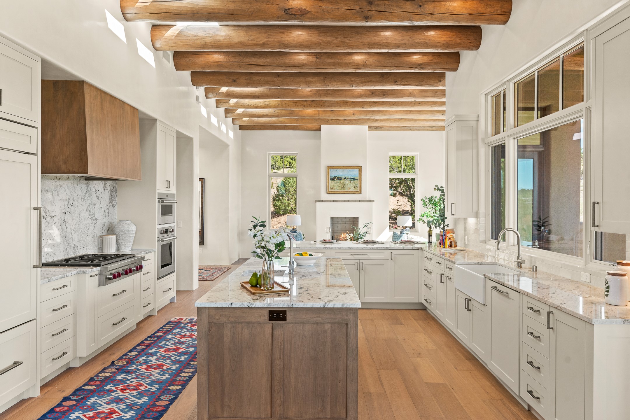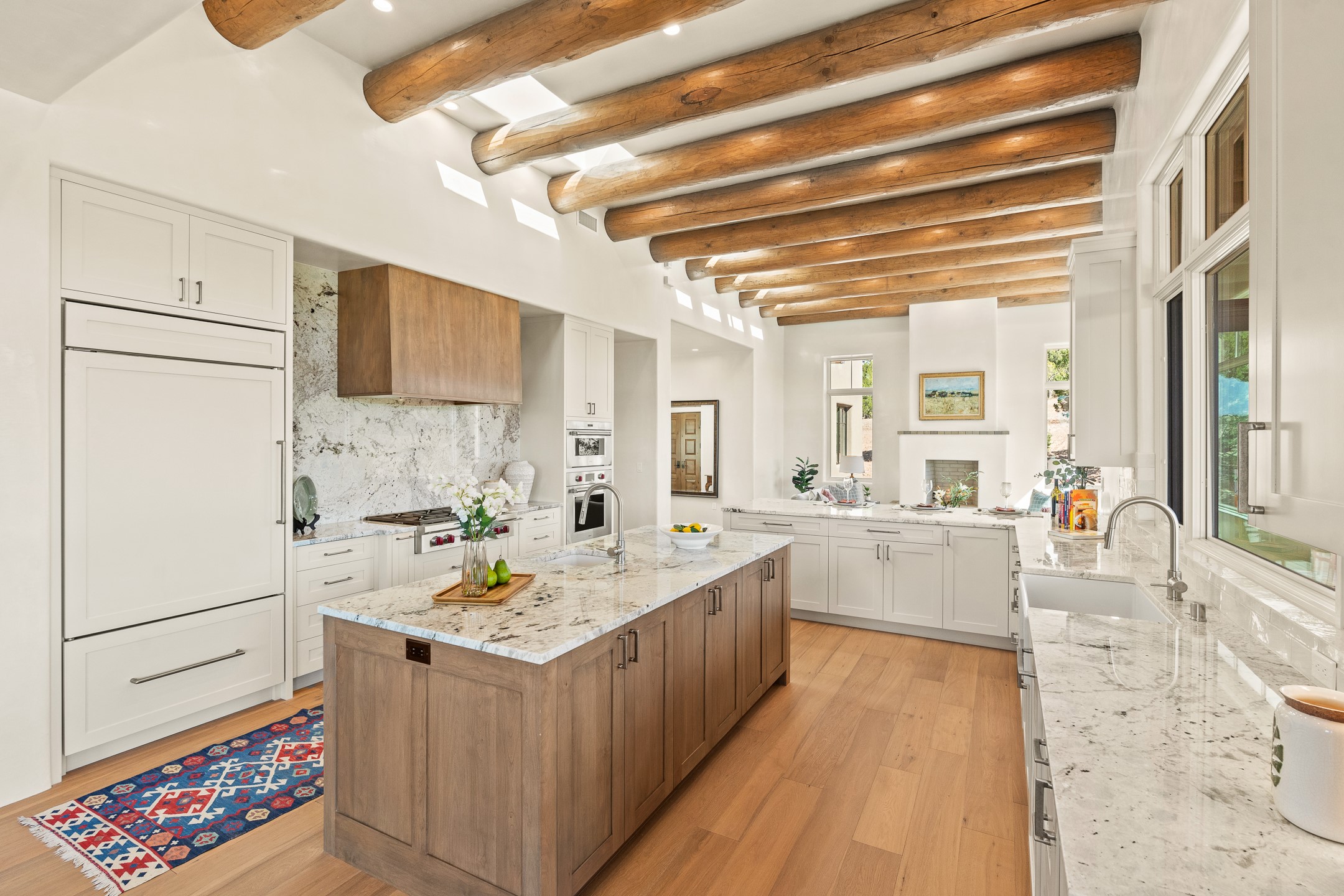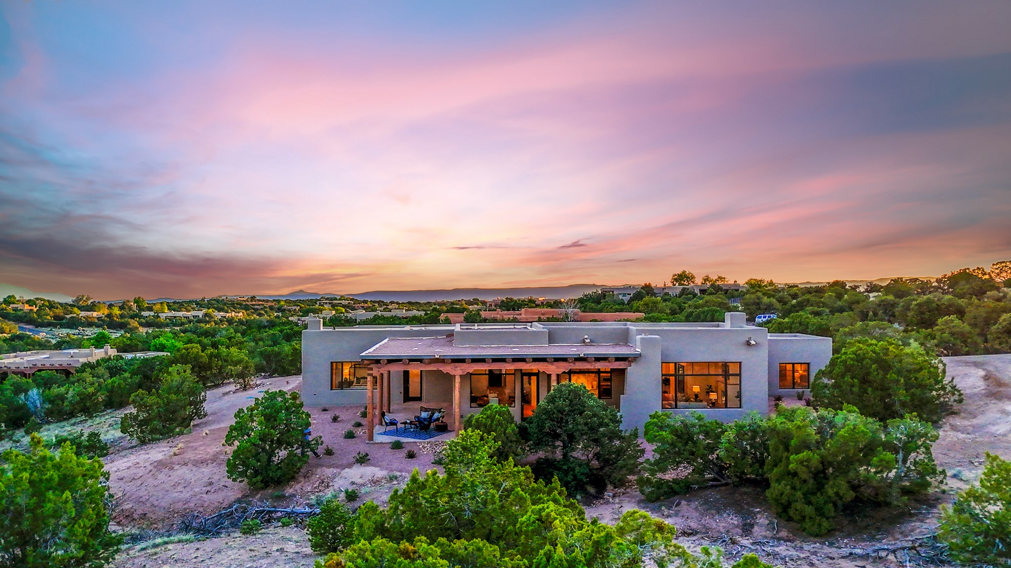 Newly constructed and just 15 minutes from The Plaza, this stunning 3,251 sq. ft. single-level home is bathed in soft natural light and offers sweeping views of the Sangre de Cristo Mountains. From the moment you enter, the sophisticated blend of Southwestern and contemporary architecture is evident, featuring hand-troweled diamond plaster walls, white oak flooring, and striking vigas. Expansive picture windows, accented with divided light transoms, frame dramatic mountain views, bringing Santa Fe's natural light into every room. The kitchen is a natural gathering spot with a generous island and sink for prep and socializing, an eat-in bar for casual dining, a 6-burner Wolf gas cooktop, Subzero appliances, custom cabinetry, and a perfectly positioned sink that captures the mountain vistas. The deep east-facing brick portal, accessible from the living and dining areas, extends the Southwestern experience outdoors with high ceilings, vigas, and a traditional wood-burning kiva fireplace. Tucked in the southeast wing, the private primary suite features a corner gas fireplace and direct access to the rear portal, offering seclusion and views. The ensuite bath includes dual vanities, a deep soaking tub, walk-in shower, and a closet spacious enough for even the most devoted shopper. The large laundry room connects directly to the primary closet for convenience. The guest wing offers two ensuite bedrooms with full bathrooms, designed for visitor comfort and privacy. In-floor radiant heat, forced air heating, central air conditioning, and a spacious 3-car garage add exceptional comfort and value. A special bonus: 6 Sierra Ct is located in Colinas Verdes, a distinct neighborhood with its own HOA within the gates of Las Campanas. Discover a home where elegance, comfort, and the beauty of Santa Fe come together seamlessly--your sanctuary awaits at 6 Sierra Ct.