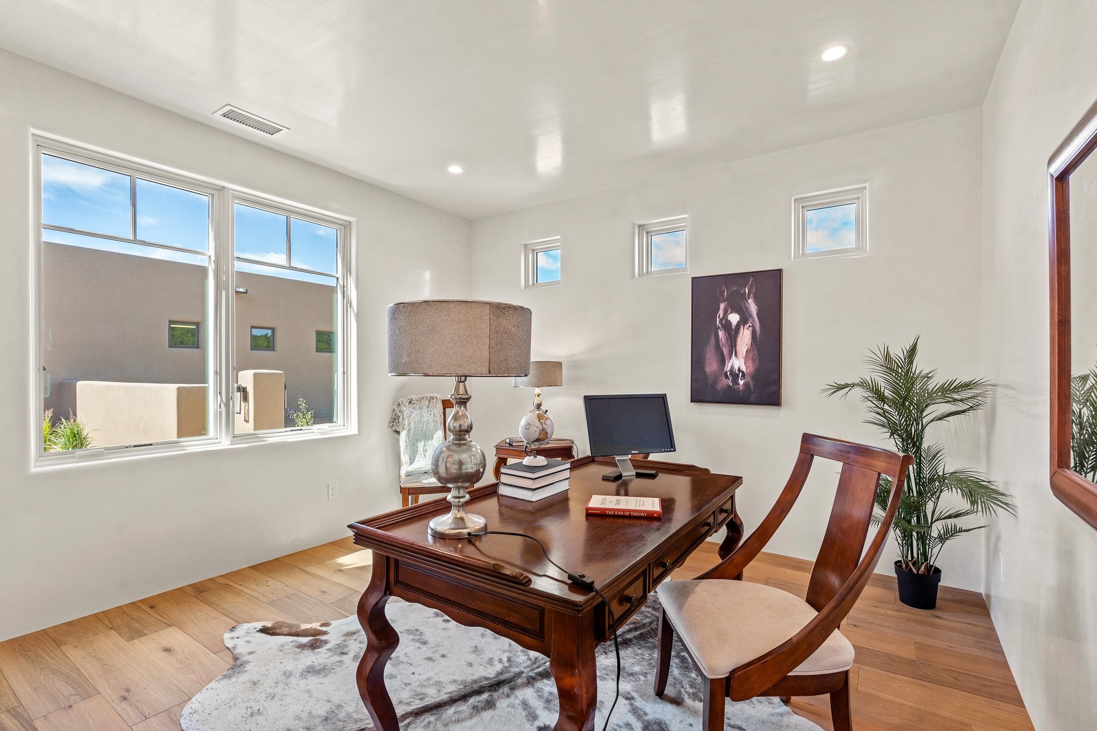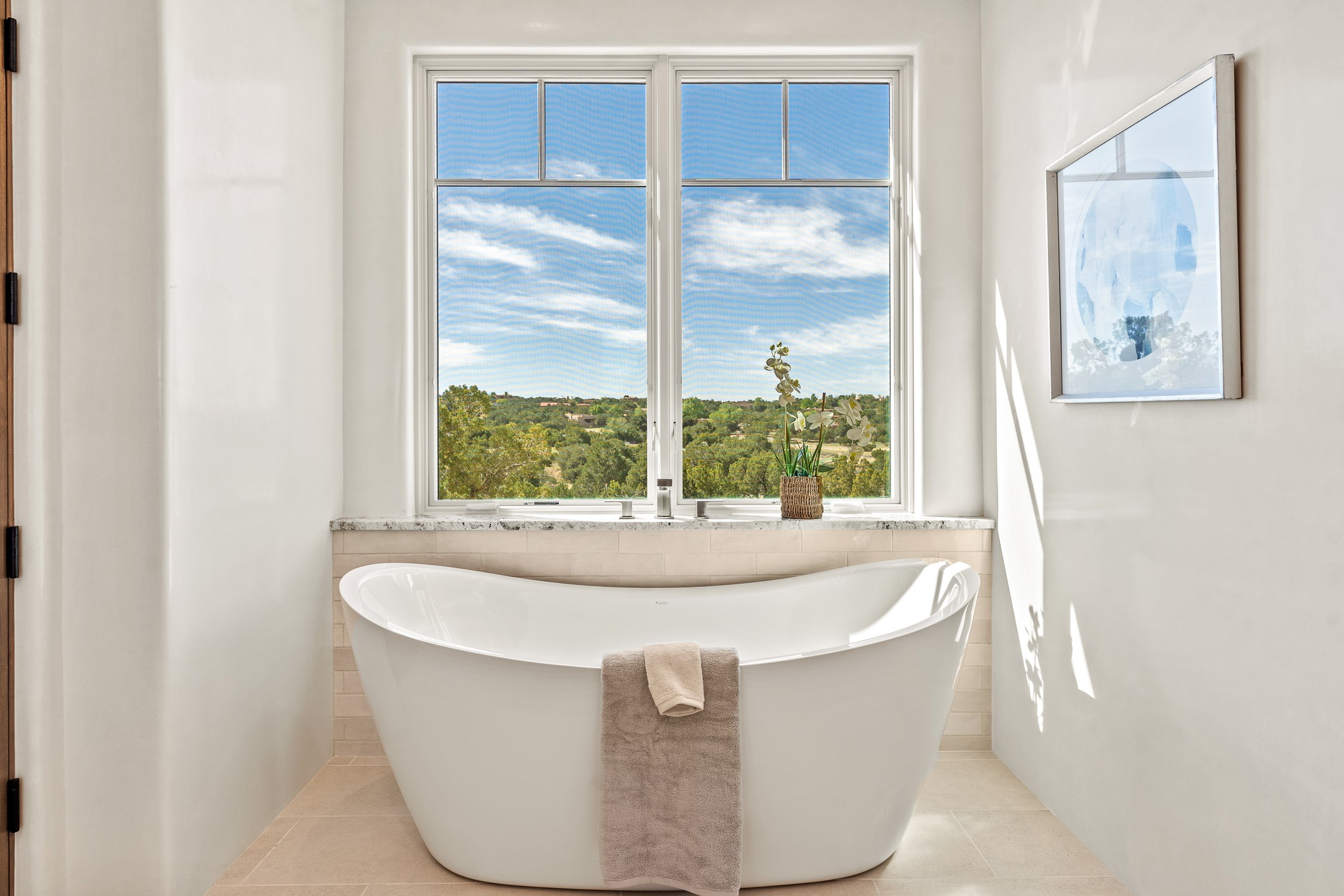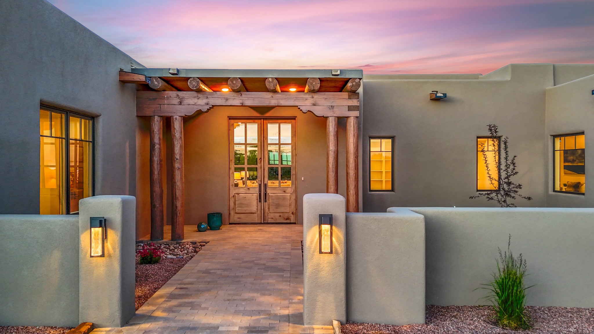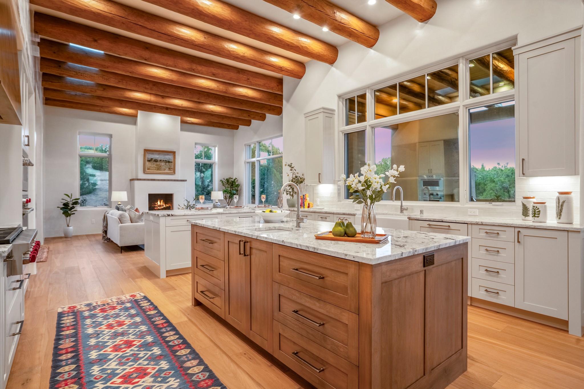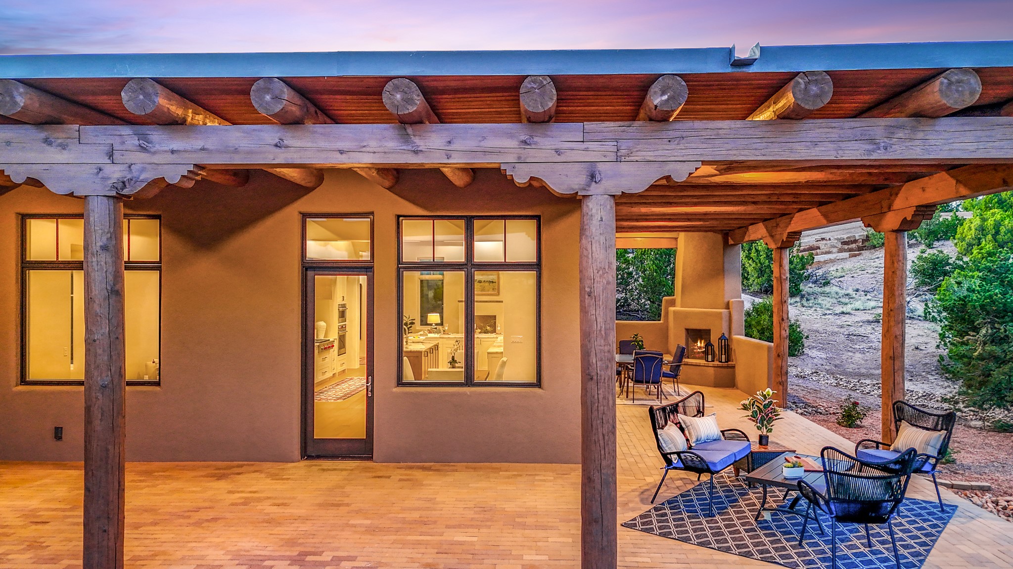 Newly constructed and just 15 minutes from The Plaza, this stunning 3,251 sq. ft. single-level home is bathed in soft natural light and offers sweeping views of the Sangre de Cristo Mountains. From the moment you enter, the sophisticated blend of Southwestern and contemporary architecture is evident, featuring hand-troweled diamond plaster walls, white oak flooring, and striking vigas. Expansive picture windows, accented with divided light transoms, frame dramatic mountain views, bringing Santa Fe's natural light into every room. The kitchen is a natural gathering spot with a generous island and sink for prep and socializing, an eat-in bar for casual dining, a 6-burner Wolf gas cooktop, Subzero appliances, custom cabinetry, and a perfectly positioned sink that captures the mountain vistas. The deep east-facing brick portal, accessible from the living and dining areas, extends the Southwestern experience outdoors with high ceilings, vigas, and a traditional wood-burning kiva fireplace. Tucked in the southeast wing, the private primary suite features a corner gas fireplace and direct access to the rear portal, offering seclusion and views. The ensuite bath includes dual vanities, a deep soaking tub, walk-in shower, and a closet spacious enough for even the most devoted shopper. The large laundry room connects directly to the primary closet for convenience. The guest wing offers two ensuite bedrooms with full bathrooms, designed for visitor comfort and privacy. In-floor radiant heat, forced air heating, central air conditioning, and a spacious 3-car garage add exceptional comfort and value. A special bonus: 6 Sierra Ct is located in Colinas Verdes, a distinct neighborhood with its own HOA within the gates of Las Campanas. Discover a home where elegance, comfort, and the beauty of Santa Fe come together seamlessly--your sanctuary awaits at 6 Sierra Ct.