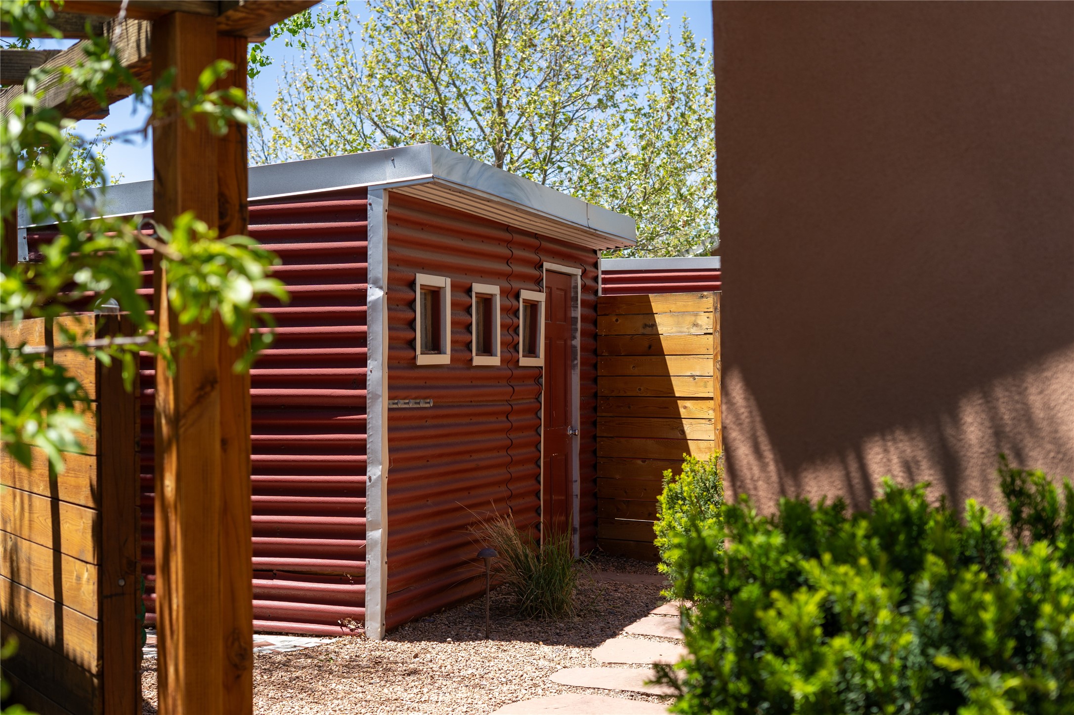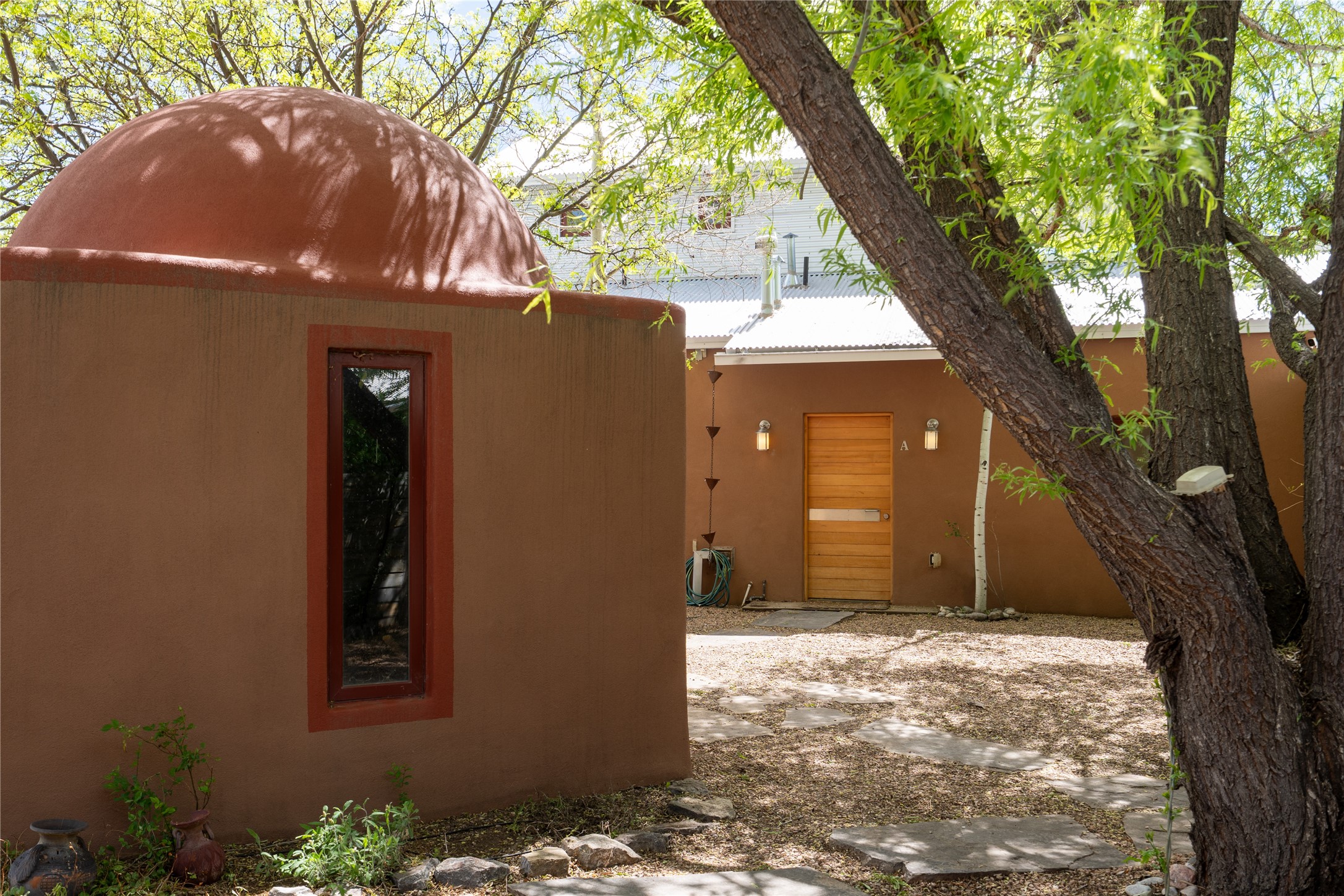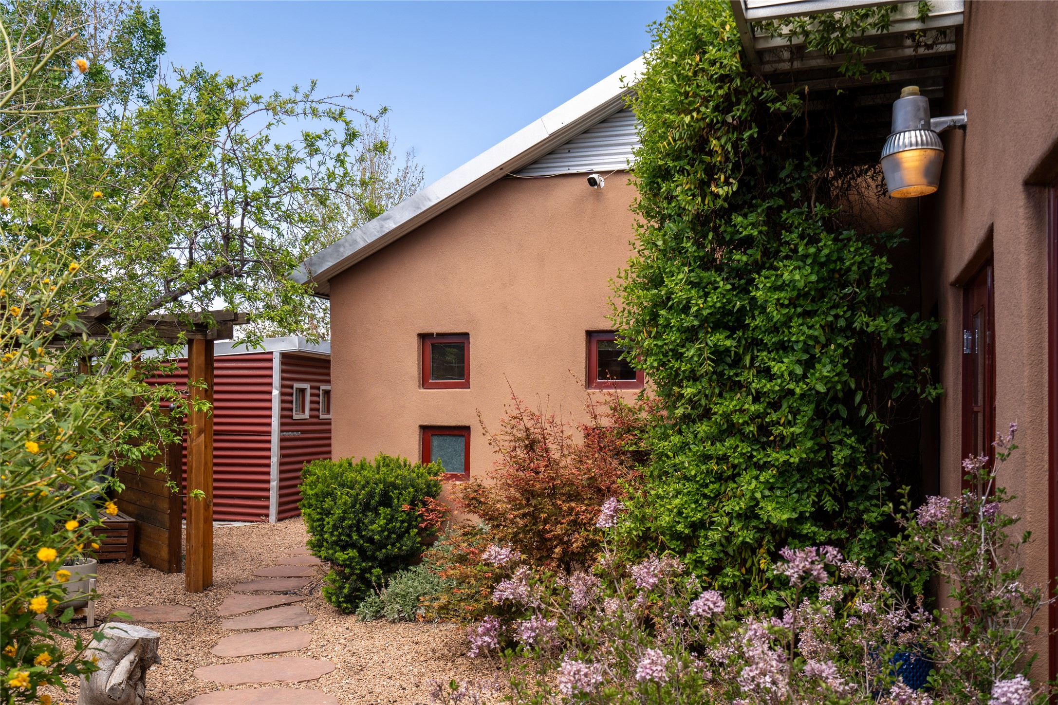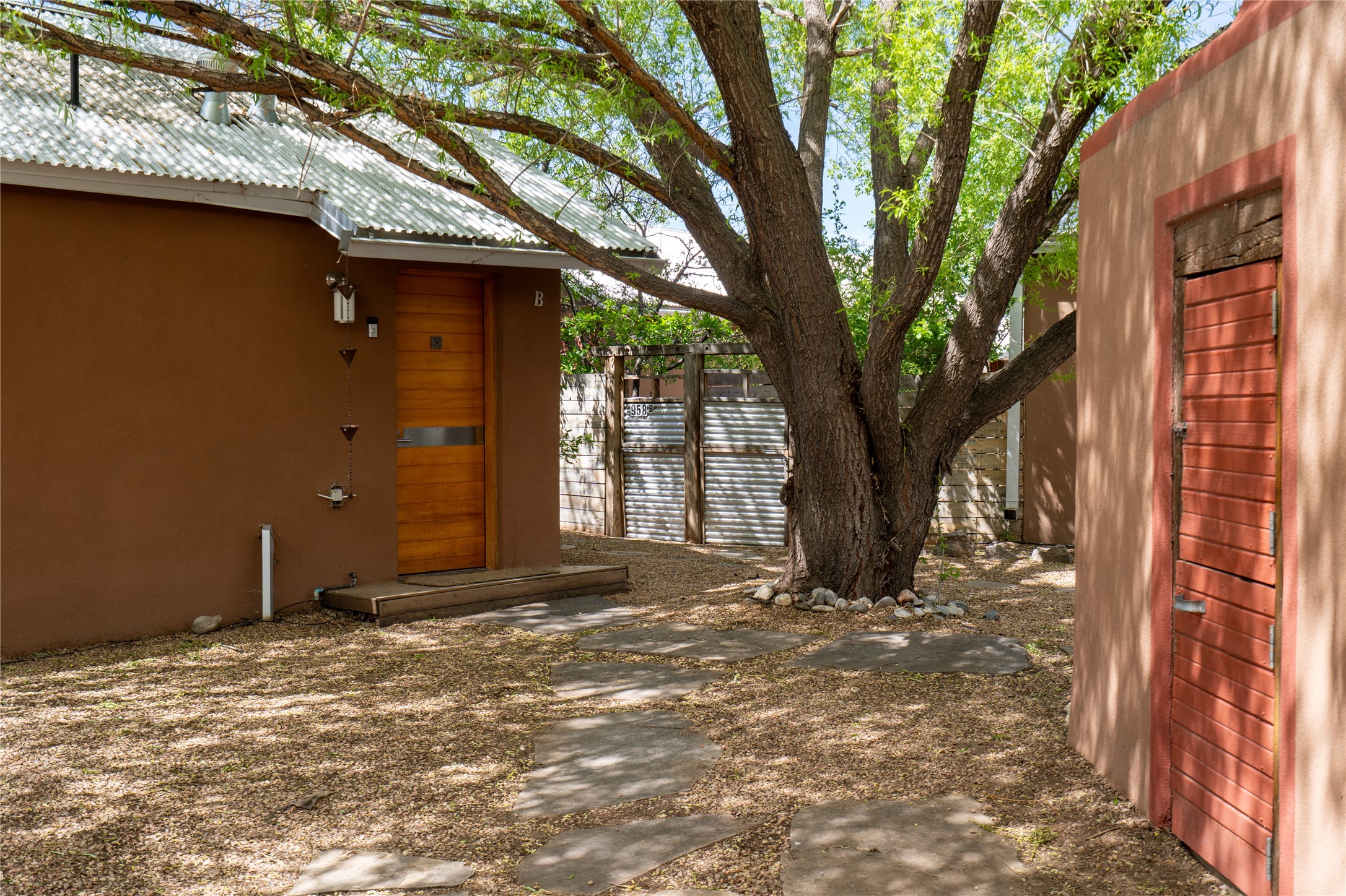 Price Reduced November 4th, and now offering $25,000 in Seller concessions to use toward improvements or apply as needed. Modern Adobe Retreat with Private Casita. Timeless adobe meets modern elegance in this thoughtfully designed 3-bed, 2-bath home. Open and full of light, a full bath, kitchen, open living areas, and two bedrooms are downstairs. The upstairs primary suite offers privacy, views, and a spacious balcony. Inside is serene, with exposed wooden beams, hand troweled clay walls, and in floor radiant heat.A separate 1-bed casita, complete with private entrance, open kitchen-living space, dedicated office, and private yard space will be inviting for your guests, income, or multigenerational living.Outside, mature landscaping frames every view. Dual pet doors offer ease and freedom. A domed adobe storage structure out front and a generous garden shed in the back blend with a pergola-shaded BBQ area to complement the intelligent, inviting layout. A visual palate of earth, wood, metals and light awaits.Private. Flexible. Ready to live in--or to earn.