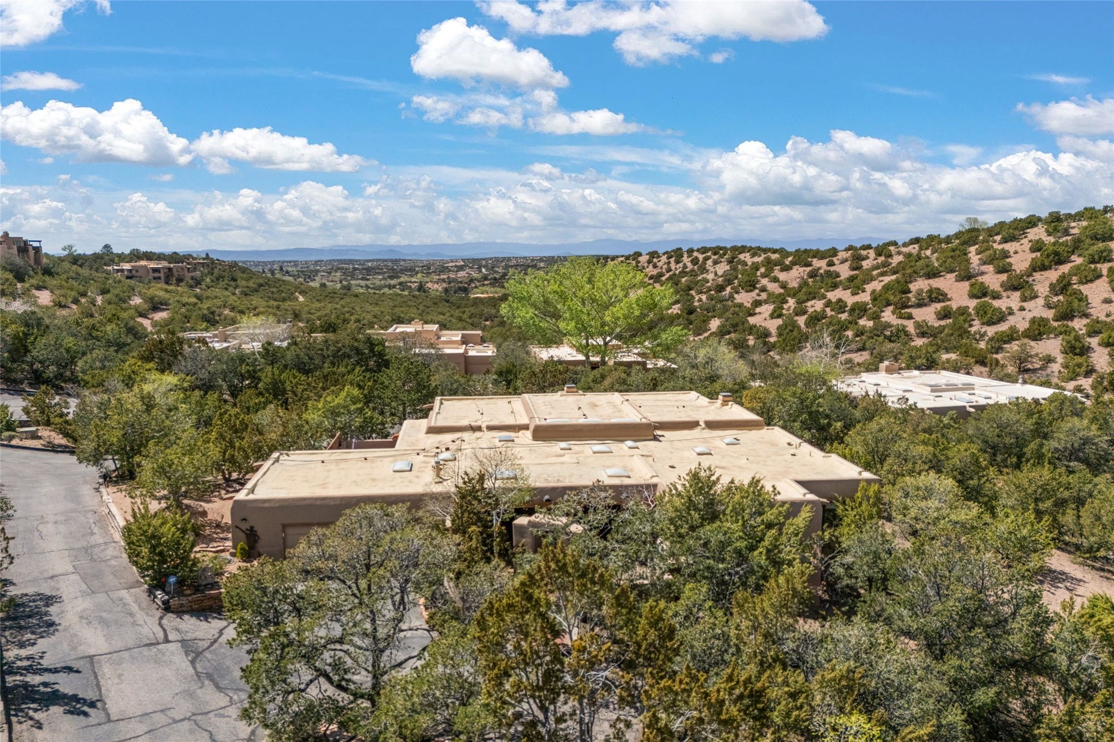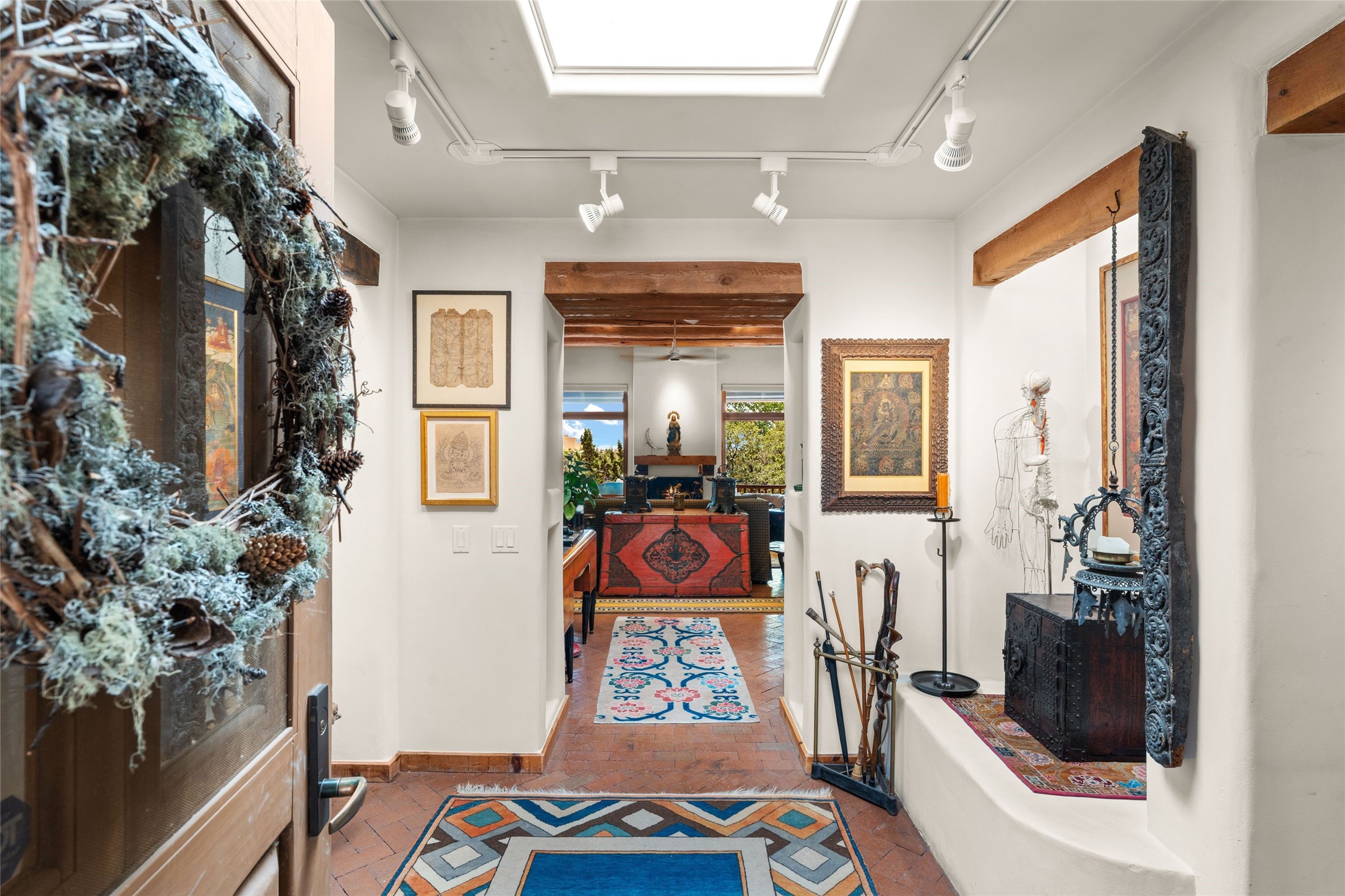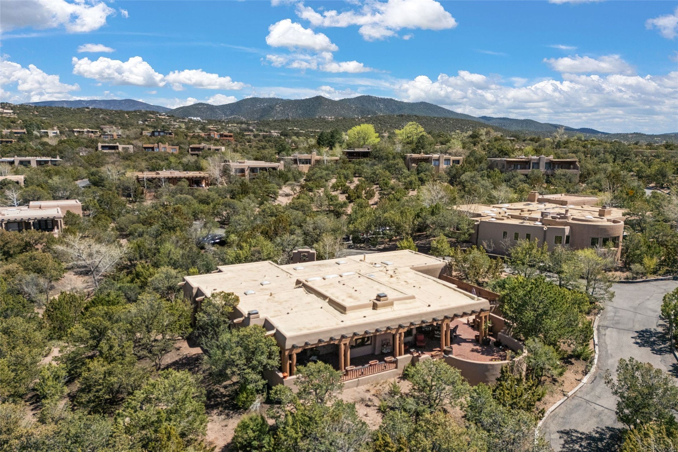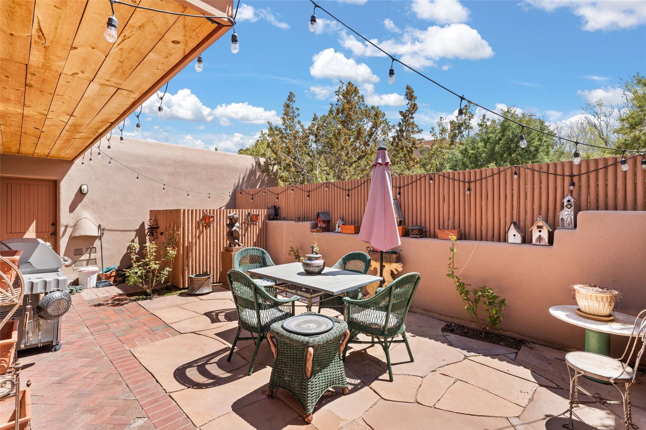 Delightful 3-bedroom, 3-bath condo located in a private setting in the sought-after gated community of 1000 East. This single-level residence offers the convenience of no interior steps, making it accessible and easy to navigate. The interior is an art collector's dream, complete with gallery track lighting throughout to beautifully showcase your favorite pieces. The gourmet kitchen, fully updated 2.5 years ago, features elegant glass front cabinets, a KitchenAid 6-burner stove/oven, and a second oven, making it perfect for both everyday meals and special gatherings. The spacious primary bedroom is a cozy retreat, complete with a gas fireplace and a private walk-out to the beckoning back patio/portal. The recently remodeled bath features a jetted tub and a separate walk-in closet for added benefit and luxury. The front entry courtyard and covered portal provide lovely outdoor spaces for relaxation, while the back courtyard wraps around the side of the house, offering additional room for outdoor enjoyment. Designed for privacy, the property features a private wall and coyote fence, along with a recirculating fountain and a grill connected to natural gas--ideal for entertaining or unwinding in your own oasis. With a 2-car garage and an EV charger, you'll enjoy modern amenities that cater to your lifestyle. Ideally located close to downtown Santa Fe, you'll have easy access to the vibrant culture, art, and dining the city has to offer.