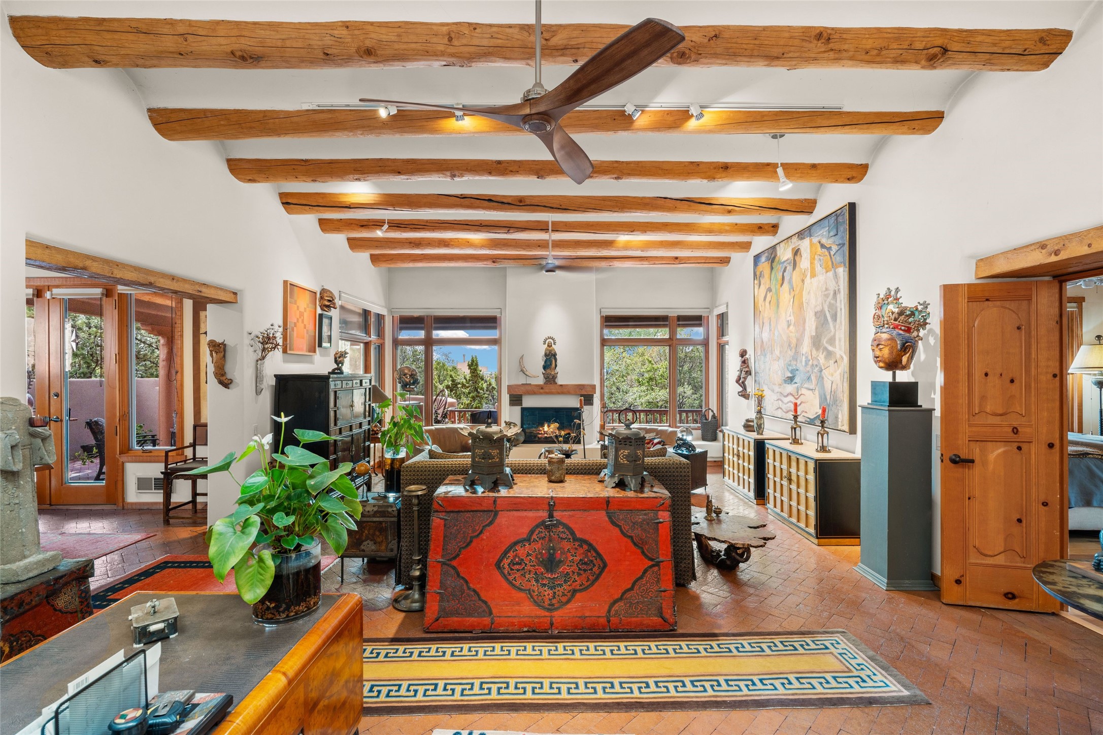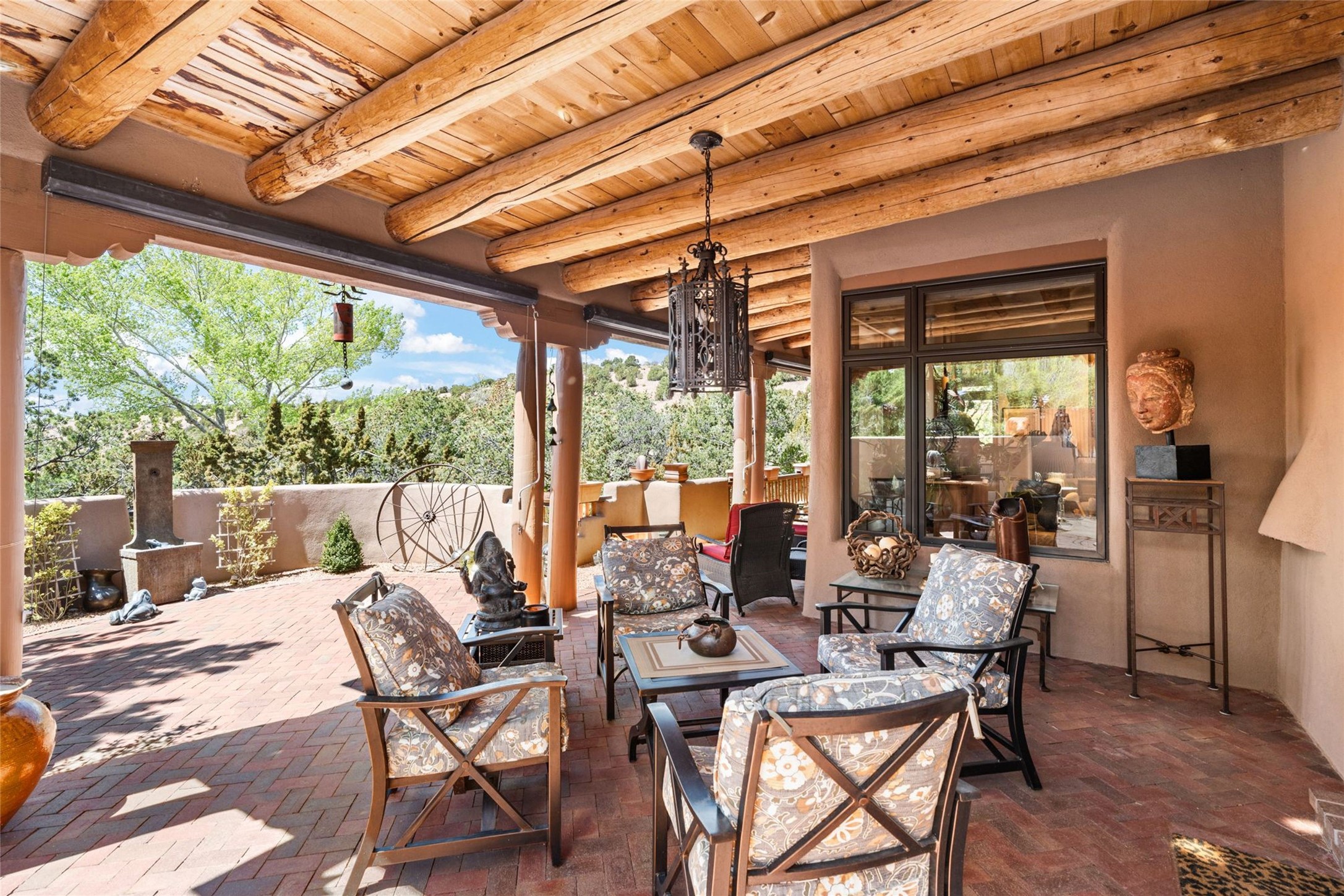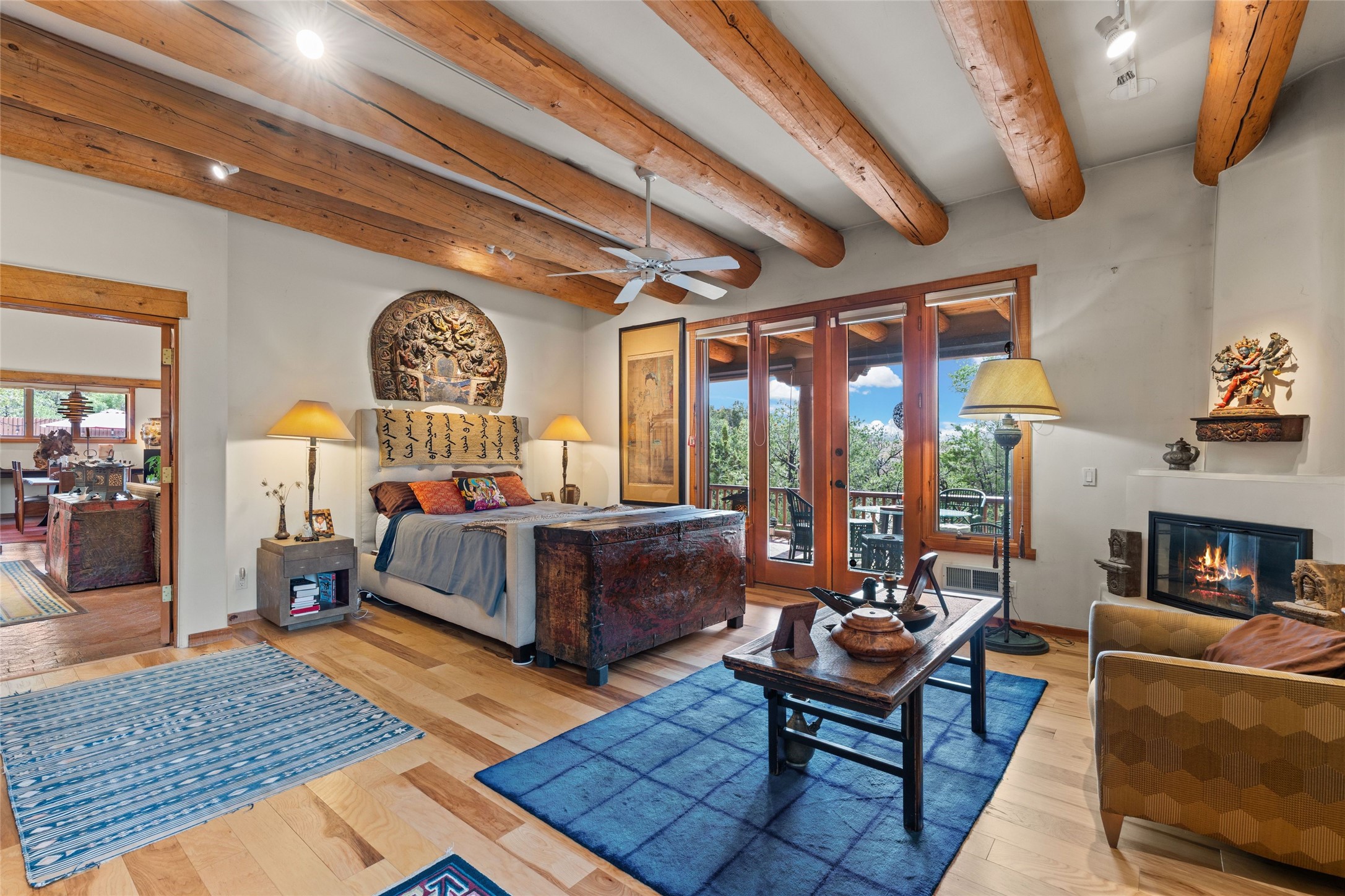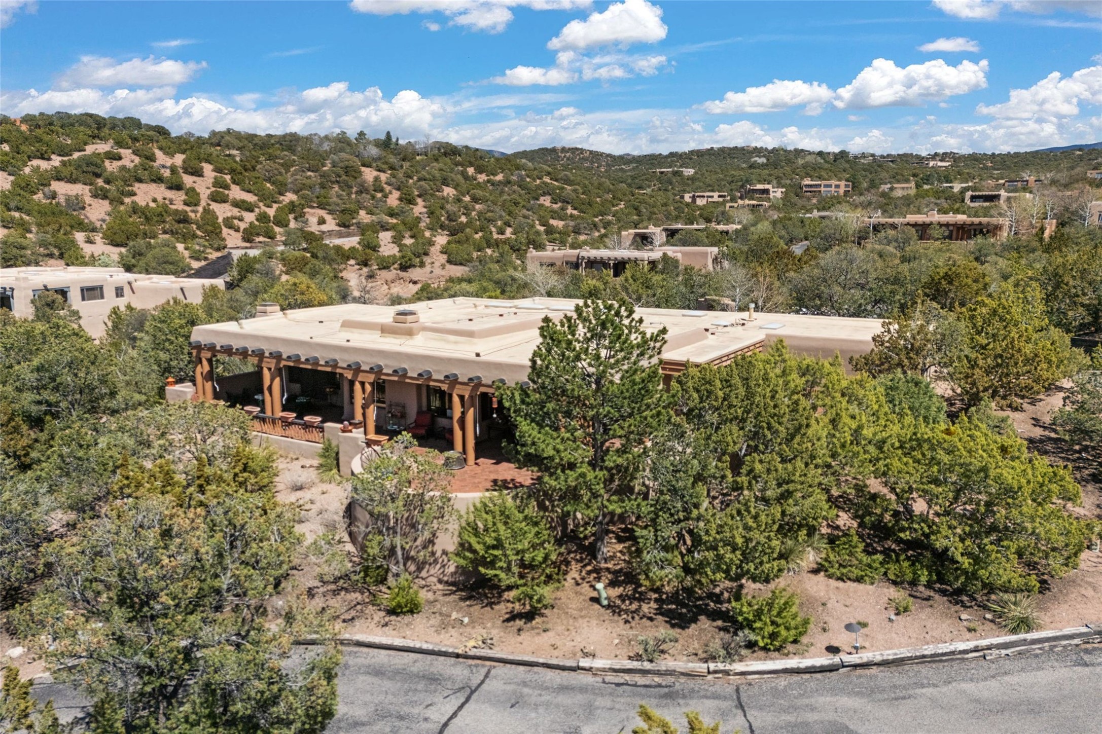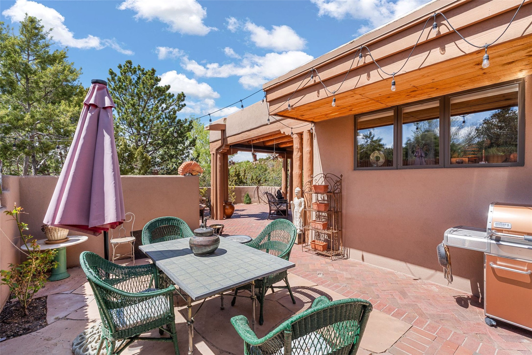 Delightful 3-bedroom, 3-bath condo located in a private setting in the sought-after gated community of 1000 East. This single-level residence offers the convenience of no interior steps, making it accessible and easy to navigate. The interior is an art collector's dream, complete with gallery track lighting throughout to beautifully showcase your favorite pieces. The gourmet kitchen, fully updated 2.5 years ago, features elegant glass front cabinets, a KitchenAid 6-burner stove/oven, and a second oven, making it perfect for both everyday meals and special gatherings. The spacious primary bedroom is a cozy retreat, complete with a gas fireplace and a private walk-out to the beckoning back patio/portal. The recently remodeled bath features a jetted tub and a separate walk-in closet for added benefit and luxury. The front entry courtyard and covered portal provide lovely outdoor spaces for relaxation, while the back courtyard wraps around the side of the house, offering additional room for outdoor enjoyment. Designed for privacy, the property features a private wall and coyote fence, along with a recirculating fountain and a grill connected to natural gas--ideal for entertaining or unwinding in your own oasis. With a 2-car garage and an EV charger, you'll enjoy modern amenities that cater to your lifestyle. Ideally located close to downtown Santa Fe, you'll have easy access to the vibrant culture, art, and dining the city has to offer.