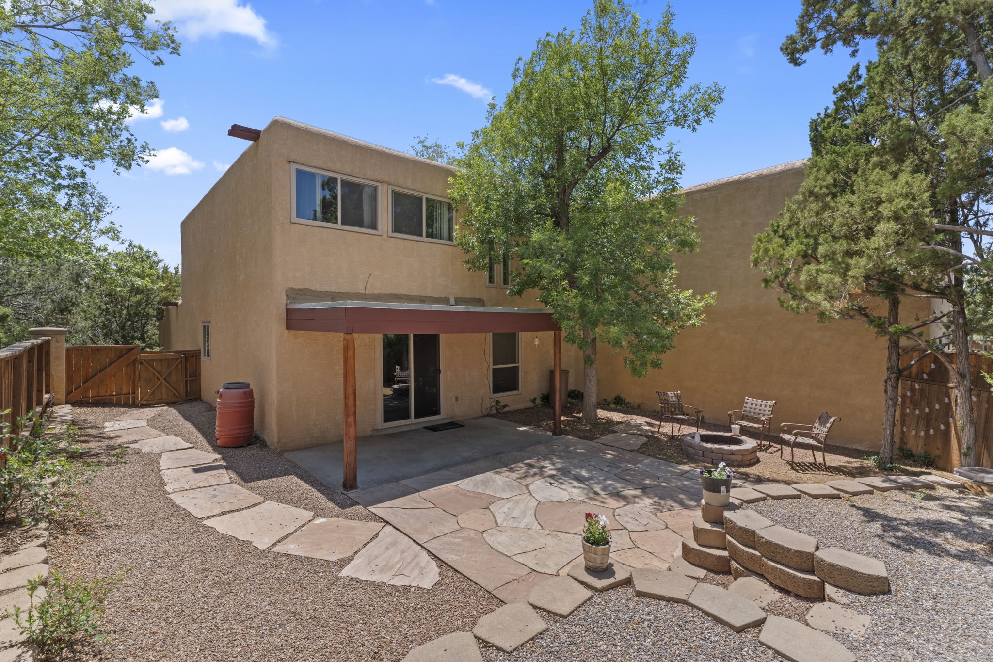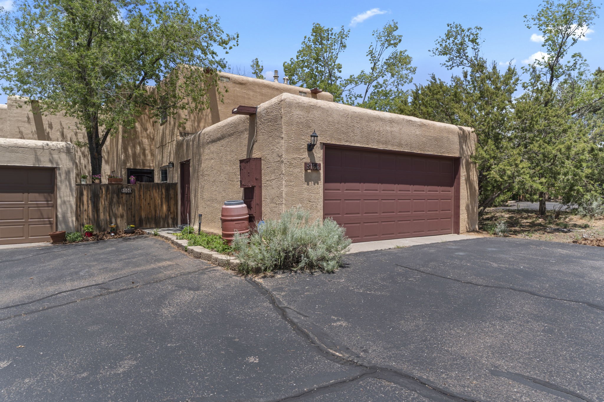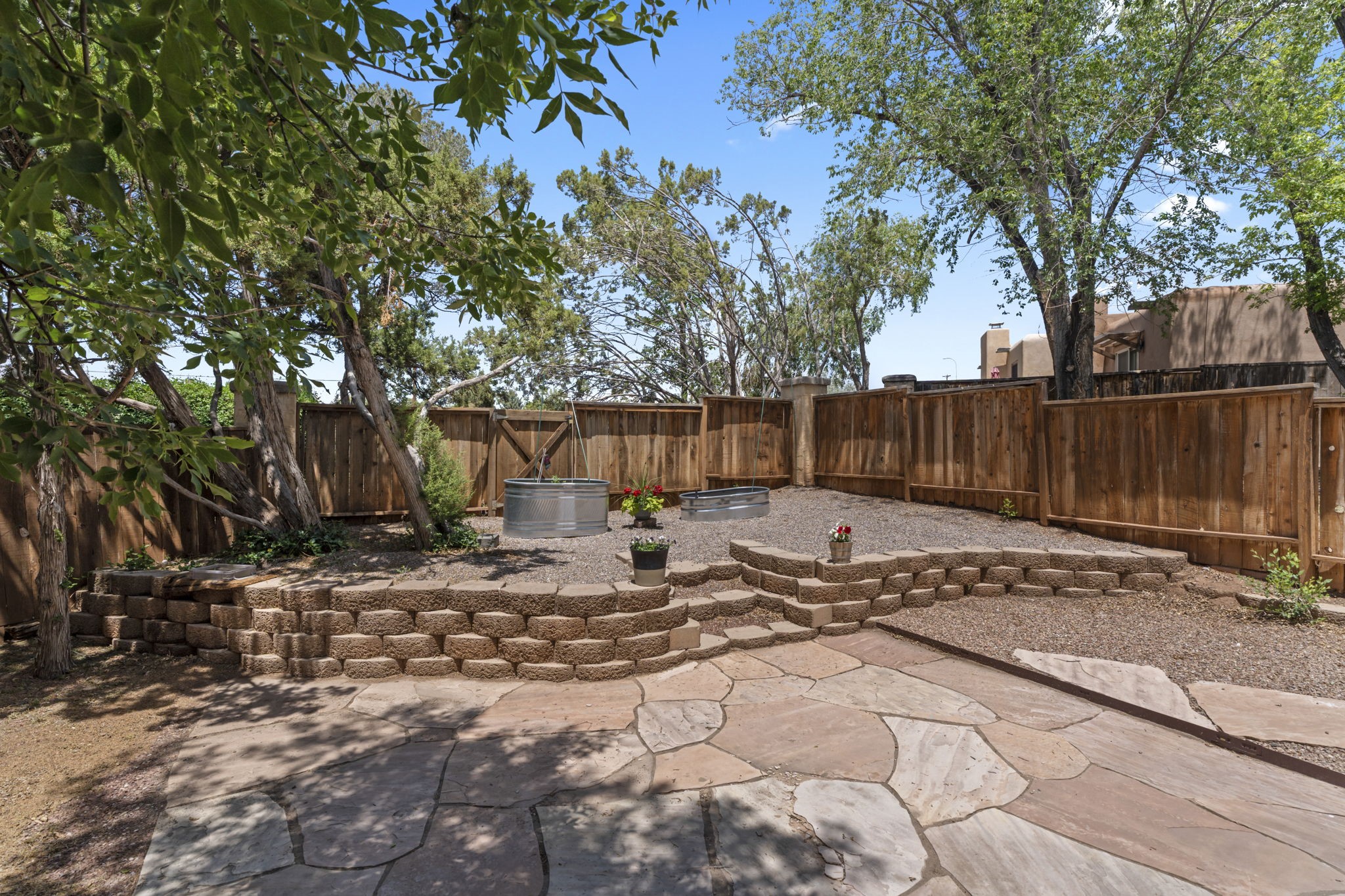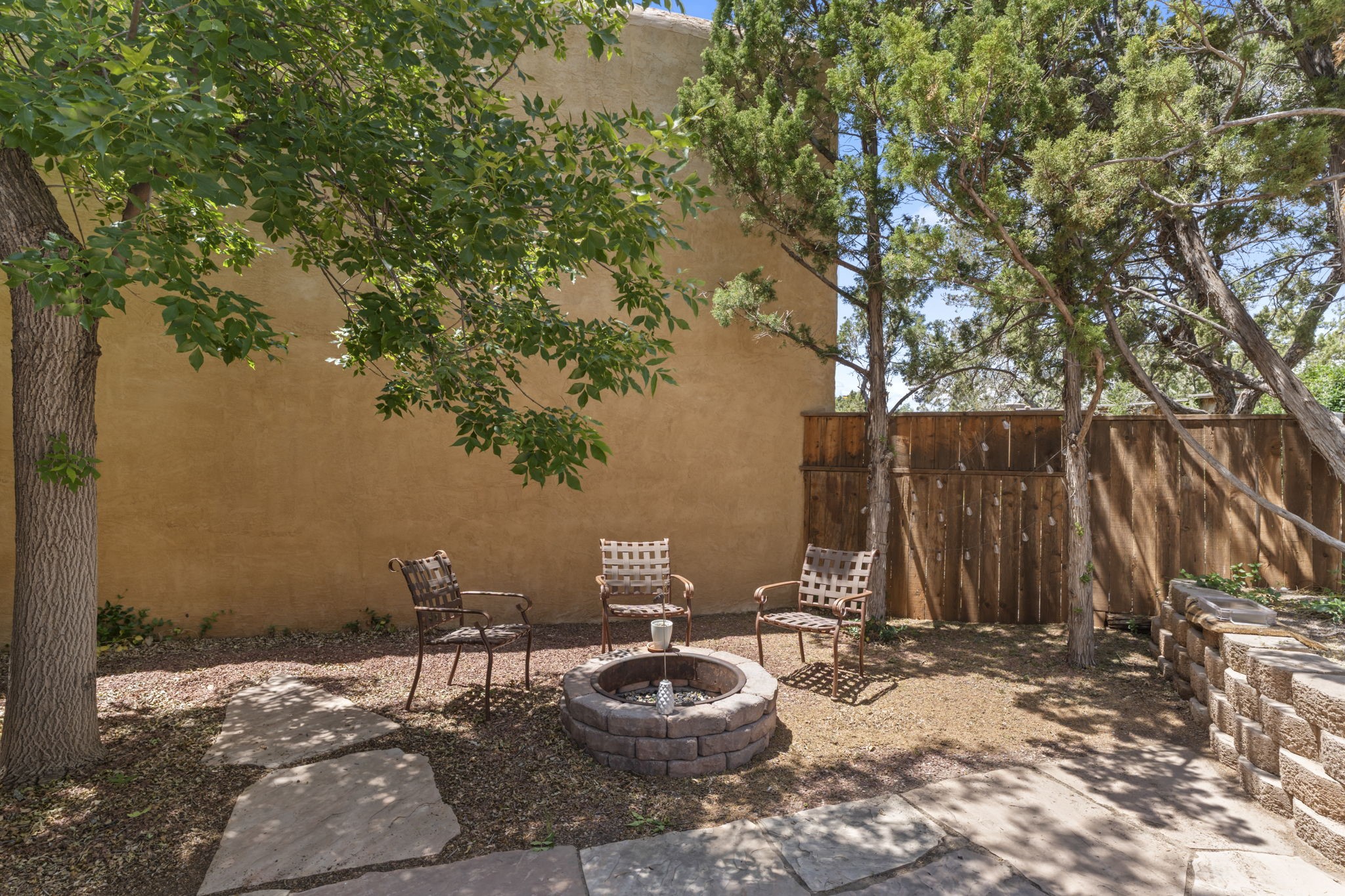 Welcome to this beautifully updated two-story townhouse nestled in the highly sought-after Park Plazas community--where convenience meets comfort and charm. This 3-bedroom, 1.5-bath home features a 2-car garage with a brand-new garage door, all in a neighborhood known for its extensive walking trails, off-leash dog park, tennis and pickleball courts, RV storage, and well-managed HOA.Step inside to a dramatic living room with two-story high ceilings, rich architectural detail, and a cozy corner Kiva-style wood-burning fireplace. The adjoining dining area and living room showcase newer 18" tile flooring and open seamlessly to a fully enclosed, professionally landscaped backyard. Enjoy crisp Santa Fe evenings around the built-in firepit--your own private oasis for entertaining or relaxing.The kitchen is a dream with all-new appliances, Corian countertops, and an eye-catching tile backsplash. A separate laundry room off the kitchen offers abundant shelving and a newer washer. The downstairs bedroom and powder room offer flexibility for guests or a home office.Upstairs, two sunlit bedrooms feature new engineered wood floors and share a stylish Jack and Jill bathroom adorned with colorful Talavera tile accents. Thoughtful upgrades throughout include newer light fixtures, windows, a 2023 water heater, and recently new furnace and refrigerated A/C.With exceptional interior character, practical updates, and access to a vibrant community filled with amenities, this Park Plazas gem is truly a rare find. Don't miss your chance to own a move-in-ready home in one of Santa Fe's most livable neighborhoods!