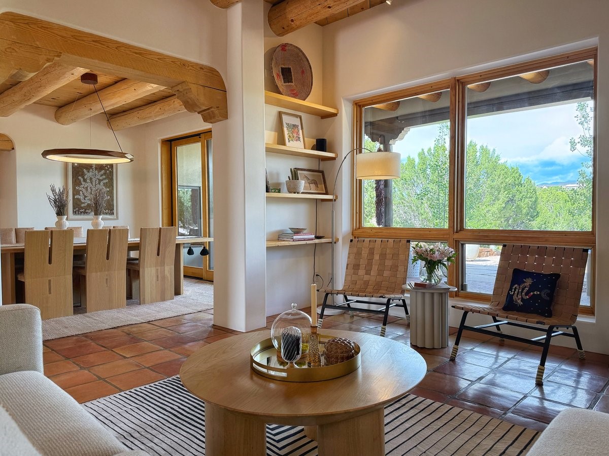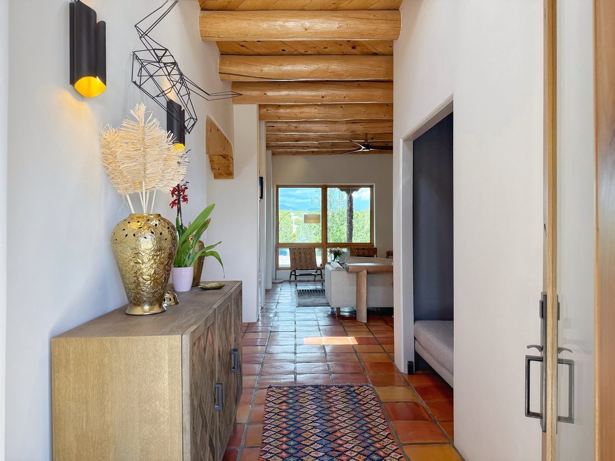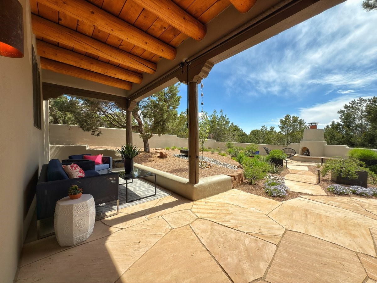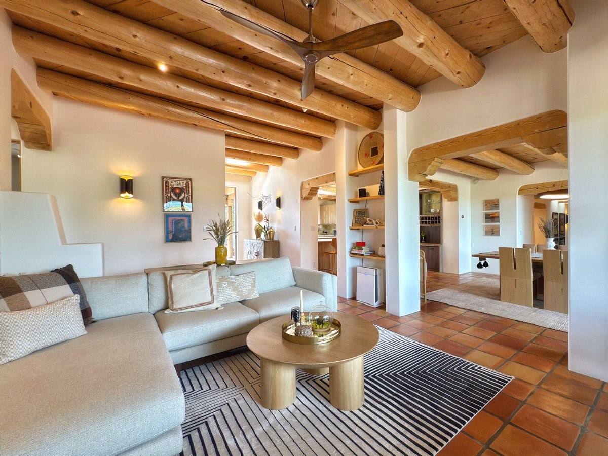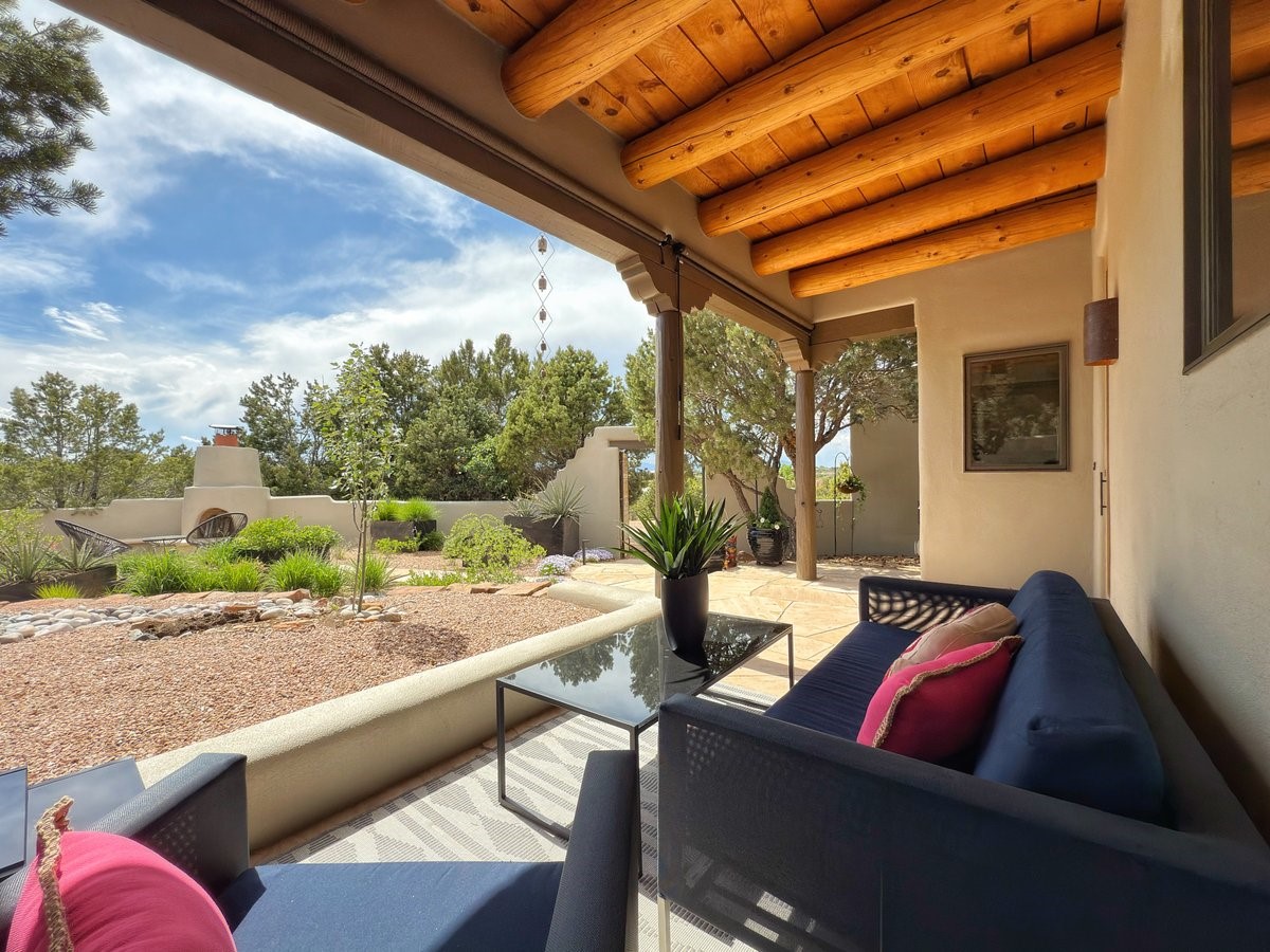 Perched on 2.5 serene acres with sweeping views of both the Jemez and Sangre de Cristo mountains, this 4-bedroom, 2-bath beauty brings together the best of Santa Fe style and mid-century design. From the moment you enter the front courtyard--complete with a kiva fireplace and peaceful water feature--you'll feel like you've stepped into your own private retreat where mid-century hip meets Santa Fe soul.Inside, traditional elements like hand-adzed vigas, saltillo tile floors, and two cozy kiva fireplaces (one in the living room, one in the primary suite) provide that authentic Santa Fe warmth. But the heart of the home? It's the spectacular, magazine-featured kitchen. Thoughtfully remodeled by DMC Fine Cabinetry & Renovations and builder Eric Smith, this space has been showcased in Santa Fe Magazine, TREND, and more--and it shows. It's sleek, modern, and expertly designed for everyday ease and entertaining alike.The bathrooms are just as impressive--completely reimagined with a hip, contemporary flair that perfectly complements the home's classic style. The sellers had planned to stay here forever and invested accordingly--making this a rare opportunity for a new buyer to enjoy high-end updates without the wait or cost.The outdoor living is just as magical as the interior, with xeriscaped landscaping, a fully fenced backyard, and deep portals for relaxing, dining, or watching the mountains glow at sunset. Of course, there's a 2-car garage, because that's just what you'd expect from a home this perfect.With new windows, and recent stucco maintenance, as well as a frequently maintained roof, this is a home where every detail has been loved and it shows.Furniture and spa package negotiable.