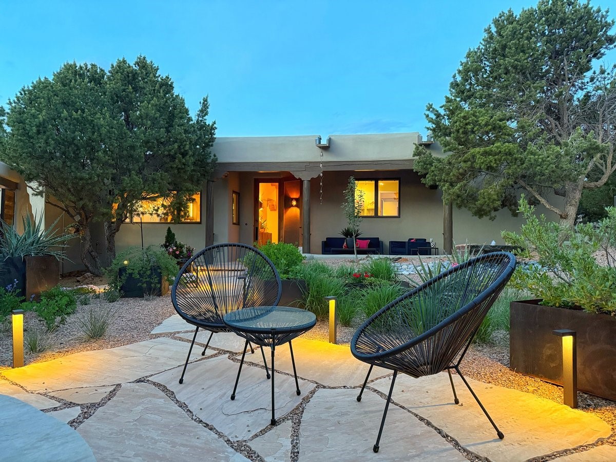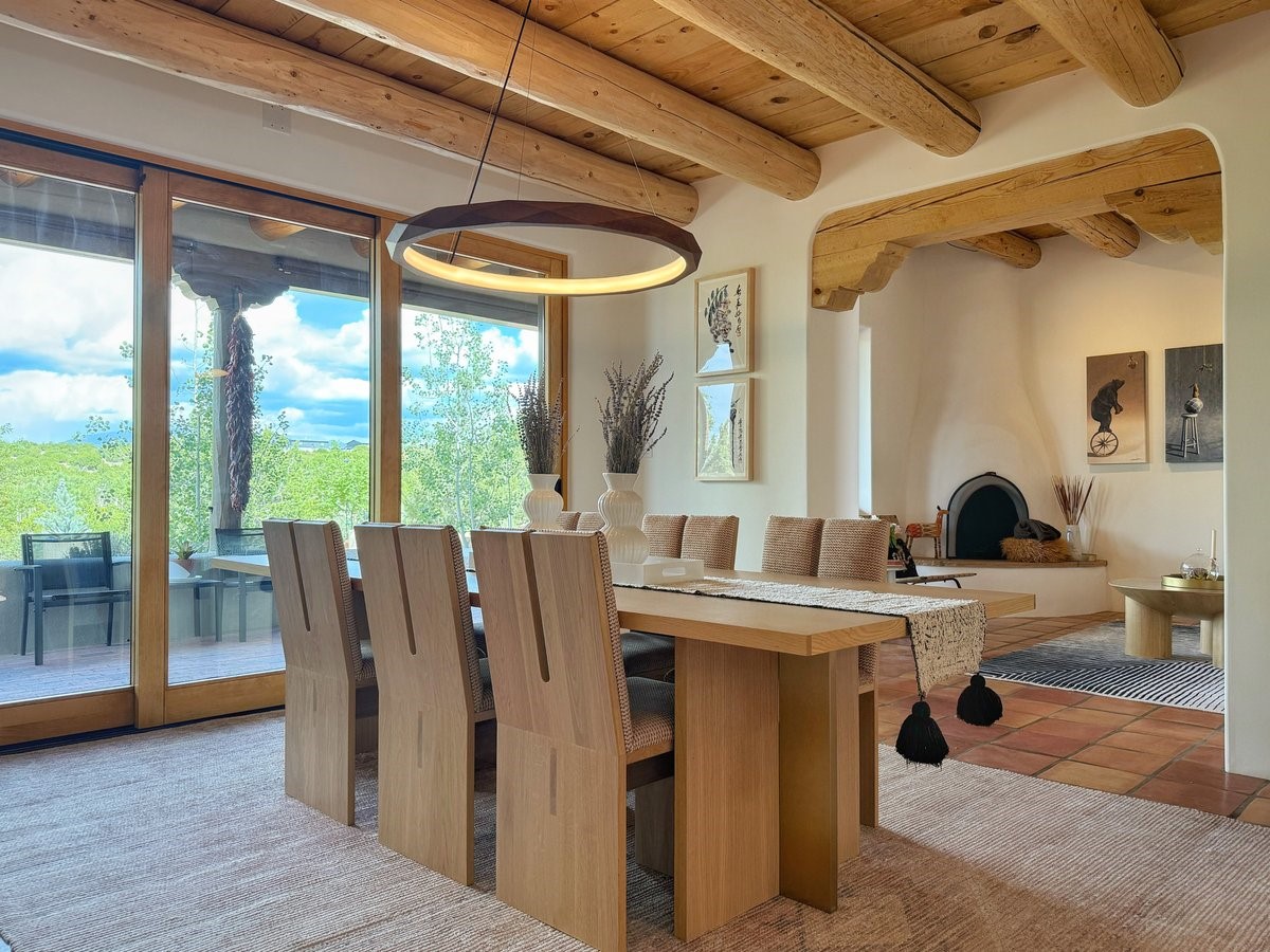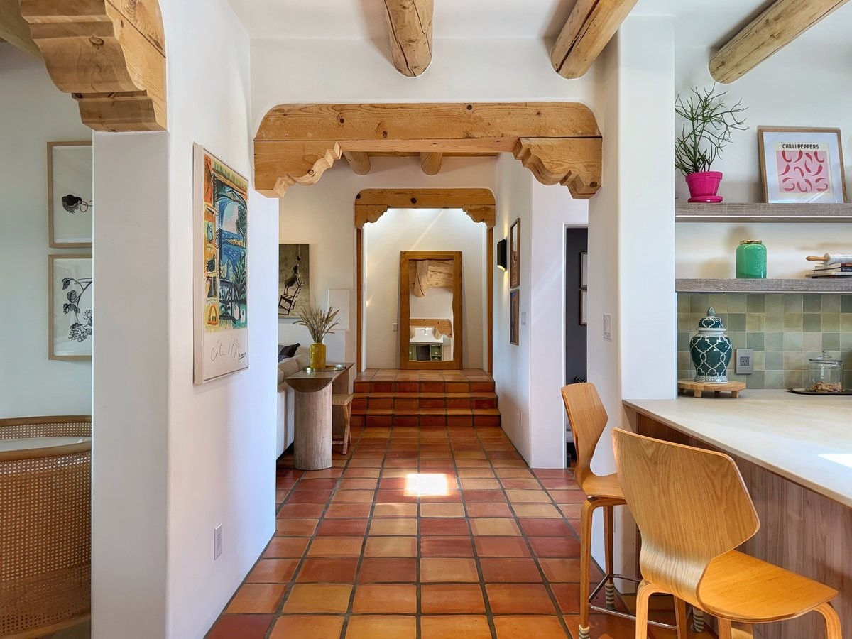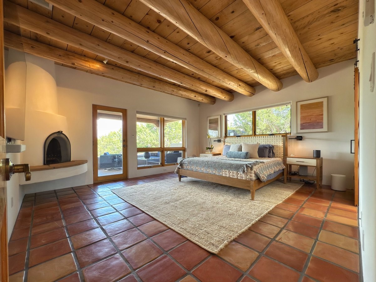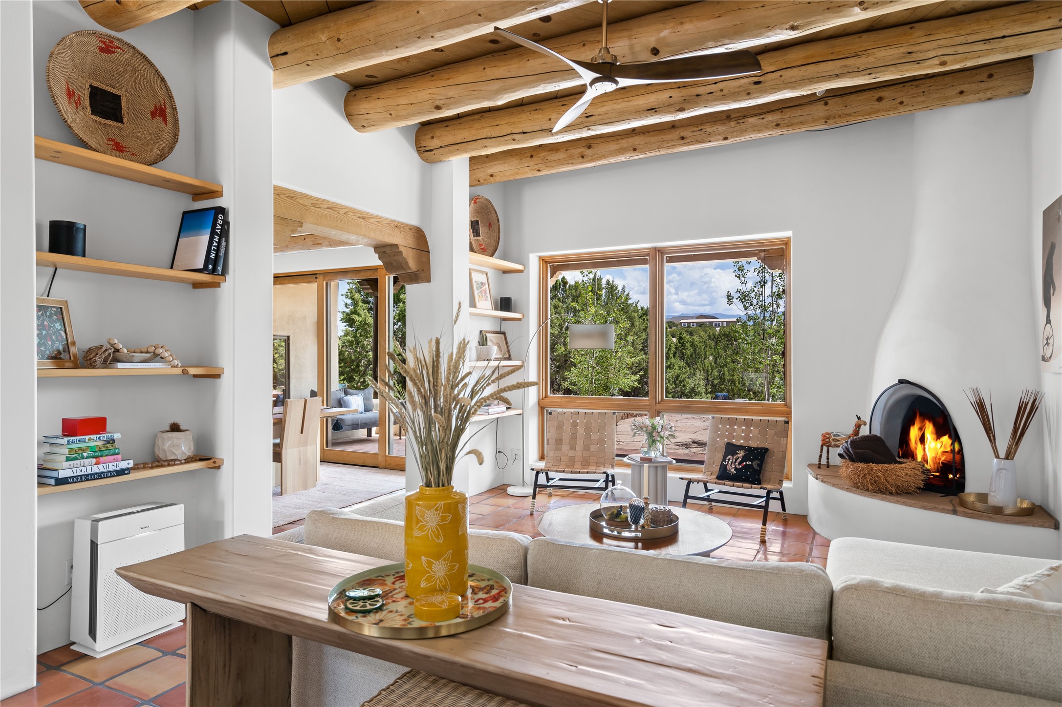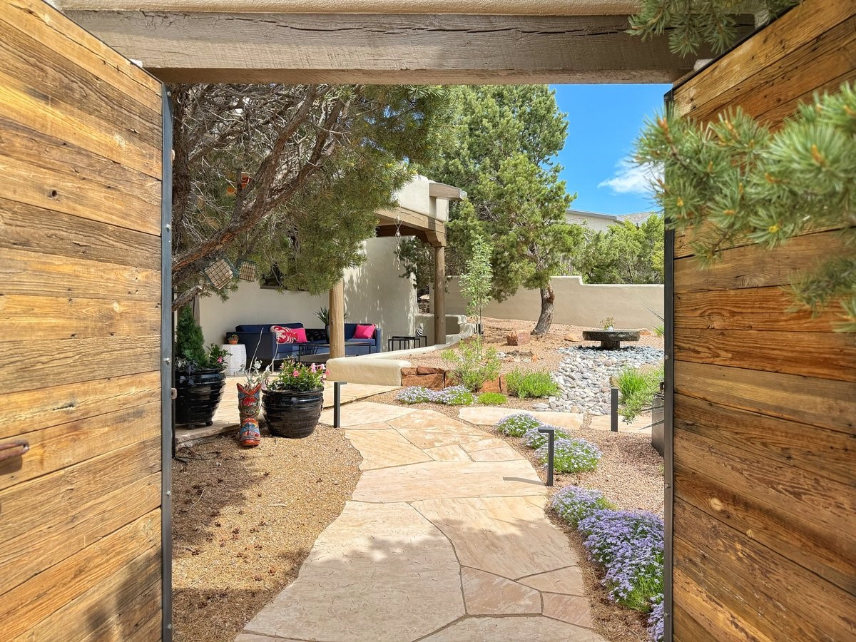 Perched on 2.5 serene acres with sweeping views of both the Jemez and Sangre de Cristo mountains, this 4-bedroom, 2-bath beauty brings together the best of Santa Fe style and mid-century design. From the moment you enter the front courtyard--complete with a kiva fireplace and peaceful water feature--you'll feel like you've stepped into your own private retreat where mid-century hip meets Santa Fe soul.Inside, traditional elements like hand-adzed vigas, saltillo tile floors, and two cozy kiva fireplaces (one in the living room, one in the primary suite) provide that authentic Santa Fe warmth. But the heart of the home? It's the spectacular, magazine-featured kitchen. Thoughtfully remodeled by DMC Fine Cabinetry & Renovations and builder Eric Smith, this space has been showcased in Santa Fe Magazine, TREND, and more--and it shows. It's sleek, modern, and expertly designed for everyday ease and entertaining alike.The bathrooms are just as impressive--completely reimagined with a hip, contemporary flair that perfectly complements the home's classic style. The sellers had planned to stay here forever and invested accordingly--making this a rare opportunity for a new buyer to enjoy high-end updates without the wait or cost.The outdoor living is just as magical as the interior, with xeriscaped landscaping, a fully fenced backyard, and deep portals for relaxing, dining, or watching the mountains glow at sunset. Of course, there's a 2-car garage, because that's just what you'd expect from a home this perfect.With new windows, and recent stucco maintenance, as well as a frequently maintained roof, this is a home where every detail has been loved and it shows.Furniture and spa package negotiable.