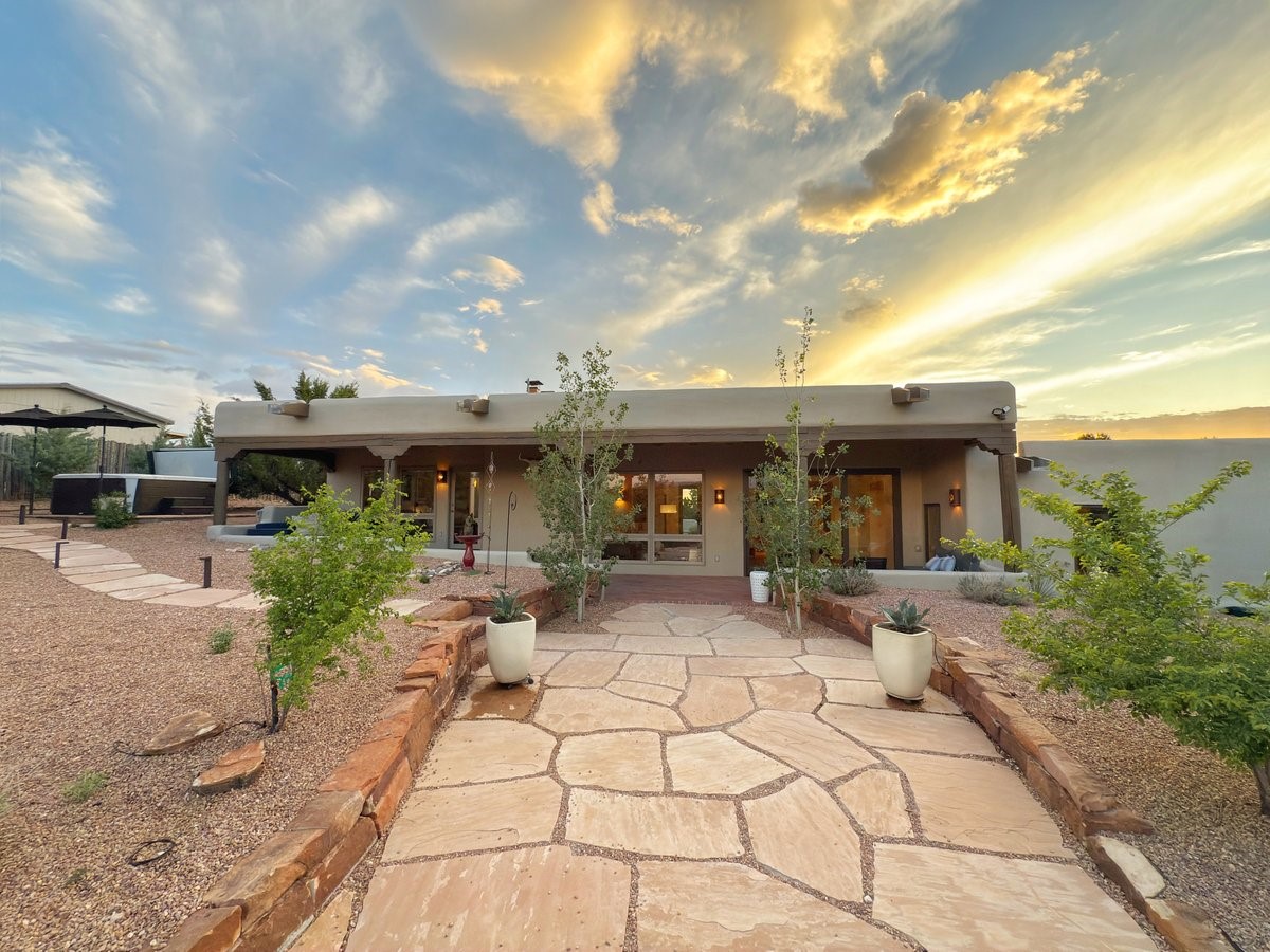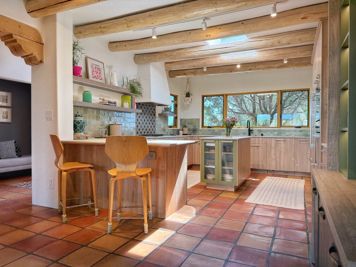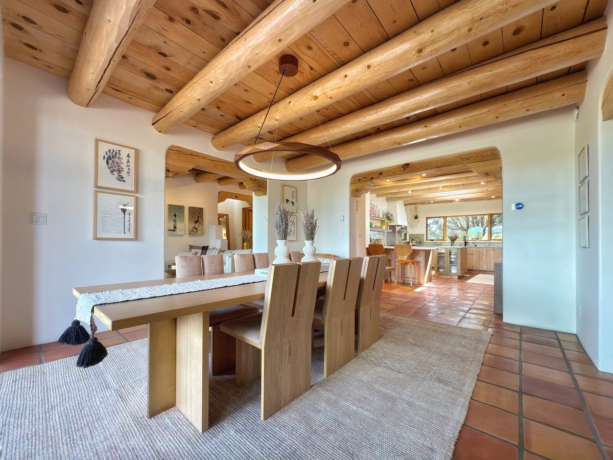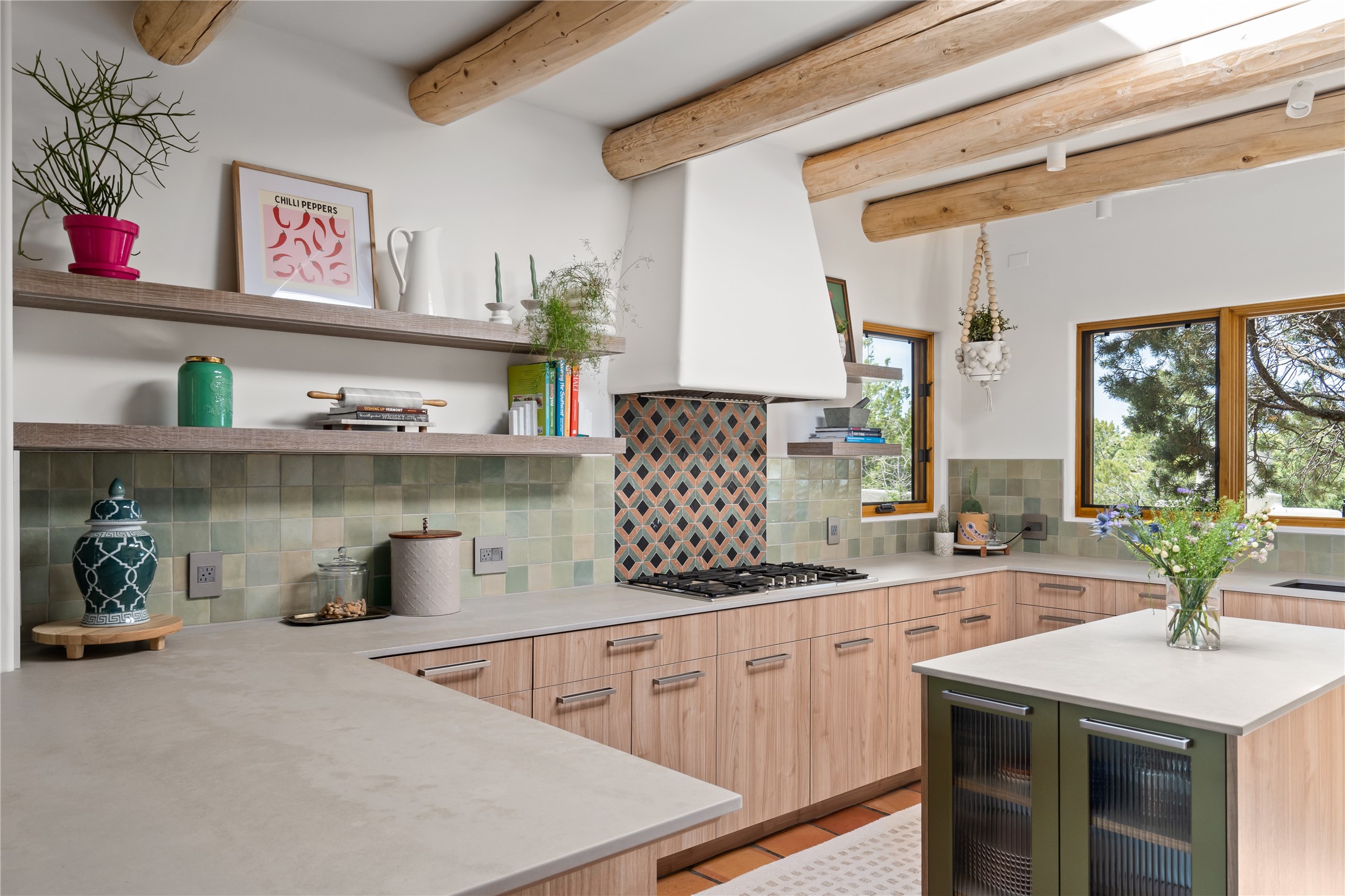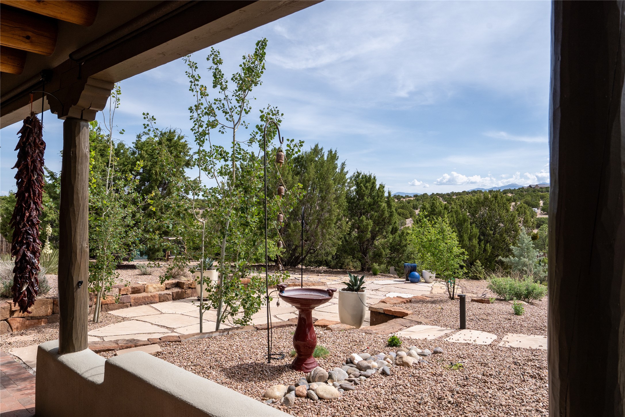Perched on 2.5 serene acres with sweeping views of both the Jemez and Sangre de Cristo mountains, this 4-bedroom, 2-bath beauty brings together the best of Santa Fe style and mid-century design. From the moment you enter the front courtyard--complete with a kiva fireplace and peaceful water feature--you'll feel like you've stepped into your own private retreat where mid-century hip meets Santa Fe soul.Inside, traditional elements like hand-adzed vigas, saltillo tile floors, and two cozy kiva fireplaces (one in the living room, one in the primary suite) provide that authentic Santa Fe warmth. But the heart of the home? It's the spectacular, magazine-featured kitchen. Thoughtfully remodeled by DMC Fine Cabinetry & Renovations and builder Eric Smith, this space has been showcased in Santa Fe Magazine, TREND, and more--and it shows. It's sleek, modern, and expertly designed for everyday ease and entertaining alike.The bathrooms are just as impressive--completely reimagined with a hip, contemporary flair that perfectly complements the home's classic style. The sellers had planned to stay here forever and invested accordingly--making this a rare opportunity for a new buyer to enjoy high-end updates without the wait or cost.The outdoor living is just as magical as the interior, with xeriscaped landscaping, a fully fenced backyard, and deep portals for relaxing, dining, or watching the mountains glow at sunset. Of course, there's a 2-car garage, because that's just what you'd expect from a home this perfect.With new windows, and recent stucco maintenance, as well as a frequently maintained roof, this is a home where every detail has been loved and it shows.Furniture and spa package negotiable.