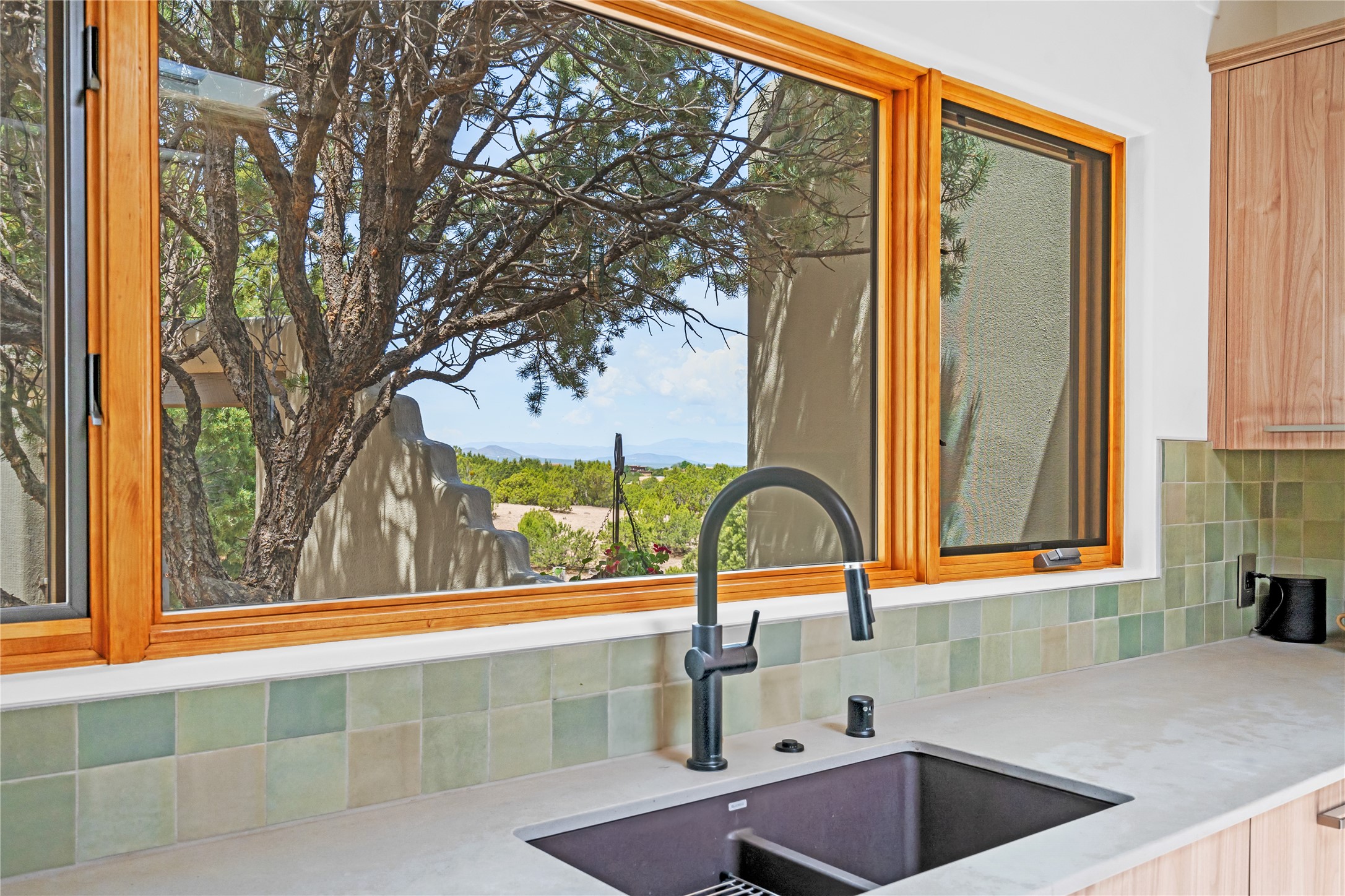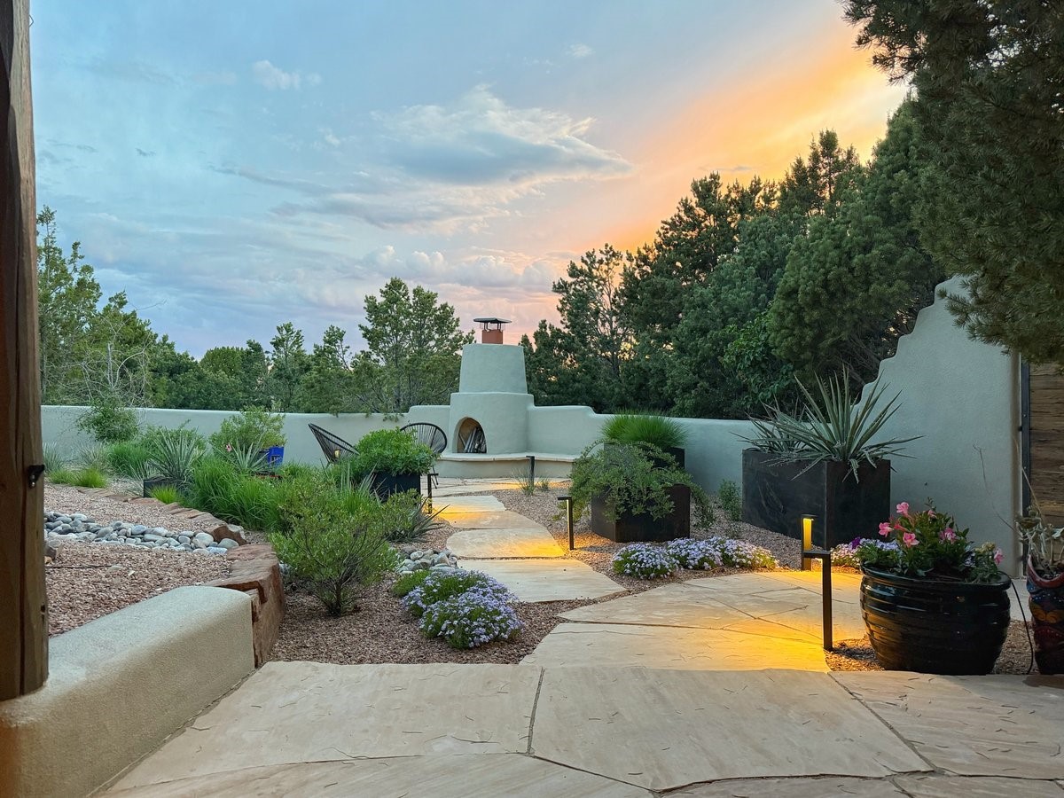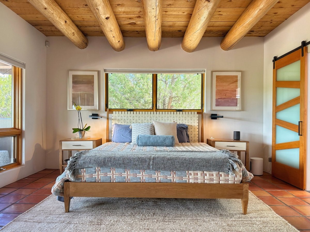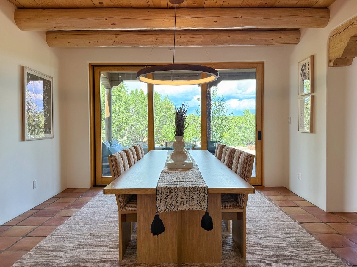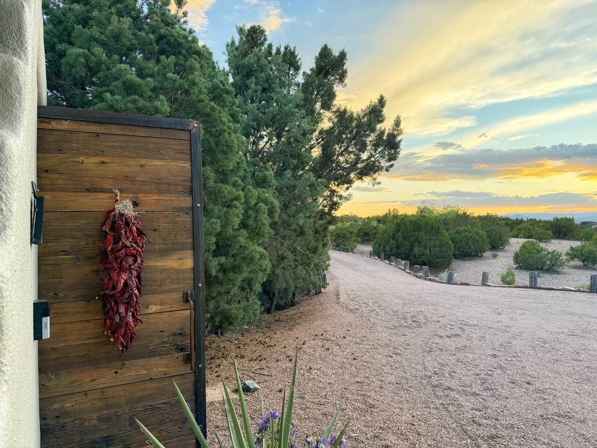 Perched on 2.5 serene acres with sweeping views of both the Jemez and Sangre de Cristo mountains, this 4-bedroom, 2-bath beauty brings together the best of Santa Fe style and mid-century design. From the moment you enter the front courtyard--complete with a kiva fireplace and peaceful water feature--you'll feel like you've stepped into your own private retreat where mid-century hip meets Santa Fe soul.Inside, traditional elements like hand-adzed vigas, saltillo tile floors, and two cozy kiva fireplaces (one in the living room, one in the primary suite) provide that authentic Santa Fe warmth. But the heart of the home? It's the spectacular, magazine-featured kitchen. Thoughtfully remodeled by DMC Fine Cabinetry & Renovations and builder Eric Smith, this space has been showcased in Santa Fe Magazine, TREND, and more--and it shows. It's sleek, modern, and expertly designed for everyday ease and entertaining alike.The bathrooms are just as impressive--completely reimagined with a hip, contemporary flair that perfectly complements the home's classic style. The sellers had planned to stay here forever and invested accordingly--making this a rare opportunity for a new buyer to enjoy high-end updates without the wait or cost.The outdoor living is just as magical as the interior, with xeriscaped landscaping, a fully fenced backyard, and deep portals for relaxing, dining, or watching the mountains glow at sunset. Of course, there's a 2-car garage, because that's just what you'd expect from a home this perfect.With new windows, and recent stucco maintenance, as well as a frequently maintained roof, this is a home where every detail has been loved and it shows.Furniture and spa package negotiable.