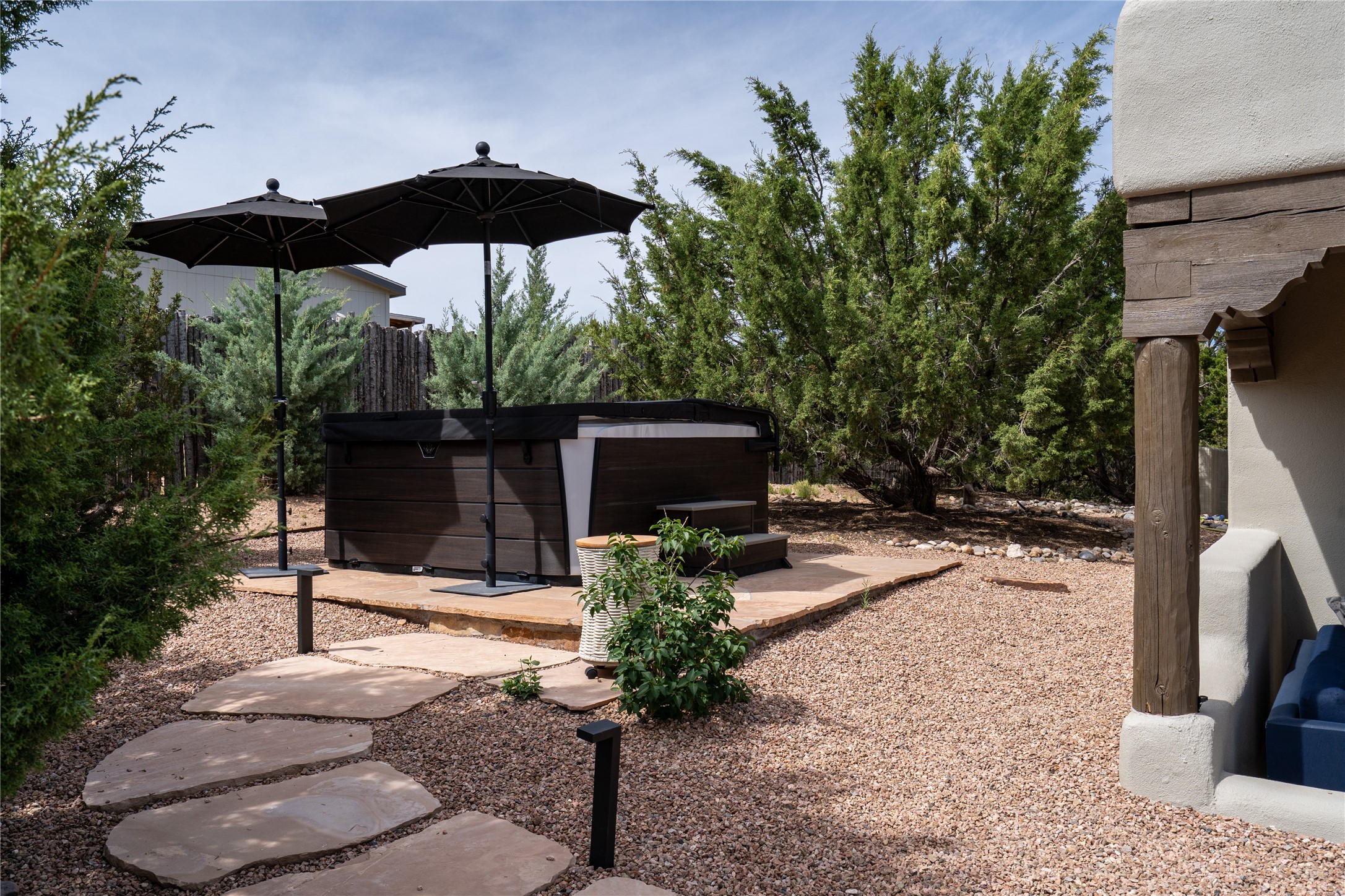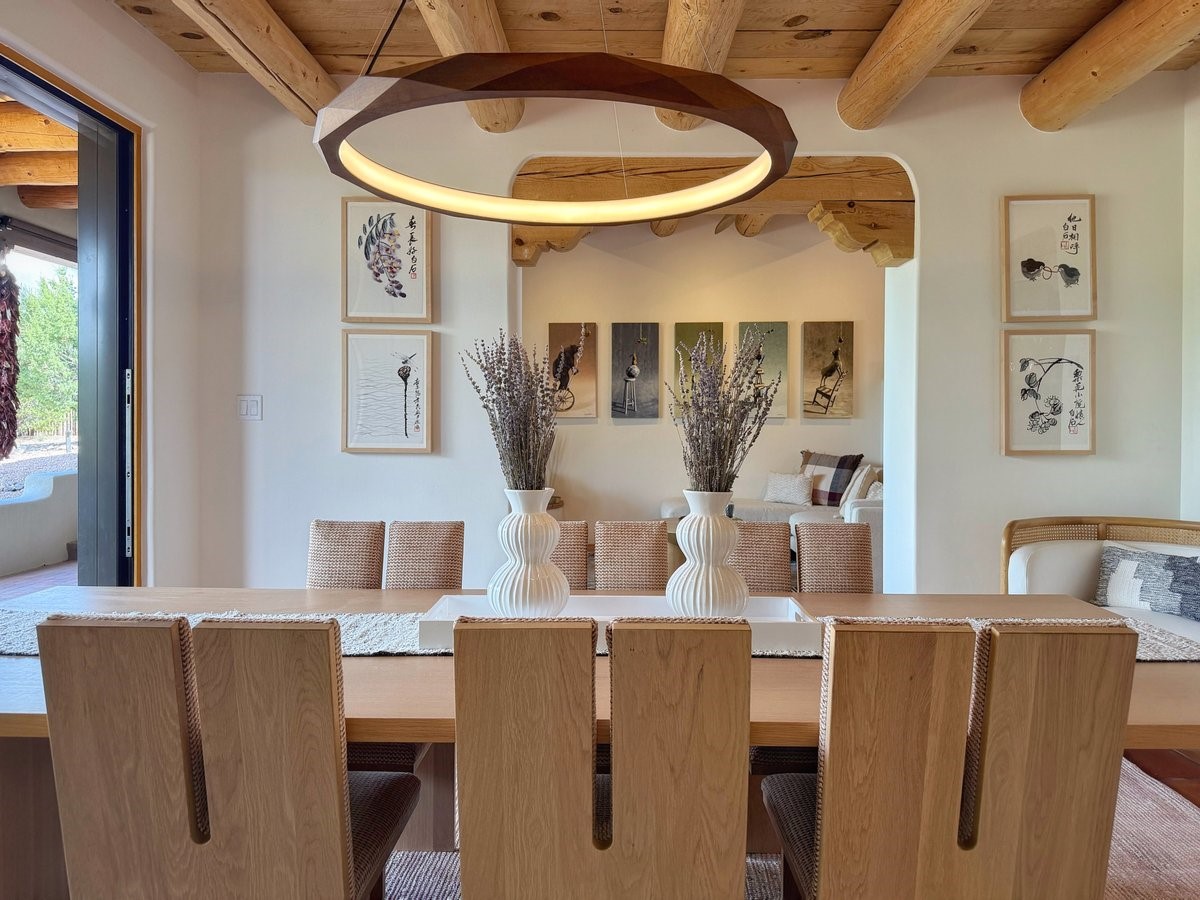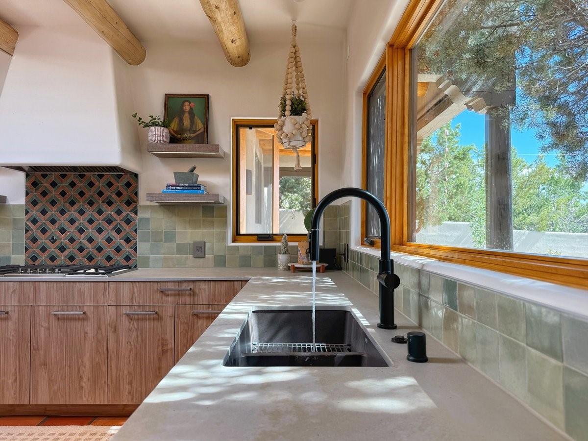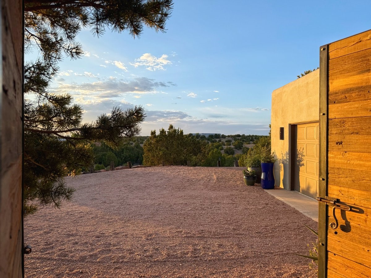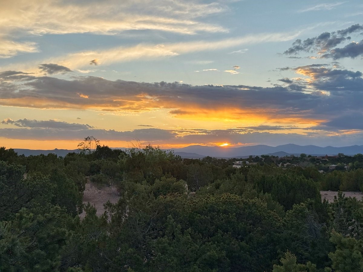 Perched on 2.5 serene acres with sweeping views of both the Jemez and Sangre de Cristo mountains, this 4-bedroom, 2-bath beauty brings together the best of Santa Fe style and mid-century design. From the moment you enter the front courtyard--complete with a kiva fireplace and peaceful water feature--you'll feel like you've stepped into your own private retreat where mid-century hip meets Santa Fe soul.Inside, traditional elements like hand-adzed vigas, saltillo tile floors, and two cozy kiva fireplaces (one in the living room, one in the primary suite) provide that authentic Santa Fe warmth. But the heart of the home? It's the spectacular, magazine-featured kitchen. Thoughtfully remodeled by DMC Fine Cabinetry & Renovations and builder Eric Smith, this space has been showcased in Santa Fe Magazine, TREND, and more--and it shows. It's sleek, modern, and expertly designed for everyday ease and entertaining alike.The bathrooms are just as impressive--completely reimagined with a hip, contemporary flair that perfectly complements the home's classic style. The sellers had planned to stay here forever and invested accordingly--making this a rare opportunity for a new buyer to enjoy high-end updates without the wait or cost.The outdoor living is just as magical as the interior, with xeriscaped landscaping, a fully fenced backyard, and deep portals for relaxing, dining, or watching the mountains glow at sunset. Of course, there's a 2-car garage, because that's just what you'd expect from a home this perfect.With new windows, and recent stucco maintenance, as well as a frequently maintained roof, this is a home where every detail has been loved and it shows.Furniture and spa package negotiable.