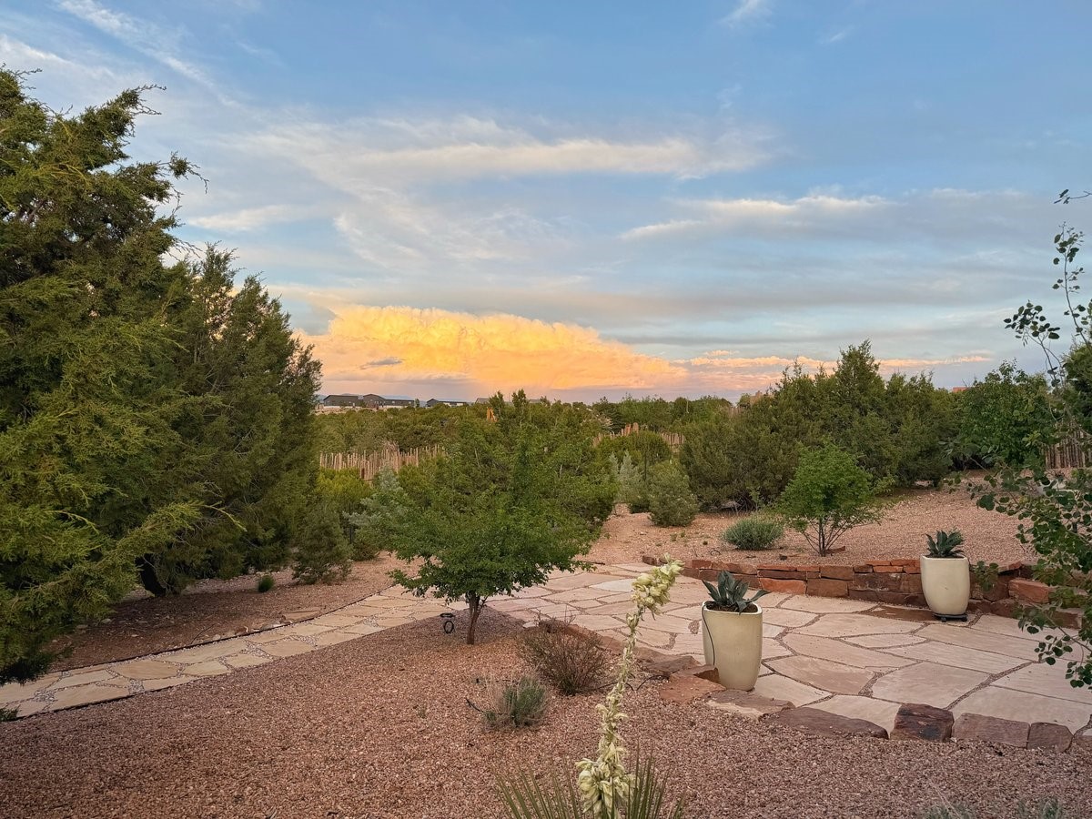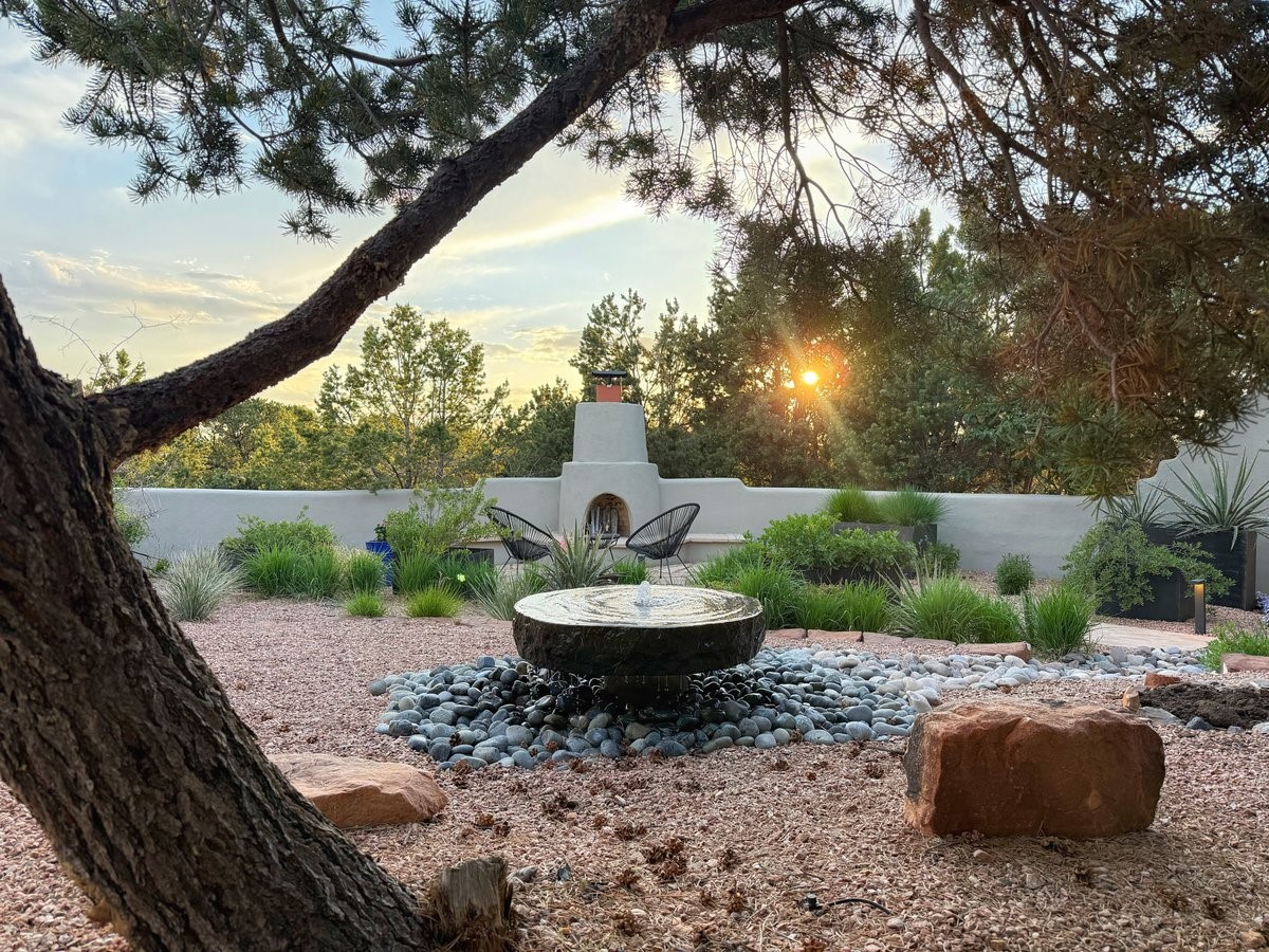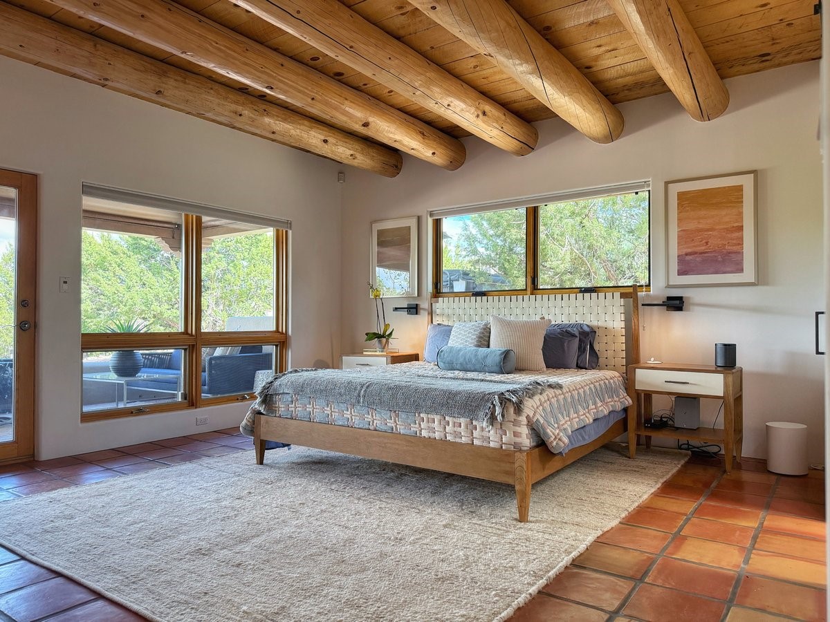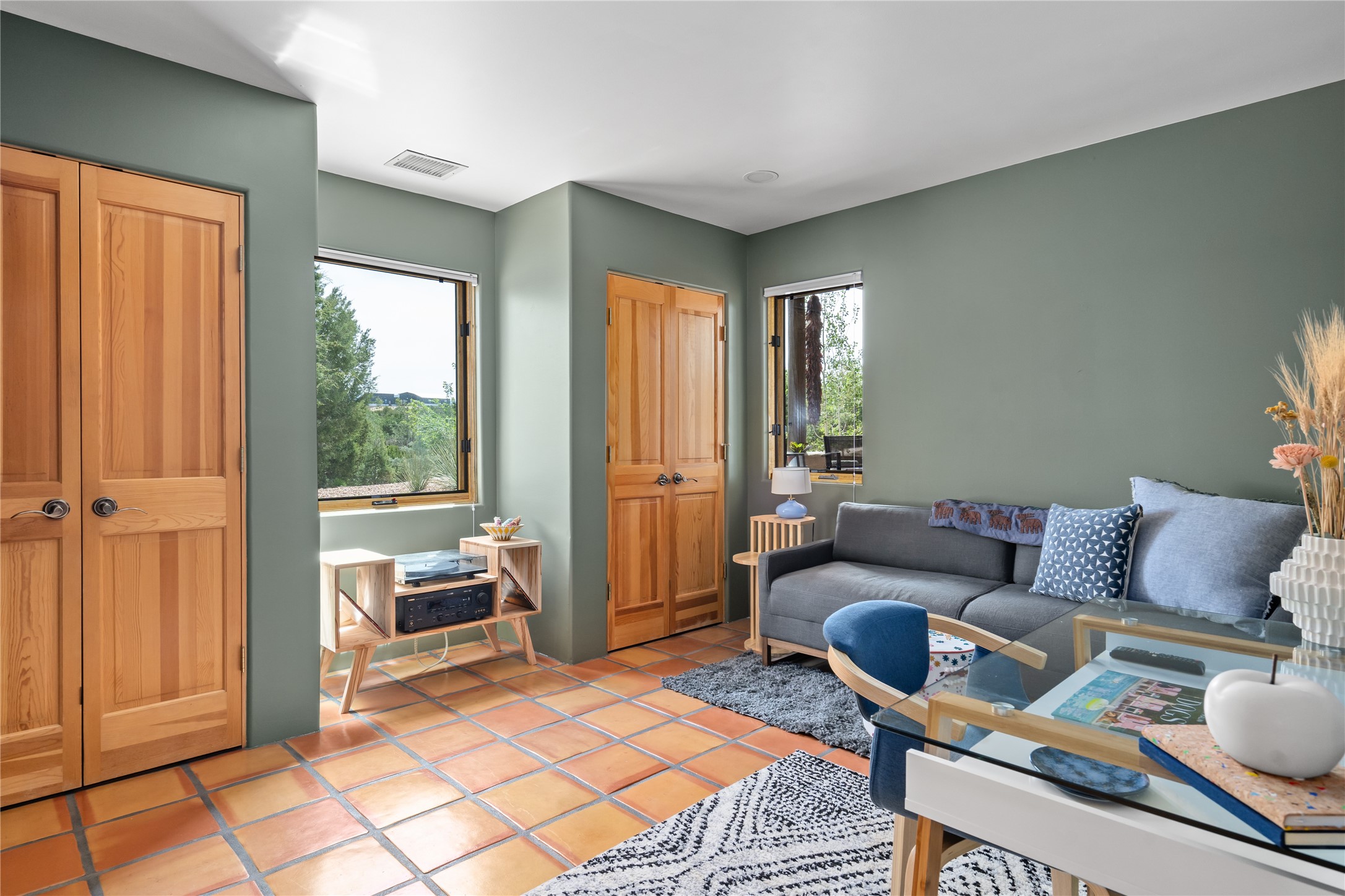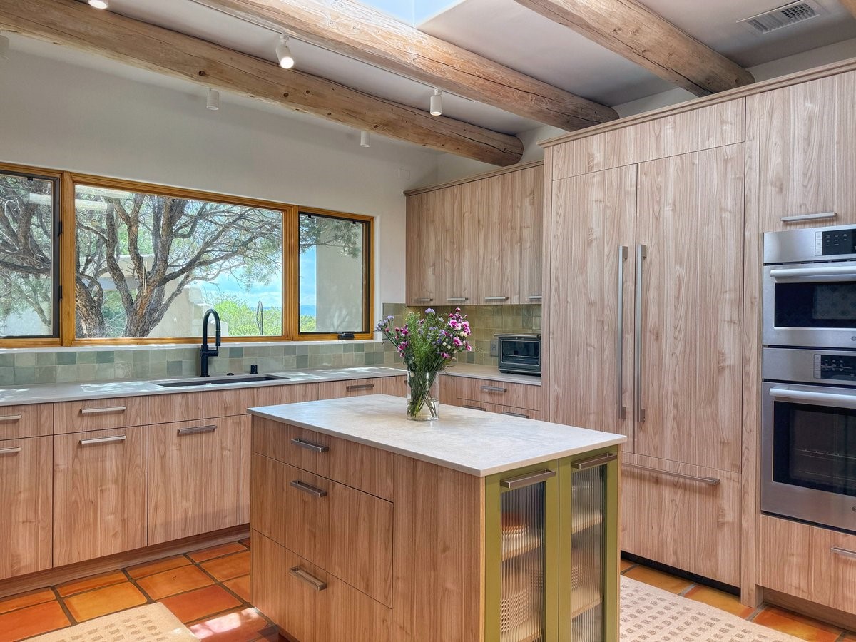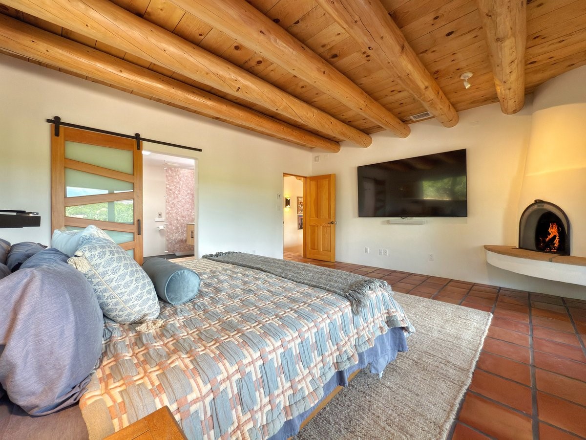 Perched on 2.5 serene acres with sweeping views of both the Jemez and Sangre de Cristo mountains, this 4-bedroom, 2-bath beauty brings together the best of Santa Fe style and mid-century design. From the moment you enter the front courtyard--complete with a kiva fireplace and peaceful water feature--you'll feel like you've stepped into your own private retreat where mid-century hip meets Santa Fe soul.Inside, traditional elements like hand-adzed vigas, saltillo tile floors, and two cozy kiva fireplaces (one in the living room, one in the primary suite) provide that authentic Santa Fe warmth. But the heart of the home? It's the spectacular, magazine-featured kitchen. Thoughtfully remodeled by DMC Fine Cabinetry & Renovations and builder Eric Smith, this space has been showcased in Santa Fe Magazine, TREND, and more--and it shows. It's sleek, modern, and expertly designed for everyday ease and entertaining alike.The bathrooms are just as impressive--completely reimagined with a hip, contemporary flair that perfectly complements the home's classic style. The sellers had planned to stay here forever and invested accordingly--making this a rare opportunity for a new buyer to enjoy high-end updates without the wait or cost.The outdoor living is just as magical as the interior, with xeriscaped landscaping, a fully fenced backyard, and deep portals for relaxing, dining, or watching the mountains glow at sunset. Of course, there's a 2-car garage, because that's just what you'd expect from a home this perfect.With new windows, and recent stucco maintenance, as well as a frequently maintained roof, this is a home where every detail has been loved and it shows.Furniture and spa package negotiable.