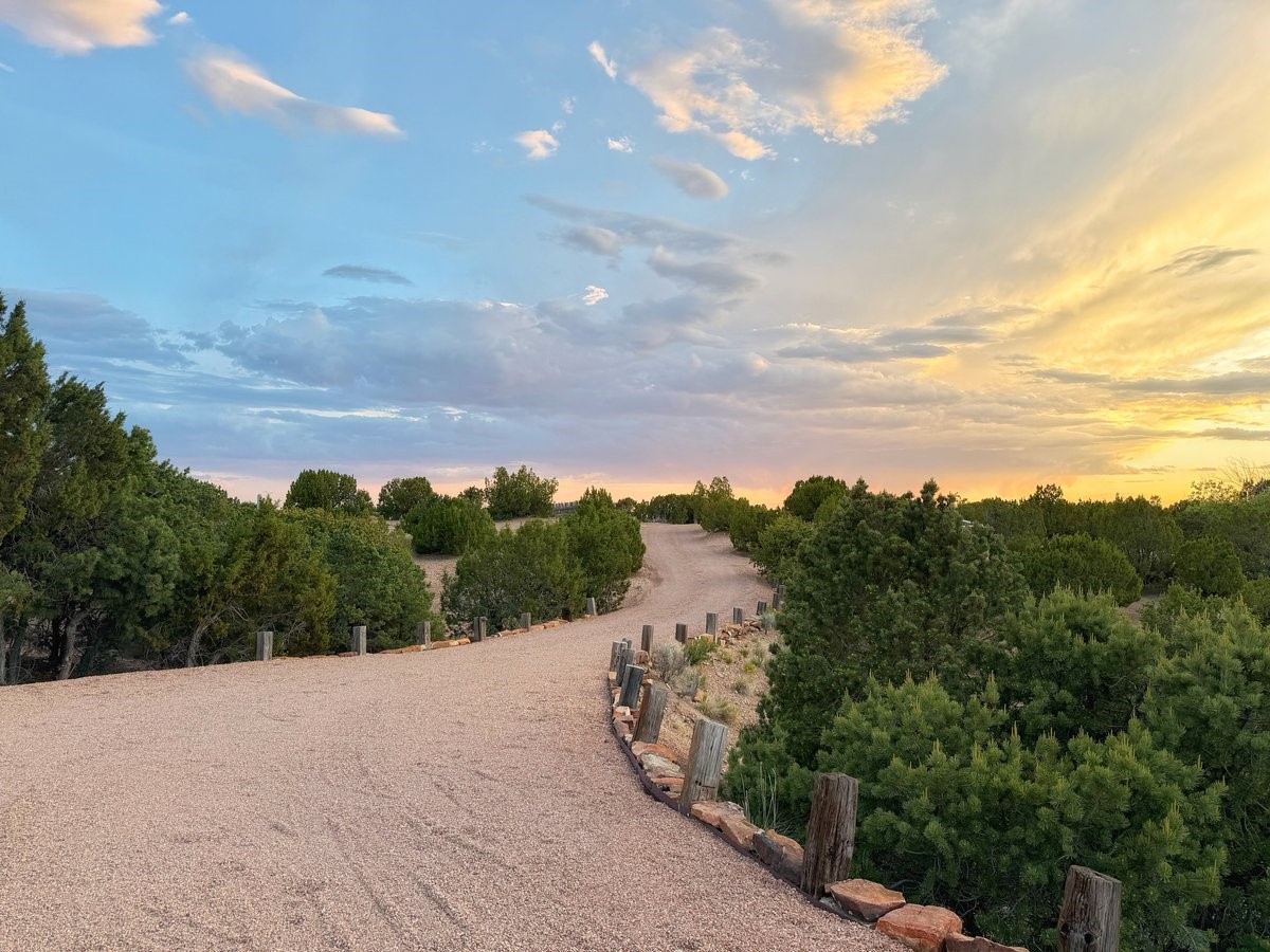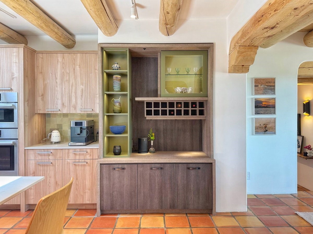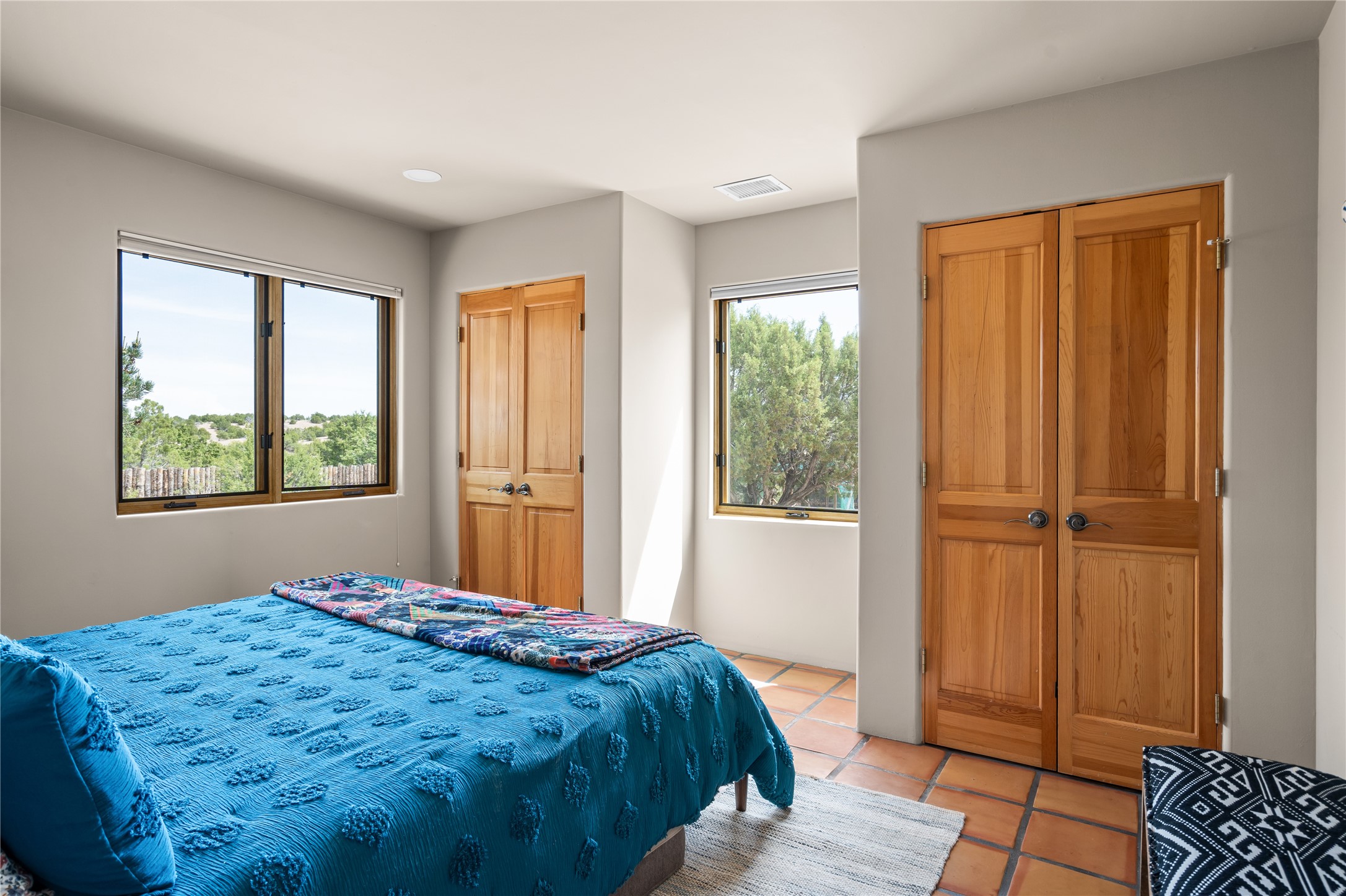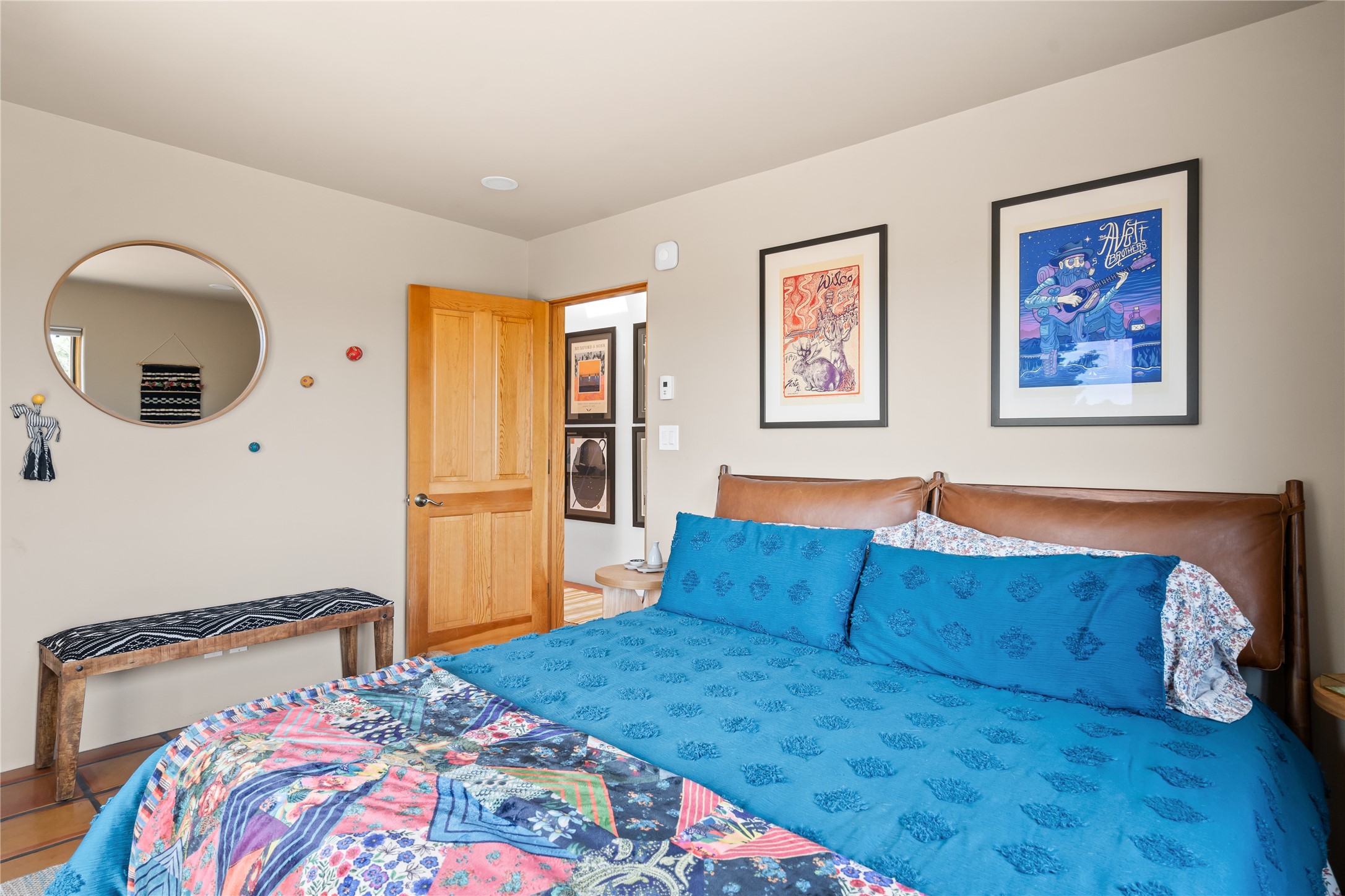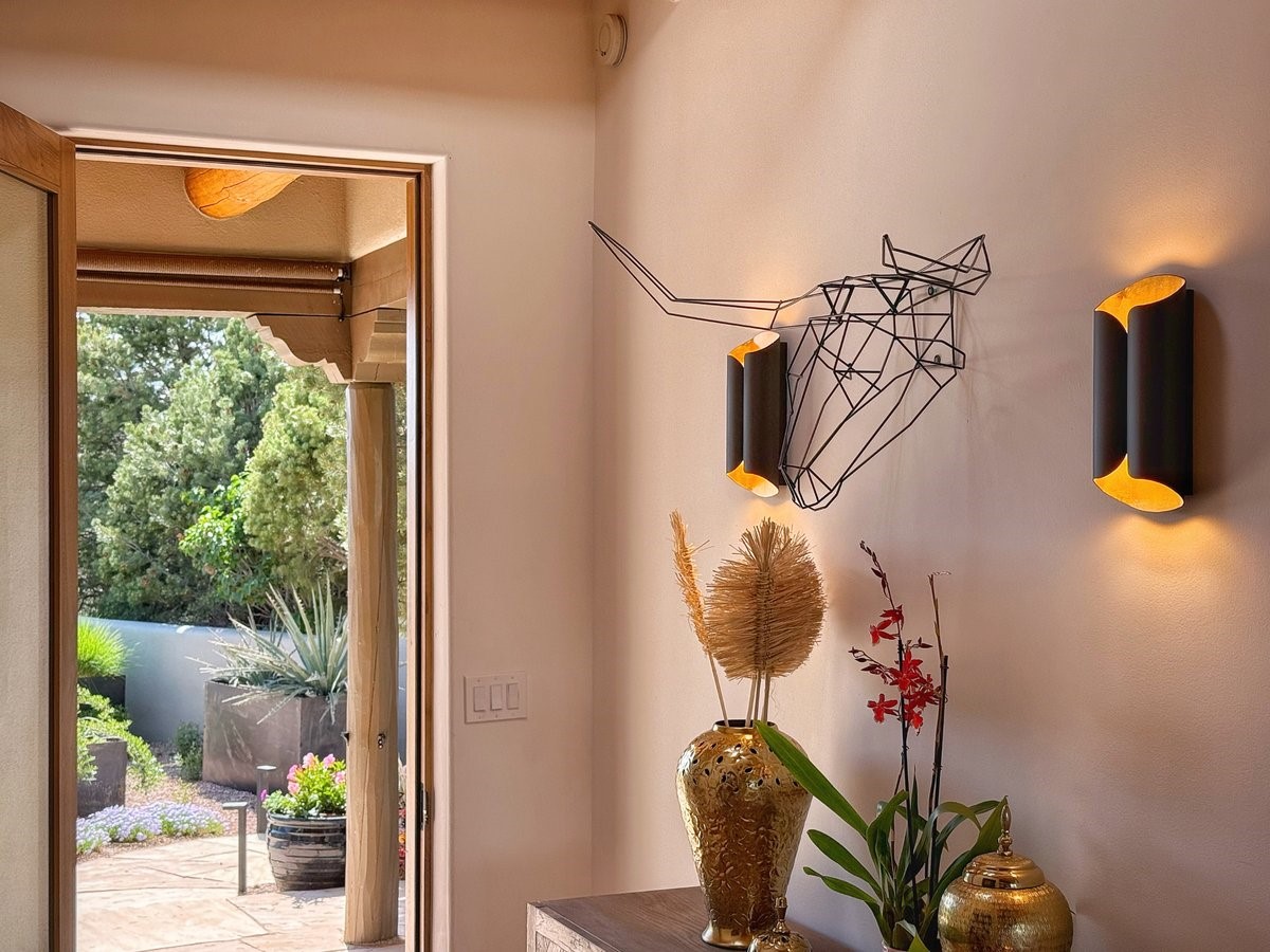 Perched on 2.5 serene acres with sweeping views of both the Jemez and Sangre de Cristo mountains, this 4-bedroom, 2-bath beauty brings together the best of Santa Fe style and mid-century design. From the moment you enter the front courtyard--complete with a kiva fireplace and peaceful water feature--you'll feel like you've stepped into your own private retreat where mid-century hip meets Santa Fe soul.Inside, traditional elements like hand-adzed vigas, saltillo tile floors, and two cozy kiva fireplaces (one in the living room, one in the primary suite) provide that authentic Santa Fe warmth. But the heart of the home? It's the spectacular, magazine-featured kitchen. Thoughtfully remodeled by DMC Fine Cabinetry & Renovations and builder Eric Smith, this space has been showcased in Santa Fe Magazine, TREND, and more--and it shows. It's sleek, modern, and expertly designed for everyday ease and entertaining alike.The bathrooms are just as impressive--completely reimagined with a hip, contemporary flair that perfectly complements the home's classic style. The sellers had planned to stay here forever and invested accordingly--making this a rare opportunity for a new buyer to enjoy high-end updates without the wait or cost.The outdoor living is just as magical as the interior, with xeriscaped landscaping, a fully fenced backyard, and deep portals for relaxing, dining, or watching the mountains glow at sunset. Of course, there's a 2-car garage, because that's just what you'd expect from a home this perfect.With new windows, and recent stucco maintenance, as well as a frequently maintained roof, this is a home where every detail has been loved and it shows.Furniture and spa package negotiable.
