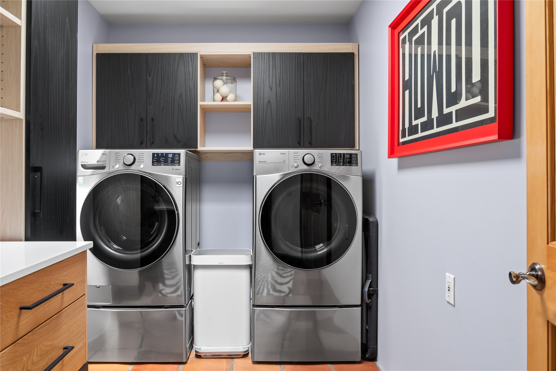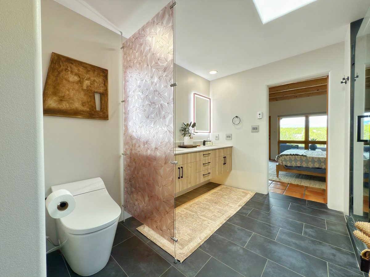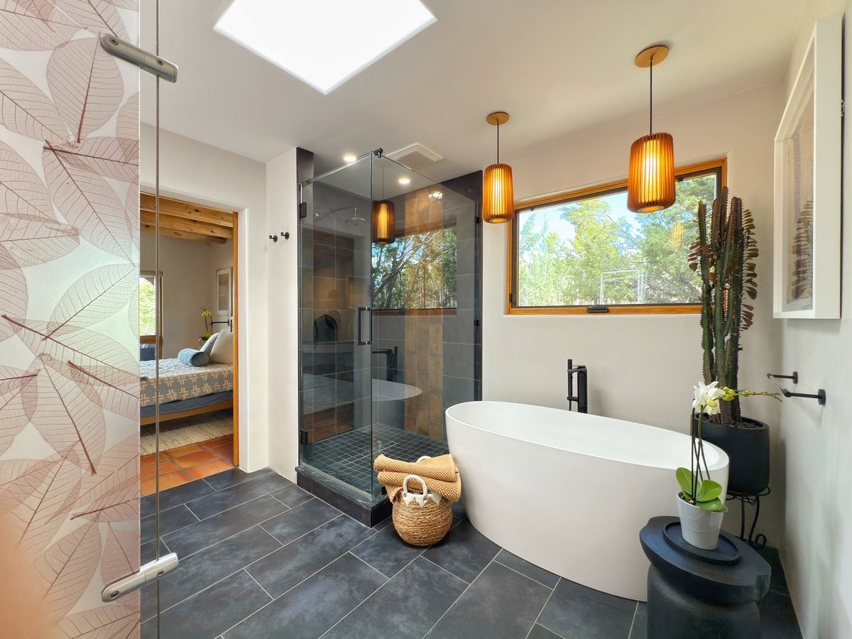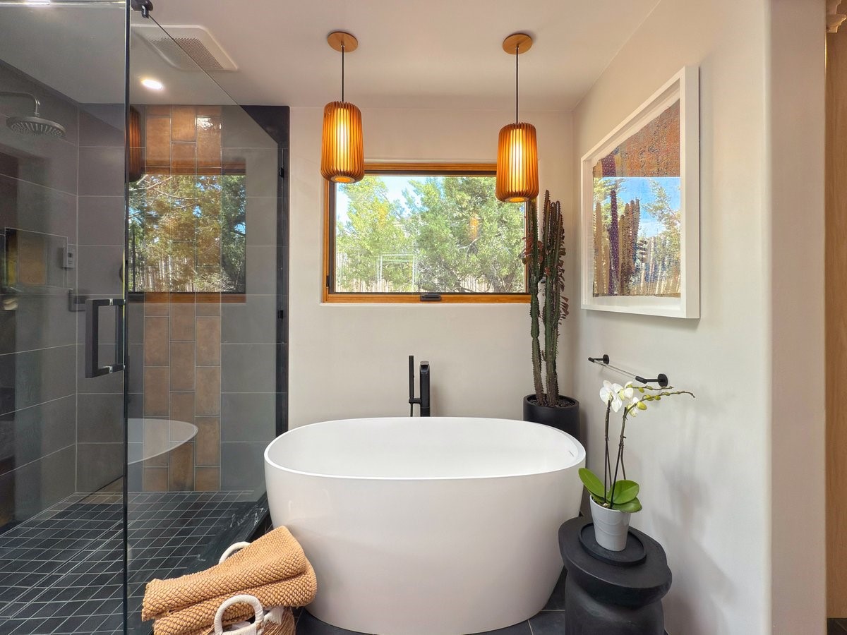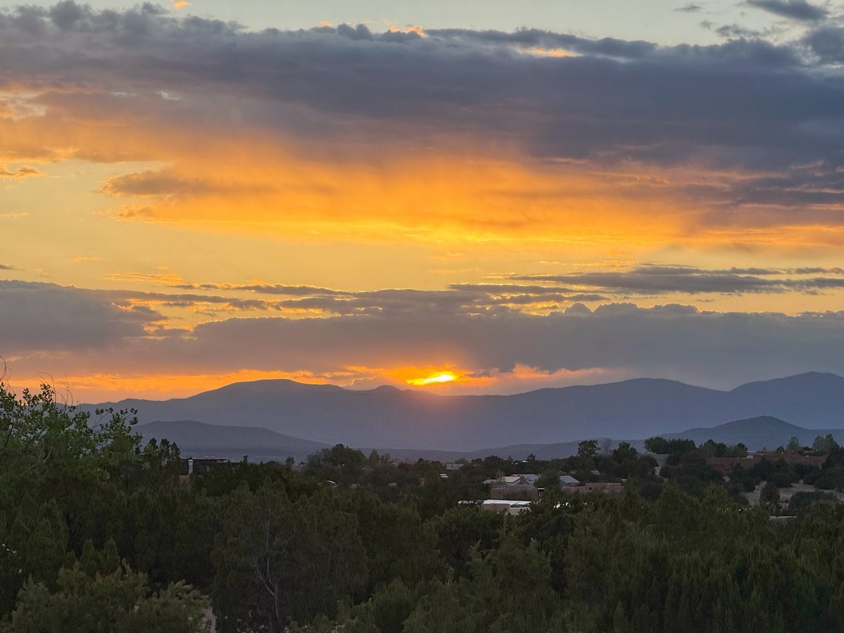 Perched on 2.5 serene acres with sweeping views of both the Jemez and Sangre de Cristo mountains, this 4-bedroom, 2-bath beauty brings together the best of Santa Fe style and mid-century design. From the moment you enter the front courtyard--complete with a kiva fireplace and peaceful water feature--you'll feel like you've stepped into your own private retreat where mid-century hip meets Santa Fe soul.Inside, traditional elements like hand-adzed vigas, saltillo tile floors, and two cozy kiva fireplaces (one in the living room, one in the primary suite) provide that authentic Santa Fe warmth. But the heart of the home? It's the spectacular, magazine-featured kitchen. Thoughtfully remodeled by DMC Fine Cabinetry & Renovations and builder Eric Smith, this space has been showcased in Santa Fe Magazine, TREND, and more--and it shows. It's sleek, modern, and expertly designed for everyday ease and entertaining alike.The bathrooms are just as impressive--completely reimagined with a hip, contemporary flair that perfectly complements the home's classic style. The sellers had planned to stay here forever and invested accordingly--making this a rare opportunity for a new buyer to enjoy high-end updates without the wait or cost.The outdoor living is just as magical as the interior, with xeriscaped landscaping, a fully fenced backyard, and deep portals for relaxing, dining, or watching the mountains glow at sunset. Of course, there's a 2-car garage, because that's just what you'd expect from a home this perfect.With new windows, and recent stucco maintenance, as well as a frequently maintained roof, this is a home where every detail has been loved and it shows.Furniture and spa package negotiable.