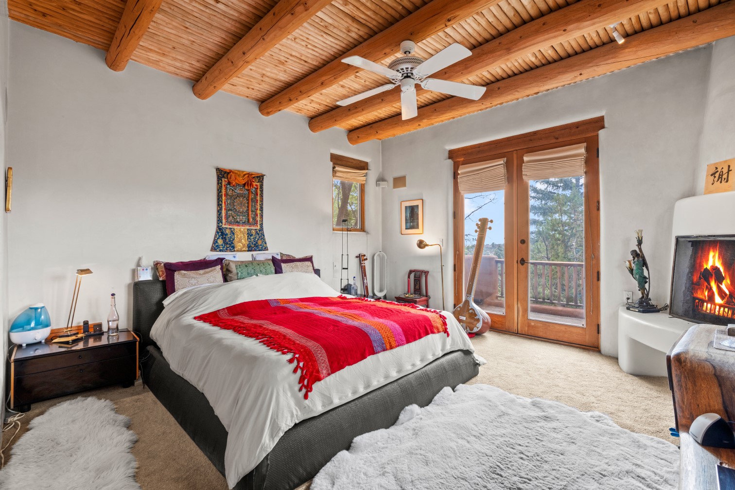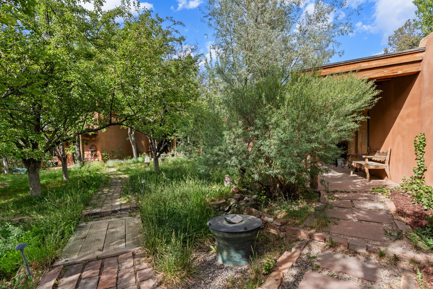 MAJESTIC UPPER EASTSIDE ESTATE - Discover the magic of this classic pueblo-style adobe compound off Upper Canyon Road - a serene oasis with magnificent views of the Sangre de Cristo and Jemez Mountains. Gated and fenced with private access to protected trails (Dorothy Stewart Trails), and on a cul-de-sac, the compound's gates swing open to reveal a stream and waterfall surrounded by day lilies, water lilies, irises, and verdant grasses embellishing extraordinary landscaping and gardens (featured in the 1997 Rizzoli book, Secret Gardens of Santa Fe). The adobe 4-bedroom main residence and 1-bedroom guest house are nestled within 1.14 acres of abundant aspens and towering blue spruce that frame the drama of distant mountains. Features of the main house include 6 fireplaces, ceilings of vigas, latillas and coves, antique doors, custom hardware, radiant under-floor heating, outdoor patios and portals, a media room, yoga studio, and 2-car garage. The upstairs primary suite includes a separate office and three outdoor spaces - a patio / portal, a separate balcony, and a spacious deck - and an elegant bath suite with a custom steam shower and whirlpool tub.