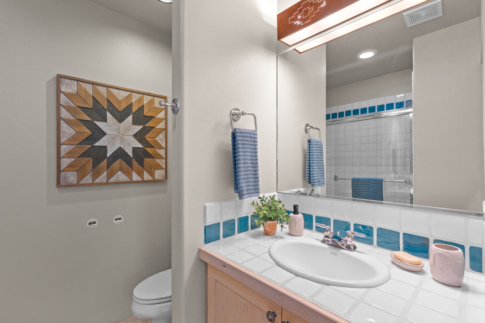 Sophisticated In-Town Living in highly sought-after Estancias Primera on charming La Viveza Court. Leave your home and walk to the Plaza via the lush arroyo. This two-story home has three outside living with an open living/dining/kitchen floor plan with wood-burning Kiva fireplace, plaster walls, wood floors and vigas, a main level powder room and tree-scaped patio. The two well-sized bedrooms have doors to walk out on to the terrace and feature en-suite full baths. In addition to a heated two-car garage with shelving, there are two nicely-sized storage areas. Estancias Primera is known for its reasonable HOA fees, privacy, and has a seasonal swimming pool, tennis courts and a clubhouse. This is the perfect lock-and-leave or full-time home. In five minutes, you're at the Plaza or Dale Ball trail system and in 20 minutes, the ski basin. The home has radiant floor heating and mini splits for air conditioning and additional heating.