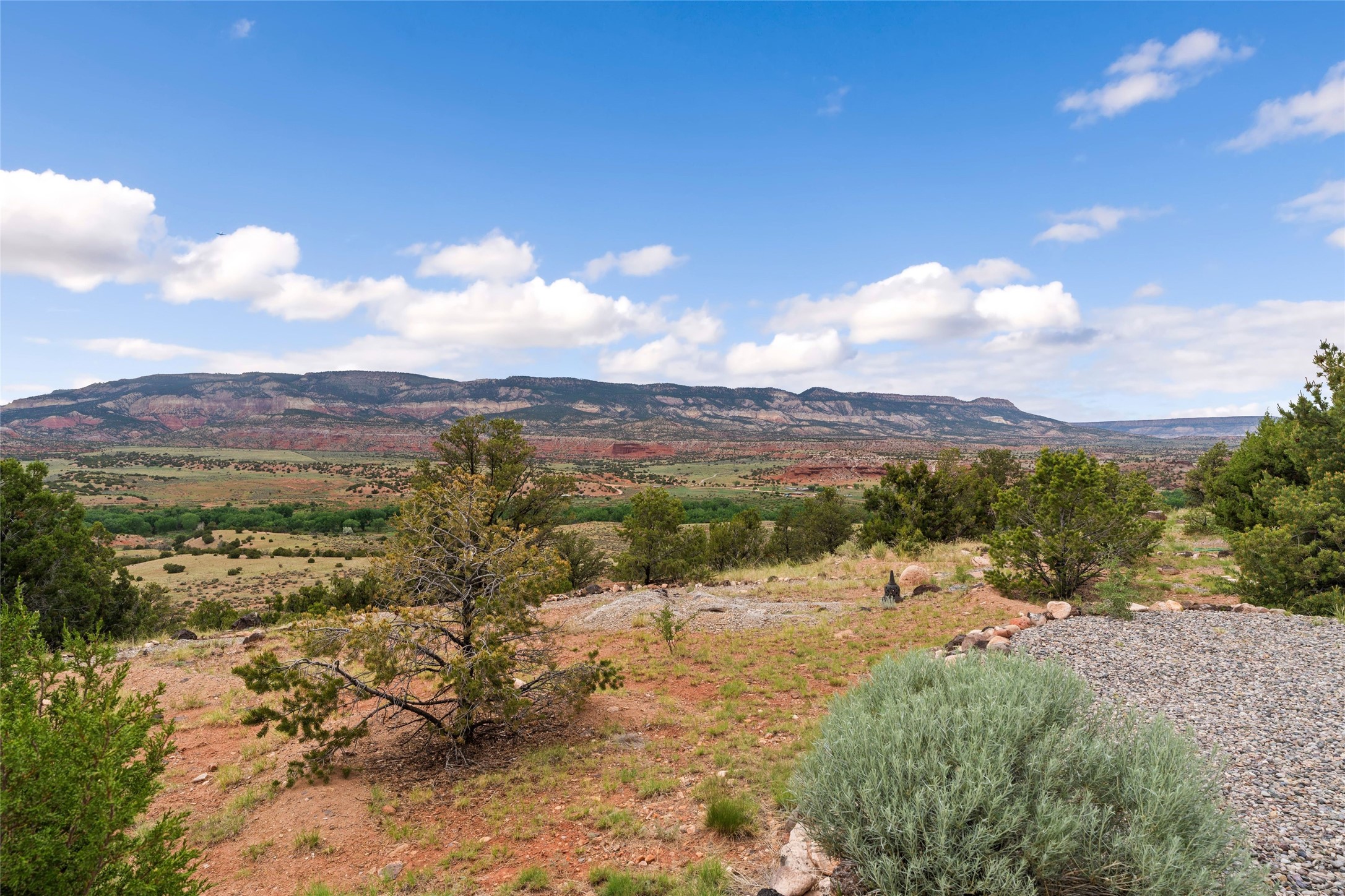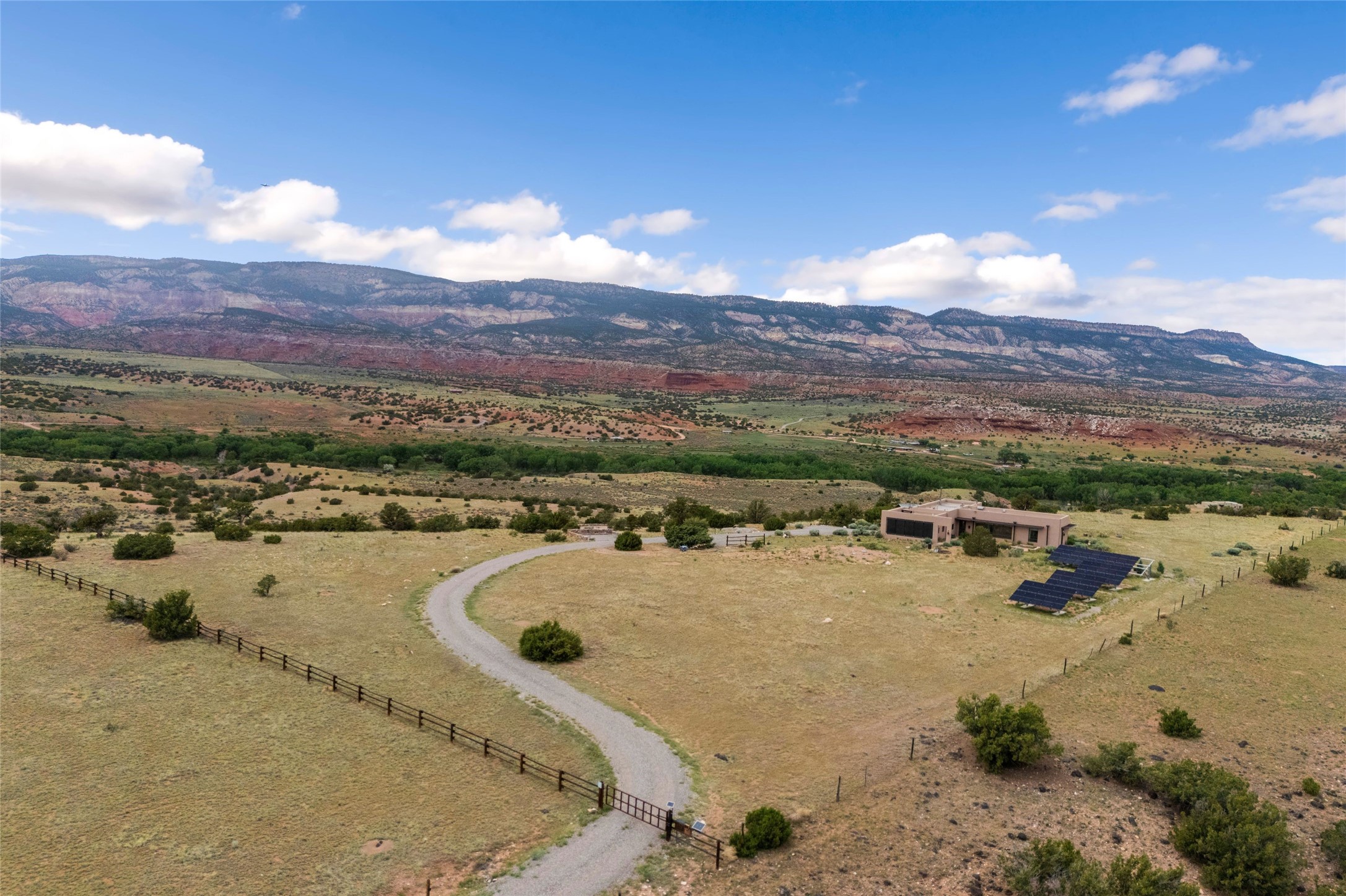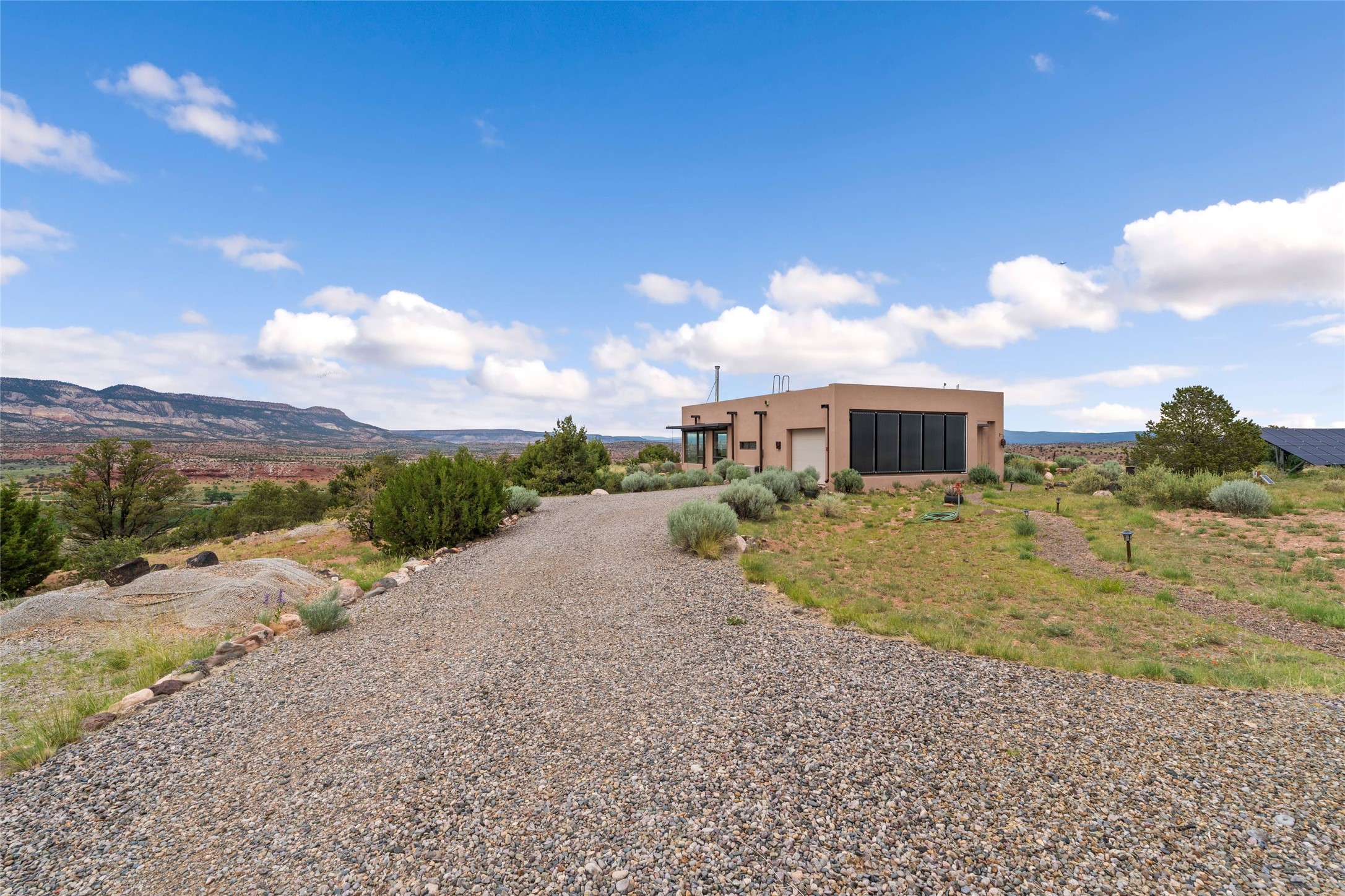 Casa con Vista a private sanctuary with sweeping mountain views. Perched atop the serene La Cuchilla mesa, this peaceful retreat offers breathtaking vistas of the Pedernal, Kitchen Mesa at Ghost Ranch, and the surrounding mountains and mesas. Designed in harmony with its natural setting, this contemporary residence invites you to experience the beauty of New Mexico in every direction -- from glowing sandstone cliffs at sunrise and sunset to crystal-clear night skies adorned with countless stars. Each season transforms the landscape -- golden cottonwoods lining the Rio Puerco in autumn, snow-capped peaks in winter, gentle spring rains, and vibrant wildflowers in summer. Wildlife frequents the property, including deer, elk, bobcats, ravens, red-tailed hawks, pion jays, and an array of migratory birds. This immaculate two-bedroom, two-bath home, designed and built by award-winning Solterra Design Build, is a high-performance, off-the-grid home that combines modern comfort with environmental mindfulness. Thoughtfully positioned to maximize views and light, the home features ICF construction, a 48-panel photovoltaic solar array with Outback inverter, three charge controllers, and a Kohler propane backup generator. Five 4'x8' thermal panels provide hot water and in-floor radiant heating. Additional systems include a whole-house reverse osmosis filtration system, two 2,500-gallon cisterns, recirculating hot water pump, 300-gallon sprinkler system, and drip irrigation for landscaped and garden areas. Beyond the main residence, a hand-crafted Teahouse and ramada offer serene spaces for relaxation and meditation. A labyrinth and large viewing portal provide peaceful settings for reflection while taking in the sweeping landscape.