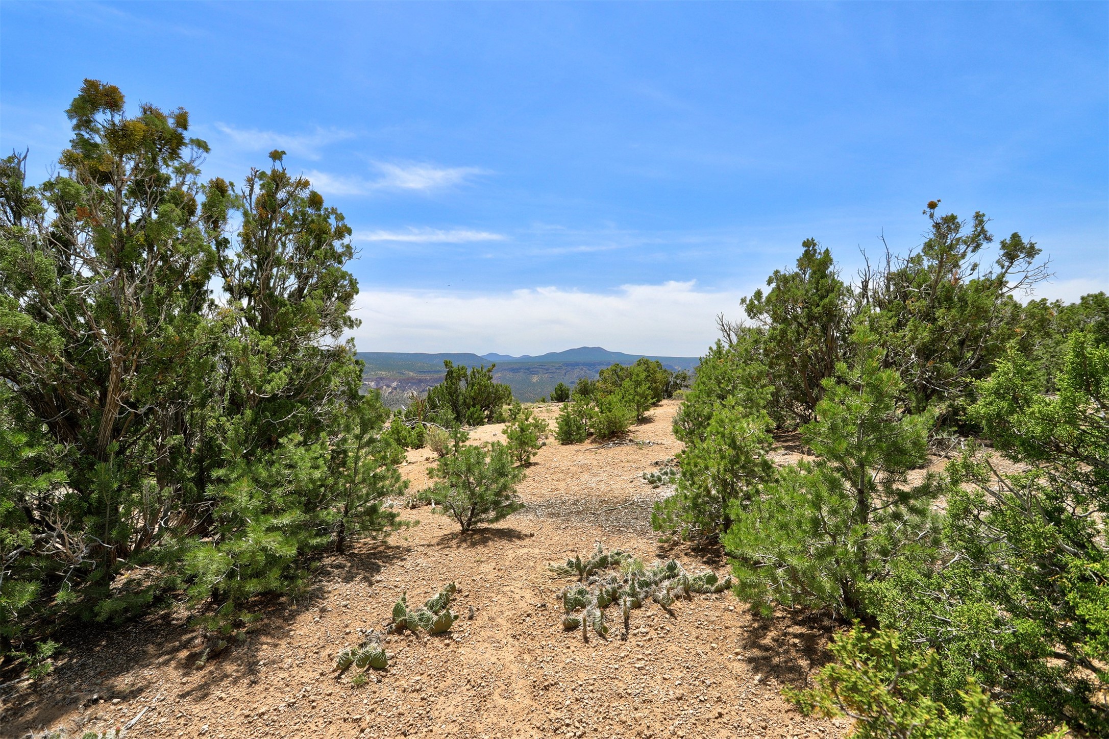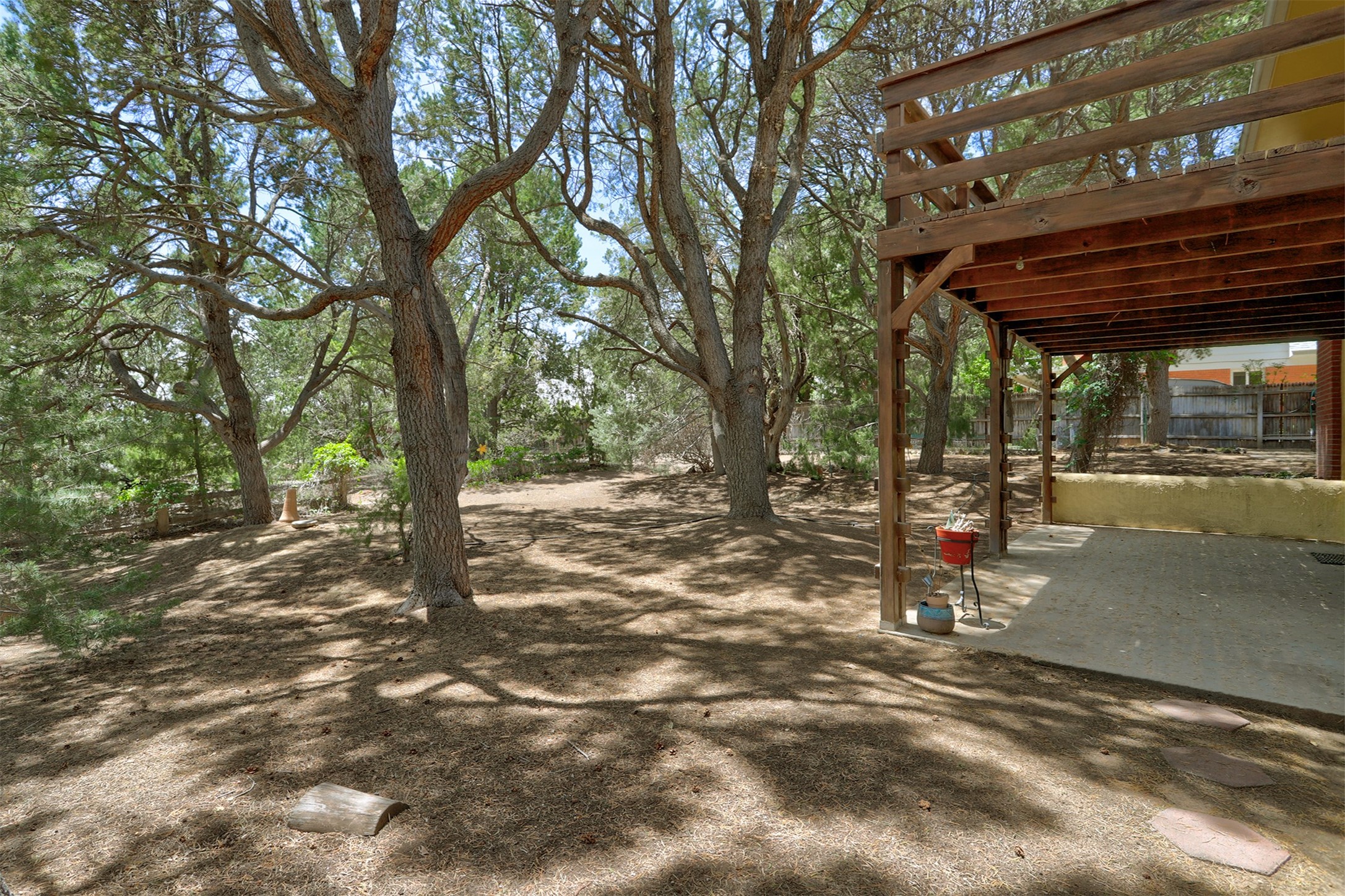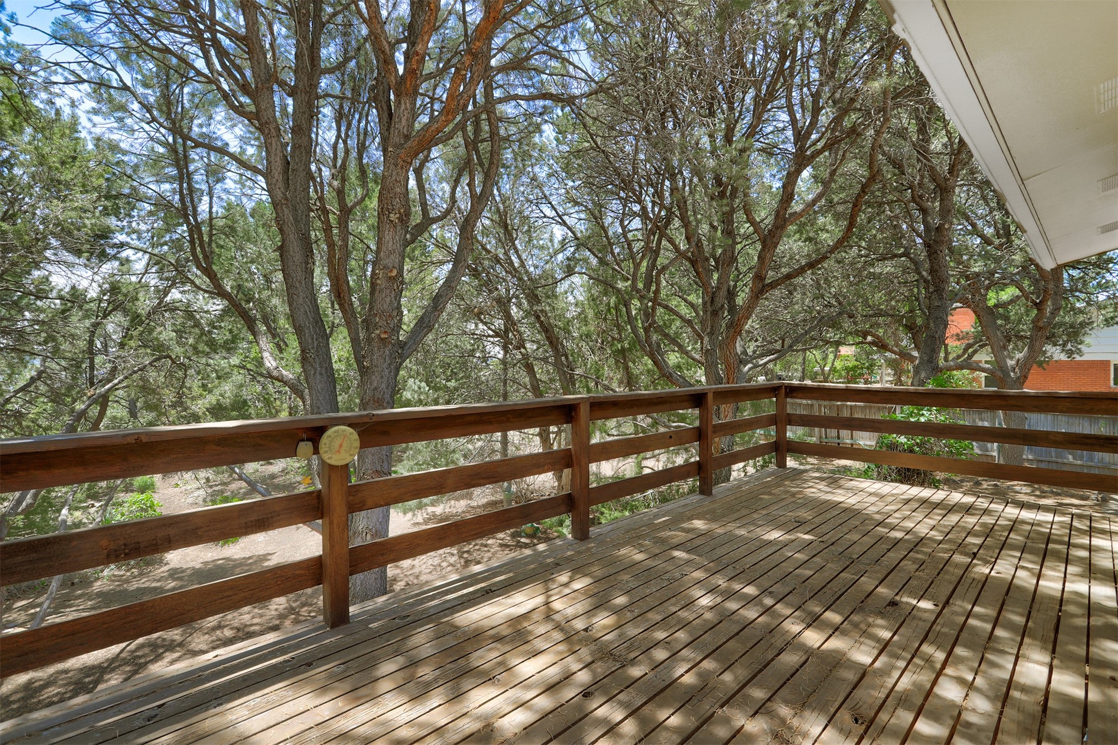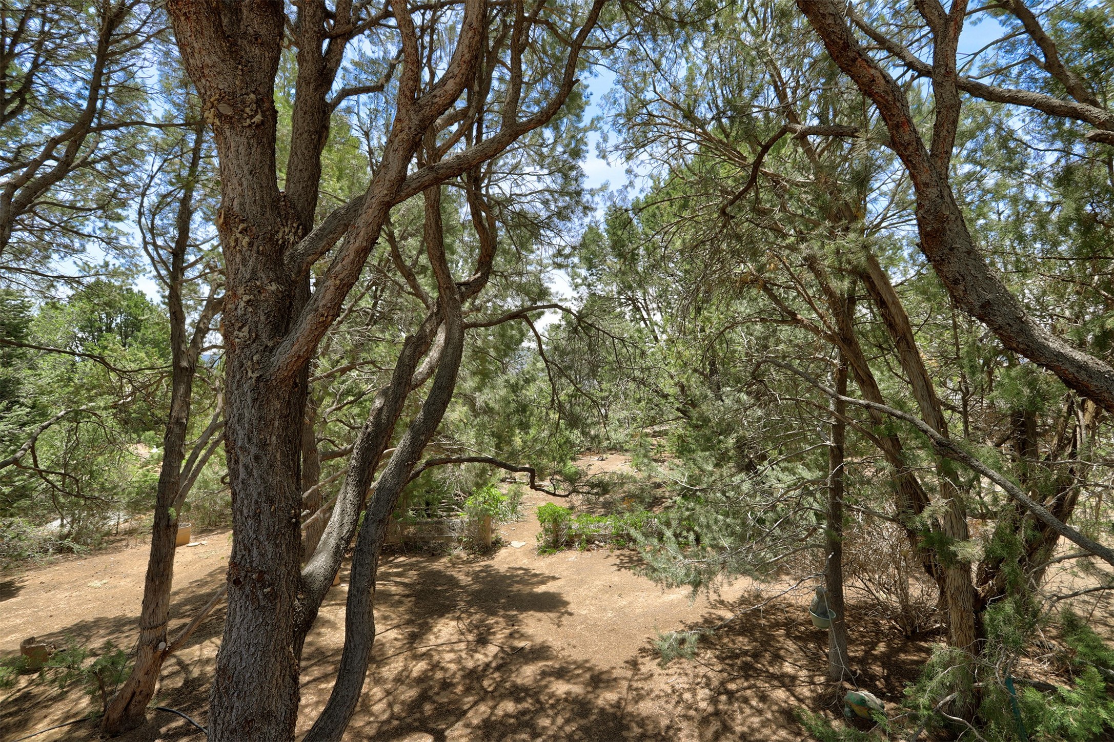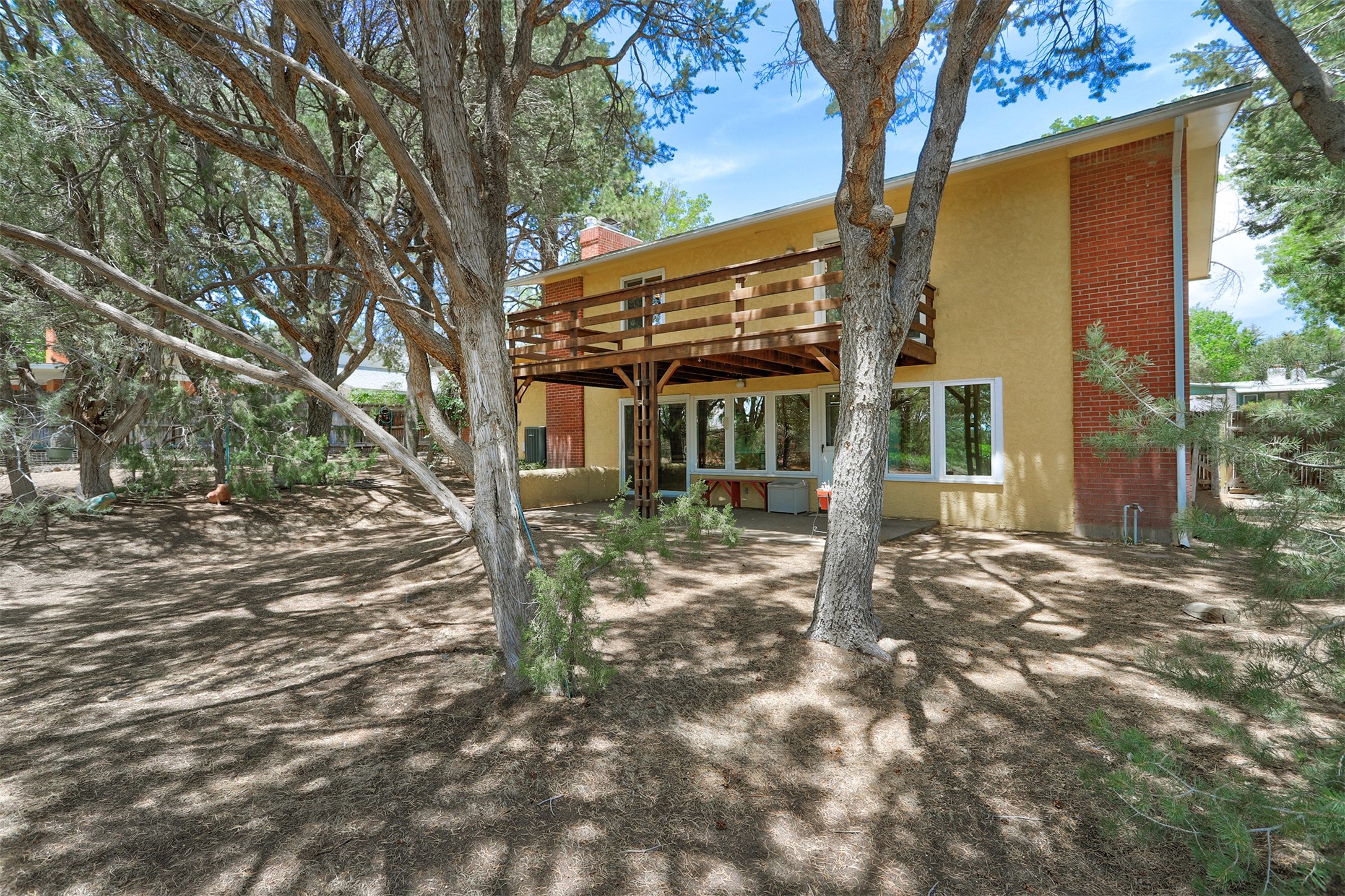 Situated on a stunning canyon lot, this home offers an exceptional setting with direct access to hiking trails along the Rio Grande rim and Pajarito Canyon. Surrounded by mature trees and vibrant foliage, the property conveys a forested feel. You'll feel like you are in your very own forest and private retreat while still being conveniently located in town. Thoughtfully positioned at the front of the lot, the home allows for a generous backyard ideal for entertaining, gardening, or simply enjoying the serene, wooded surroundings. The home's main level features a welcoming living room, a formal dining area, and a well-appointed kitchen providing direct access to a covered patio and the expansive yard. A cozy family room with a wood-burning fireplace provides a warm gathering space, along with convenient access to the two-car garage and a designated laundry room. Upstairs, the primary suite offers a peaceful escape with an en suite bathroom and a private deck--perfect for morning coffee or evening relaxation among the treetops. Three additional bedrooms and a full hall bath complete the second level, with one bedroom thoughtfully equipped with a built-in Murphy bed. The home also includes air conditioning, making it comfortable year-round. Schedule a private showing today!