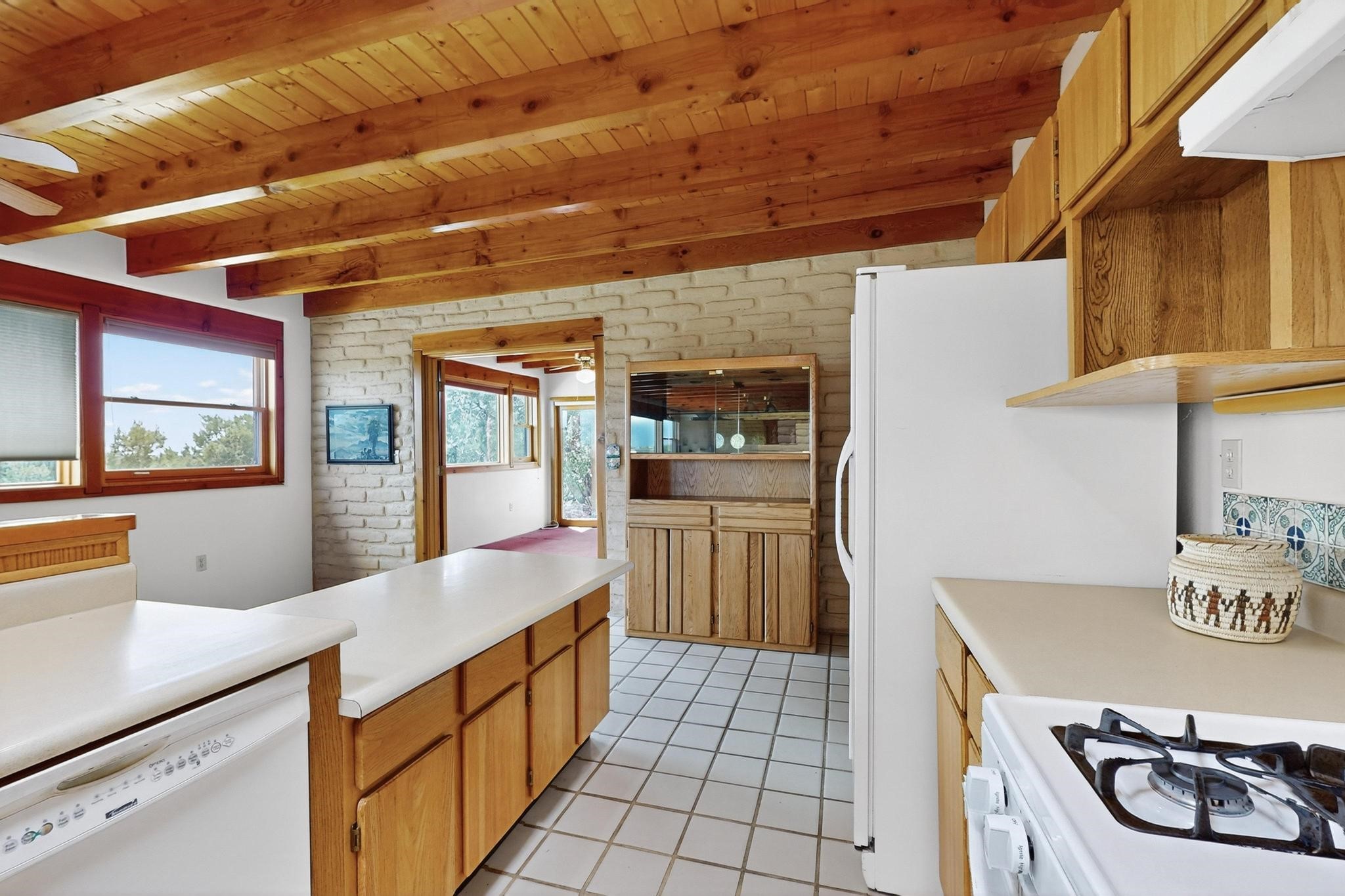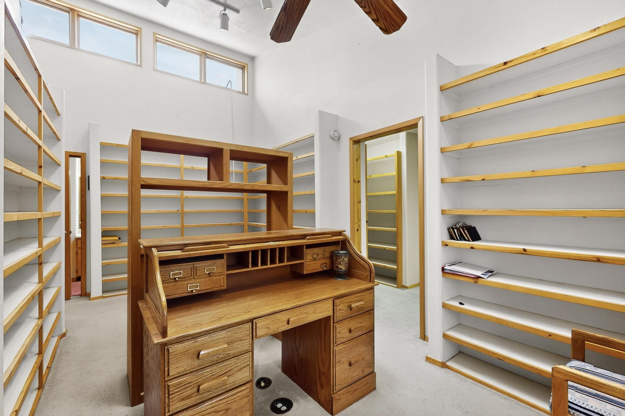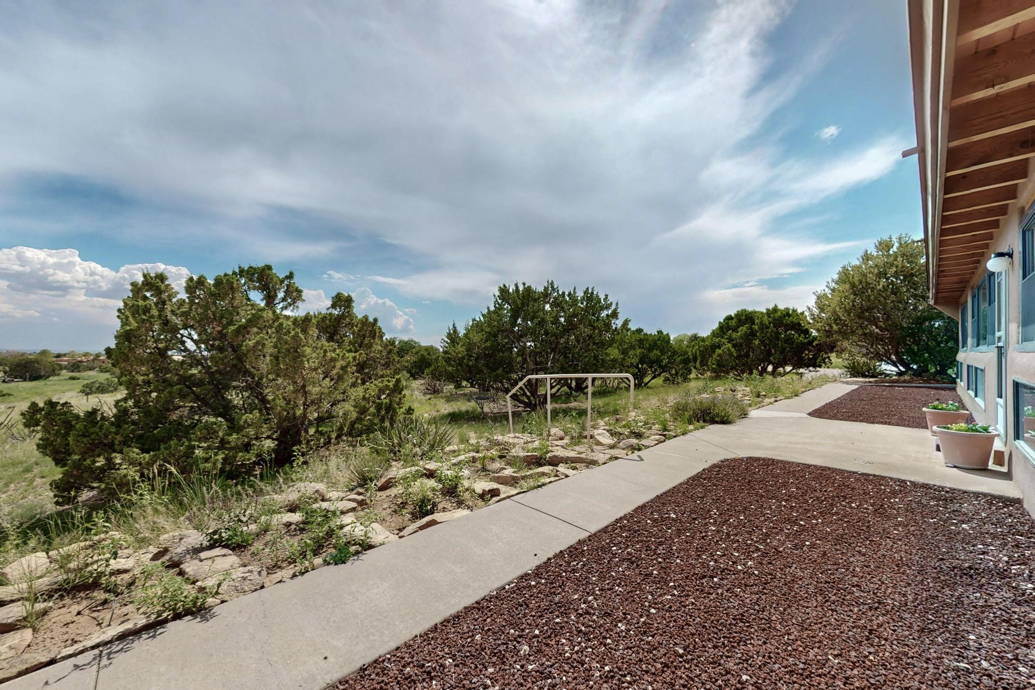Priced to Sell! First time on the market, grand one owner home custom built by Sierra Homes bordering a large greenbelt, on a cul de sac close to the Eldorado community center and amenities. The passive solar open great room combines kitchen, dining and living room with Kiva fireplace and a mini split. Separate guest bedroom with bathroom off the living room, plus another guest bedroom and full bath, plus an office/library with walk in closet/storage room with extra access from the garage.. A spacious owners suite with large bathroom and mini split for comfortable living. There is an oversized 600sf finished 2 car garage with plenty of storage space and plenty of guest parking. All this close to Eldorado amenities, local shopping, schools, parks, trails, library and senior center, and only minutes into Santa Fe